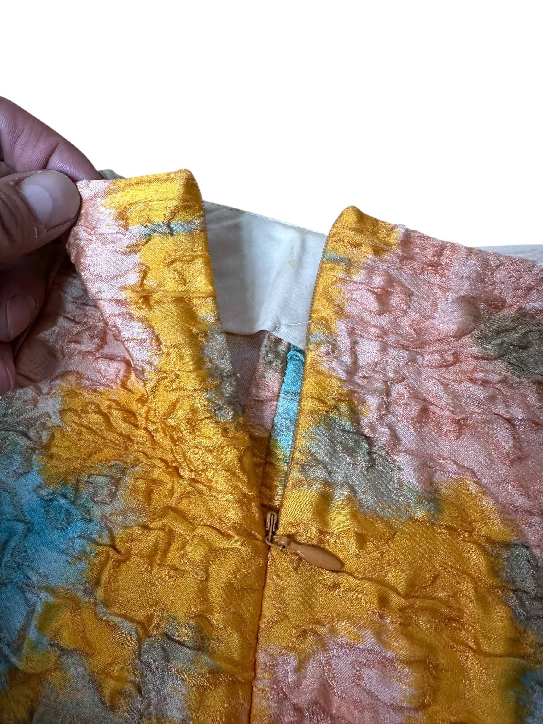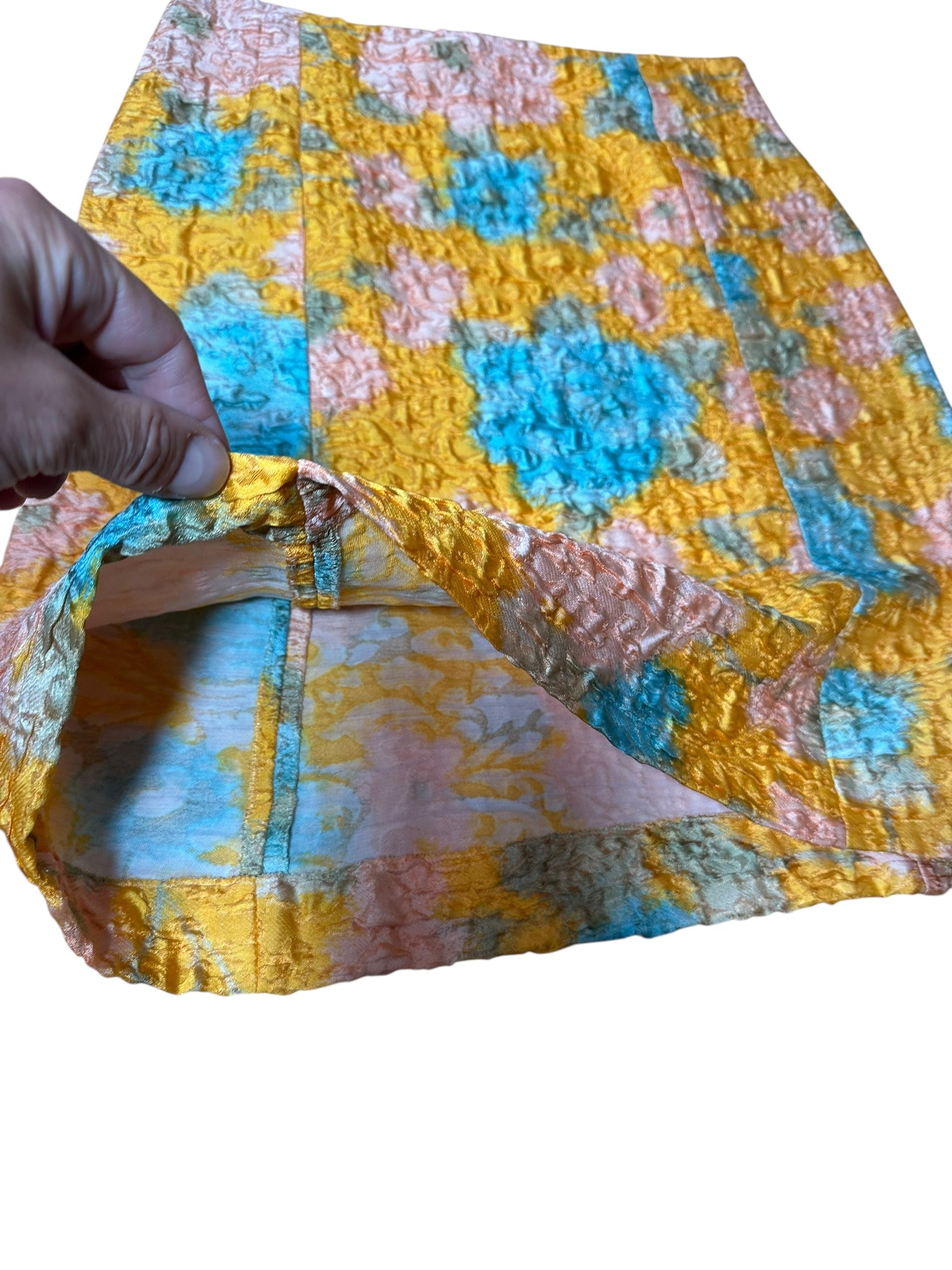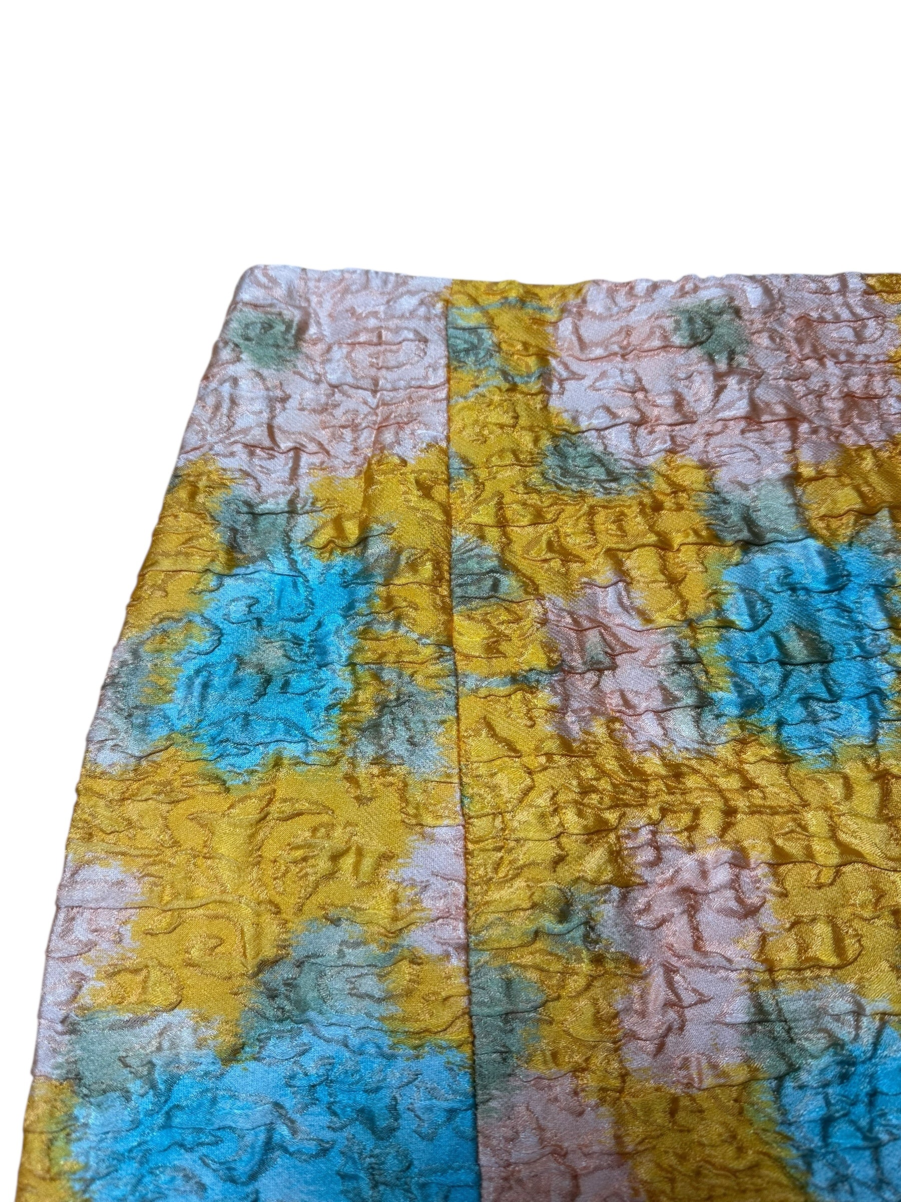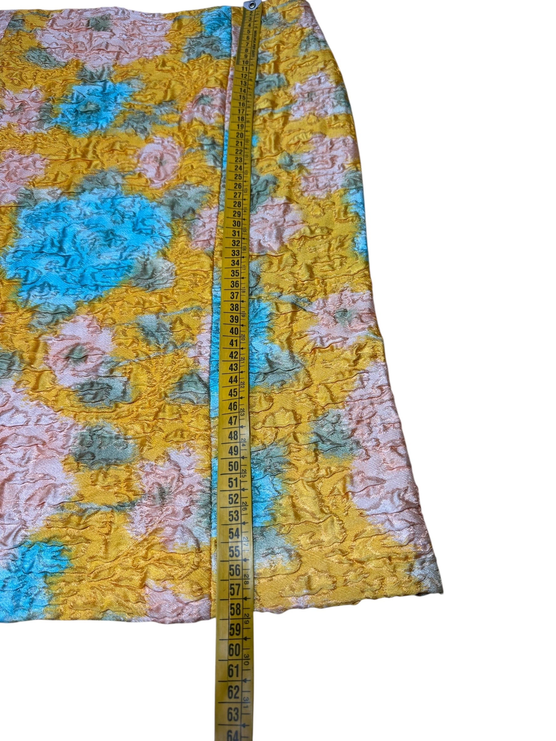 Gonna vintage Miu Miu dalla linea leggermente svasata, realizzata in un prezioso tessuto operato composto al 64% da seta e al 36% da nylon. La lavorazione tridimensionale crea un effetto stropicciato a rilievo che arricchisce la fantasia floreale nei toni pastello di giallo senape, azzurro, rosa cipria e verde salvia. Modello a vita alta con zip posteriore nascosta e cuciture verticali che slanciano la silhouette. Non è foderata, ma la consistenza del tessuto garantisce una buona coprenza.