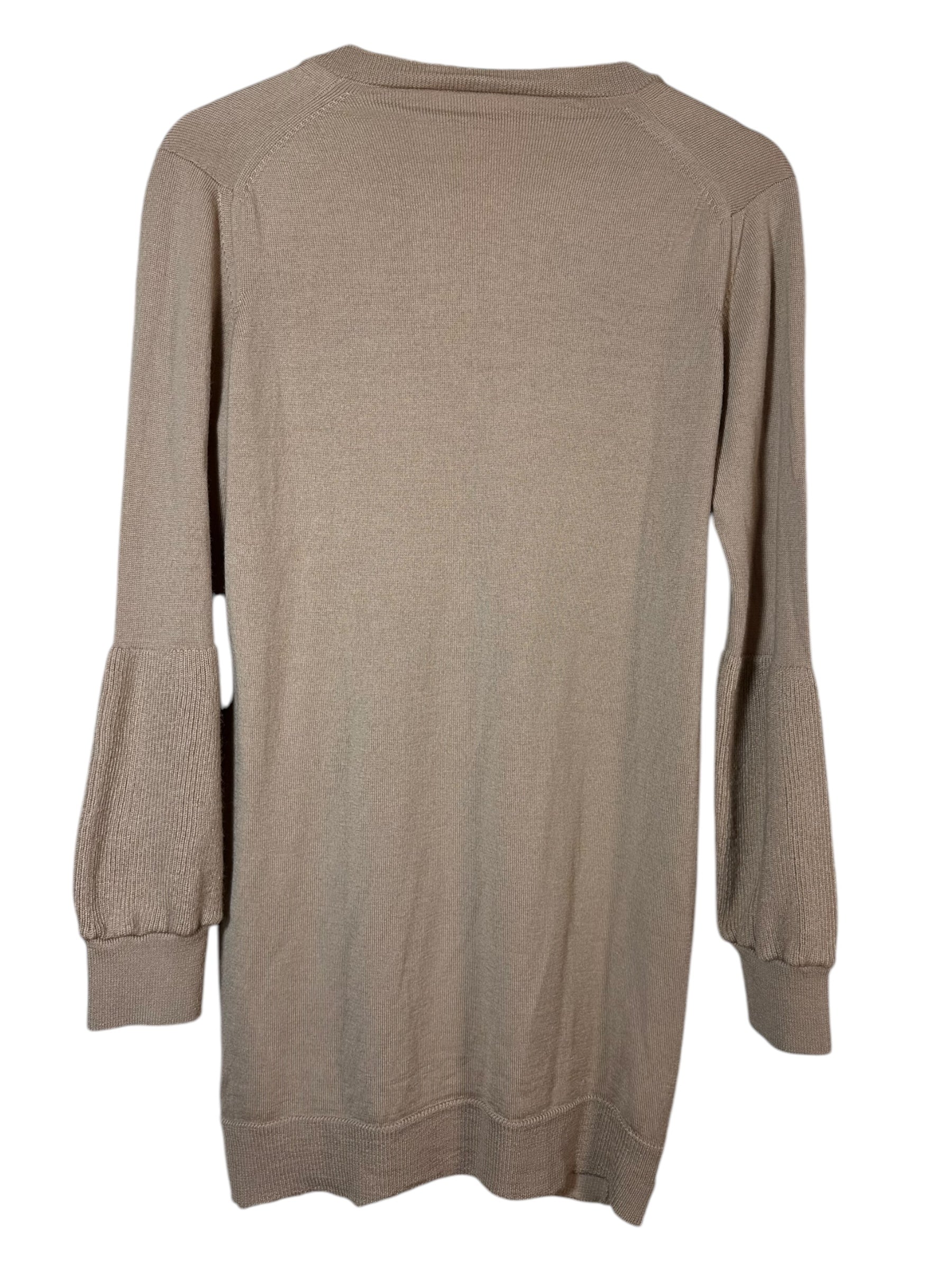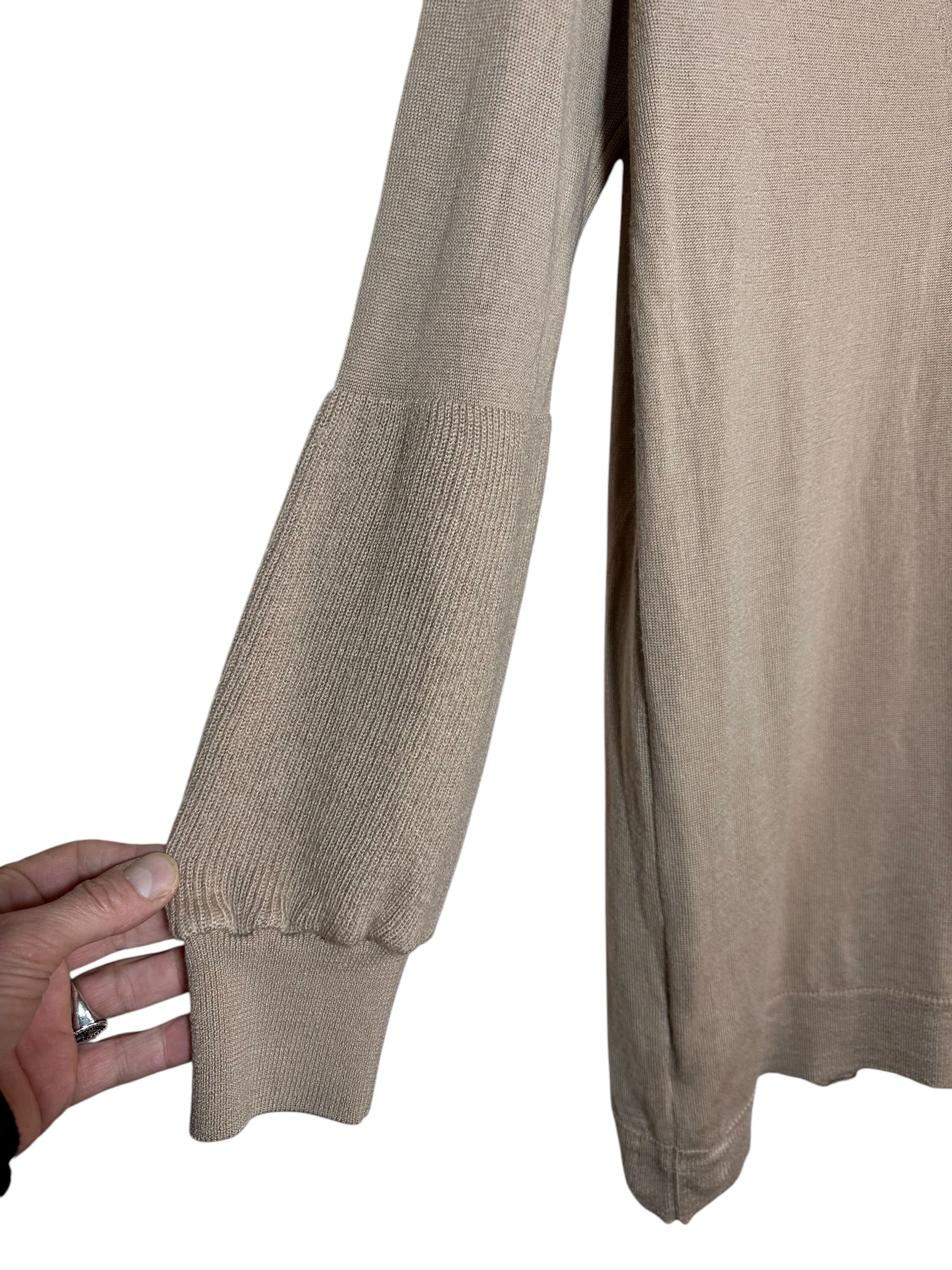 Maniche lunghe con polsini a costine: Le maniche hanno una lavorazione particolare, con una parte superiore liscia e una sezione inferiore in maglia più lavorata che termina con un polsino elasticizzato.