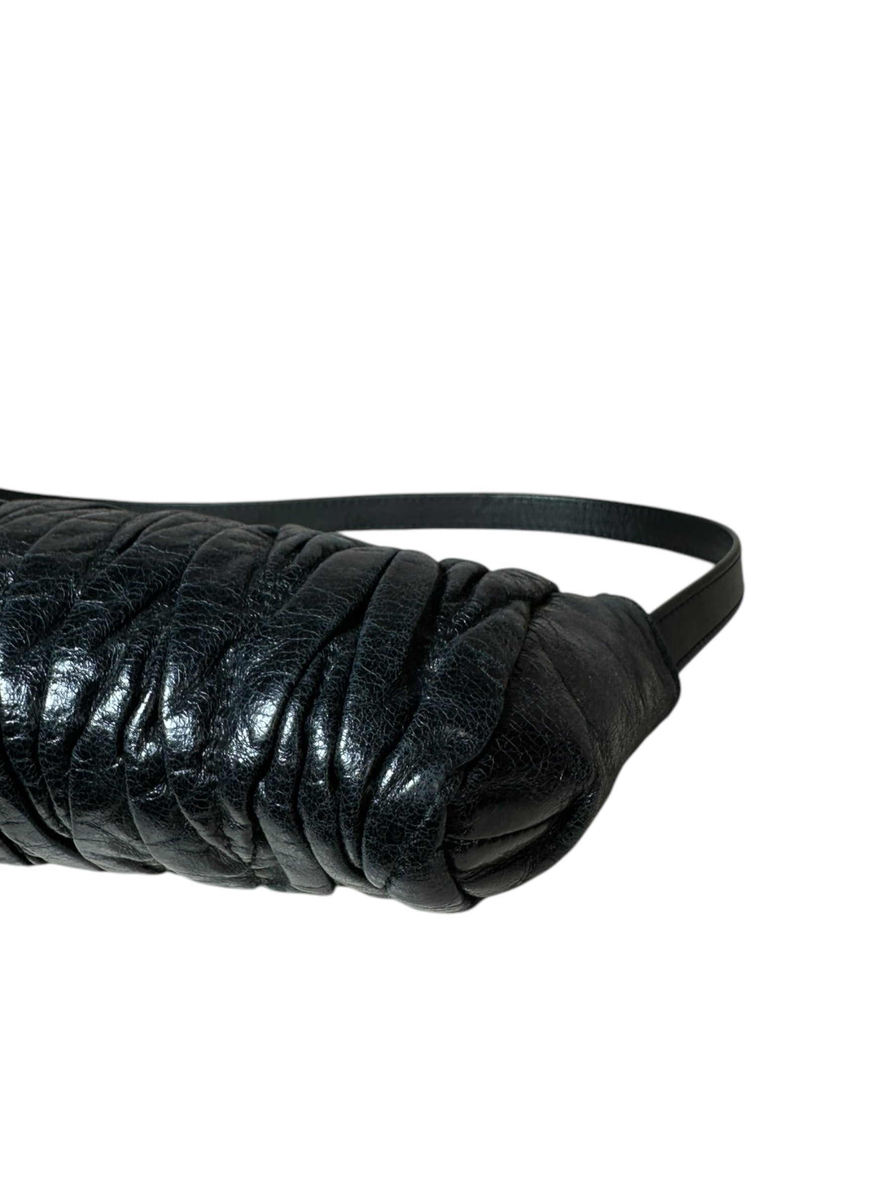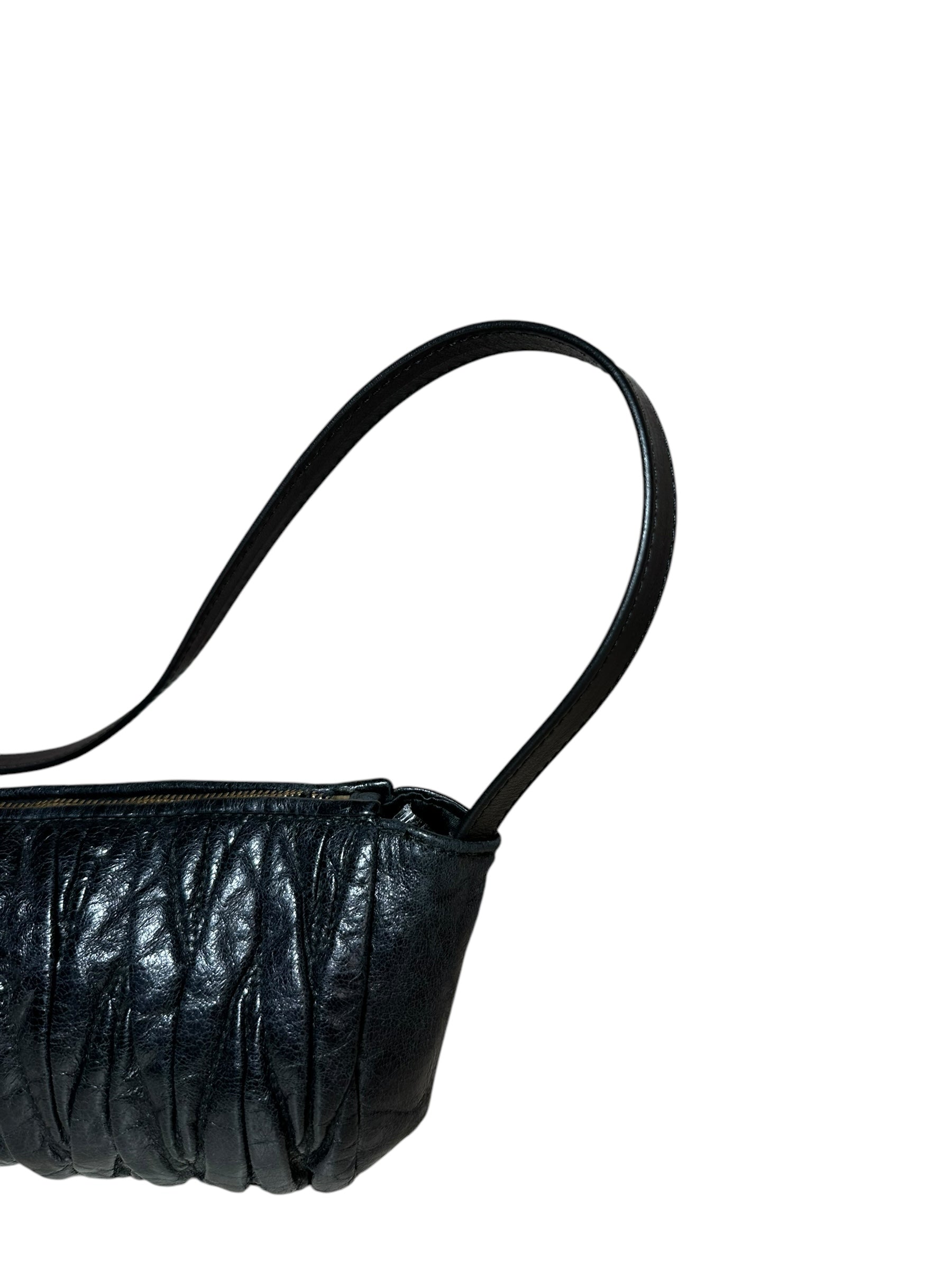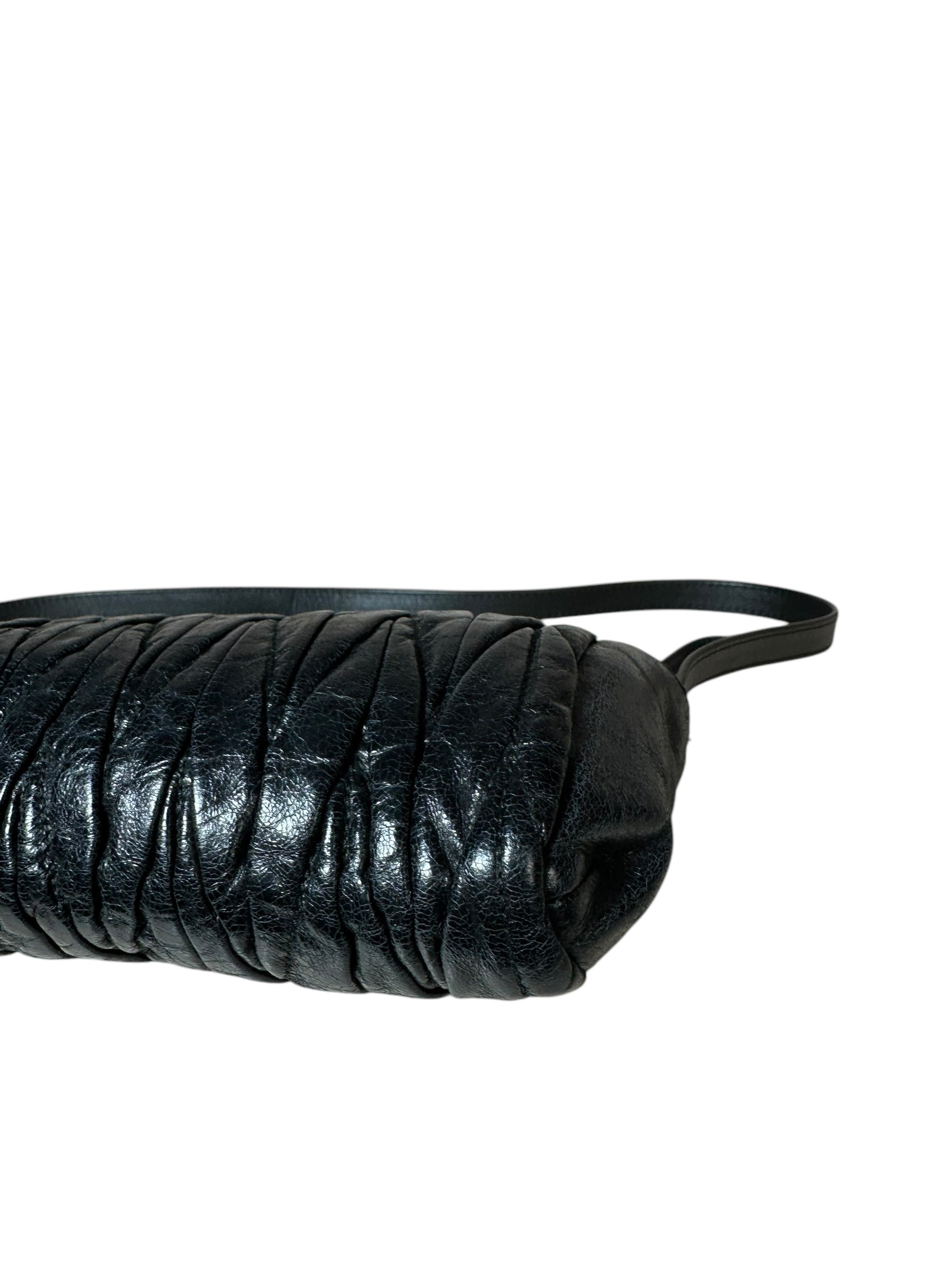 Elegante miniborsa firmata Miu Miu, realizzata in pelle nera effetto vintage con lavorazione matelassé, che dona un aspetto sofisticato e leggermente strutturato. Il design compatto la rende perfetta per l’uso quotidiano o per occasioni serali.
