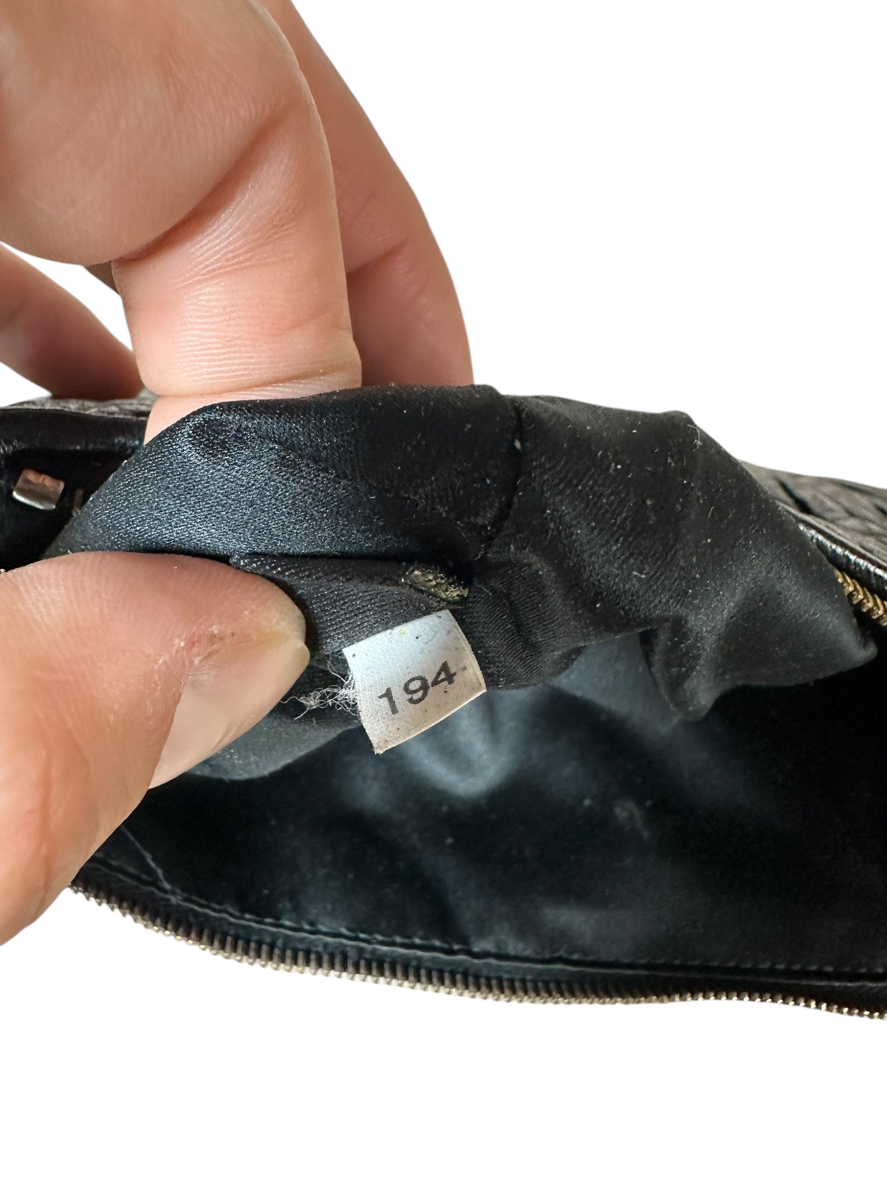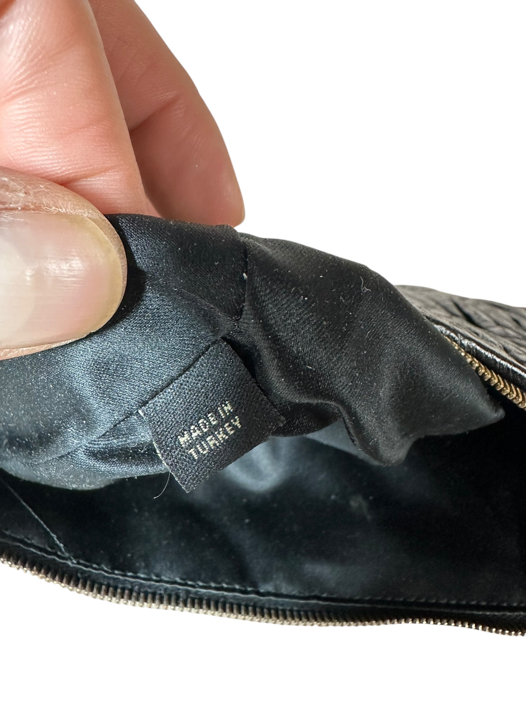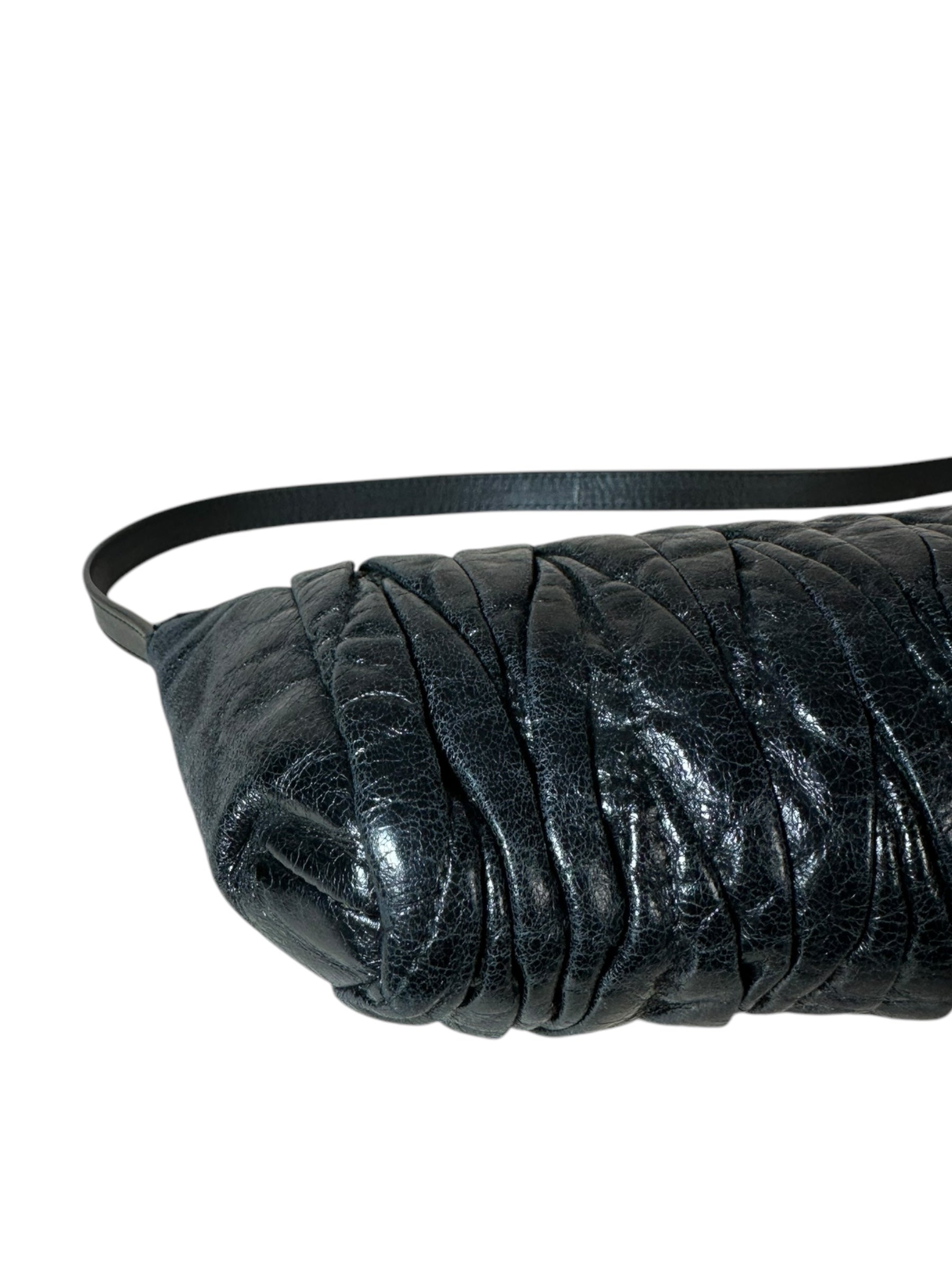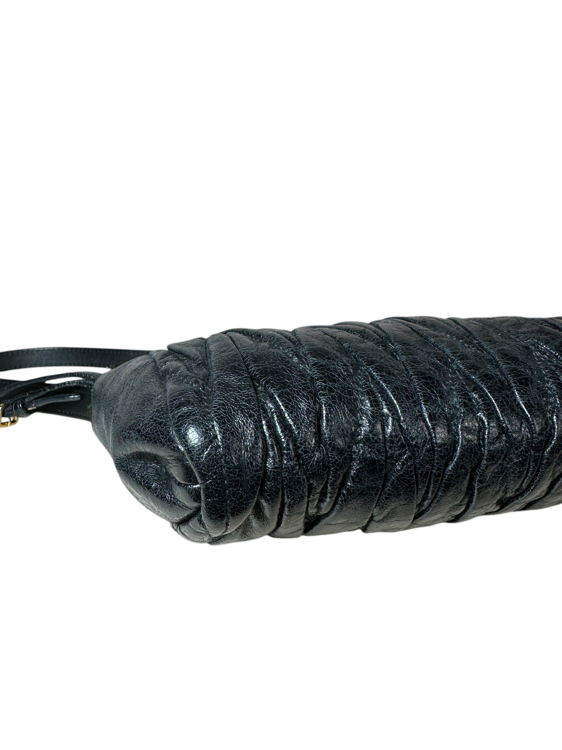 Elegante miniborsa firmata Miu Miu, realizzata in pelle nera effetto vintage con lavorazione matelassé, che dona un aspetto sofisticato e leggermente strutturato. Il design compatto la rende perfetta per l’uso quotidiano o per occasioni serali.