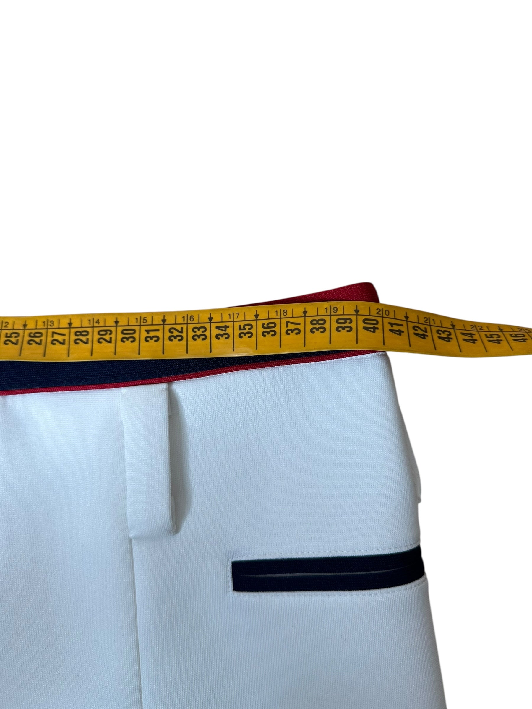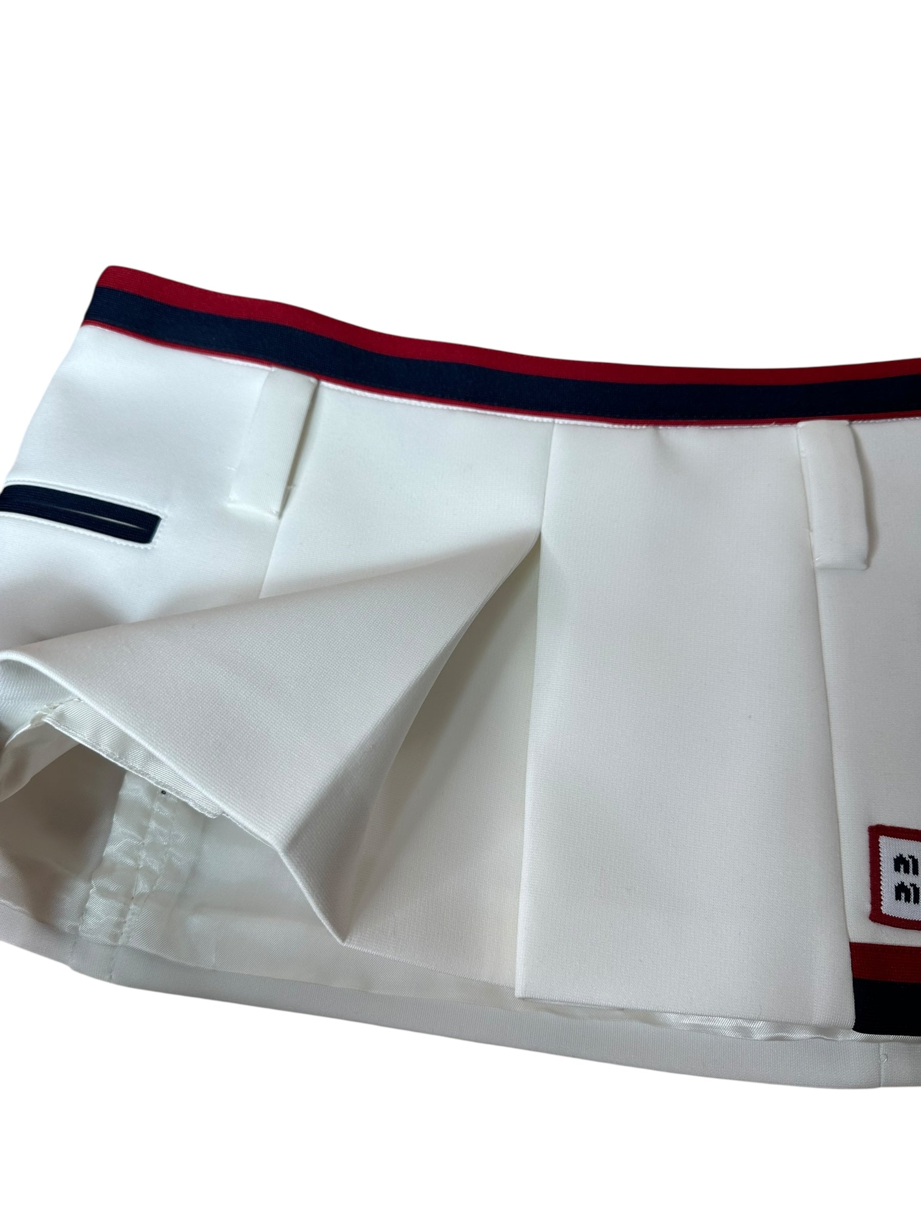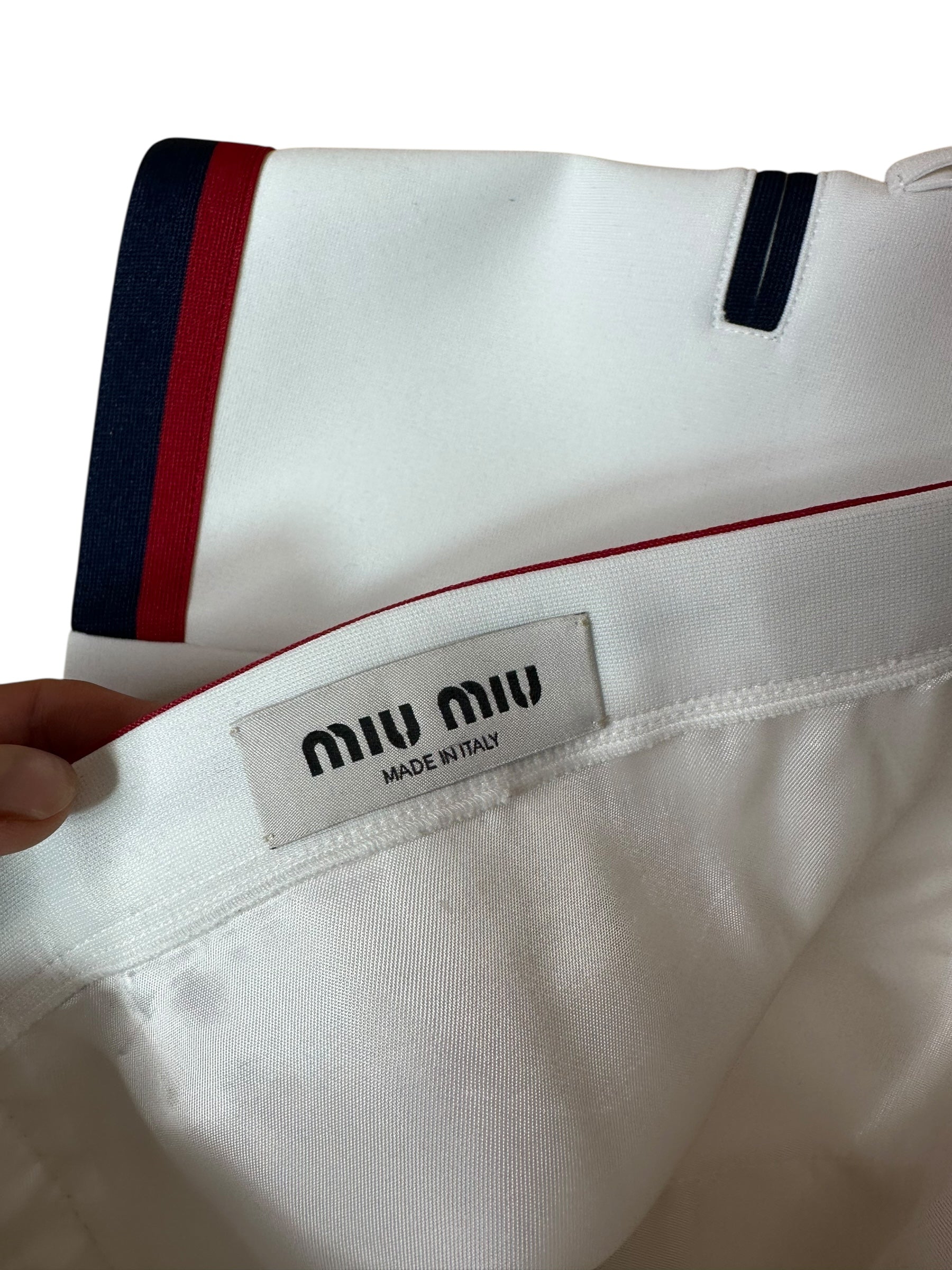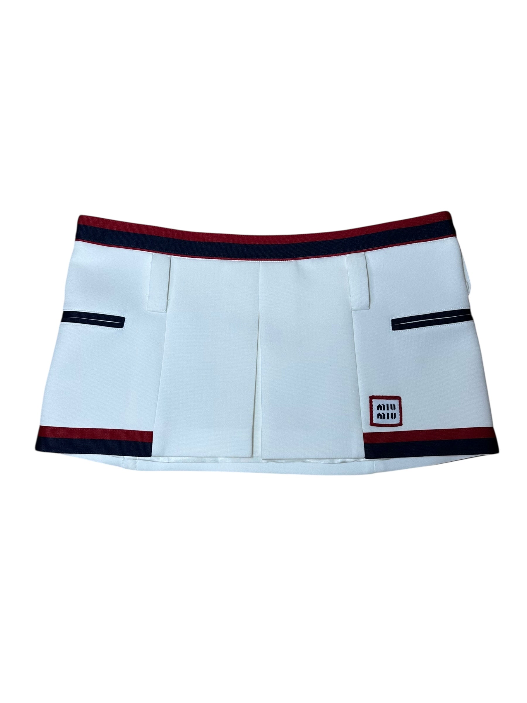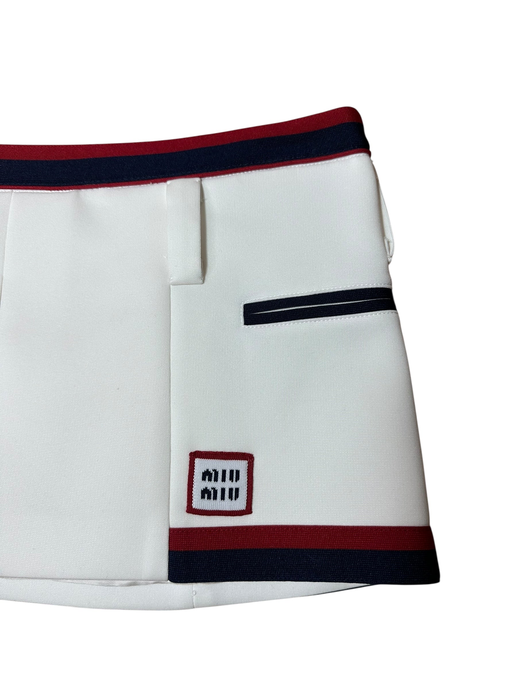 Minigonna firmata Miu Miu dallo stile sportivo e femminile, realizzata in tessuto tecnico leggermente strutturato (98% poliestere, 2% elastan), con fodera interna in 100% viscosa. Il modello presenta una silhouette mini a pieghe, con banda elastica in vita in blu navy e rosso, in tinta con i profili delle finte tasche laterali. Logo Miu Miu applicato sul davanti in versione patch. Vestibilità a vita bassa.