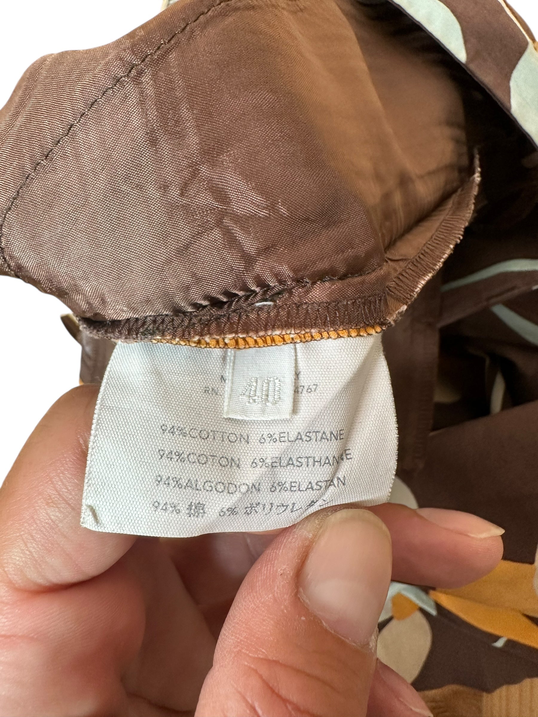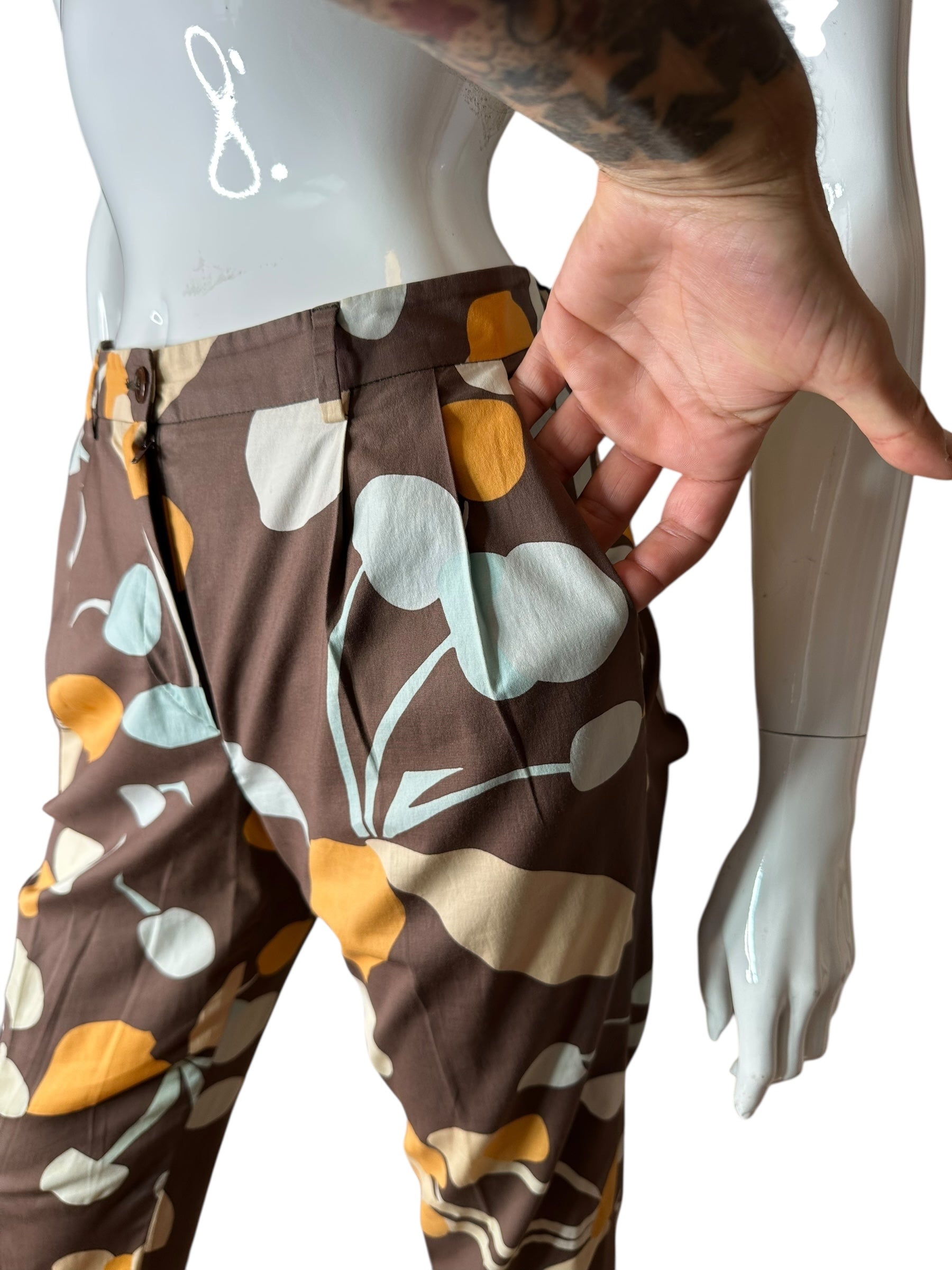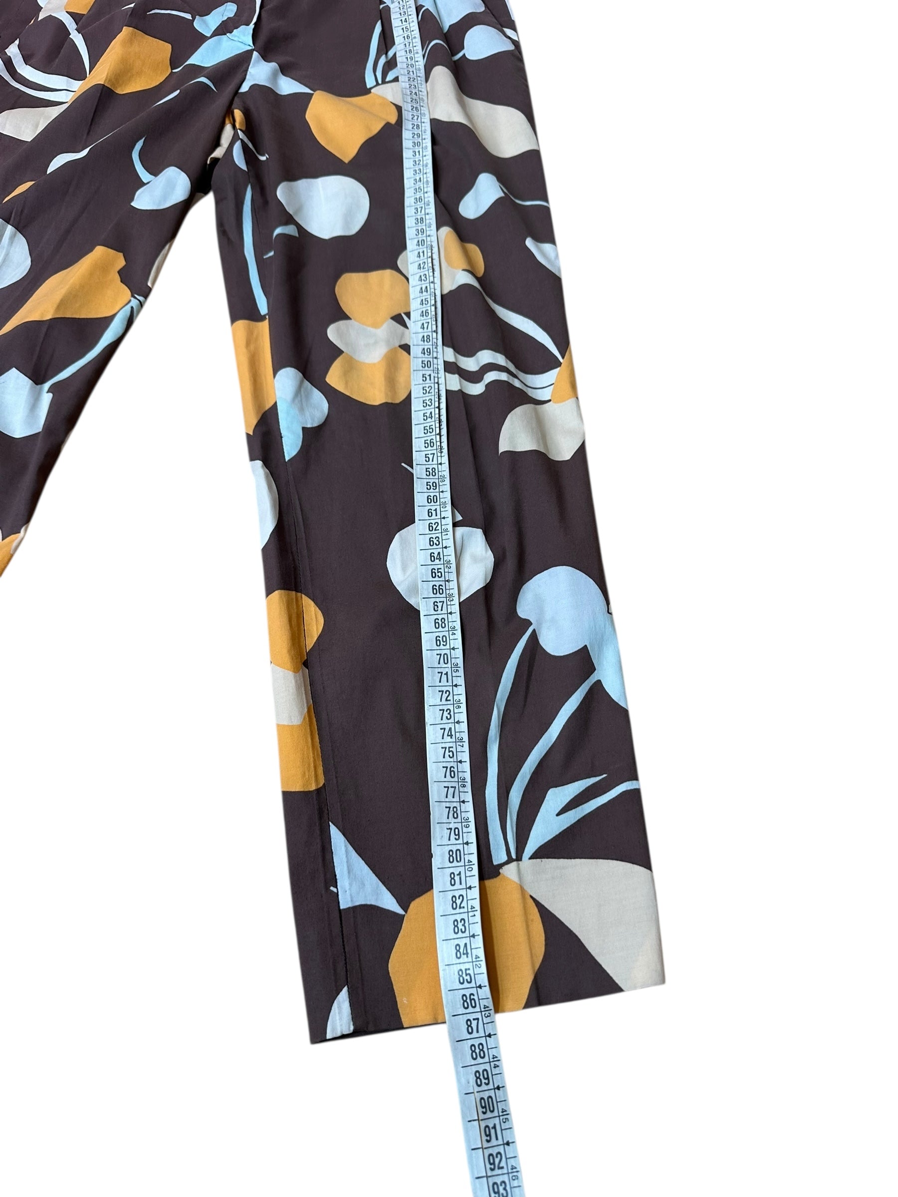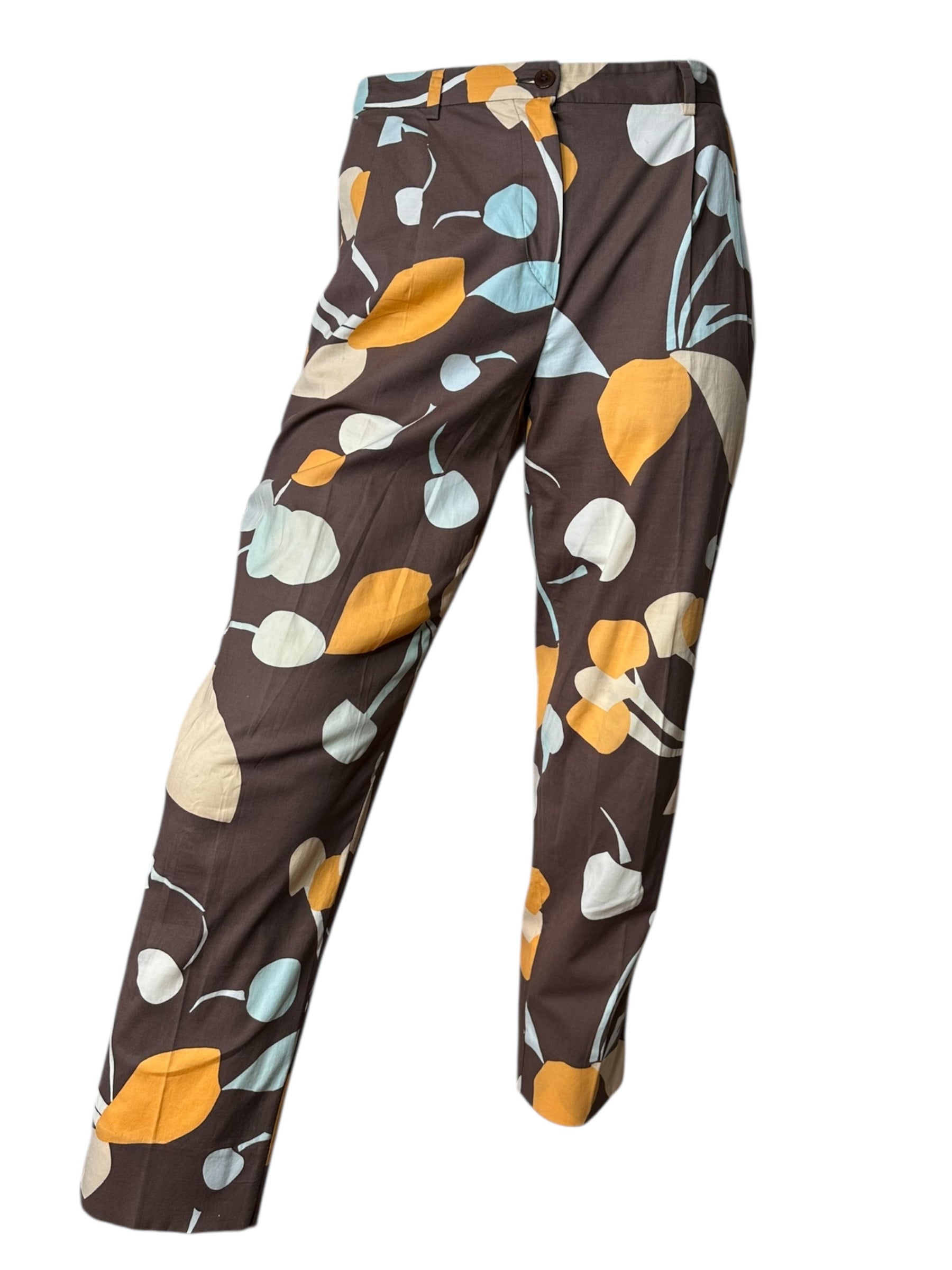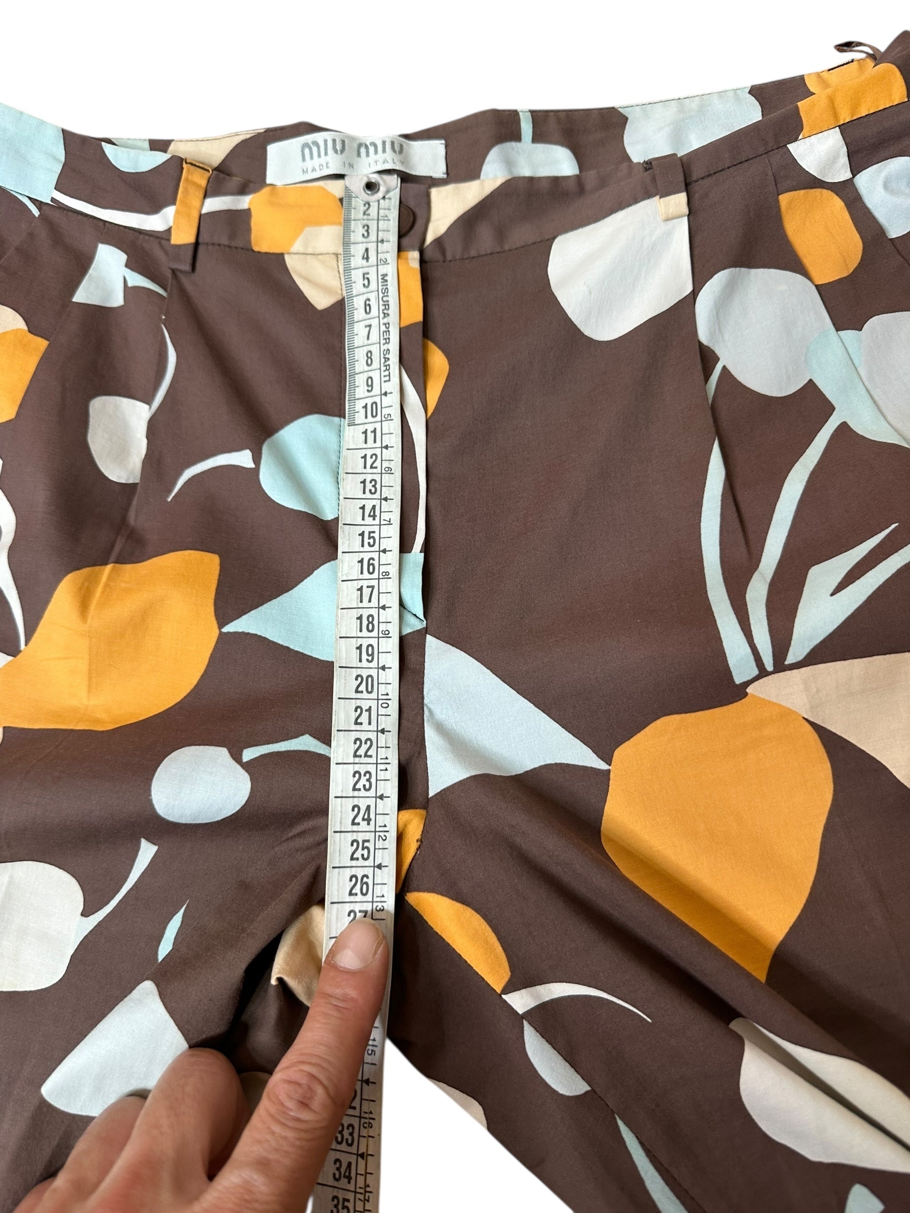 Pantalone dritto firmato Miu Miu, realizzato in tessuto non elasticizzato di puro cotone con stampa astratta dai toni giallo senape, celeste e panna su base marrone cioccolato. Il modello presenta pieghe cucite sul davanti, tasche laterali a filo, un solo taschino posteriore con bottone, passanti per cintura e chiusura con zip e bottone.