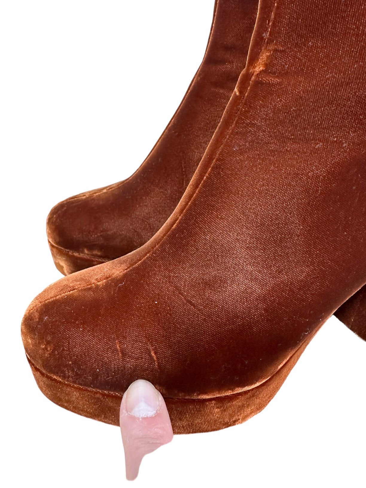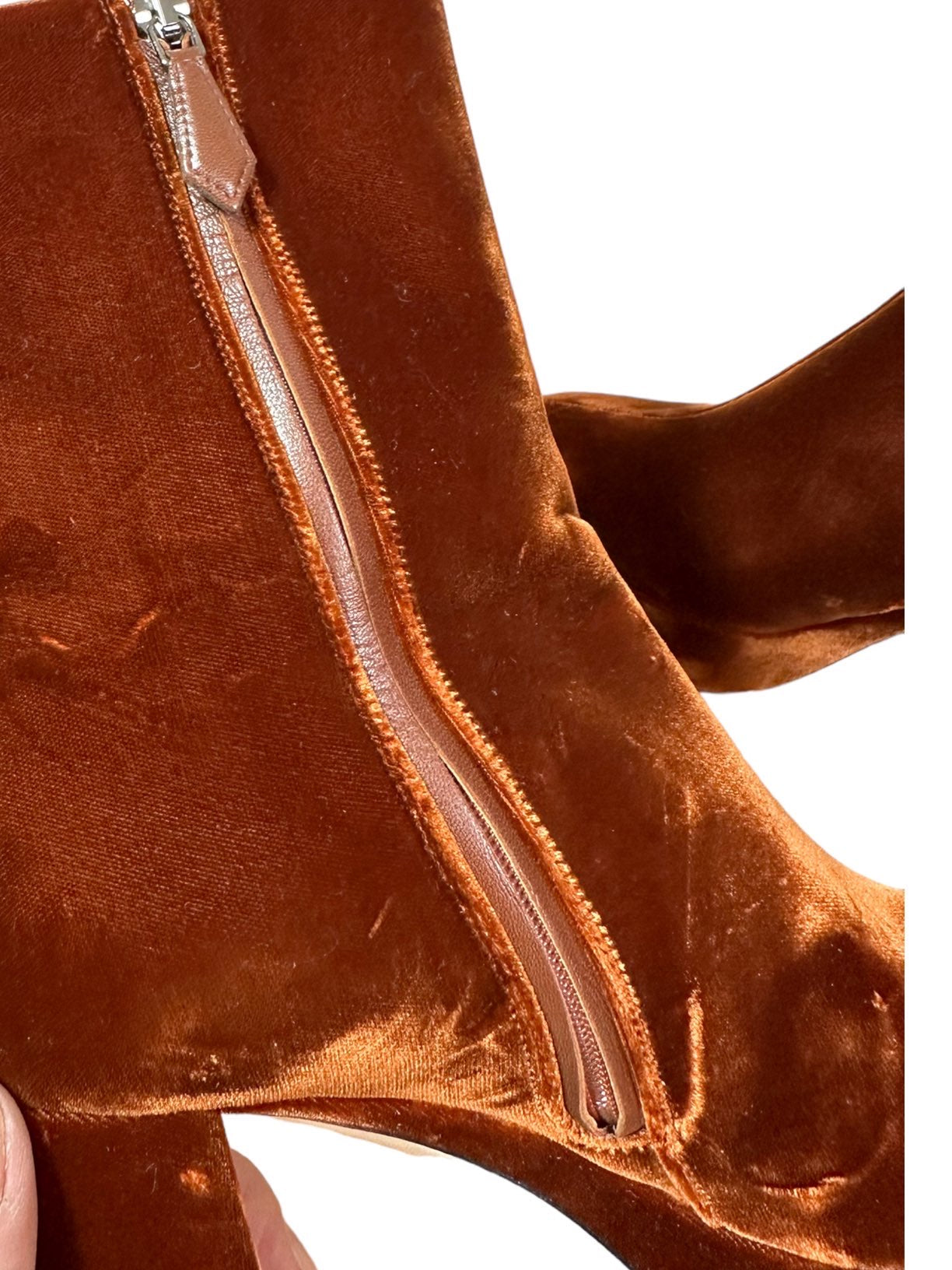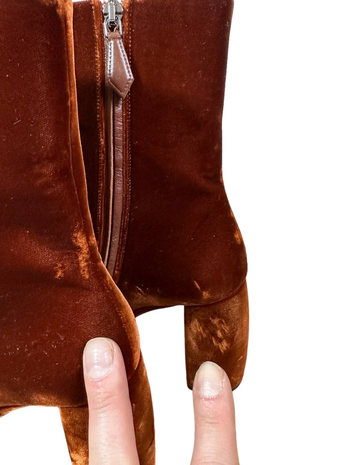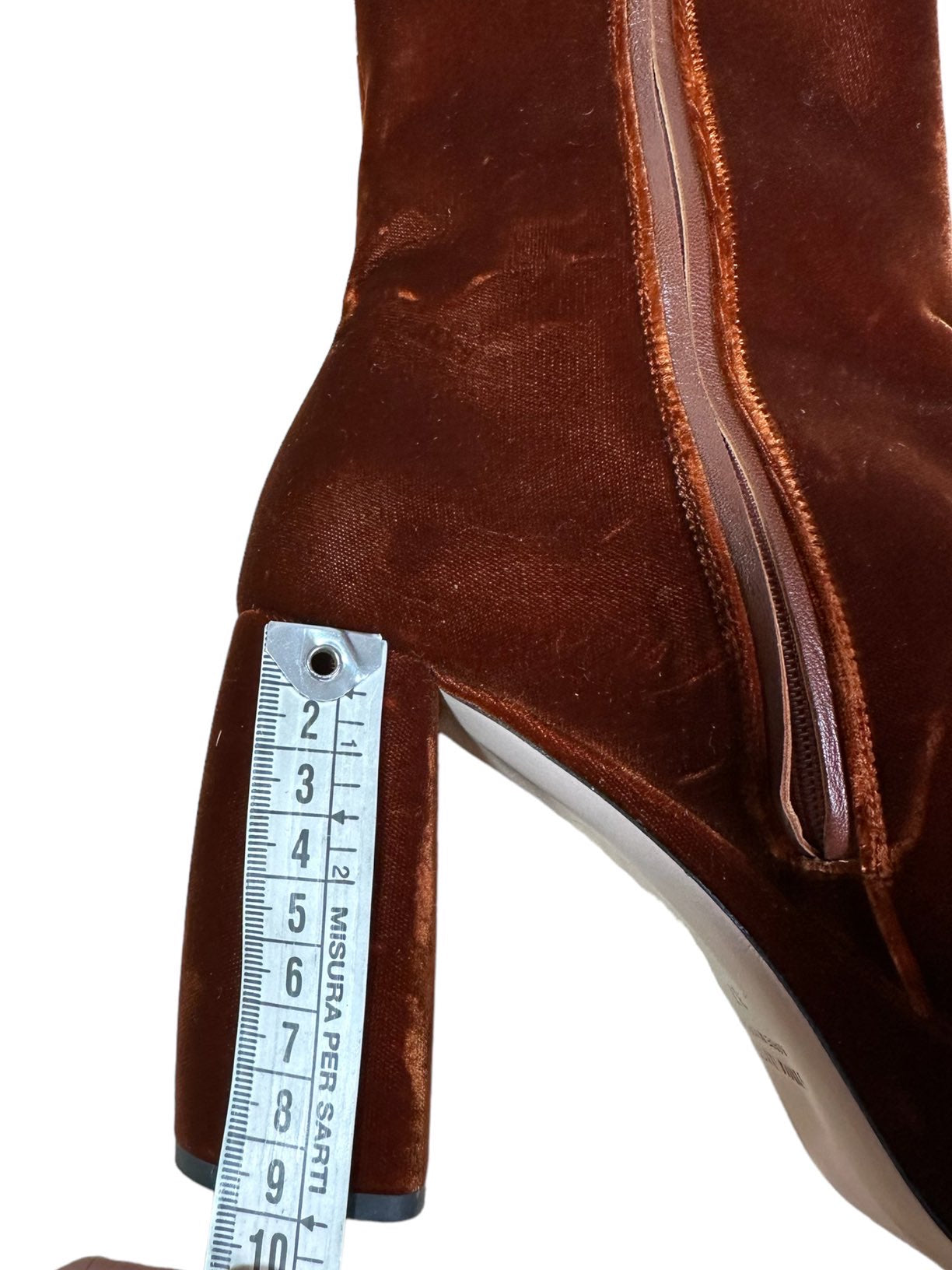Miu Miu stivali a tronchetto in velluto color bronzo con tacco tondeggiato e chiusura a zip nella parte interno. Segni di usura sul velluto come da foto. N. 37 Articolo di seconda mano, non vengono spediti con scatola.