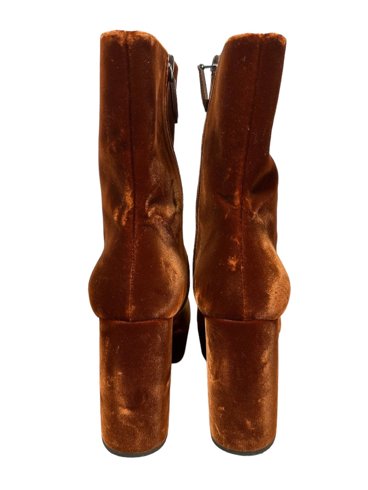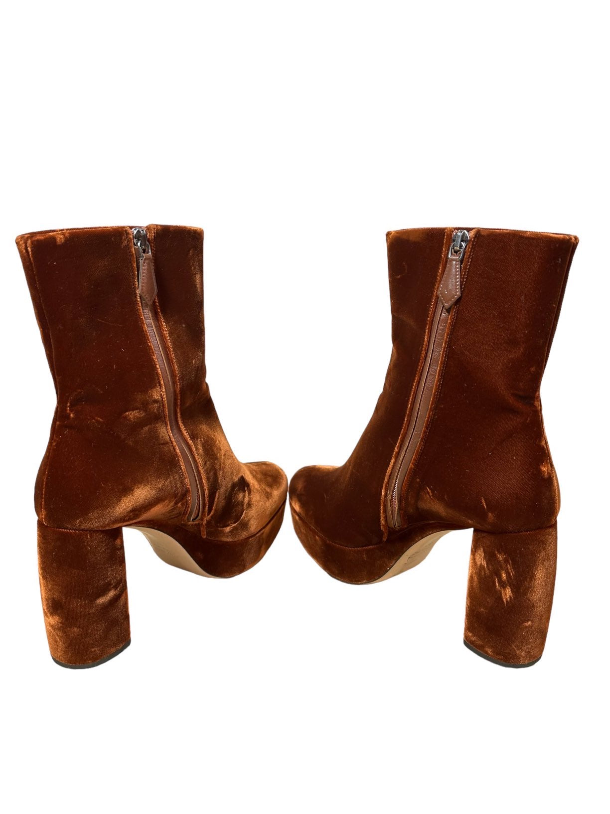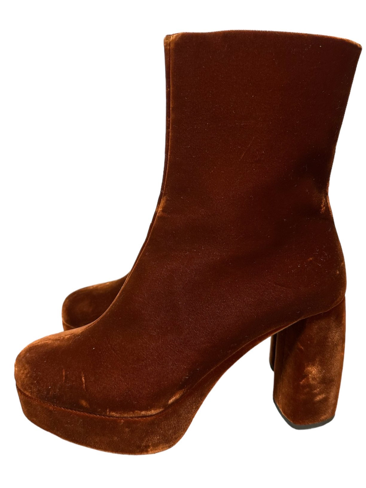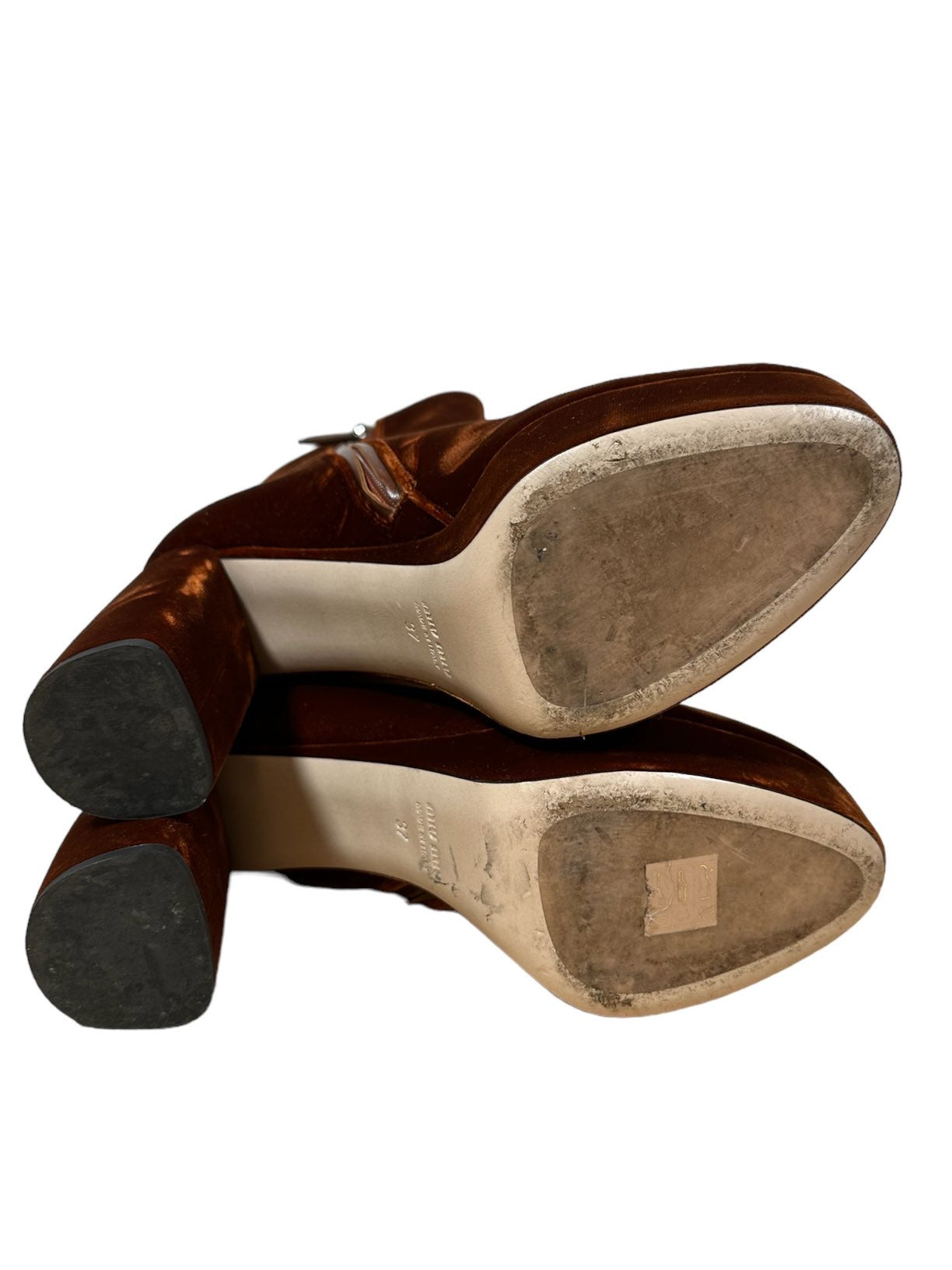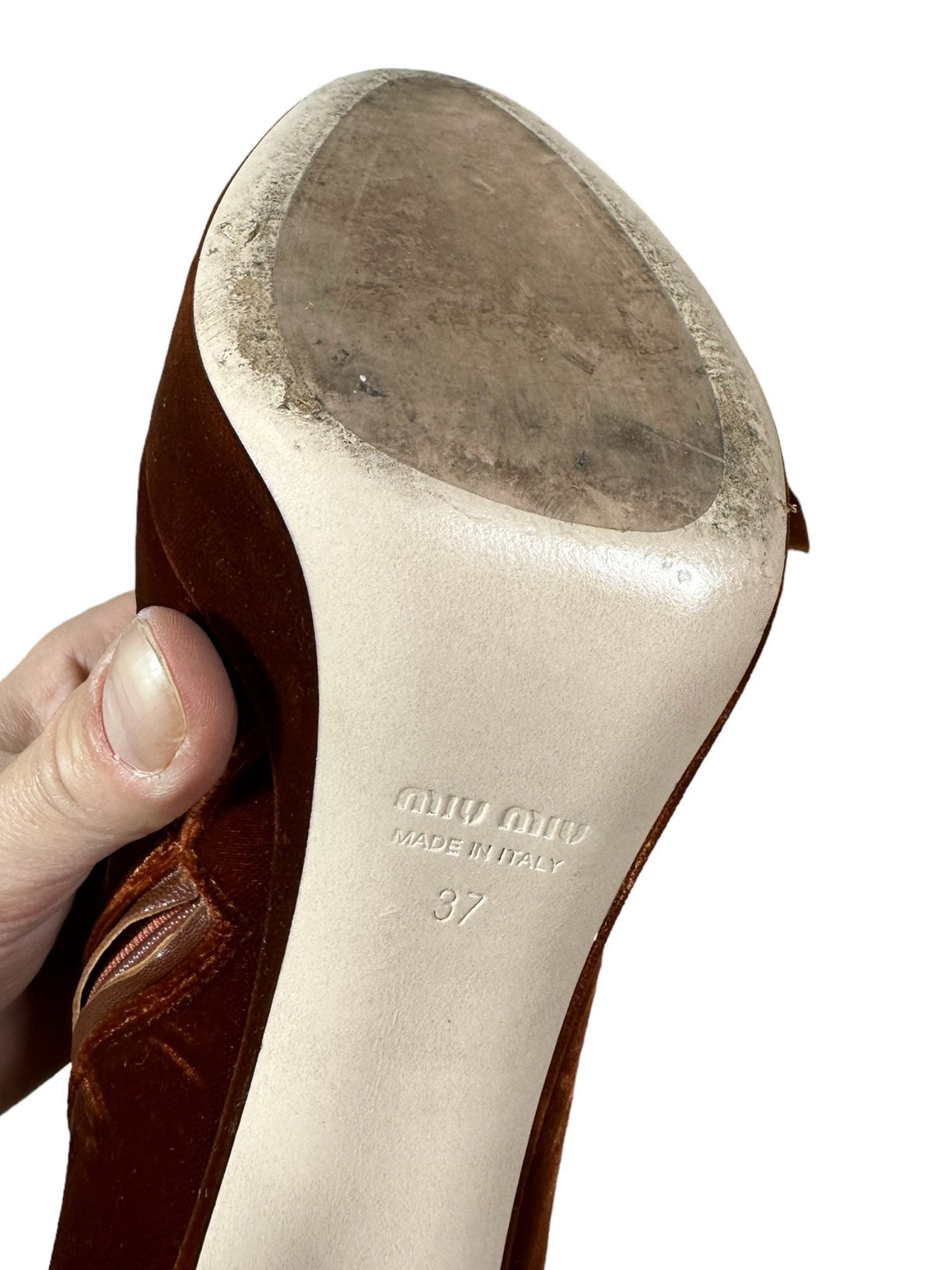 Miu Miu stivali a tronchetto in velluto color bronzo con tacco tondeggiato e chiusura a zip nella parte interno. Segni di usura sul velluto come da foto. N. 37 Articolo di seconda mano, non vengono spediti con scatola.