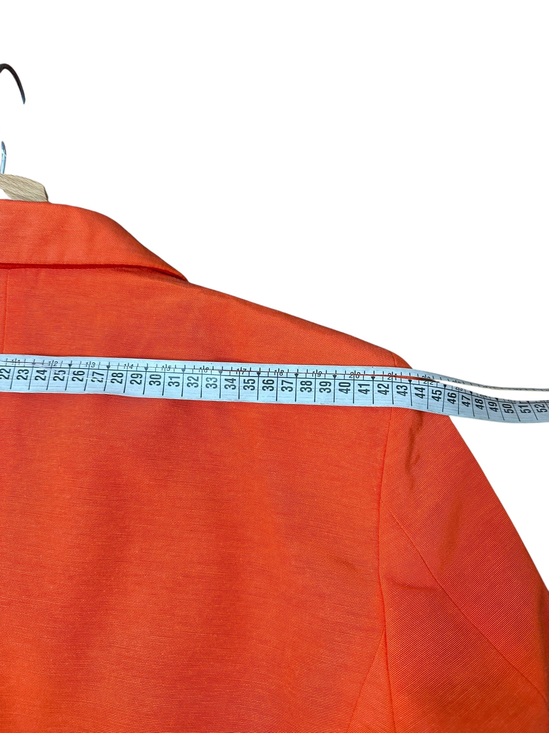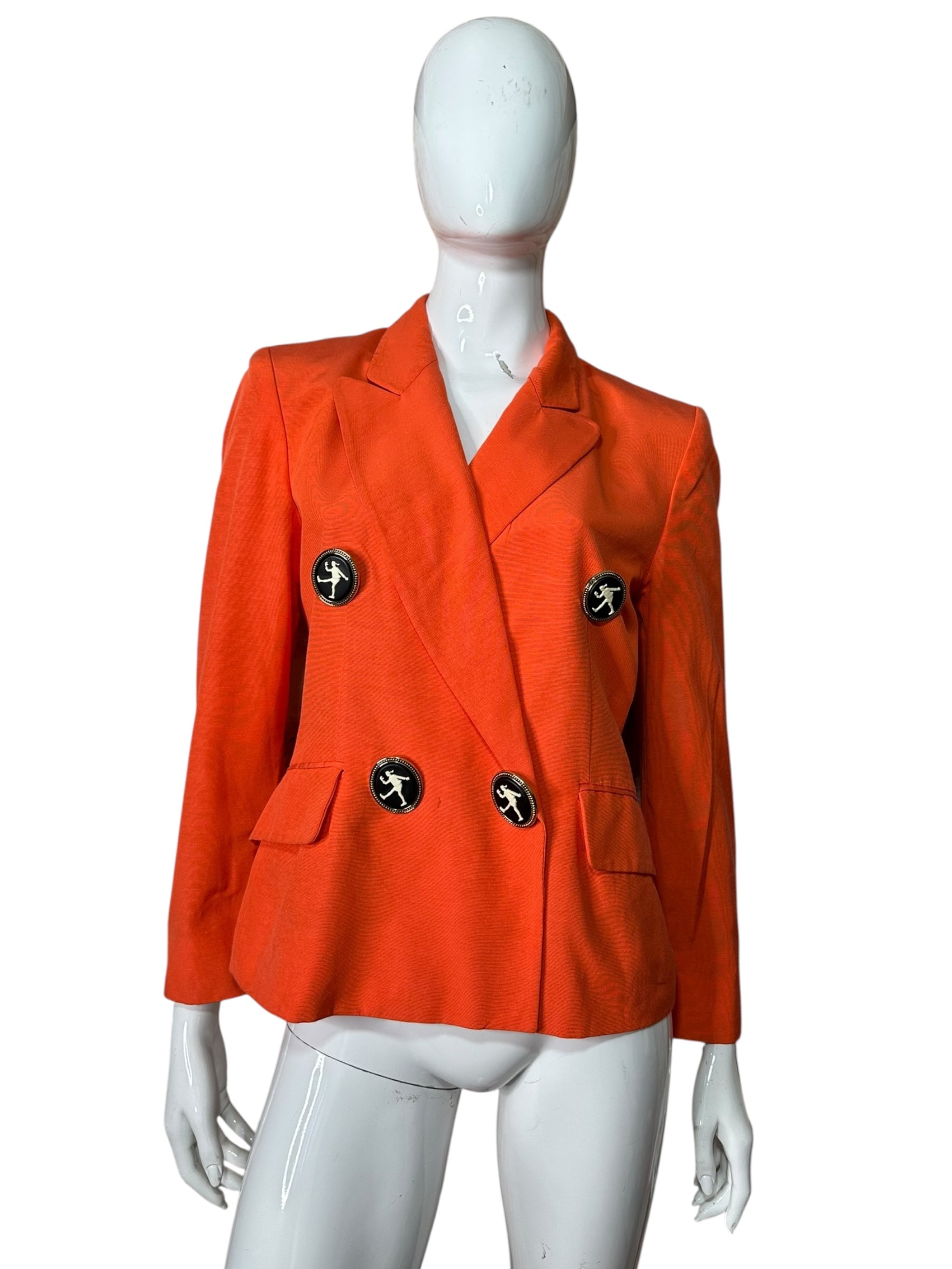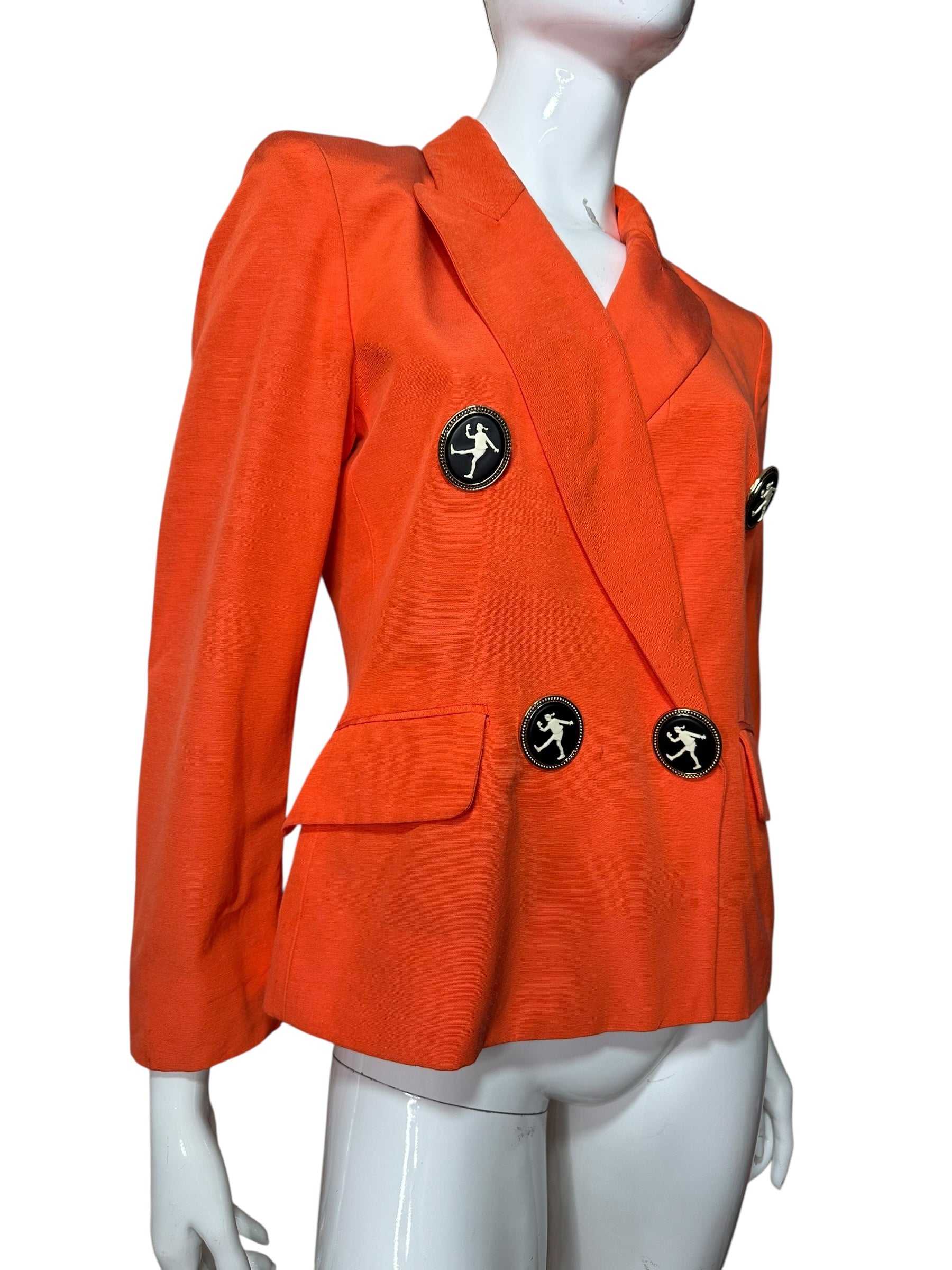 Blazer doppiopetto firmato Cheap and Chic by Moschino, in cotone color arancione acceso. Linea strutturata con spalle definite, ampio revers e doppia abbottonatura frontale con quattro bottoni decorativi effetto cameo in nero, avorio e profilo dorato. Il blazer è completamente foderato, con tasche finte sui lati e taglio sagomato in vita.