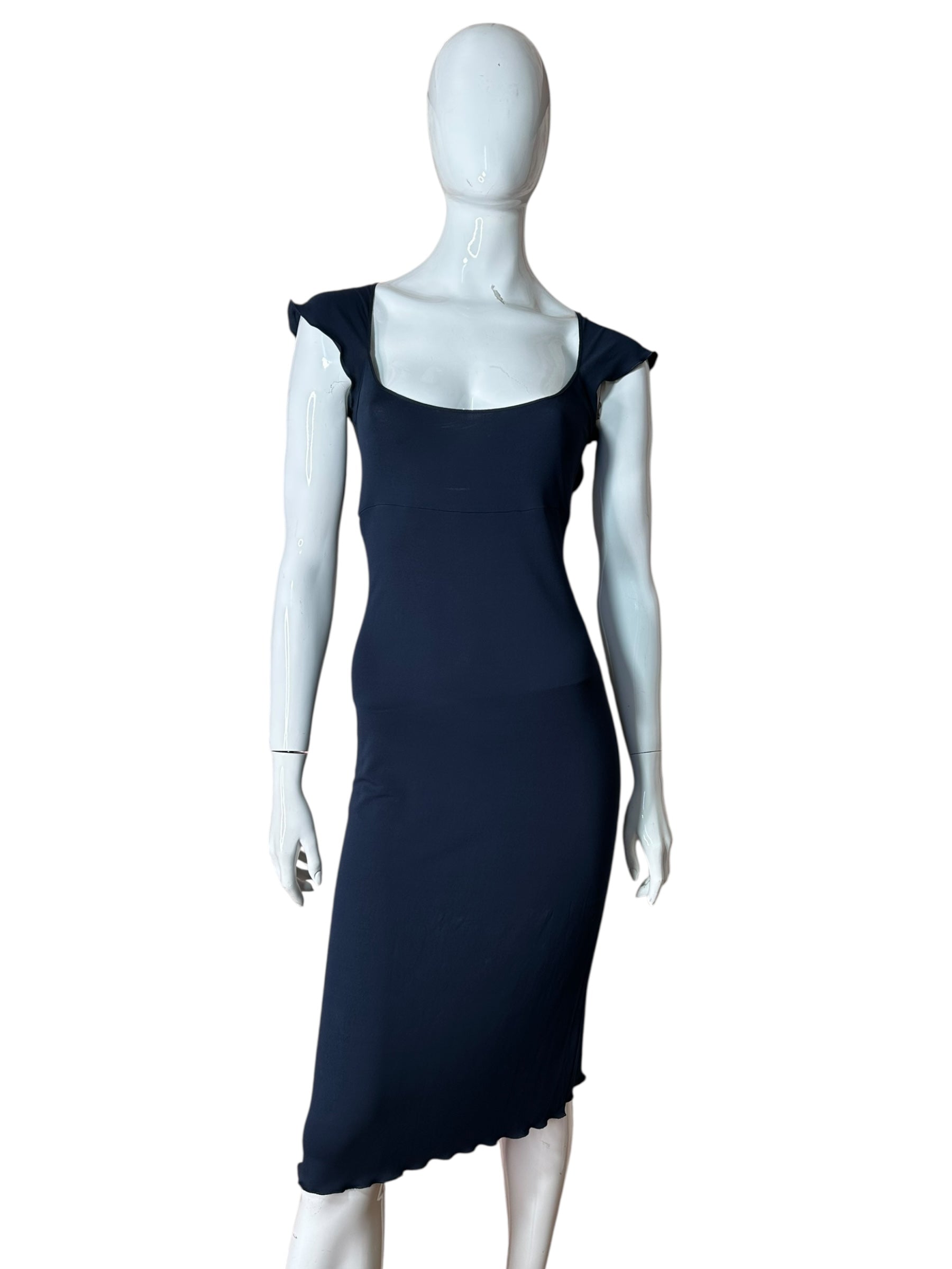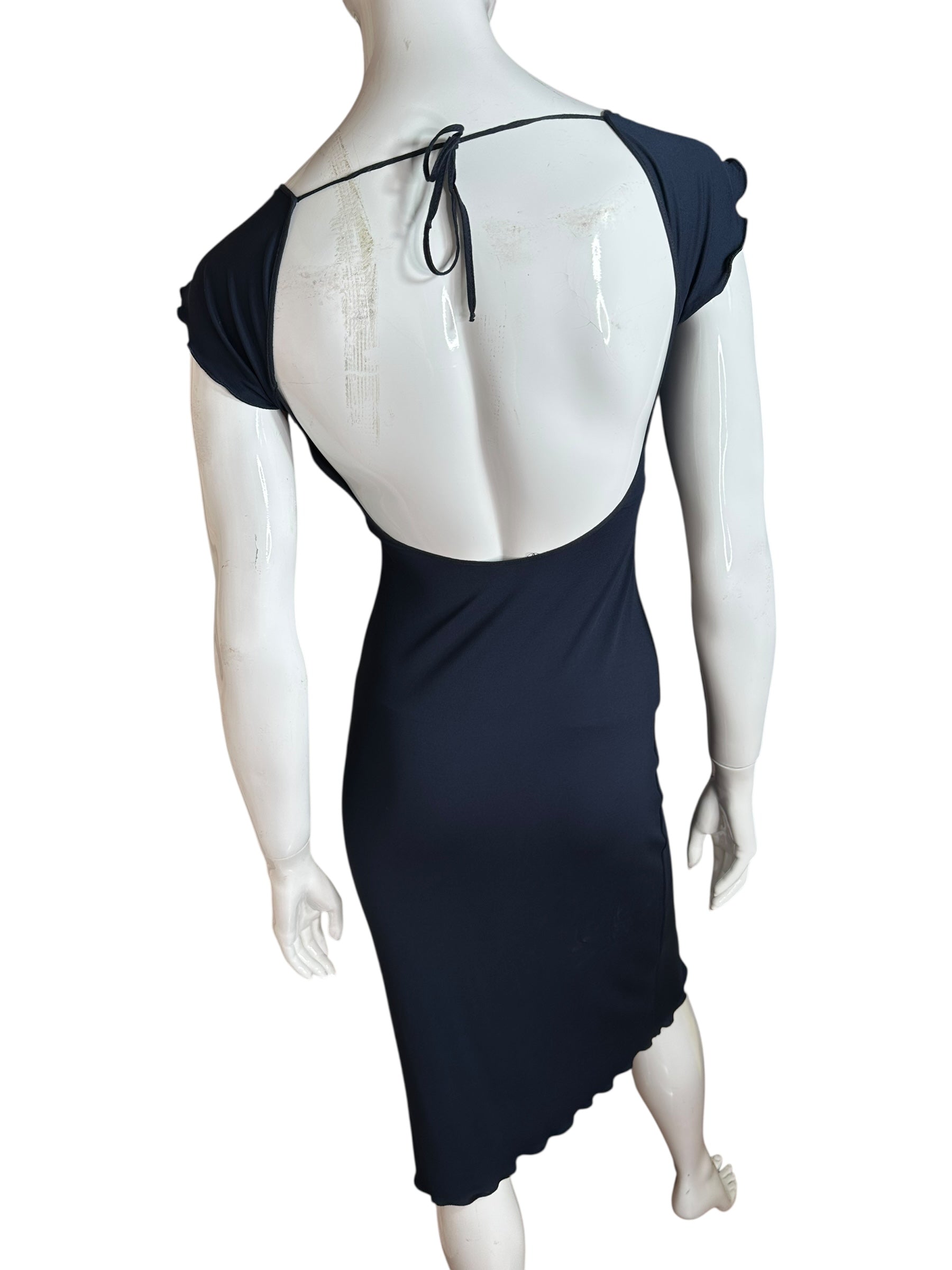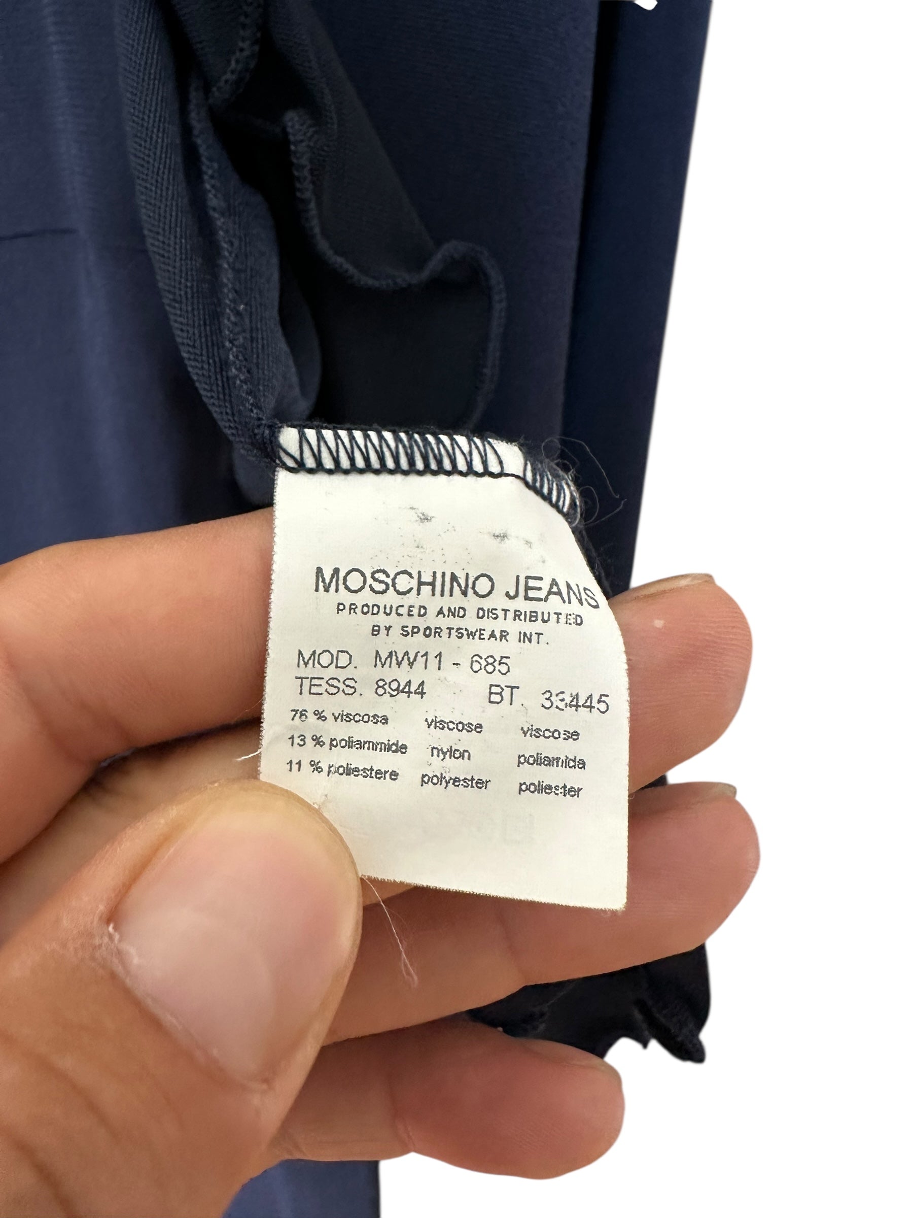 Elegante completo firmato Moschino Jeans, composto da un abito longuette e un cardigan coordinato, entrambi in tessuto fluido e leggermente elasticizzato. Il vestito ha una linea aderente con scollo ampio e maniche ad aletta, impreziosito da una profonda scollatura sulla schiena chiusa da un laccetto sottile. Il bordo inferiore presenta un orlo ondulato asimmetrico che dona movimento alla figura.