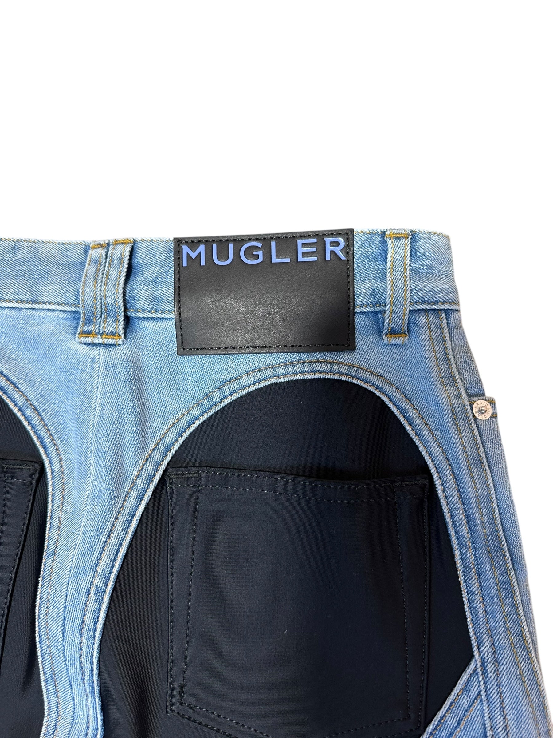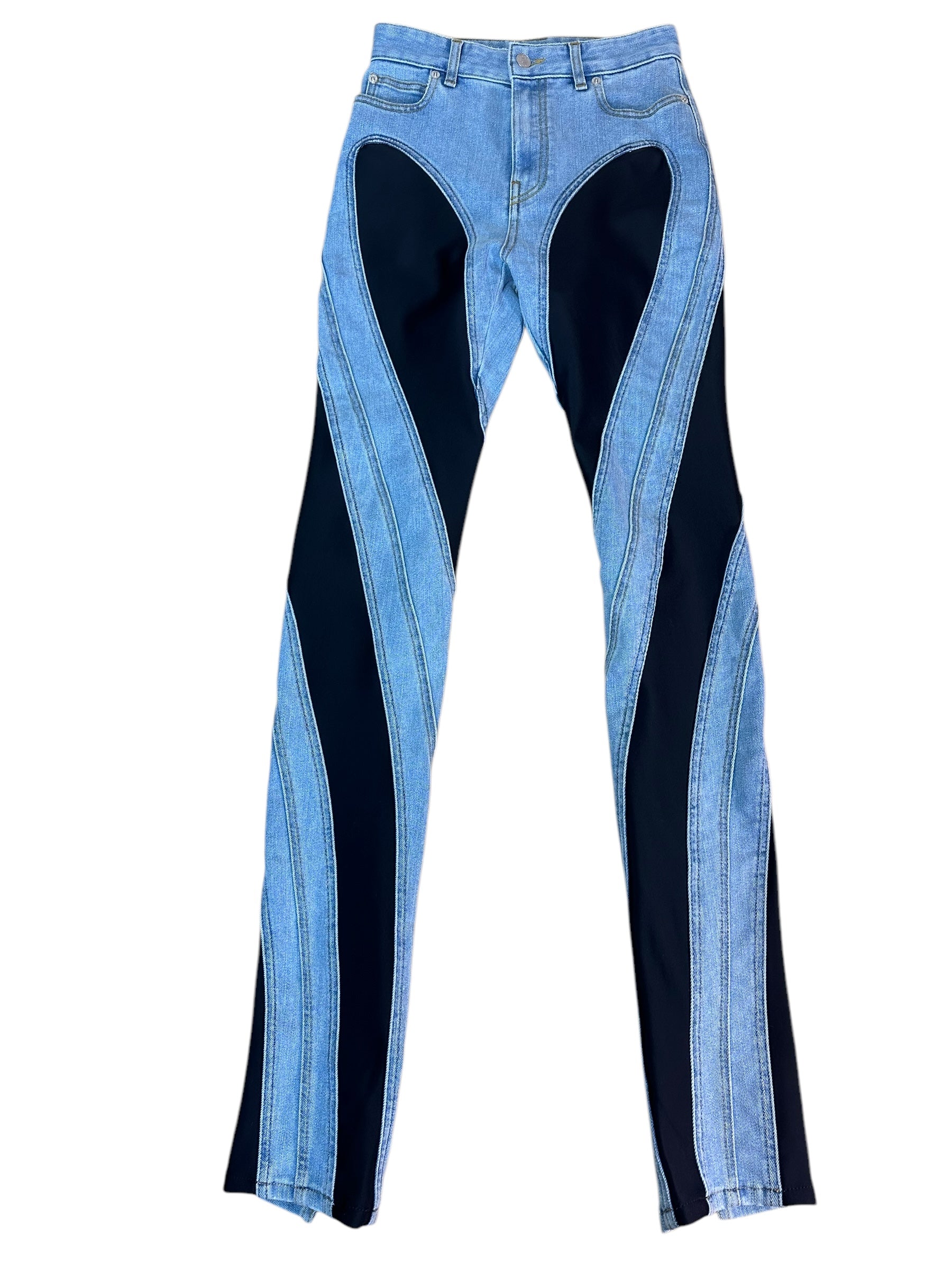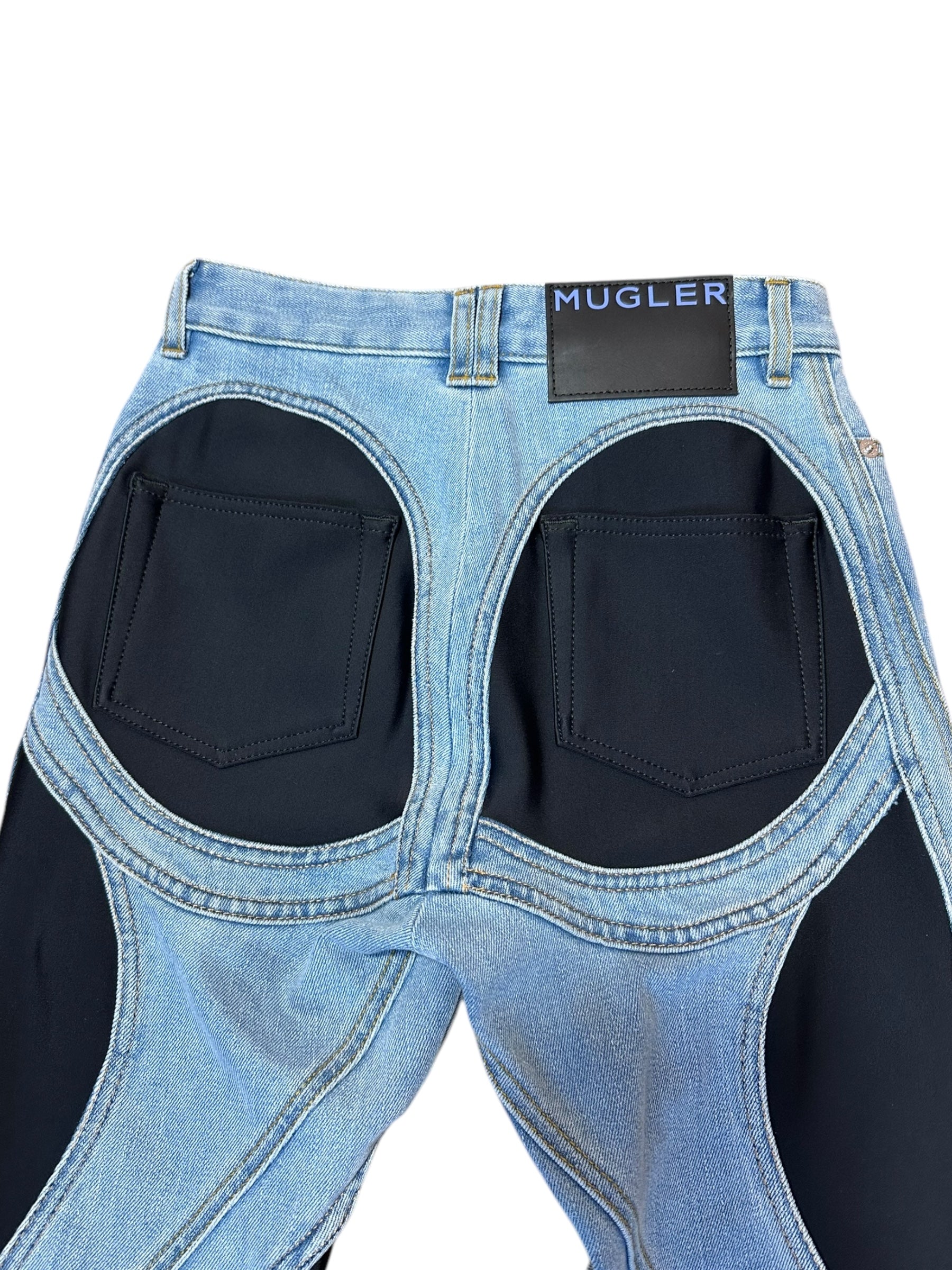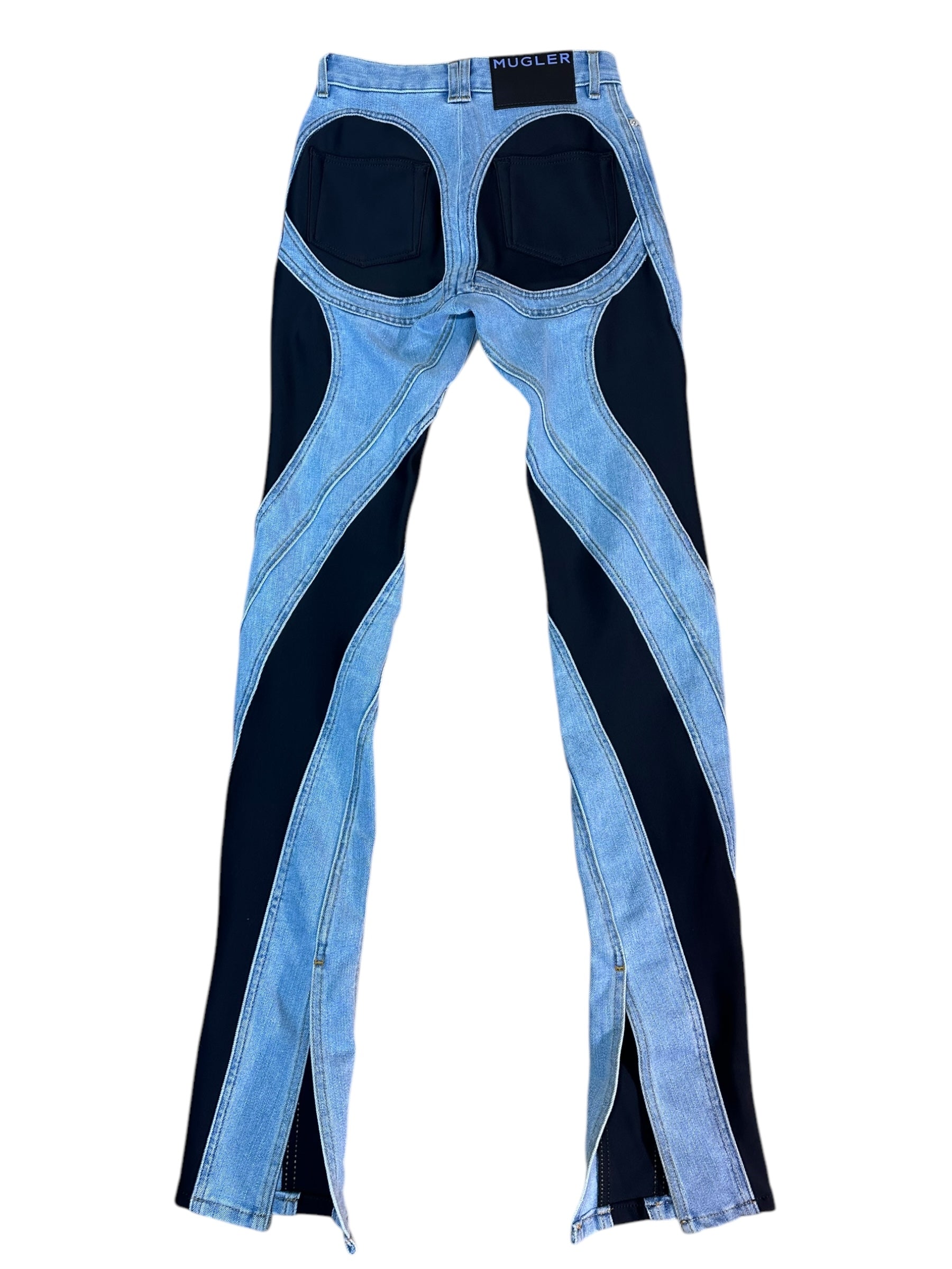 Mugler jeans a vita alta con inserti in tessuto elasticizzato nero, tasche laterali e spacchi sul retro. Vestibilità slim e lunga che rende il modello più affusolato sul finale. Tg. 36 Francese che corrisponde alla 40 Italiana.