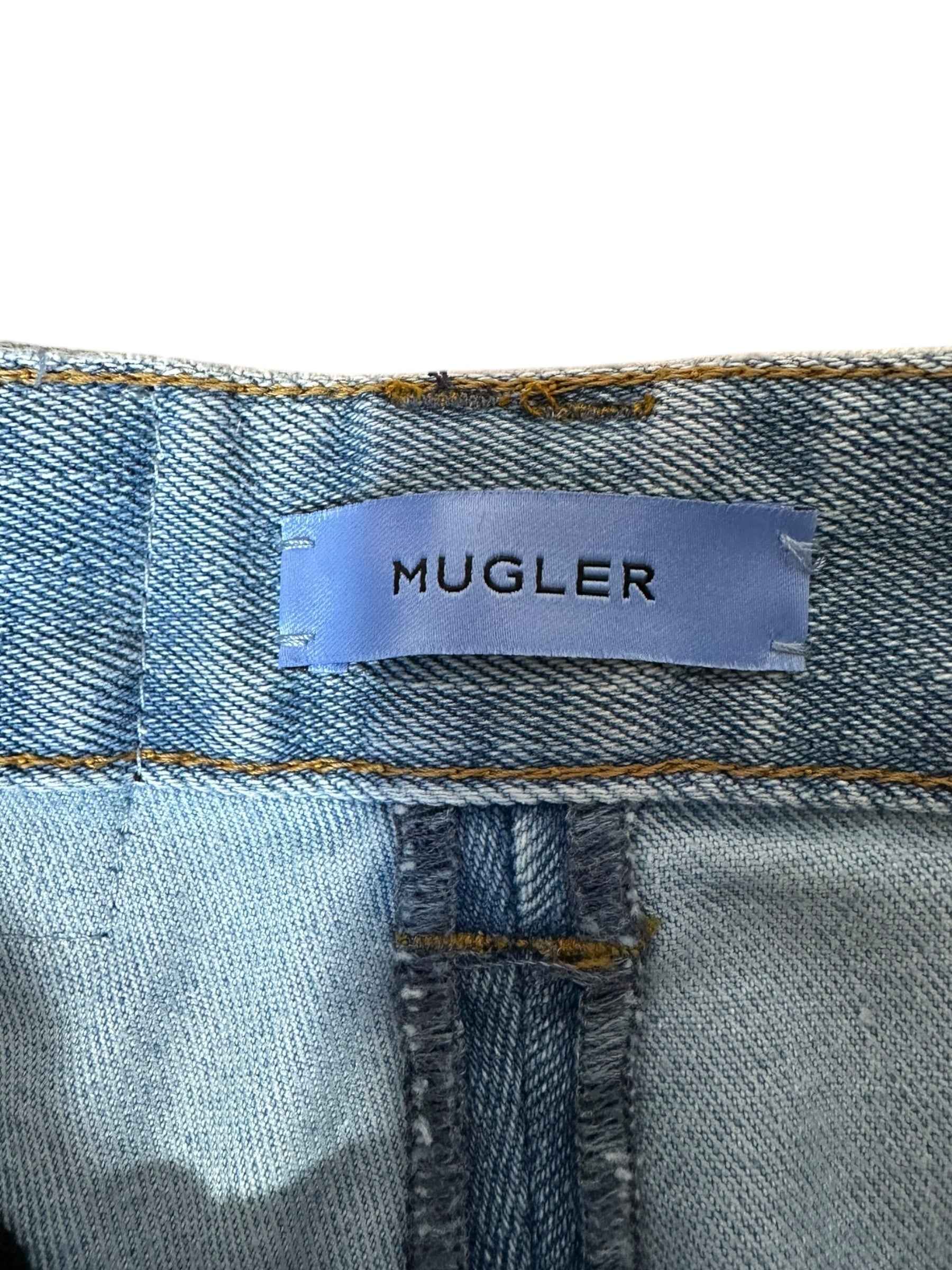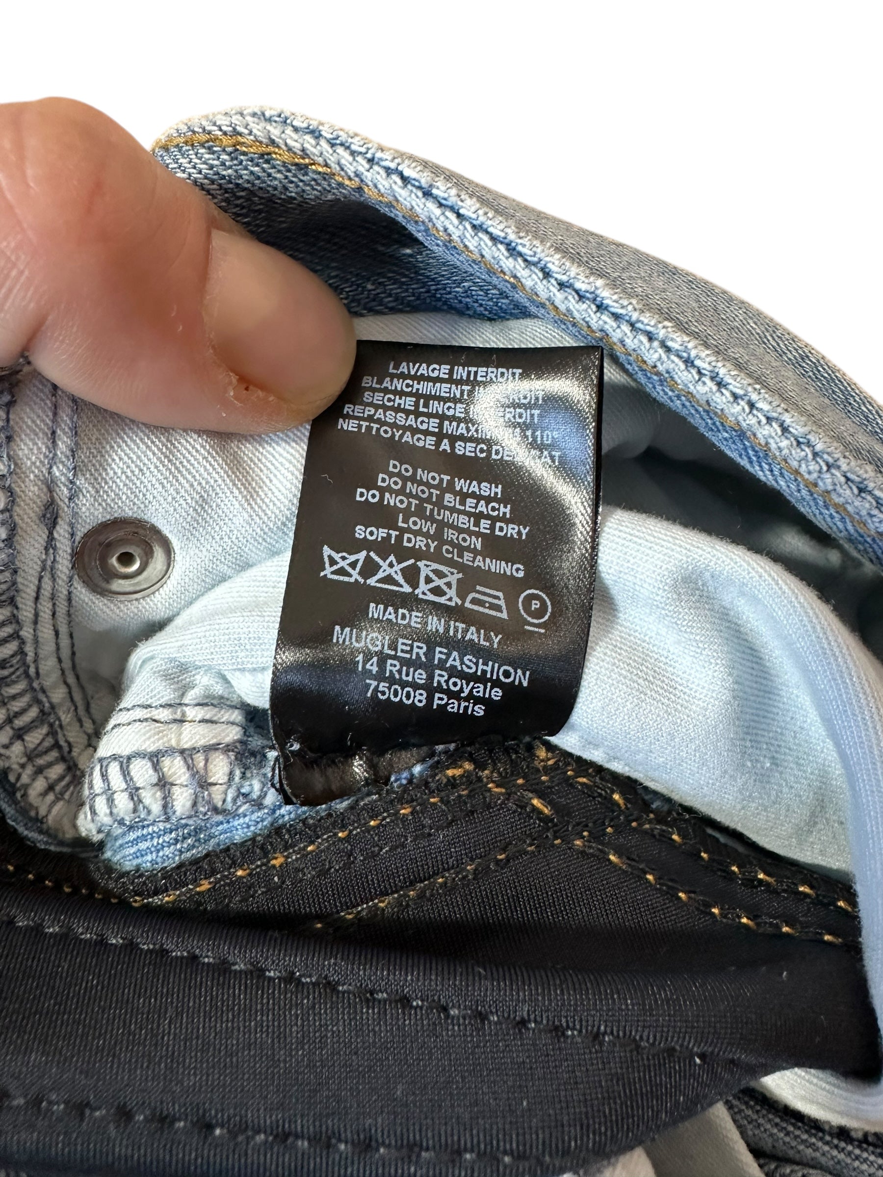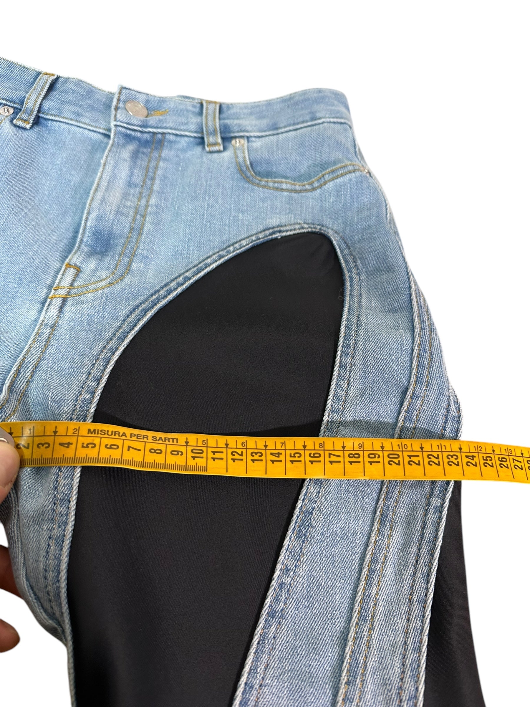 Mugler jeans a vita alta con inserti in tessuto elasticizzato nero, tasche laterali e spacchi sul retro. Vestibilità slim e lunga che rende il modello più affusolato sul finale. Tg. 36 Francese che corrisponde alla 40 Italiana.