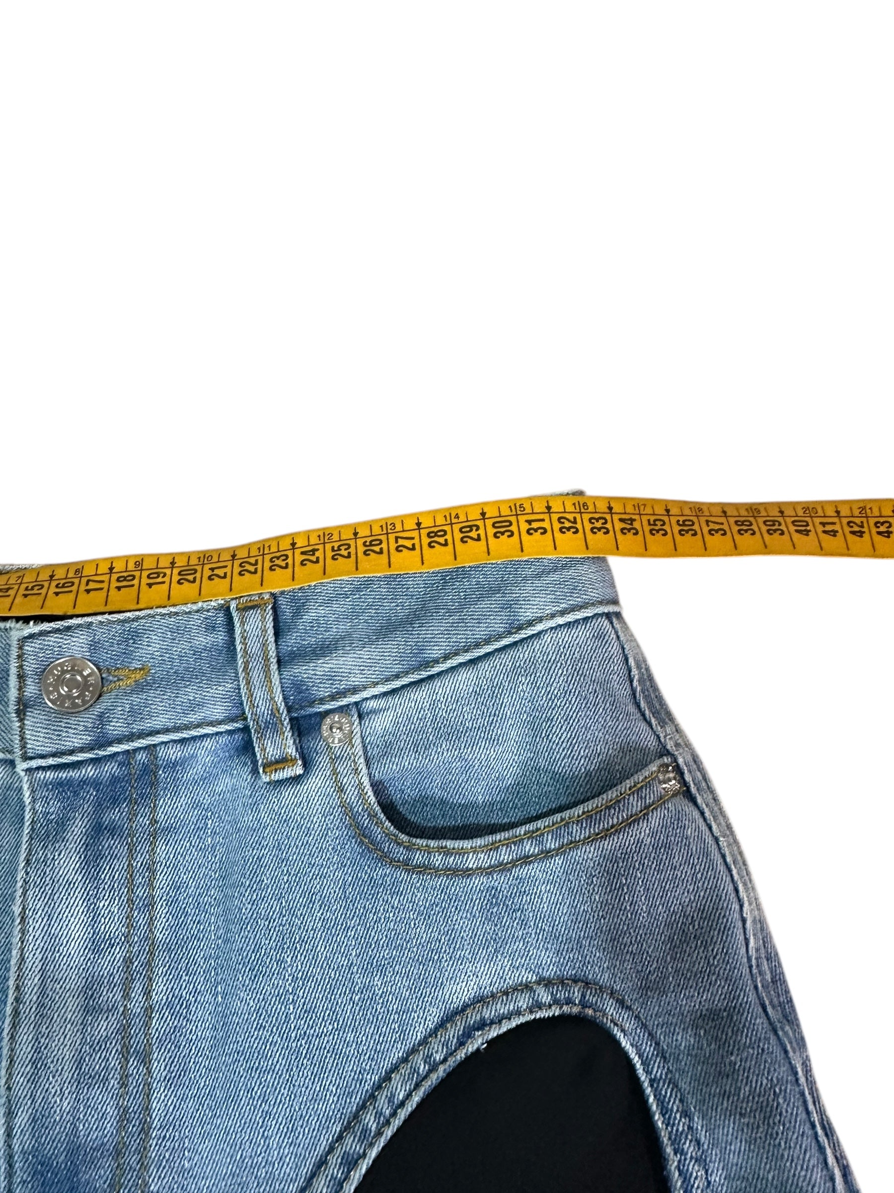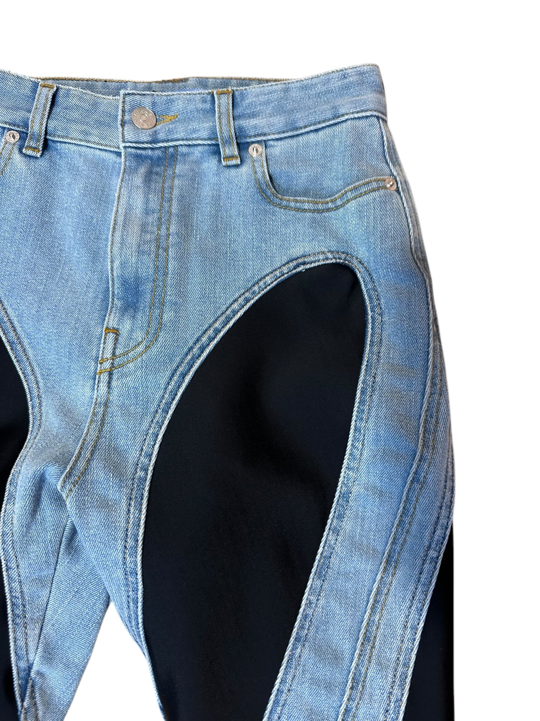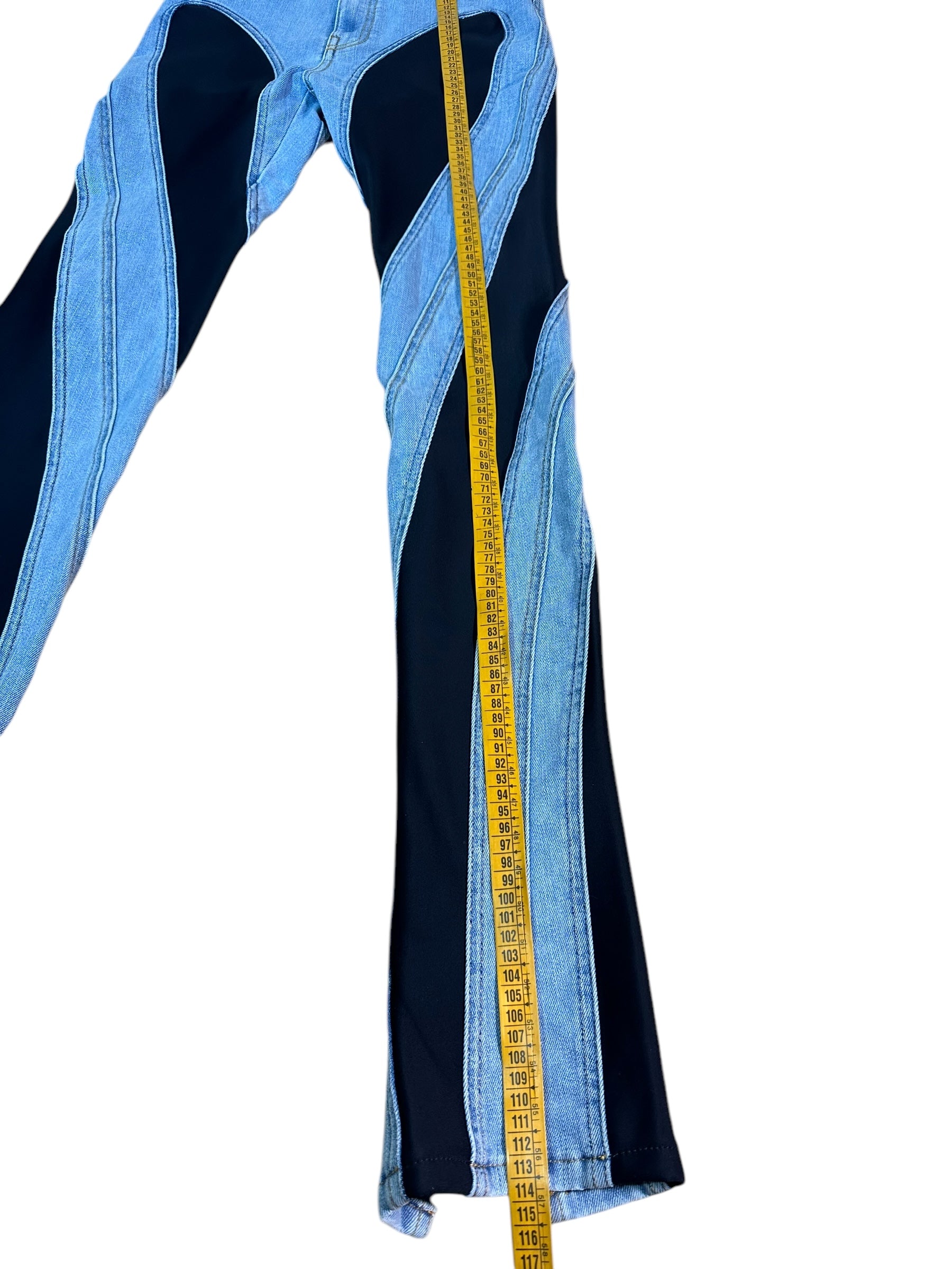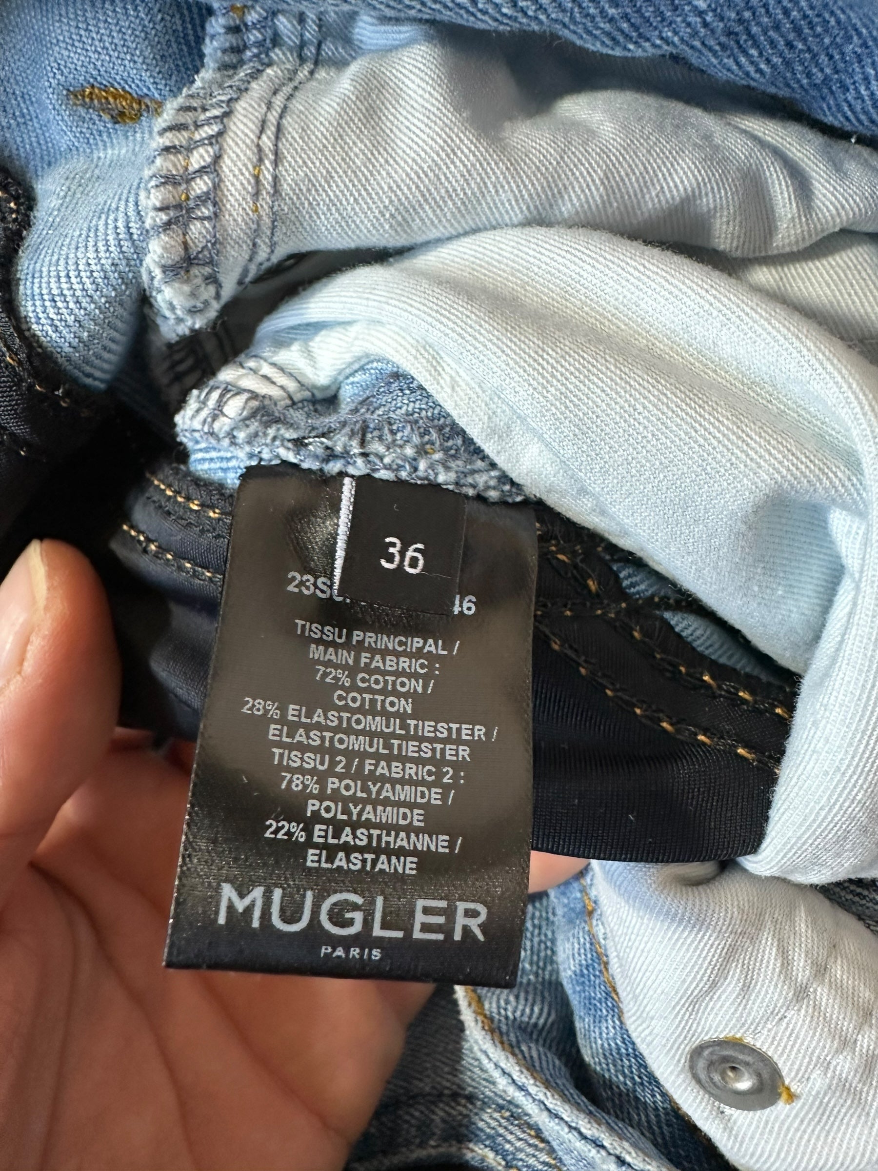 Mugler jeans a vita alta con inserti in tessuto elasticizzato nero, tasche laterali e spacchi sul retro. Vestibilità slim e lunga che rende il modello più affusolato sul finale. Tg. 36 Francese che corrisponde alla 40 Italiana.