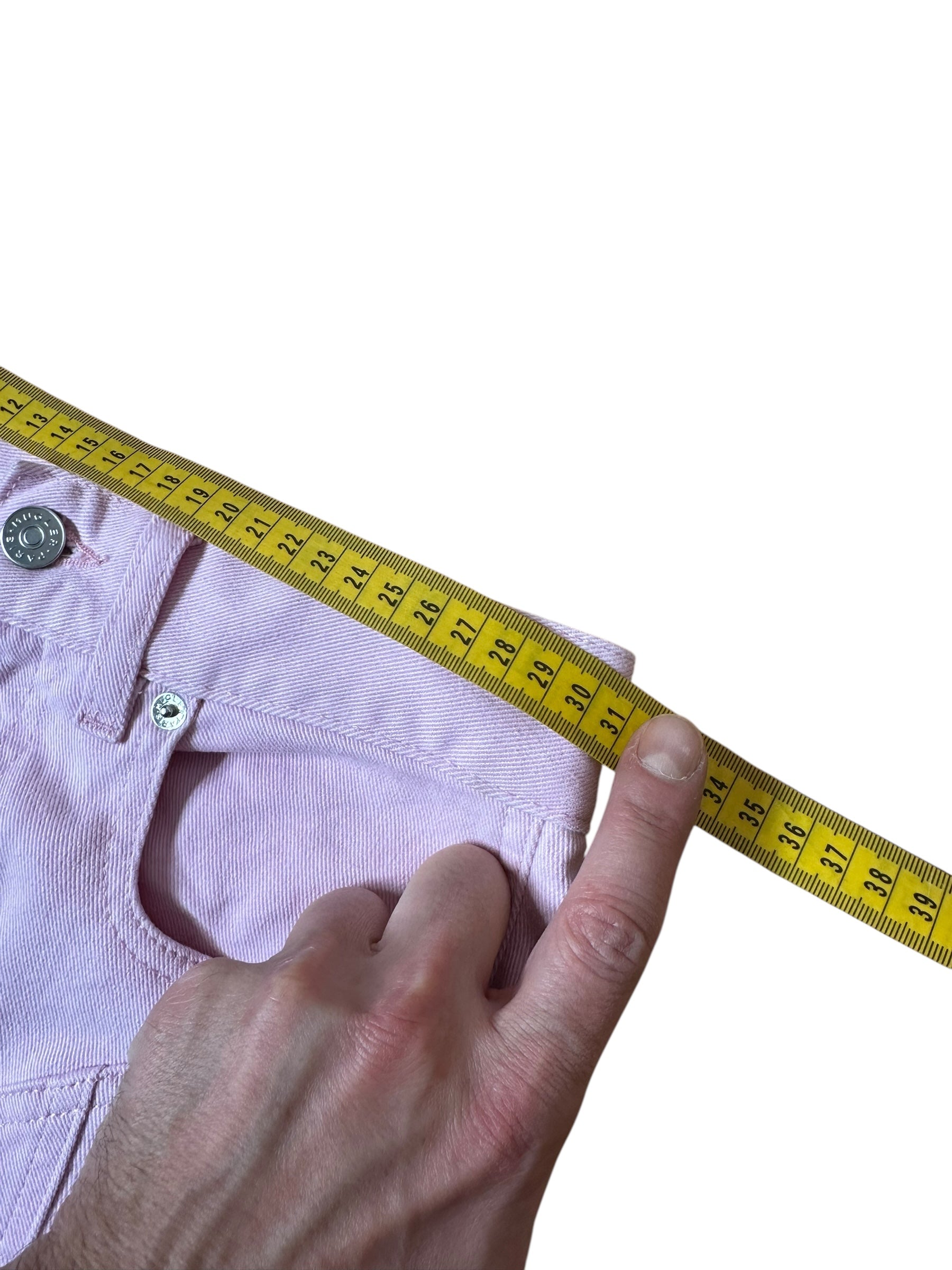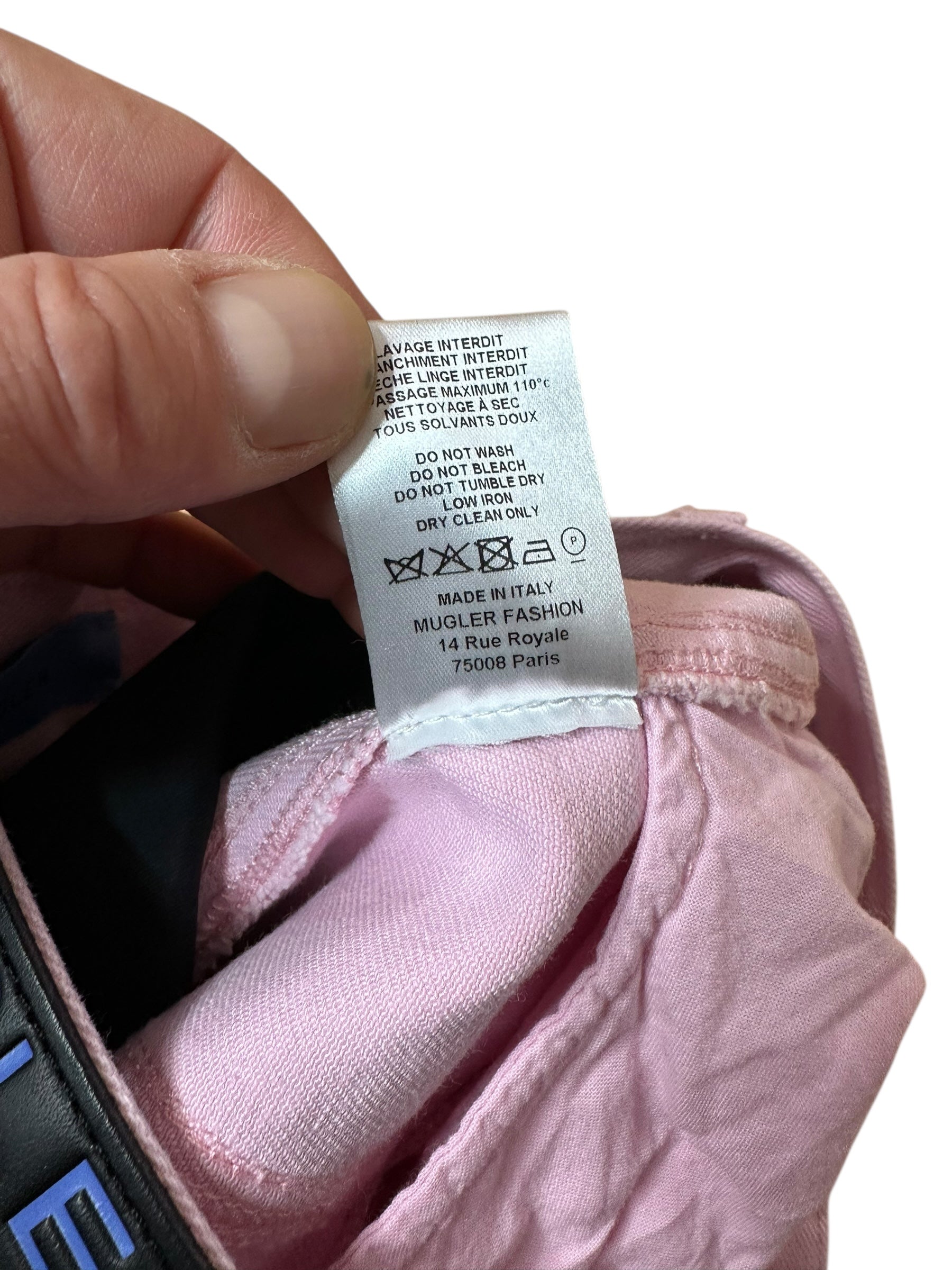 Jeans firmati Mugler dal design iconico e strutturato, realizzati in denim rosa con inserti a contrasto in tessuto elasticizzato nero che seguono la linea della gamba e valorizzano la silhouette. Modello a vita alta con costruzione anatomica, cuciture sagomate e fondo leggermente affusolato. Chiusura frontale con bottone e zip, passanti in vita e tasche posteriori. Patch logo Mugler sul retro.