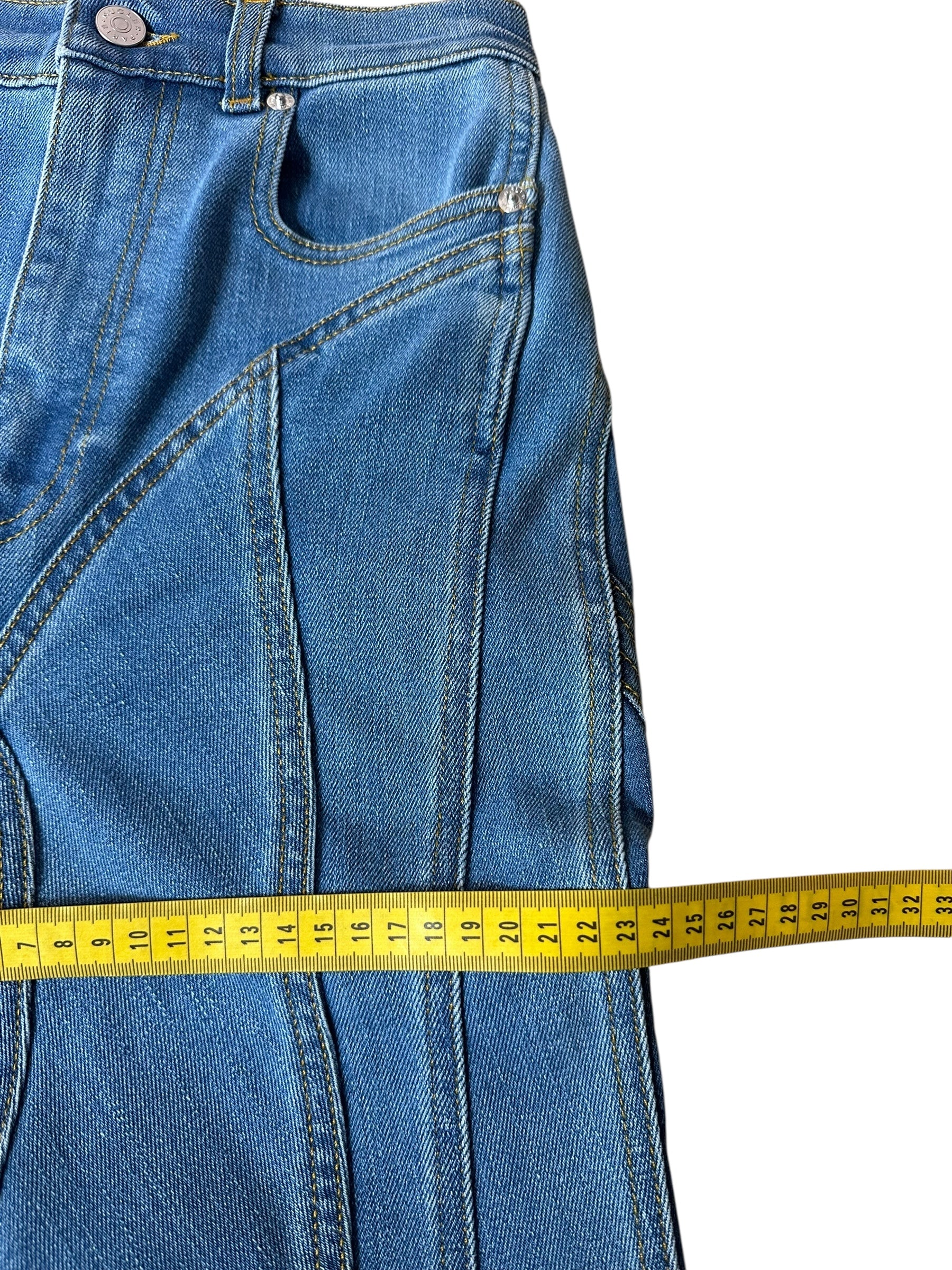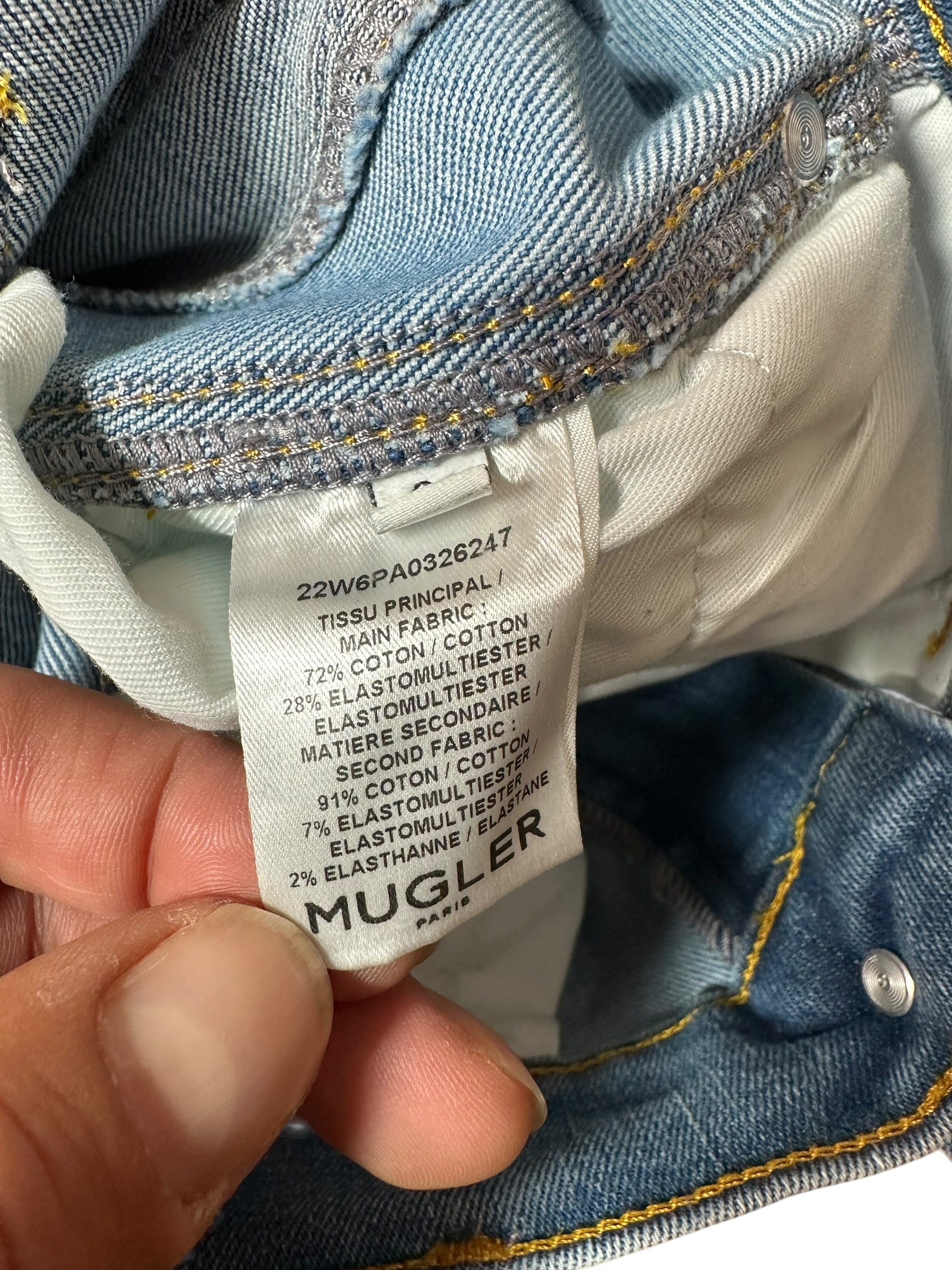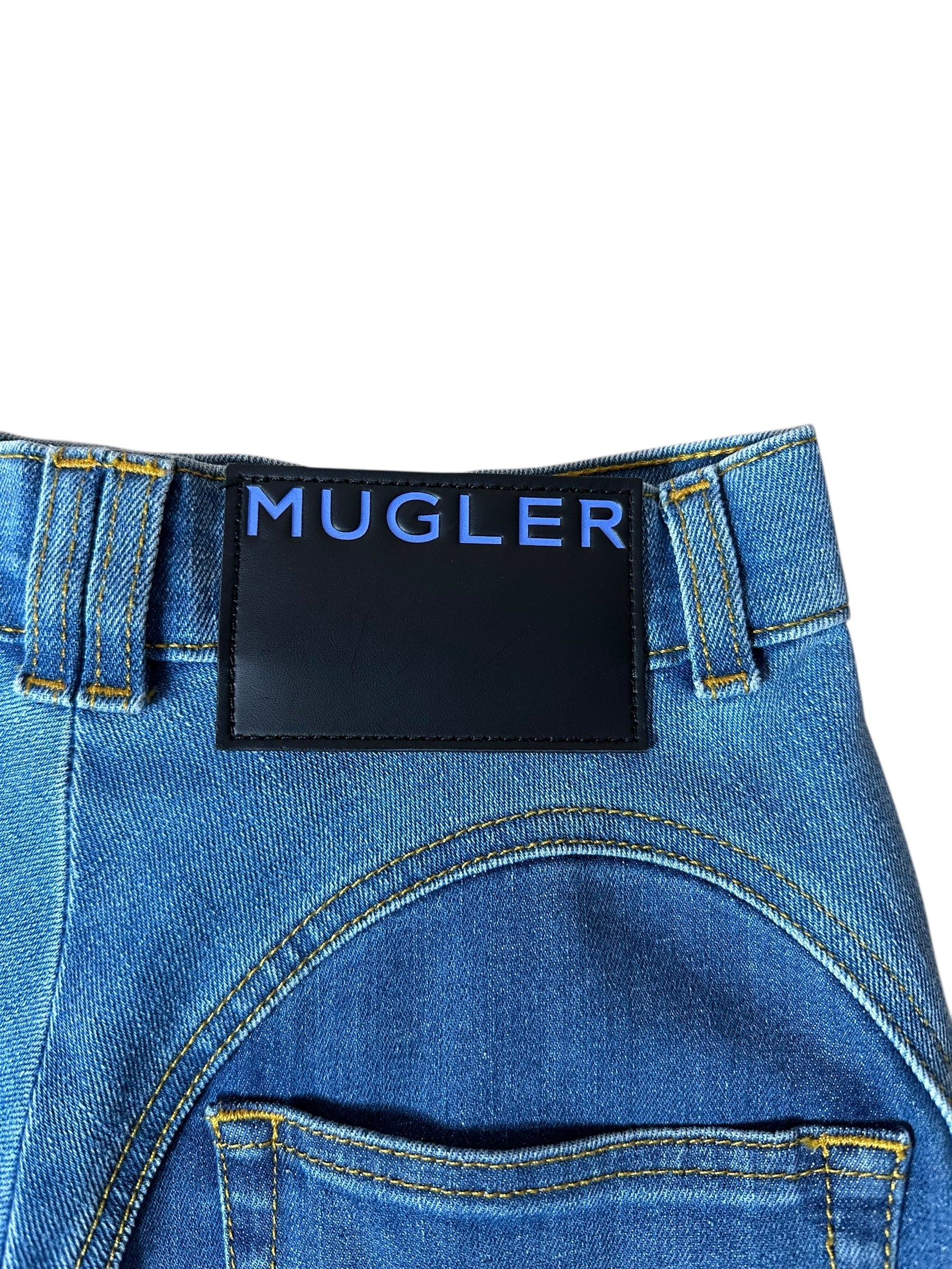 Jeans Mugler dal design contemporaneo, realizzati in denim di cotone con inserti a contrasto che creano un motivo geometrico caratteristico del brand. Il lavaggio blu medio presenta giochi di tonalità più chiare e scure, messi in risalto dalle cuciture a vista. Sul retro, due tasche applicate e la maxi patch in ecopelle nera con logo Mugler azzurro in evidenza.