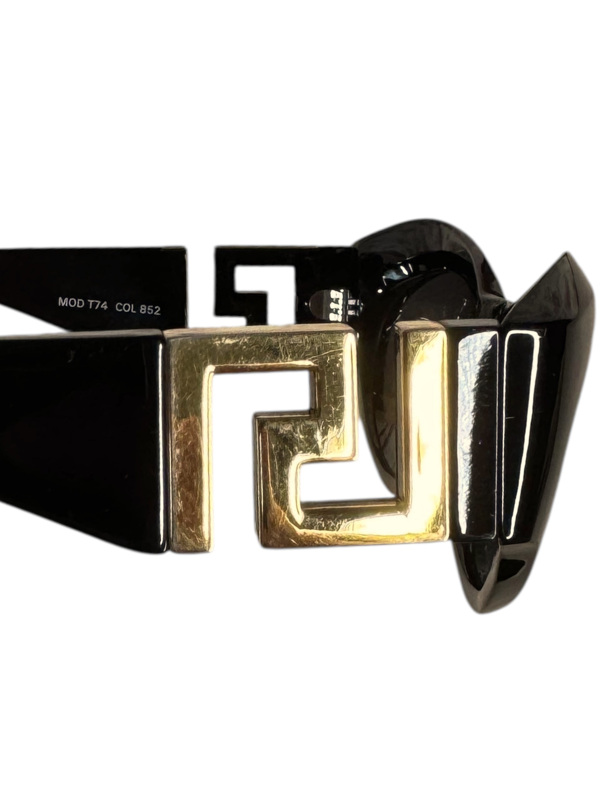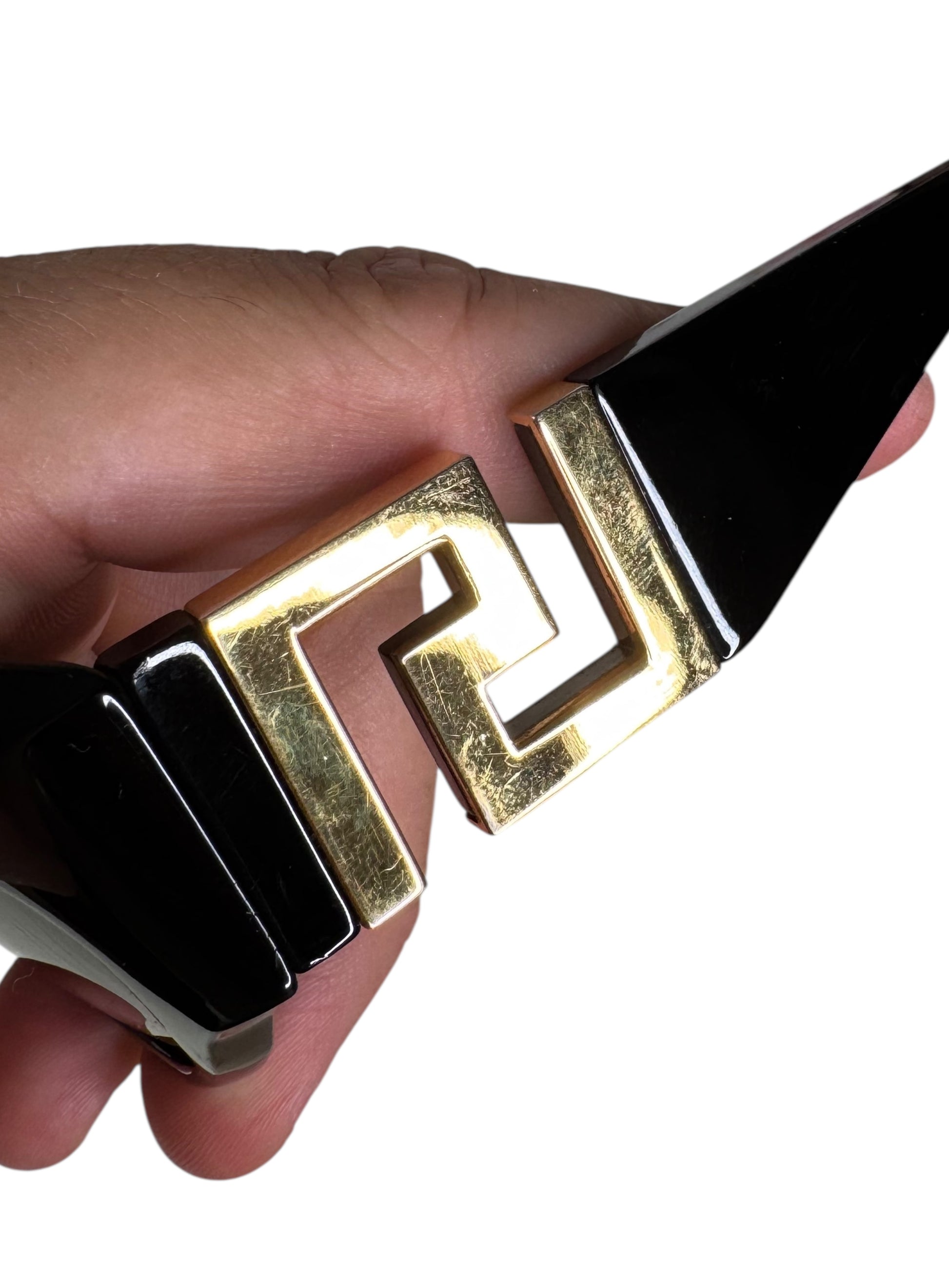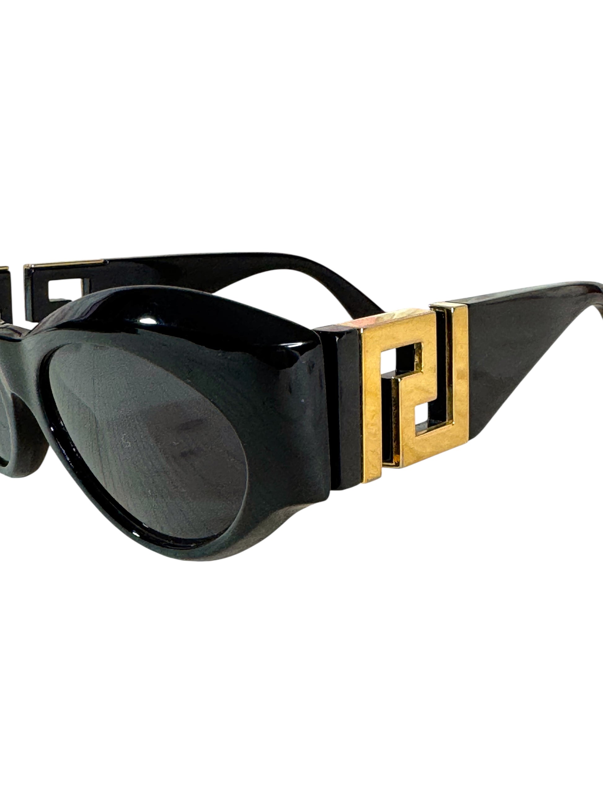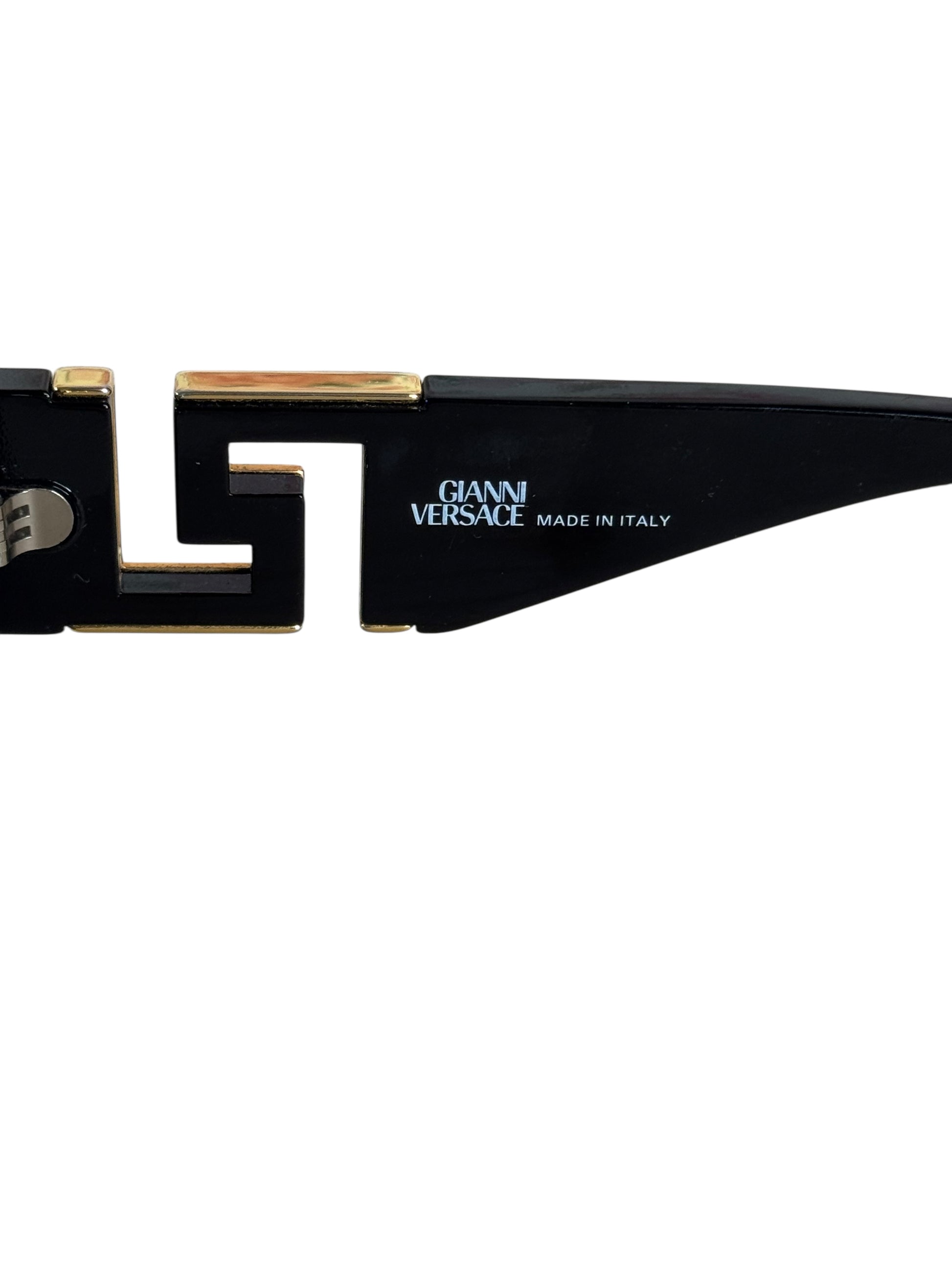 Occhiali da sole vintage originali Gianni Versace anni ’90. Montatura in acetato nero lucido con lenti scure e aste impreziosite dal celebre motivo Greca in metallo dorato. Realizzati in Italia, sono un accessorio iconico da collezione.