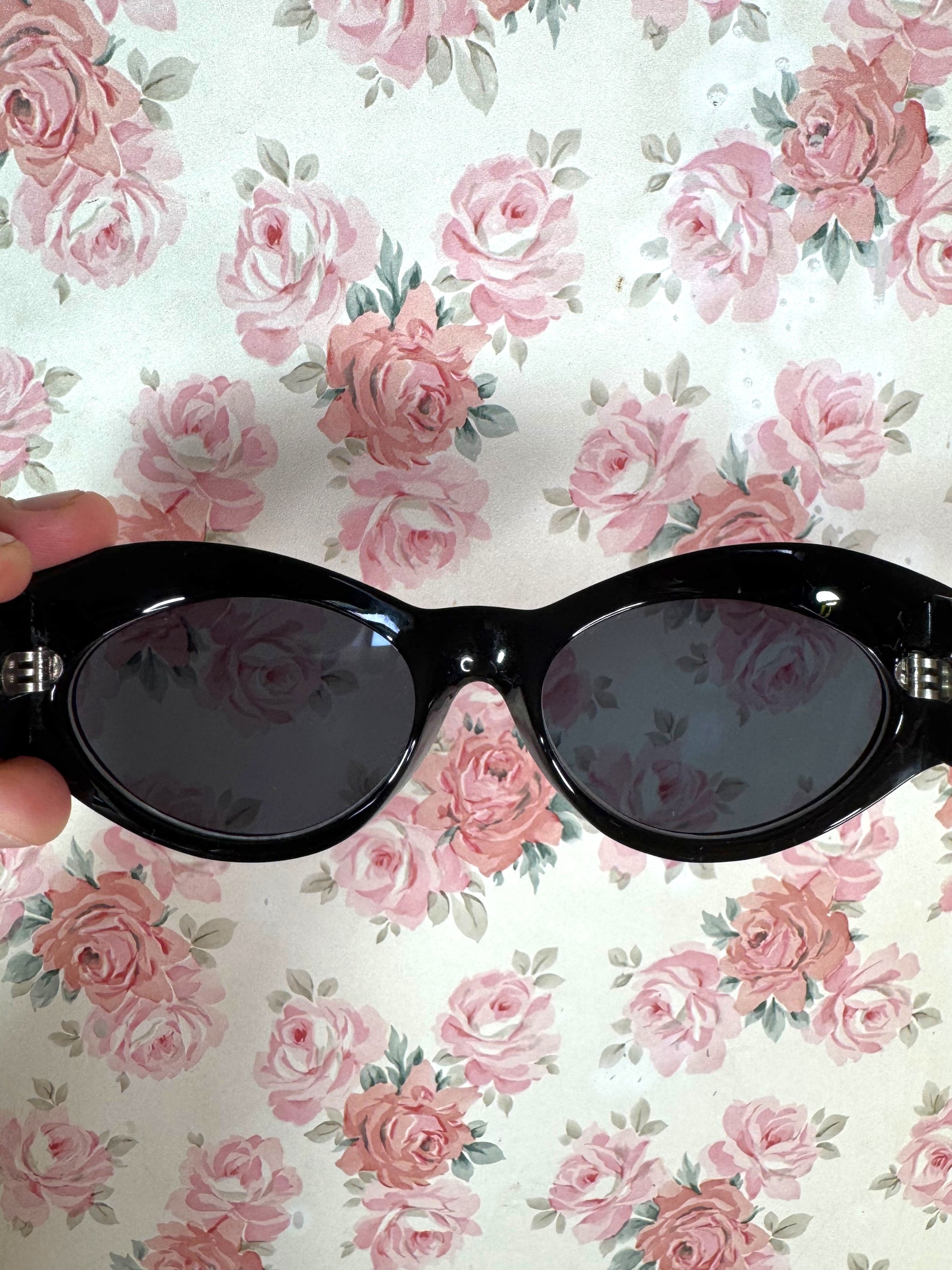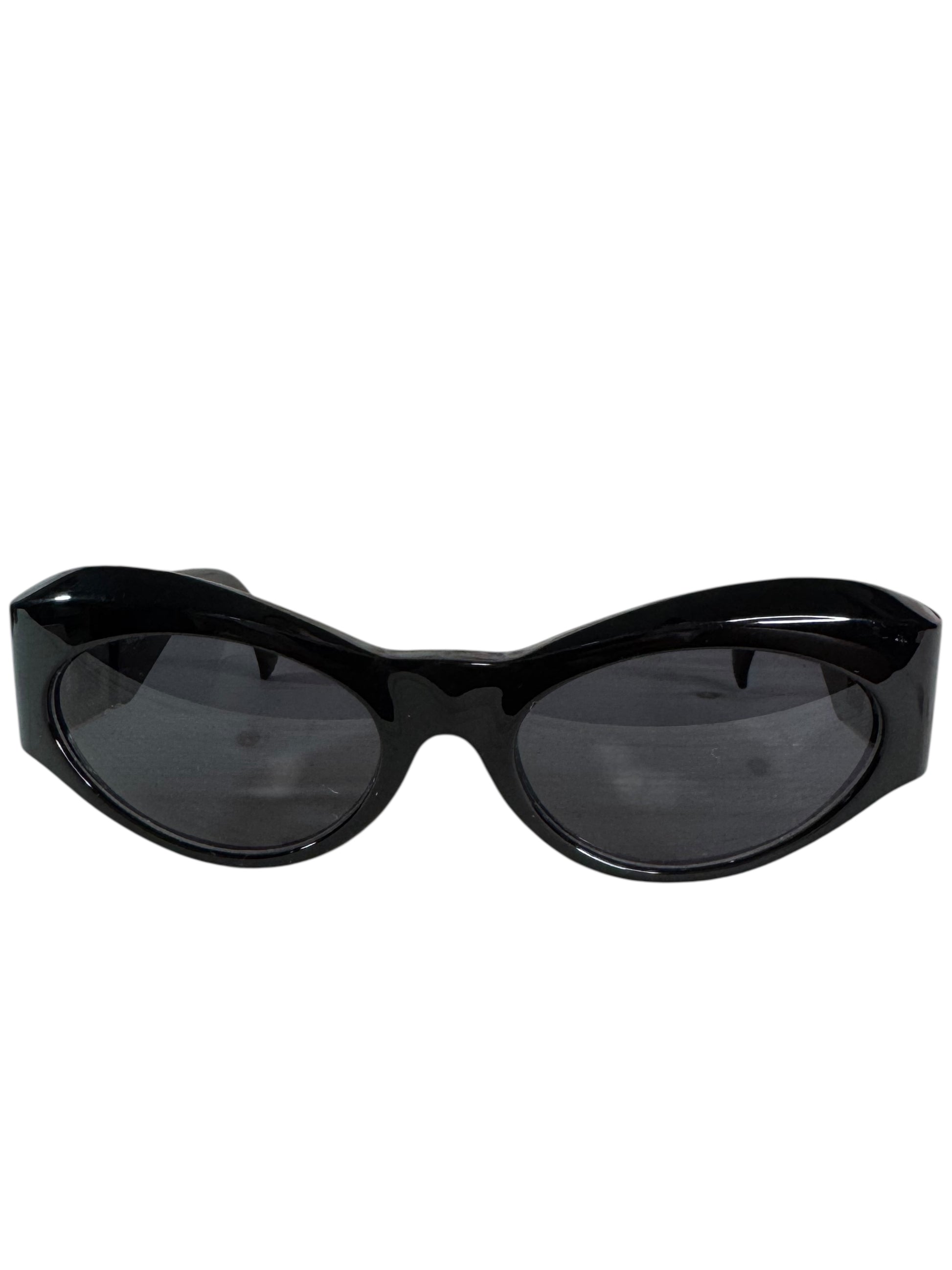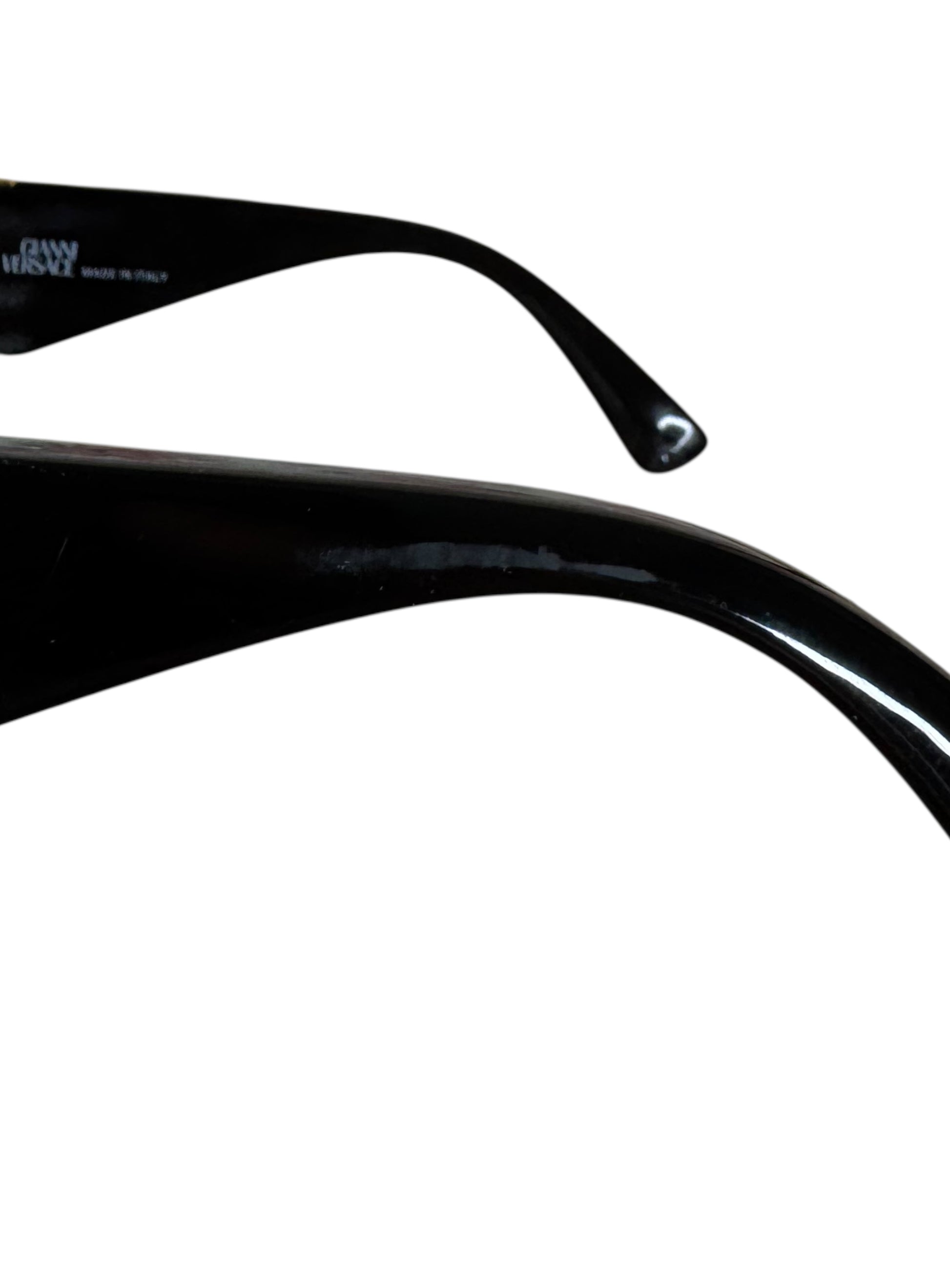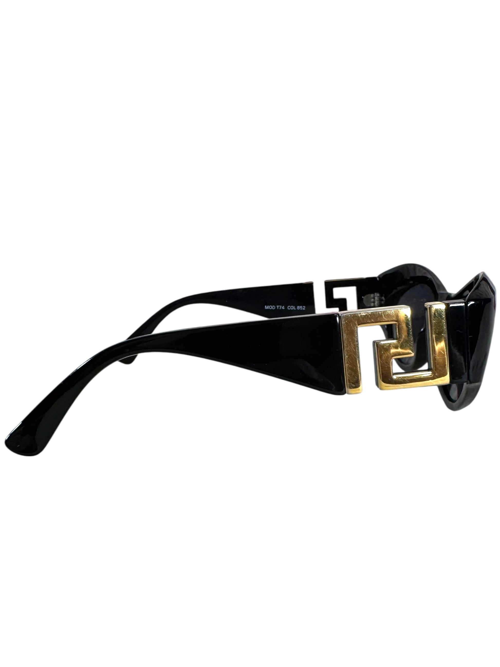 Occhiali da sole vintage originali Gianni Versace anni ’90. Montatura in acetato nero lucido con lenti scure e aste impreziosite dal celebre motivo Greca in metallo dorato. Realizzati in Italia, sono un accessorio iconico da collezione.