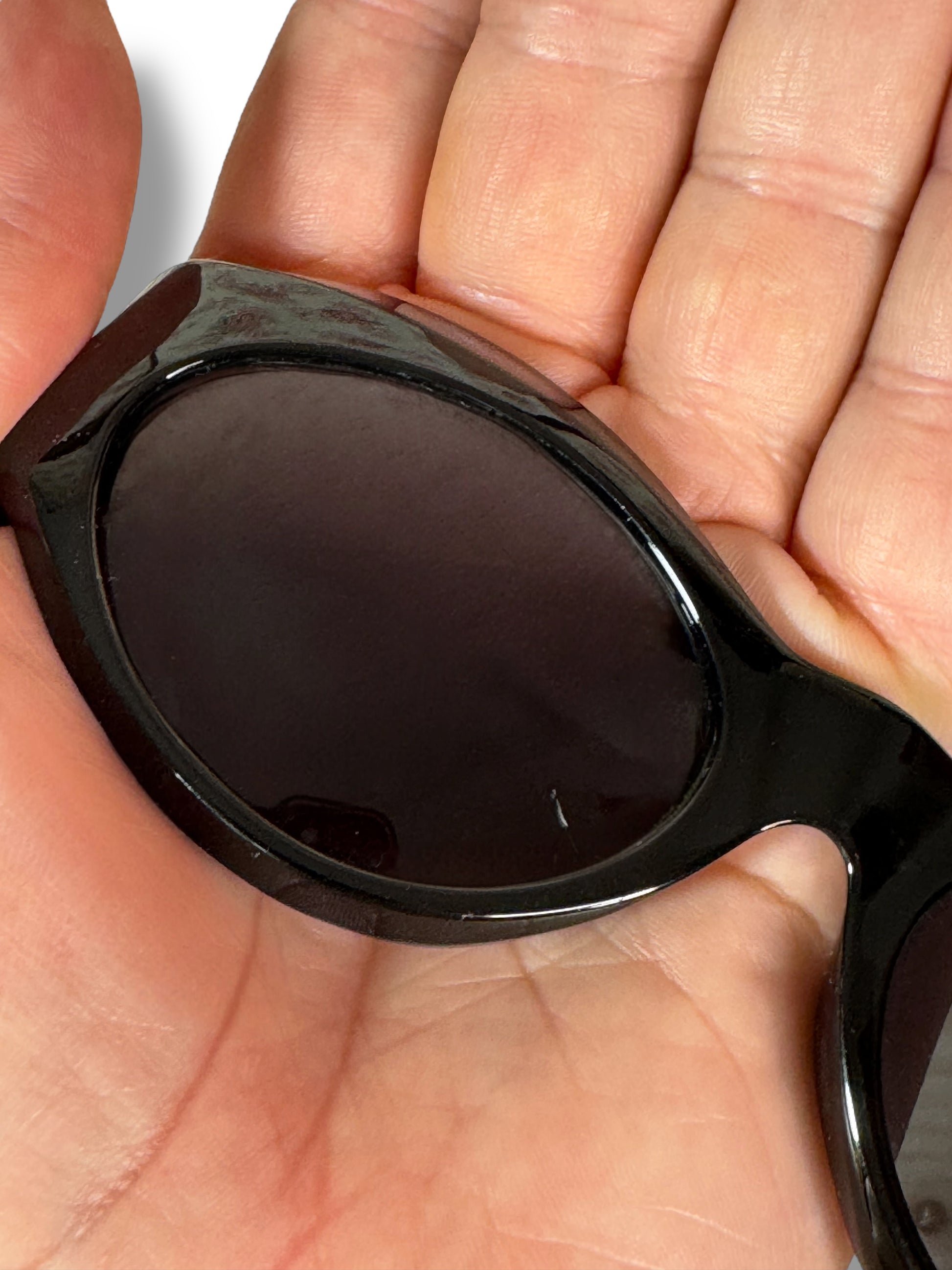Presentano un segno visibile su una lente (come da foto) e lievi segni di usura su una bacchetta poco visibile, che non compromettono l’estetica complessiva.