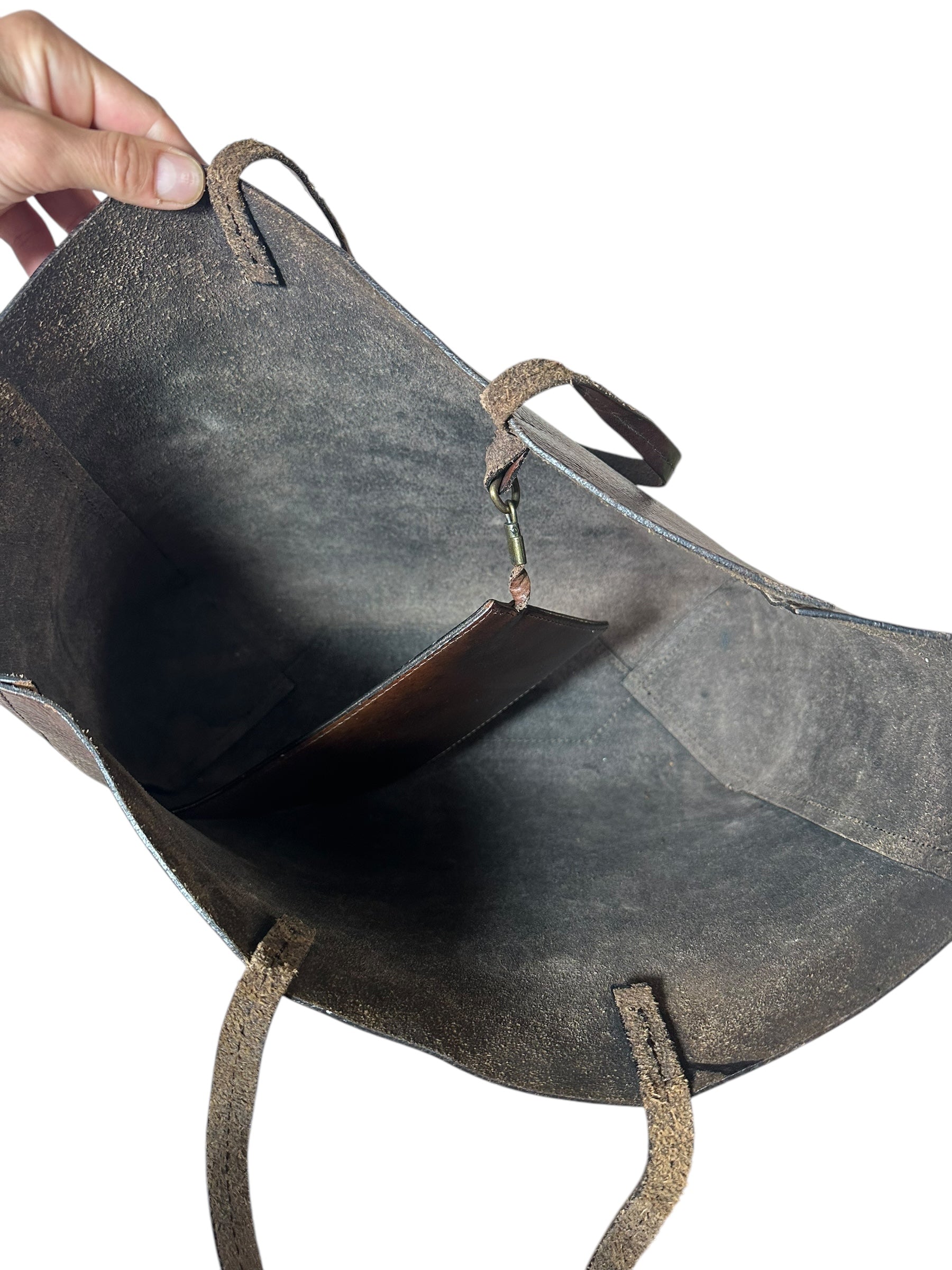 Elegante shopper firmata Orciani, realizzata in resistente pelle martellata color marrone scuro con finitura semi-lucida. Il design essenziale è arricchito da manici sottili in pelle grezza e cuciture laterali marcate che valorizzano la forma strutturata della borsa. L’interno è lasciato al naturale e ospita una comoda mini pochette rimovibile in pelle coordinata, dotata di zip e marchio a caldo.