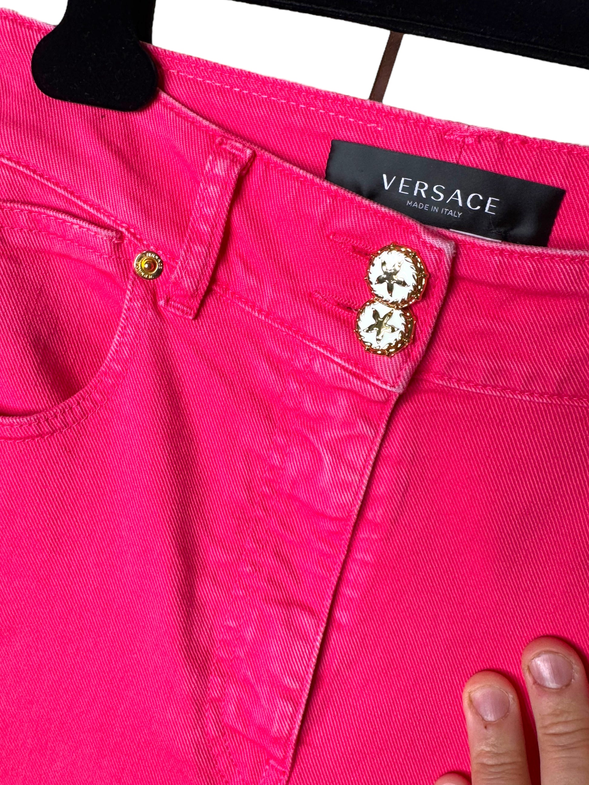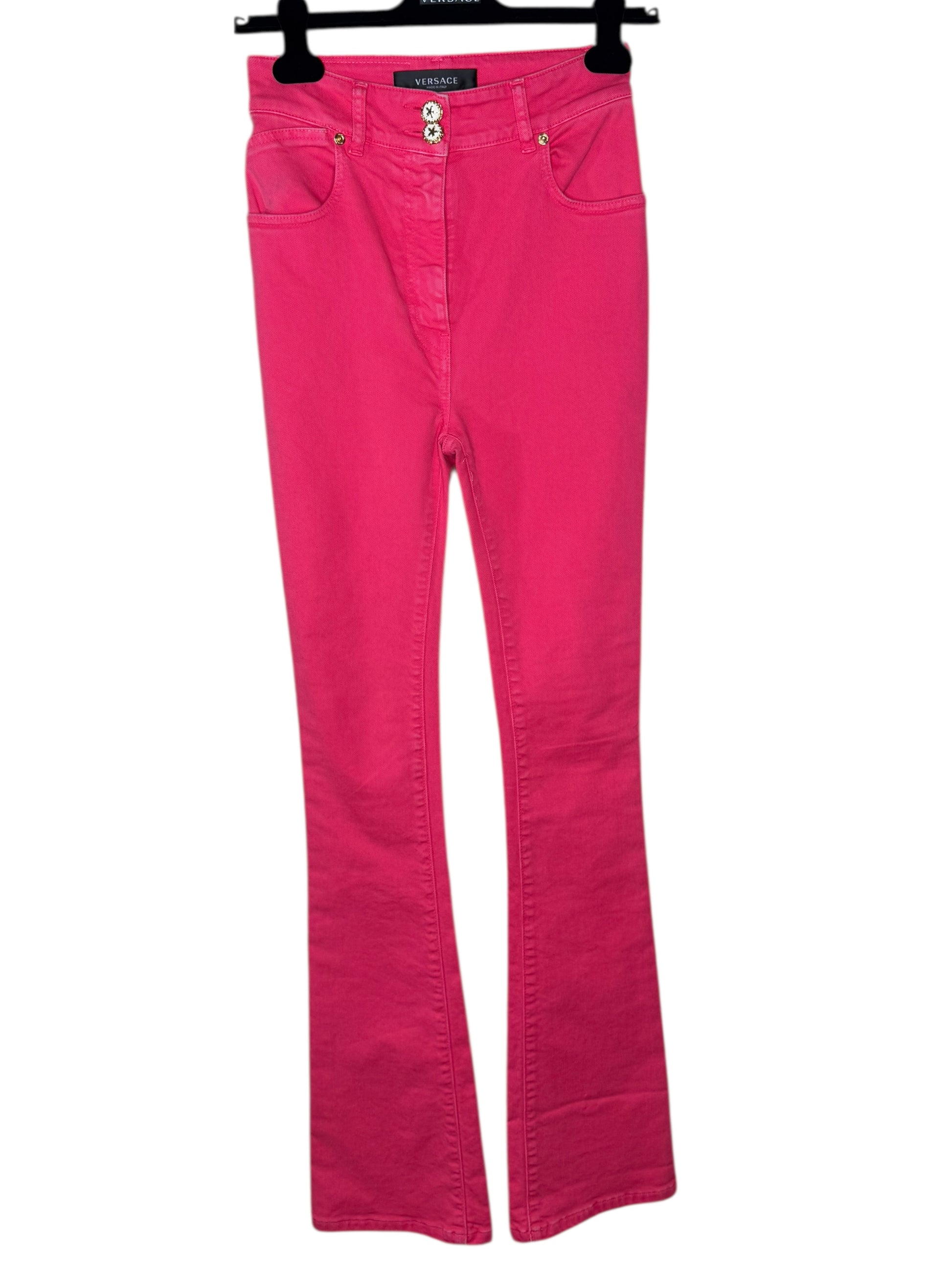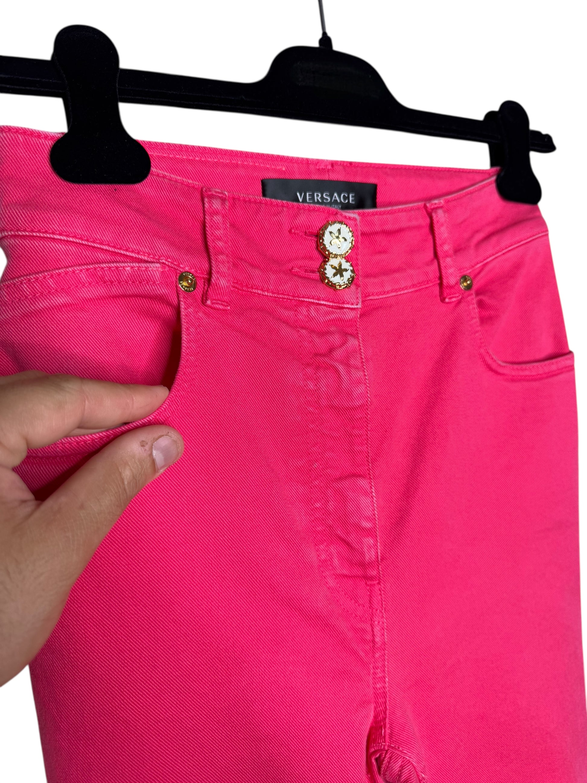 Pantaloni originali Versace da donna, modello a zampa in denim rosa acceso, impreziositi da bottoni dorati con motivo a stella marina. Taglia 26. Made in Italy.