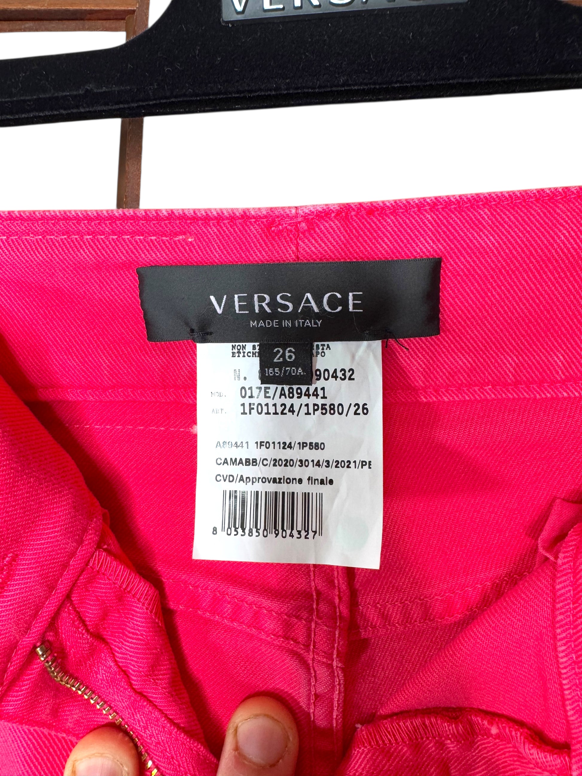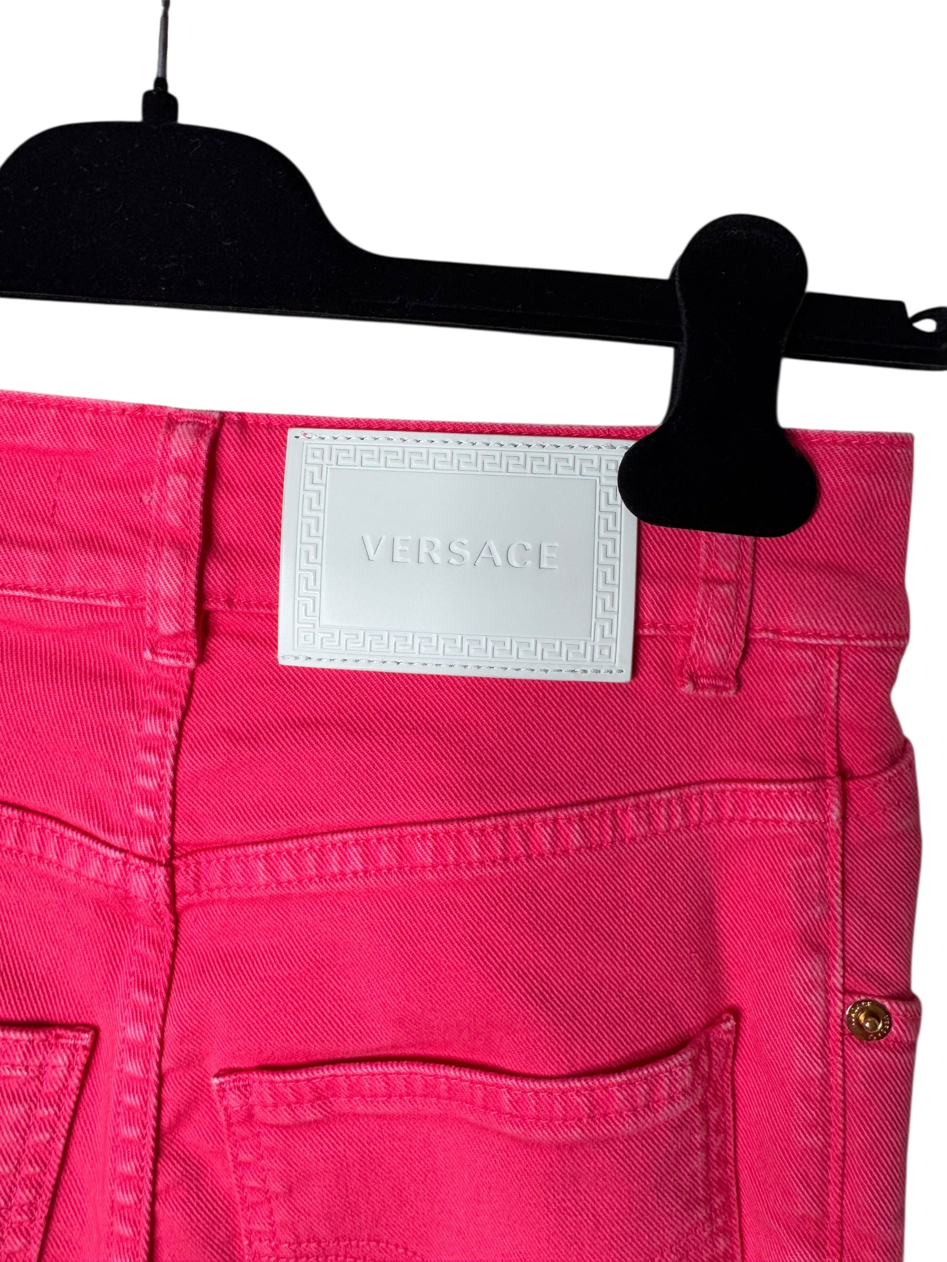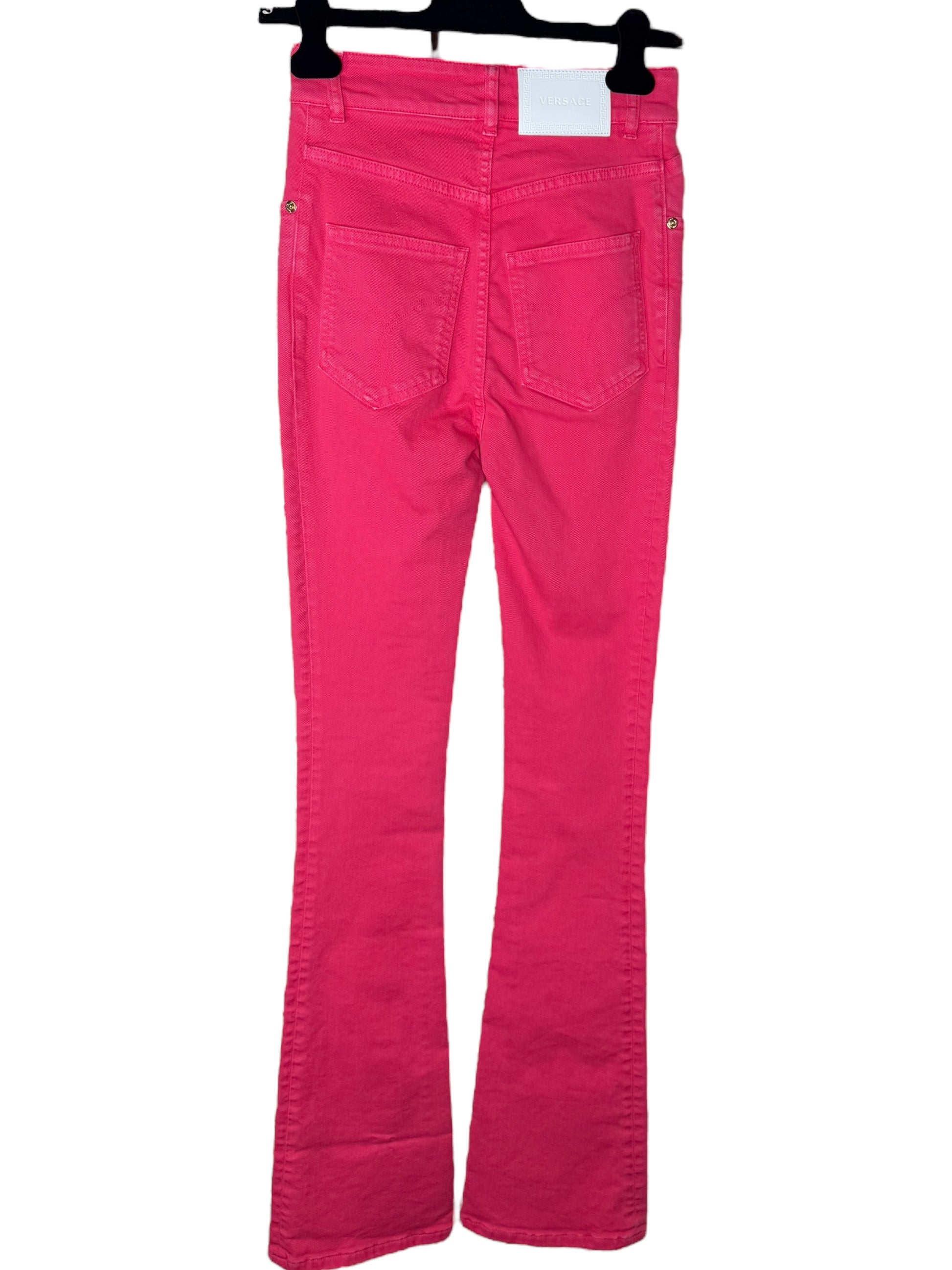 Pantaloni originali Versace da donna, modello a zampa in denim rosa acceso, impreziositi da bottoni dorati con motivo a stella marina. Taglia 26. Made in Italy.