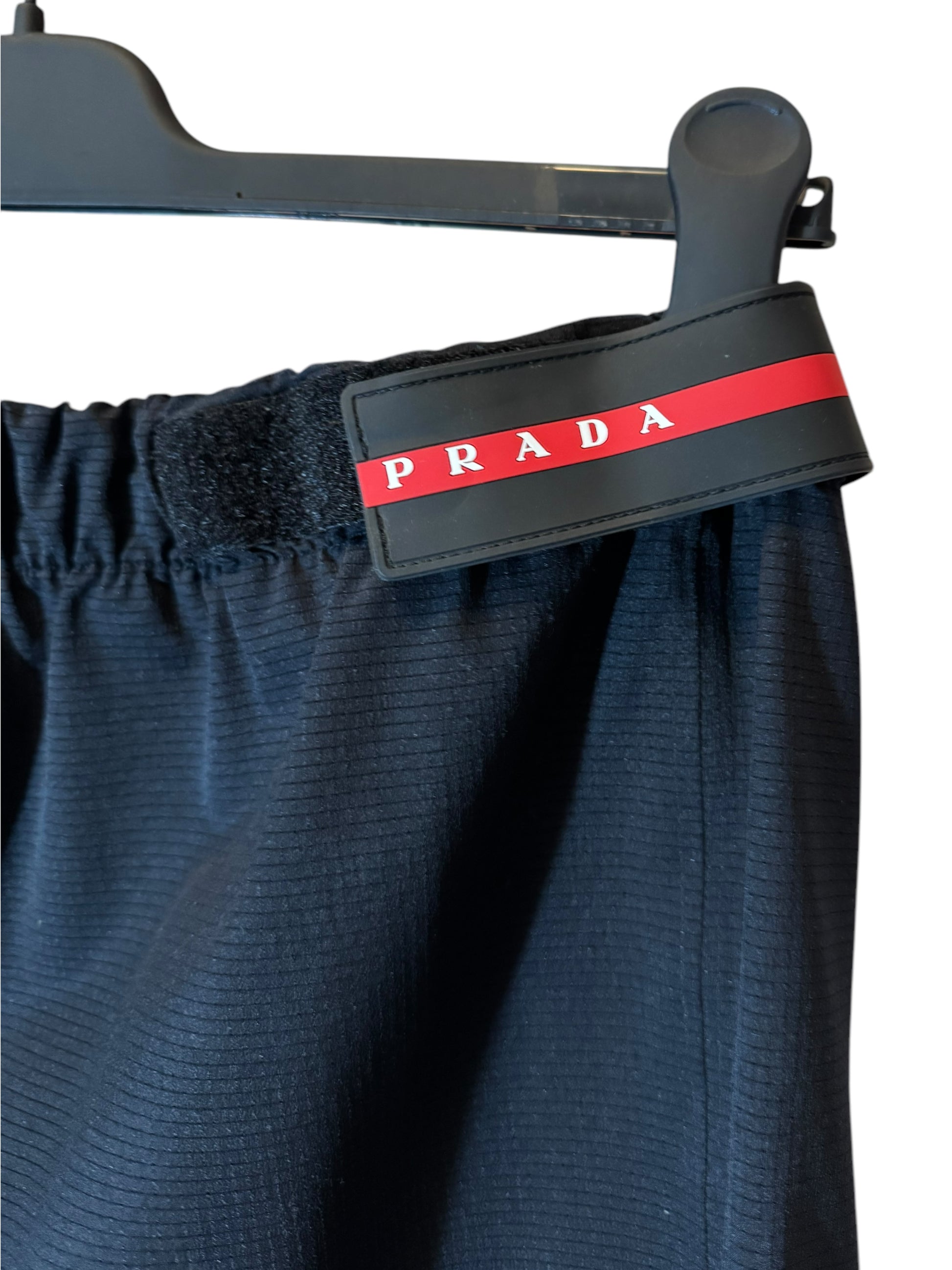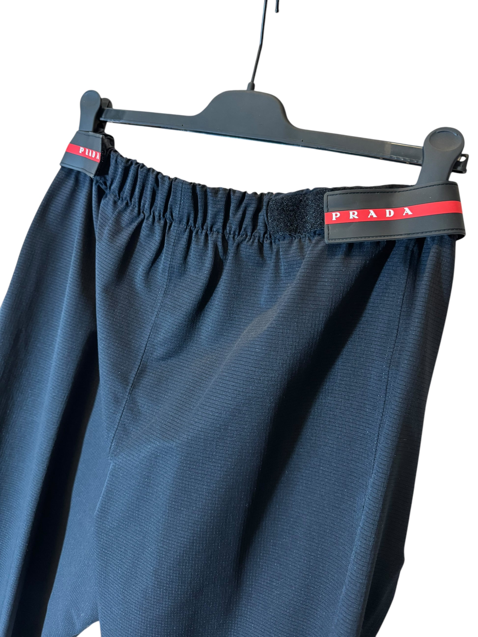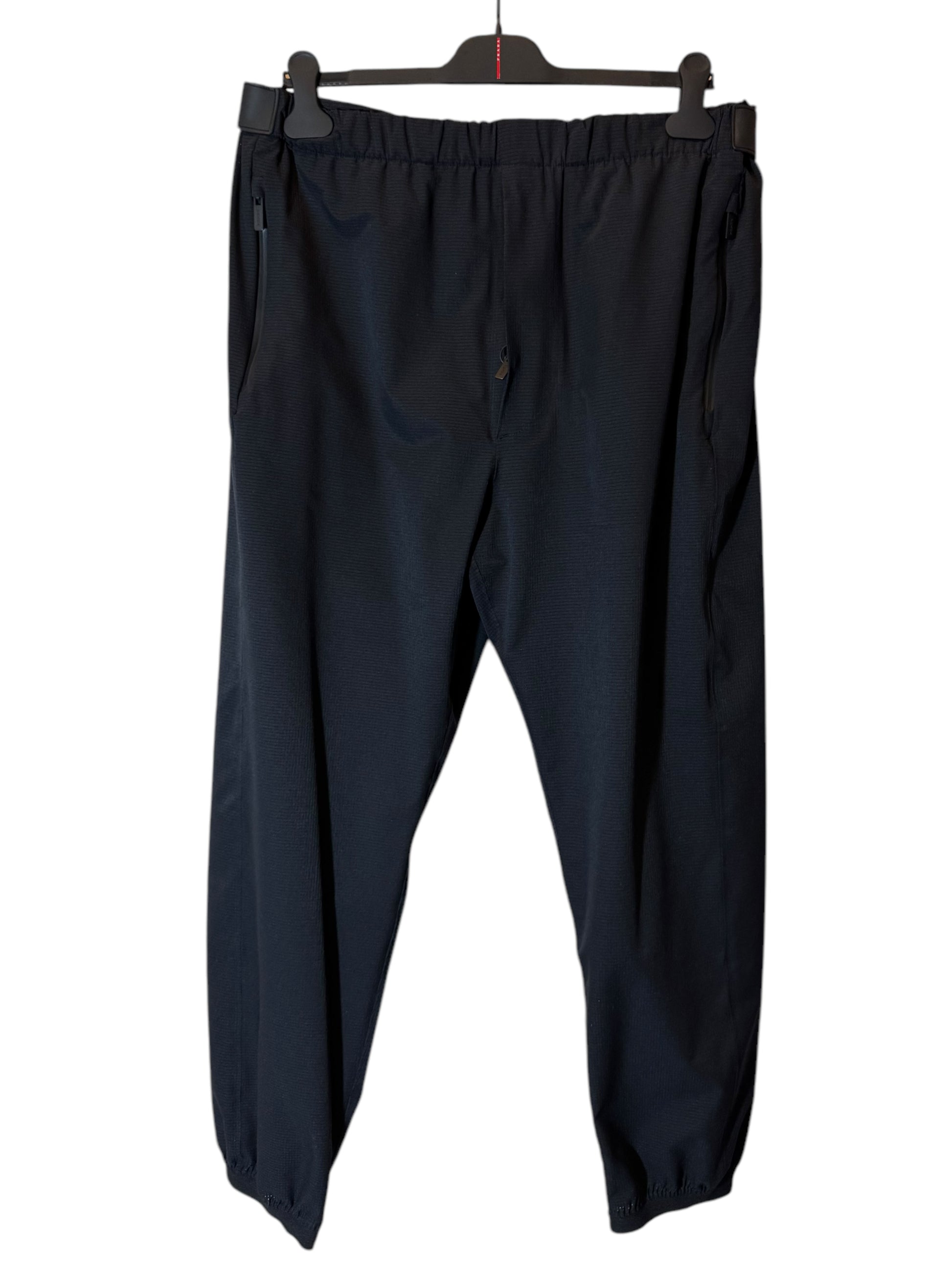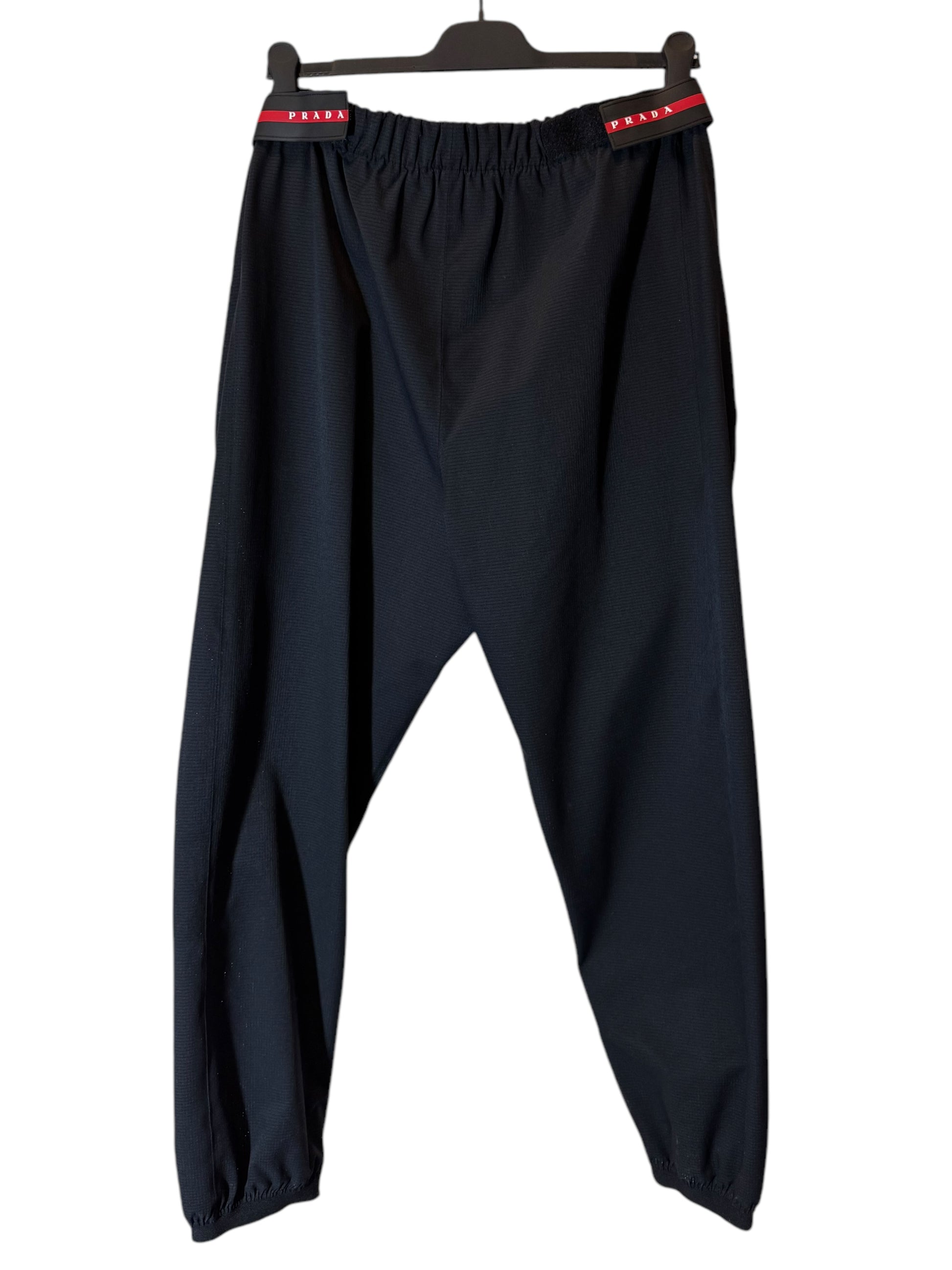Pantaloni originali Prada Linea Rossa da uomo, taglia 52, colore nero. Realizzati in tessuto tecnico 100% poliestere con lavorazione a costine sottili. Vita elasticizzata con chiusura a strappo in velcro logata Prada, fondo gamba con elastico, comode tasche laterali con zip e tiralampo marchiati. Capo autentico completo di etichetta originale.