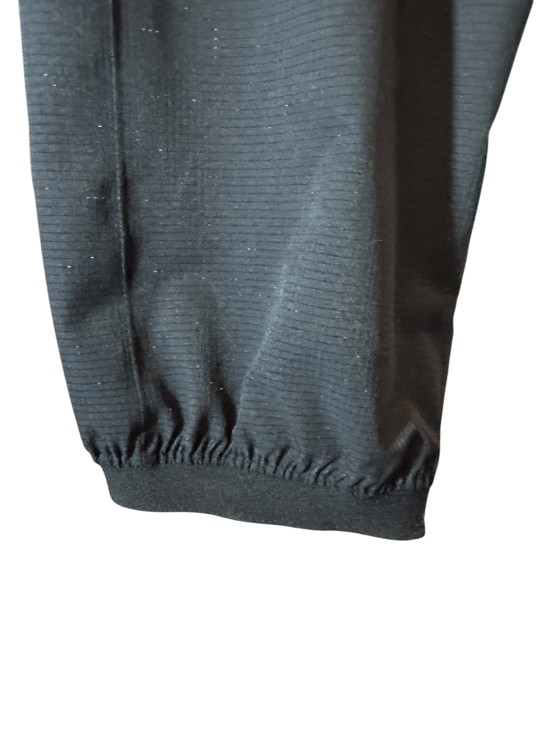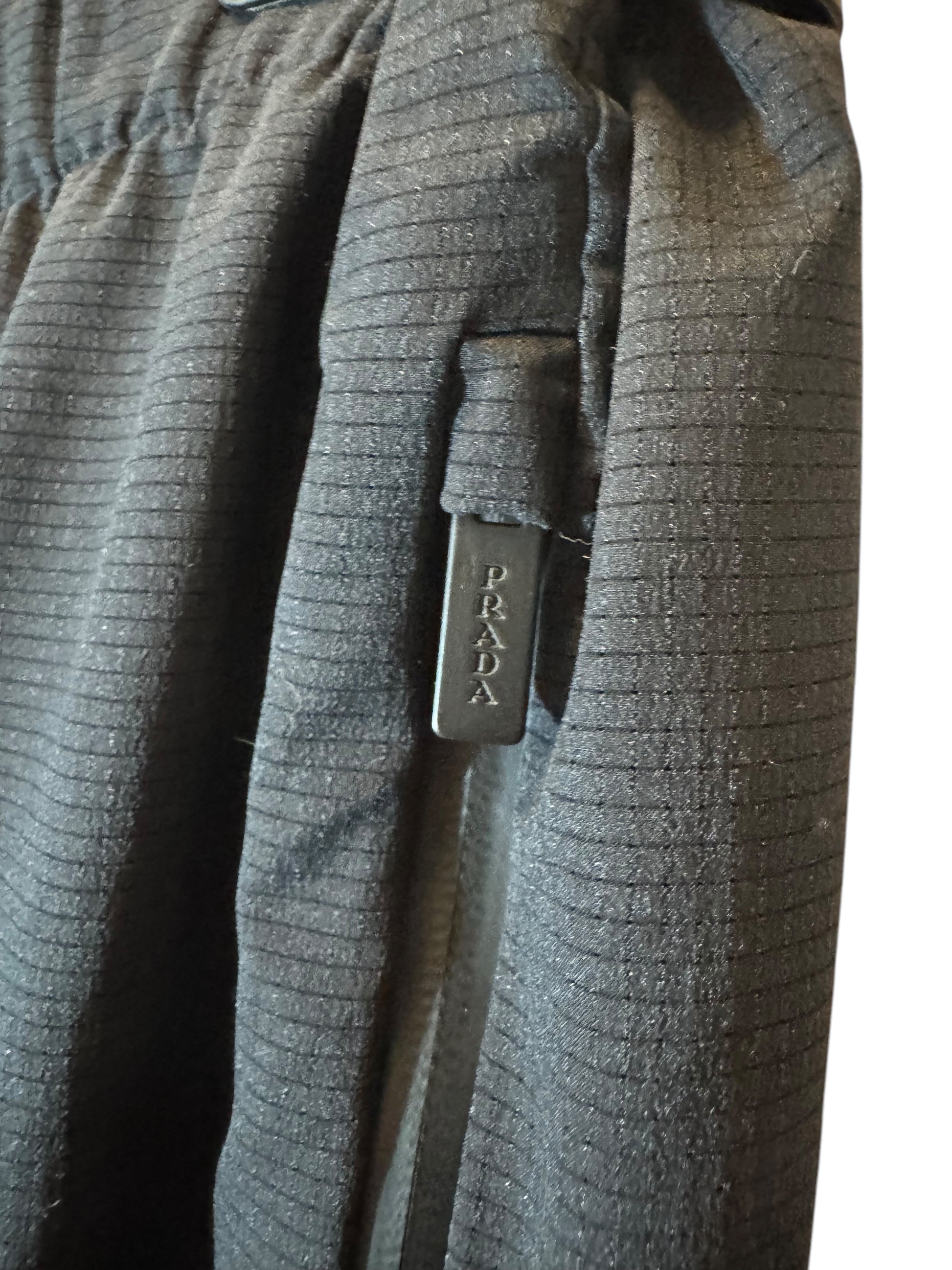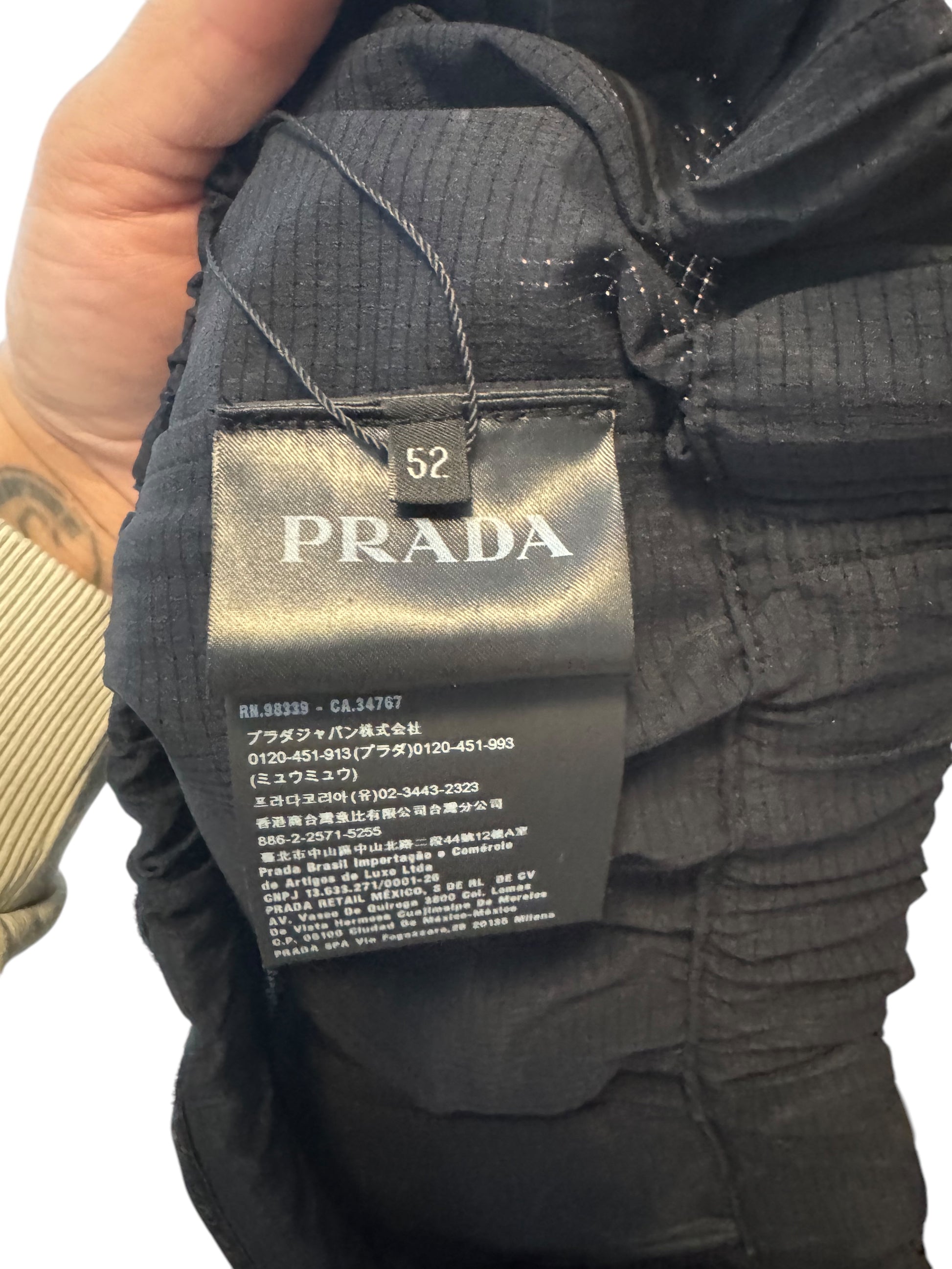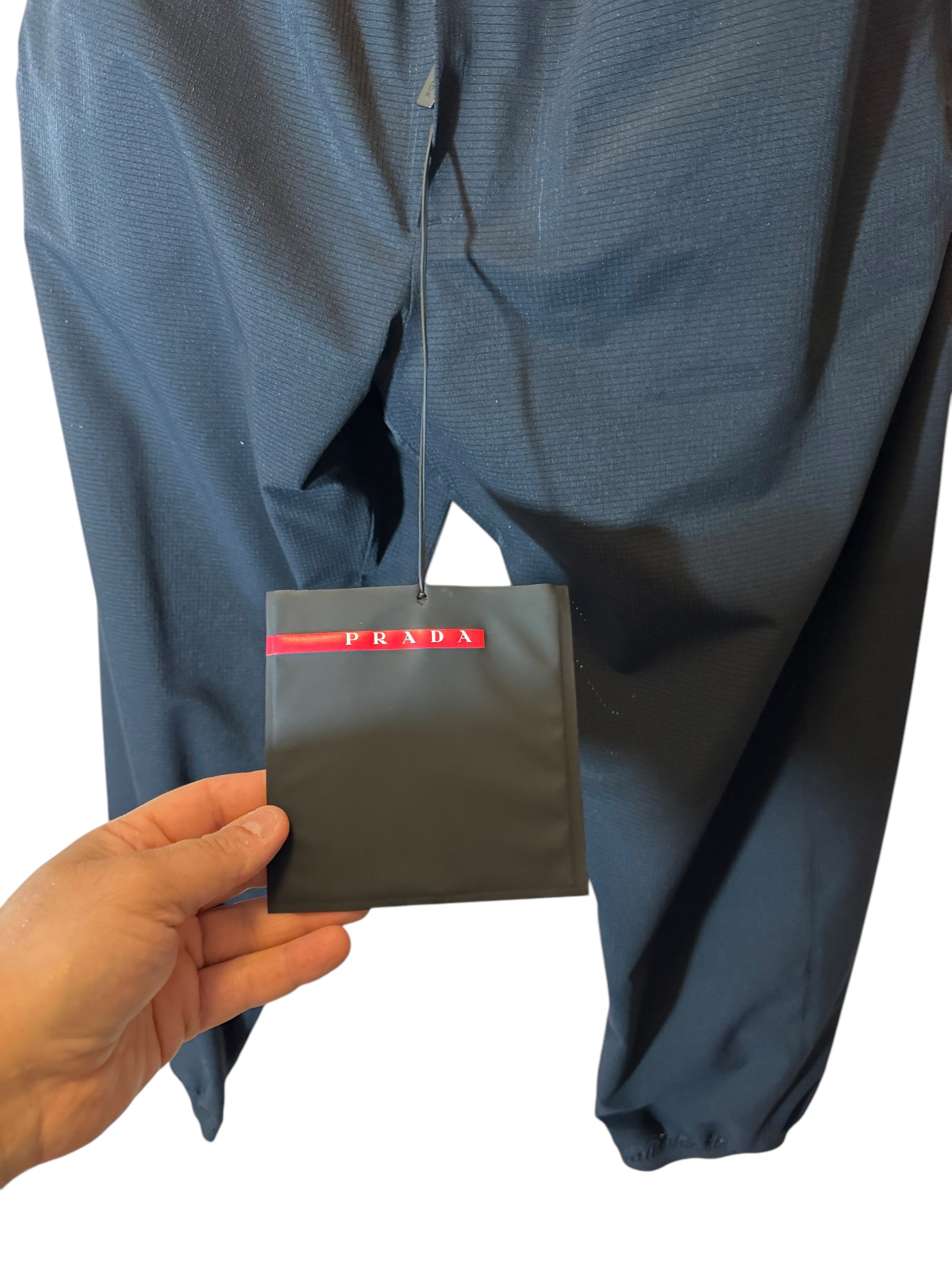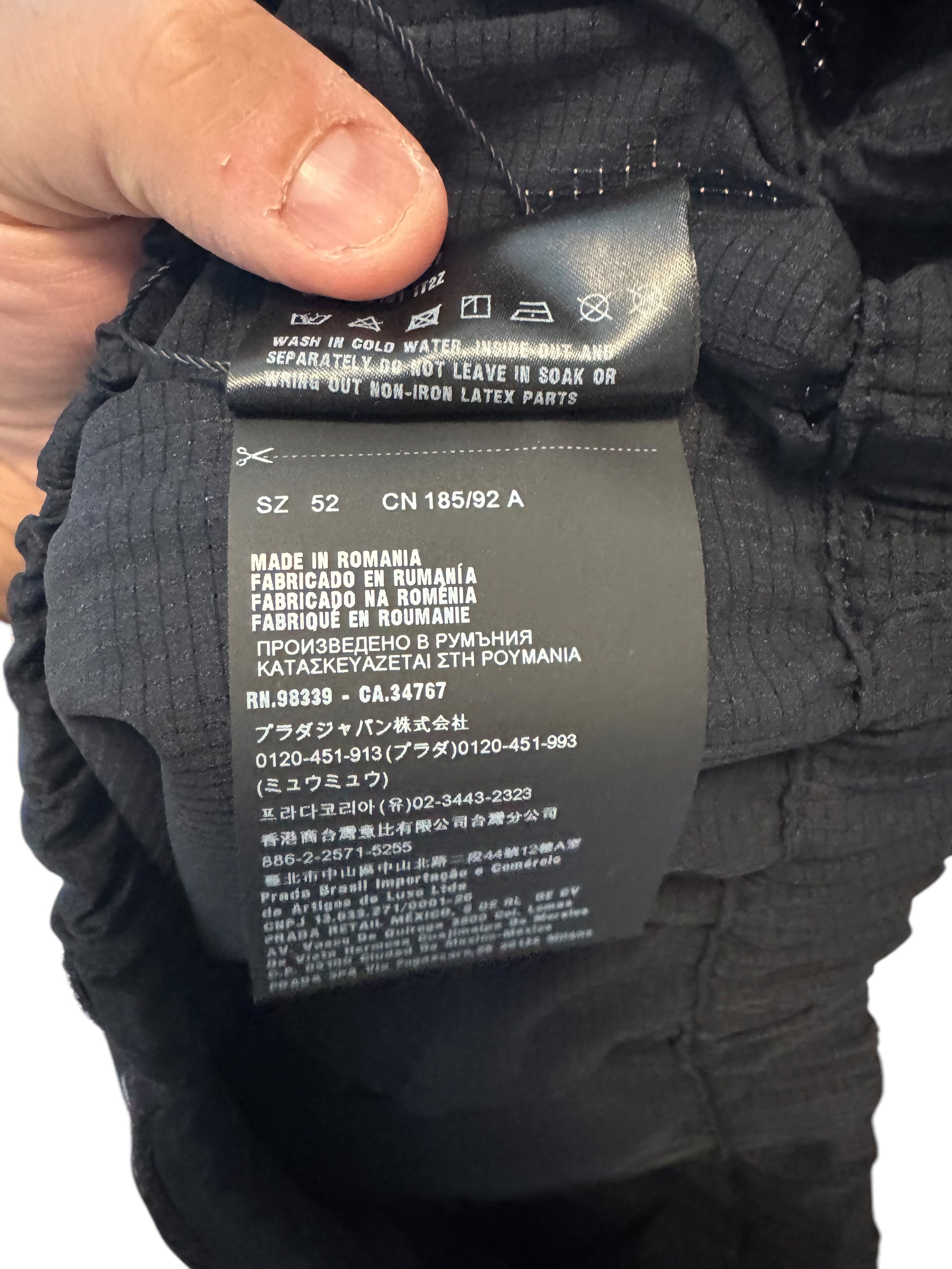 Pantaloni originali Prada Linea Rossa da uomo, taglia 52, colore nero. Realizzati in tessuto tecnico 100% poliestere con lavorazione a costine sottili. Vita elasticizzata con chiusura a strappo in velcro logata Prada, fondo gamba con elastico, comode tasche laterali con zip e tiralampo marchiati. Capo autentico completo di etichetta originale.