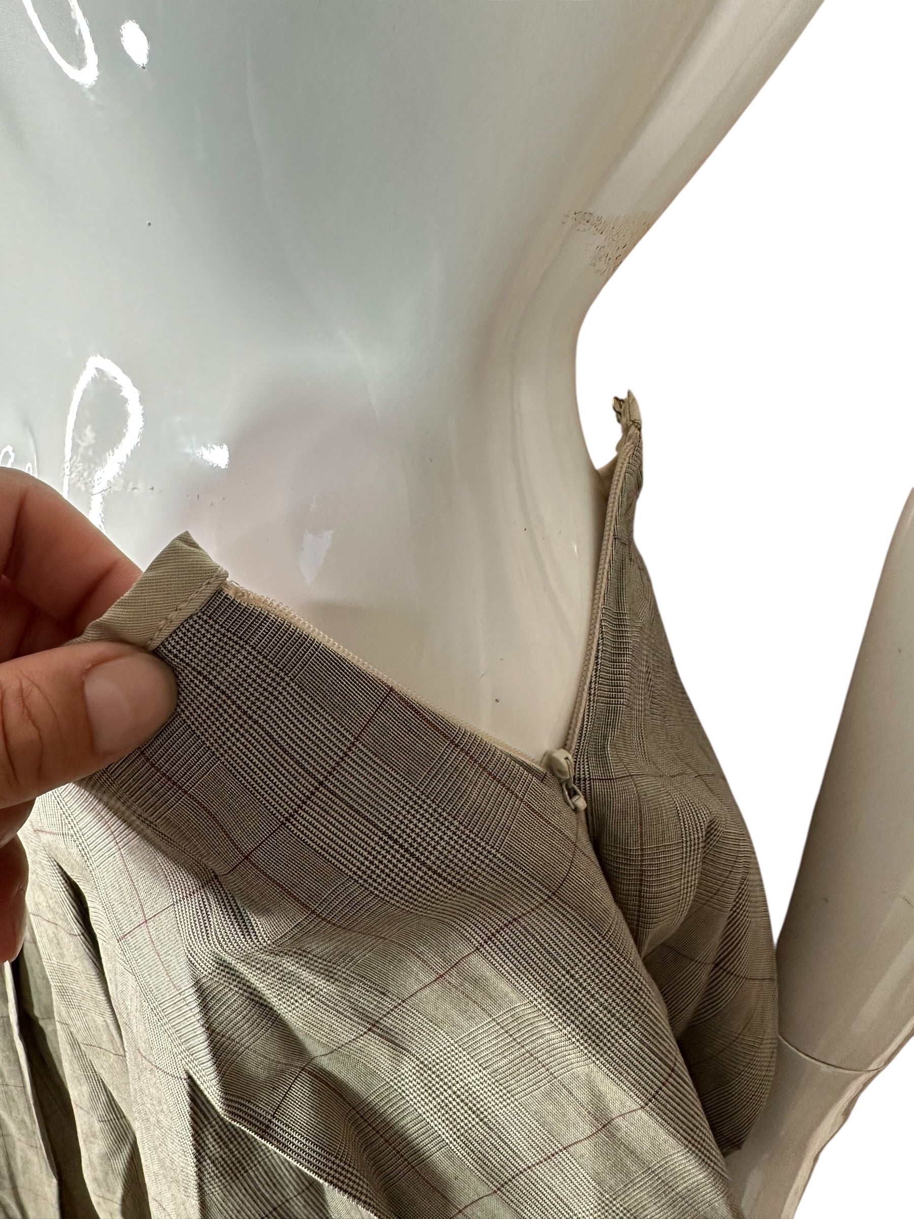 Il taglio è a vita alta, con ampia struttura plissé cucita in vita e libera al fondo, che regala un volume scultoreo ma leggero. Completamente foderata in cotone, è dotata di chiusura laterale con zip nascosta e bottone interno.