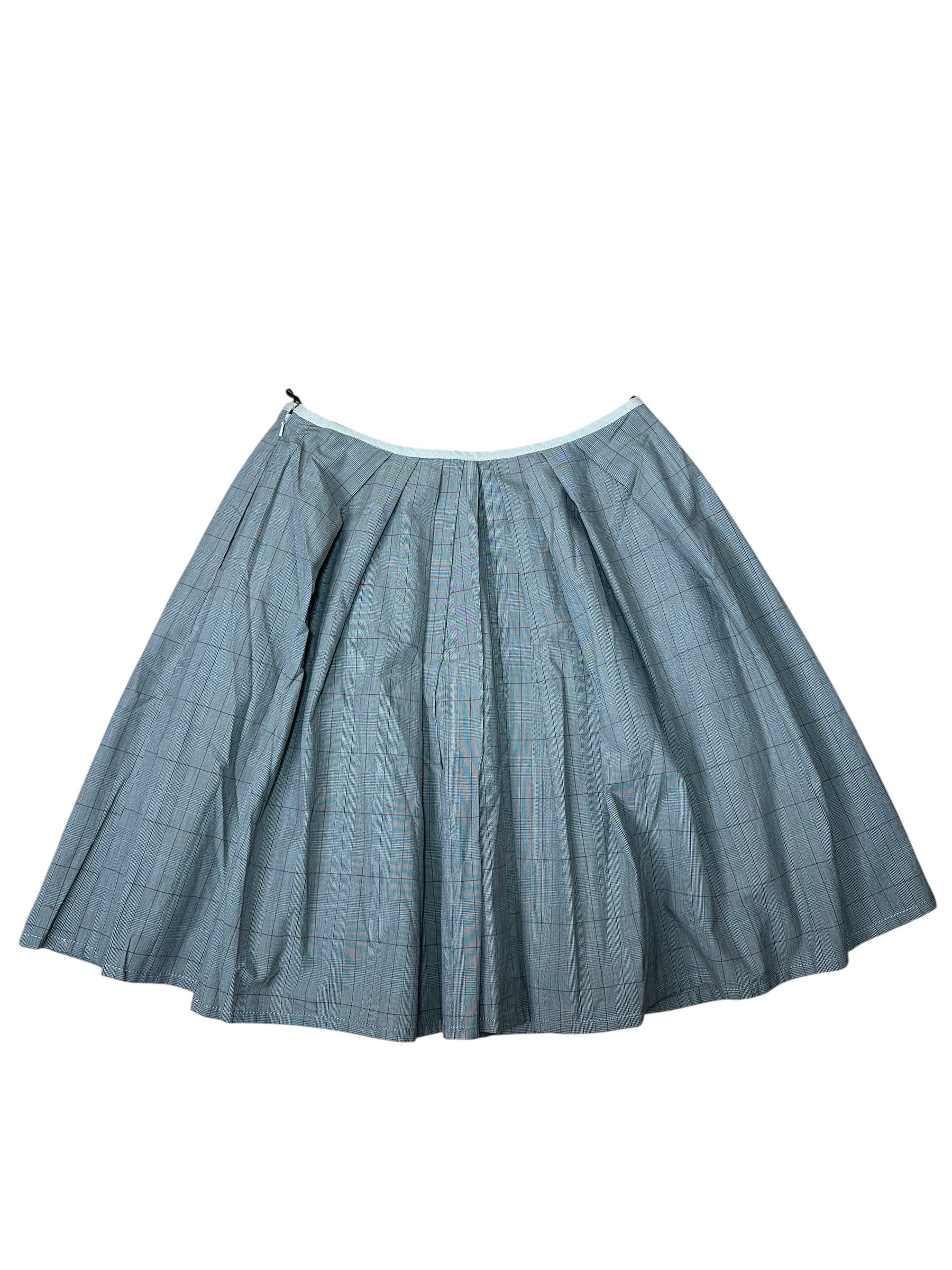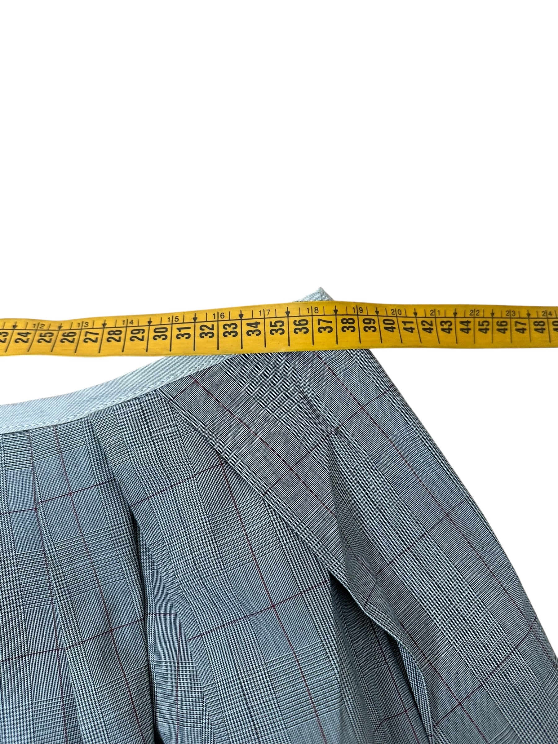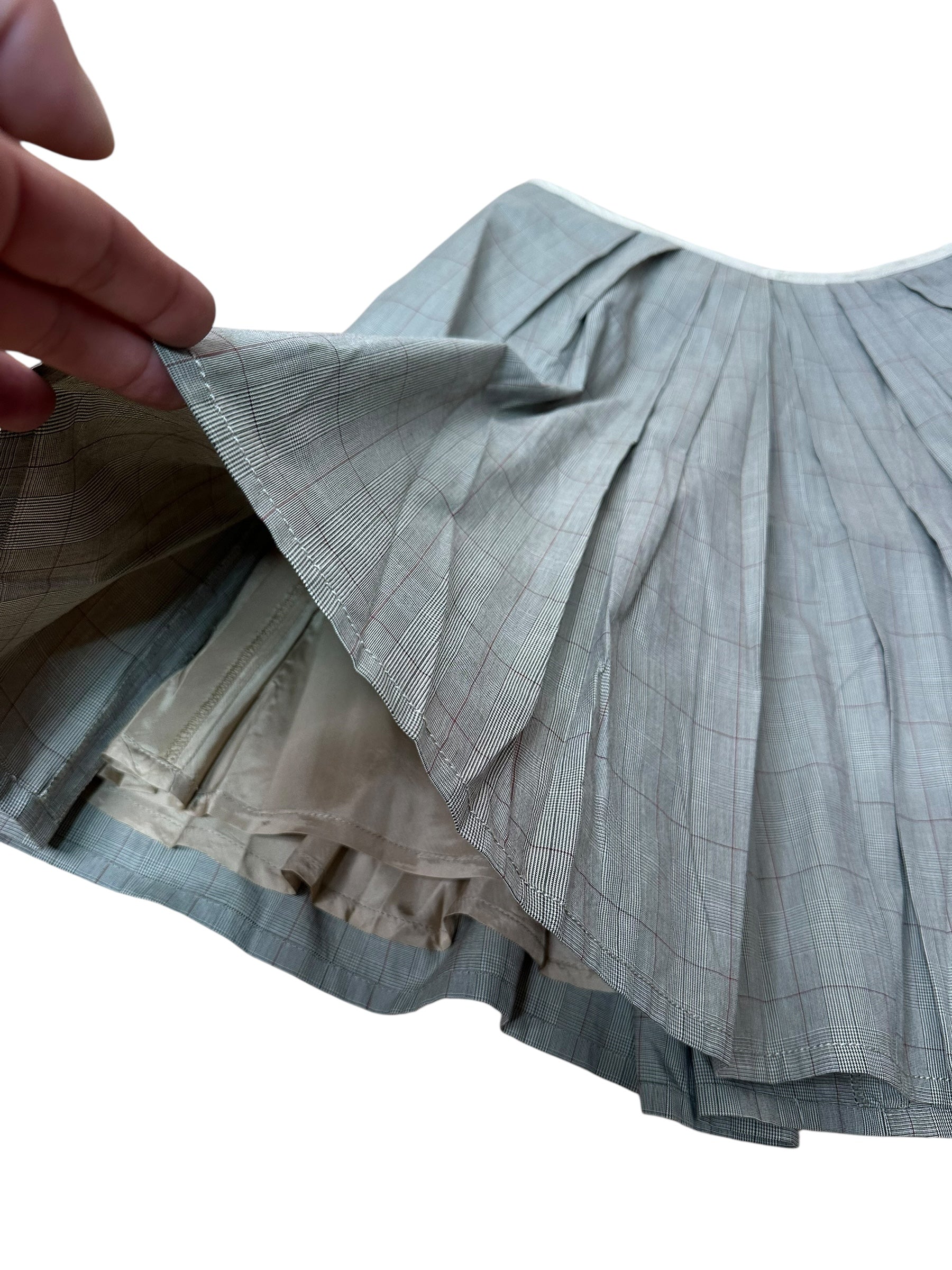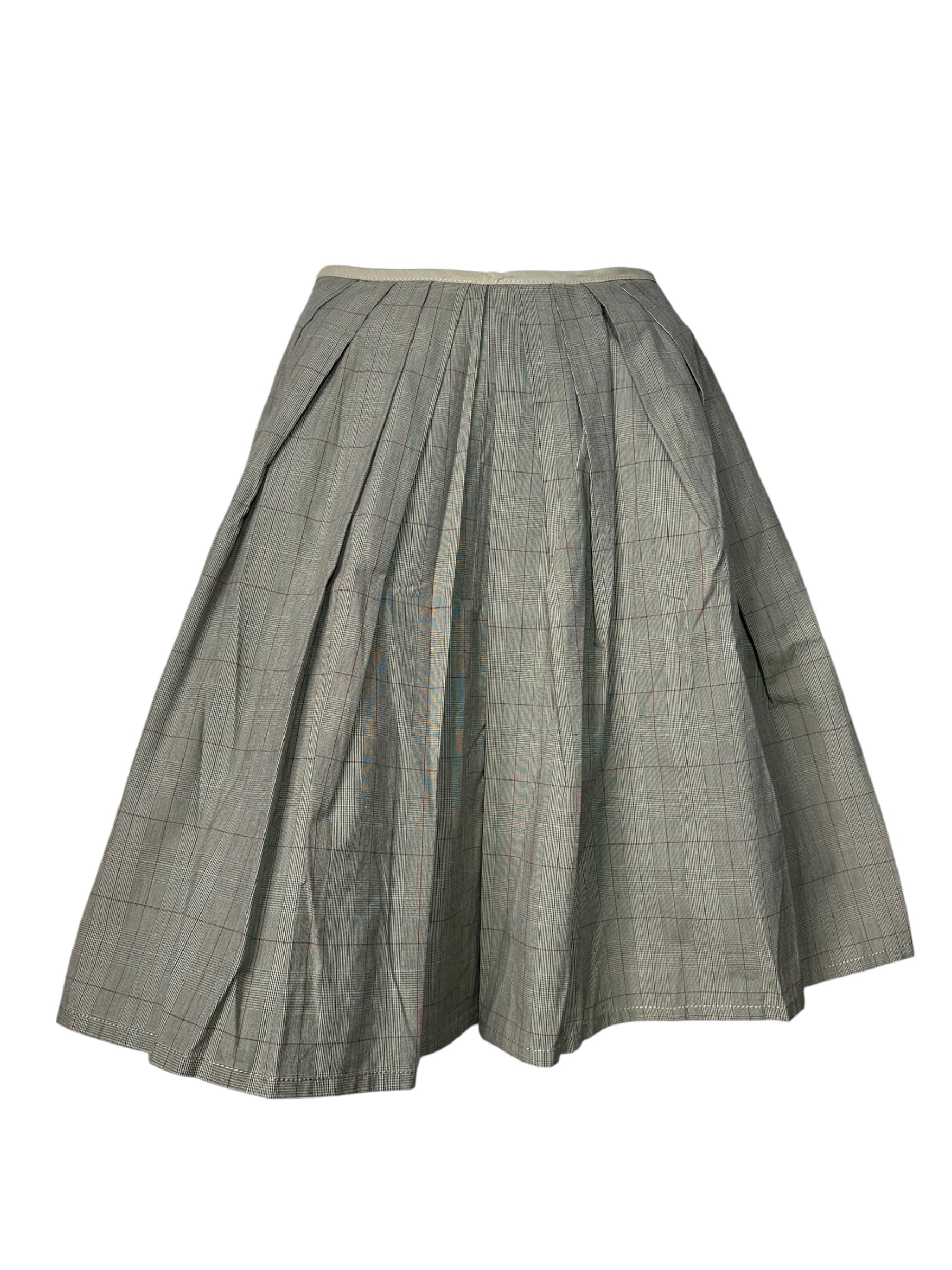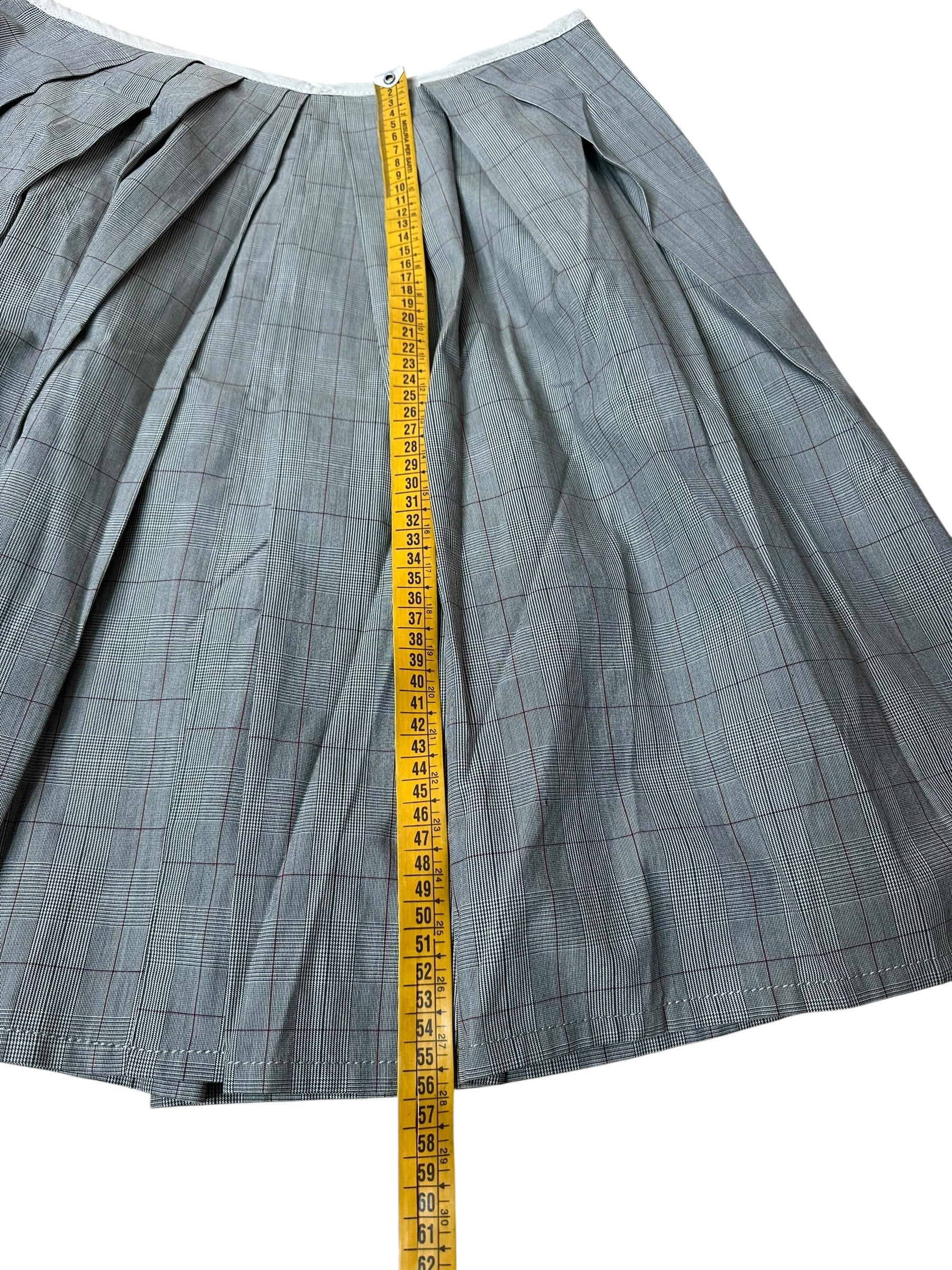 Elegante e strutturata, questa gonna a pieghe firmata Paul Smith Black unisce sartorialità britannica e qualità italiana. Realizzata in 100% cotone, presenta una raffinata fantasia Principe di Galles nei toni del grigio con sottili righe bordeaux, che dona movimento e profondità al capo.