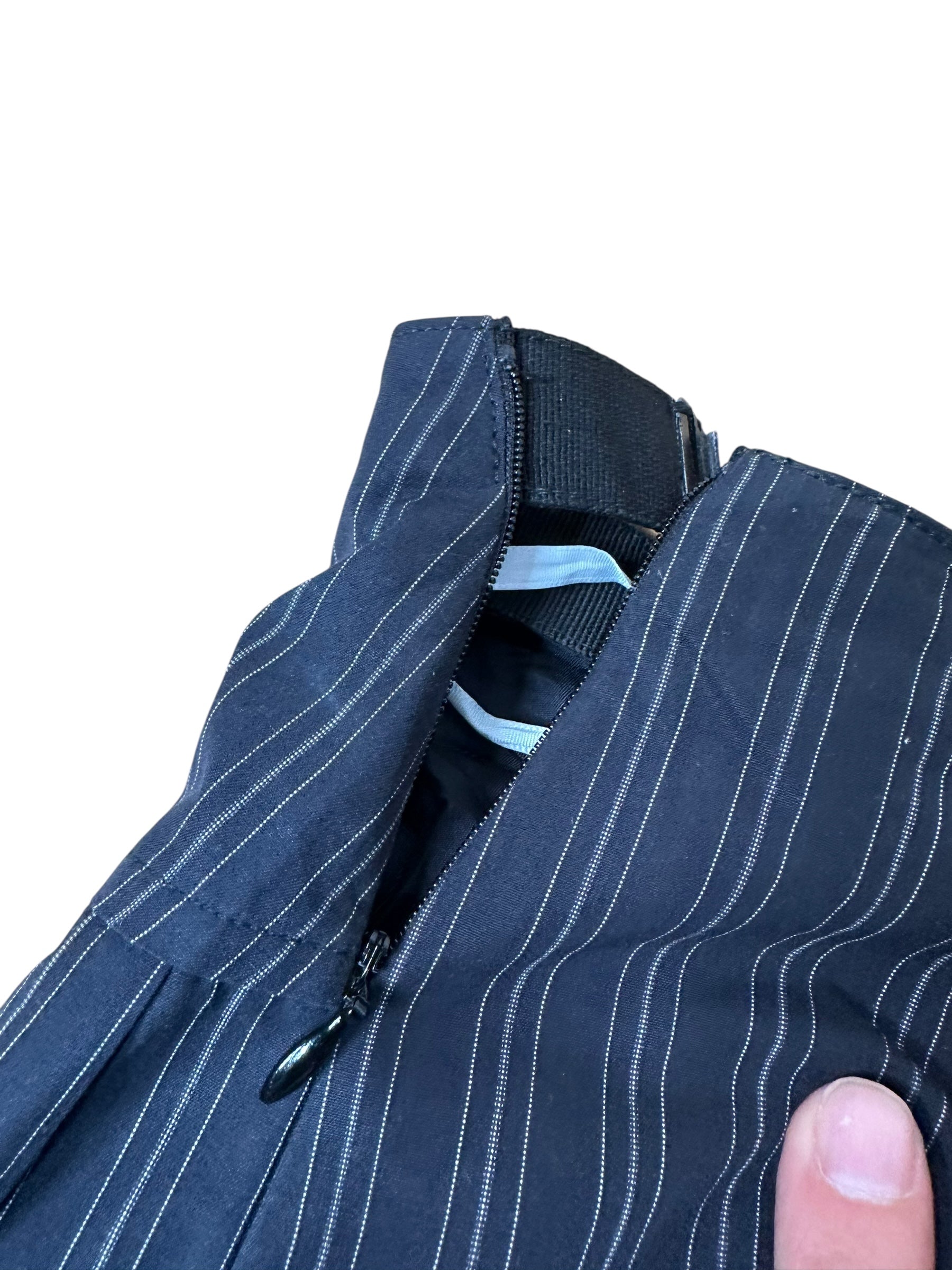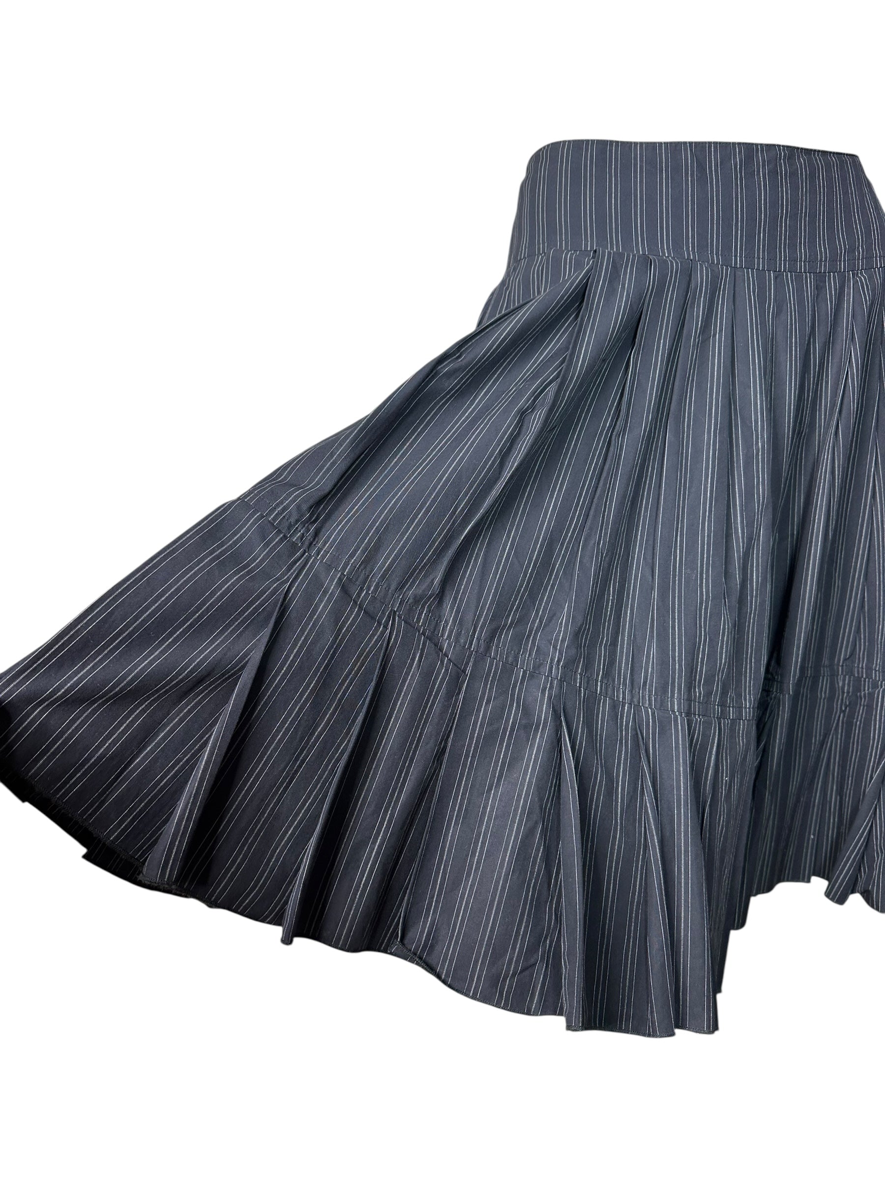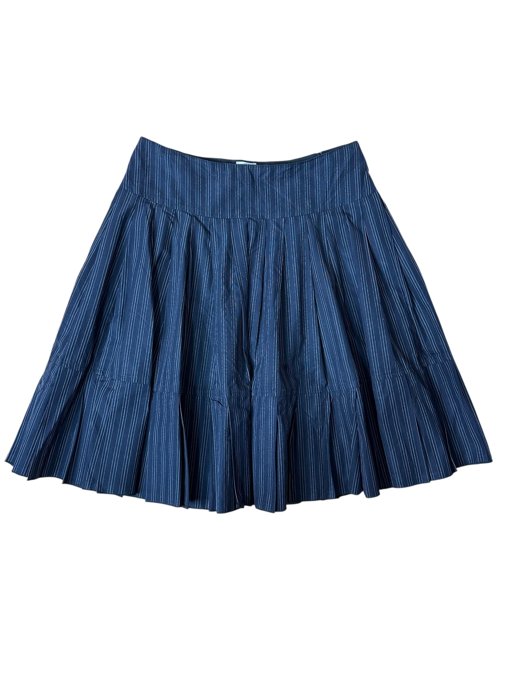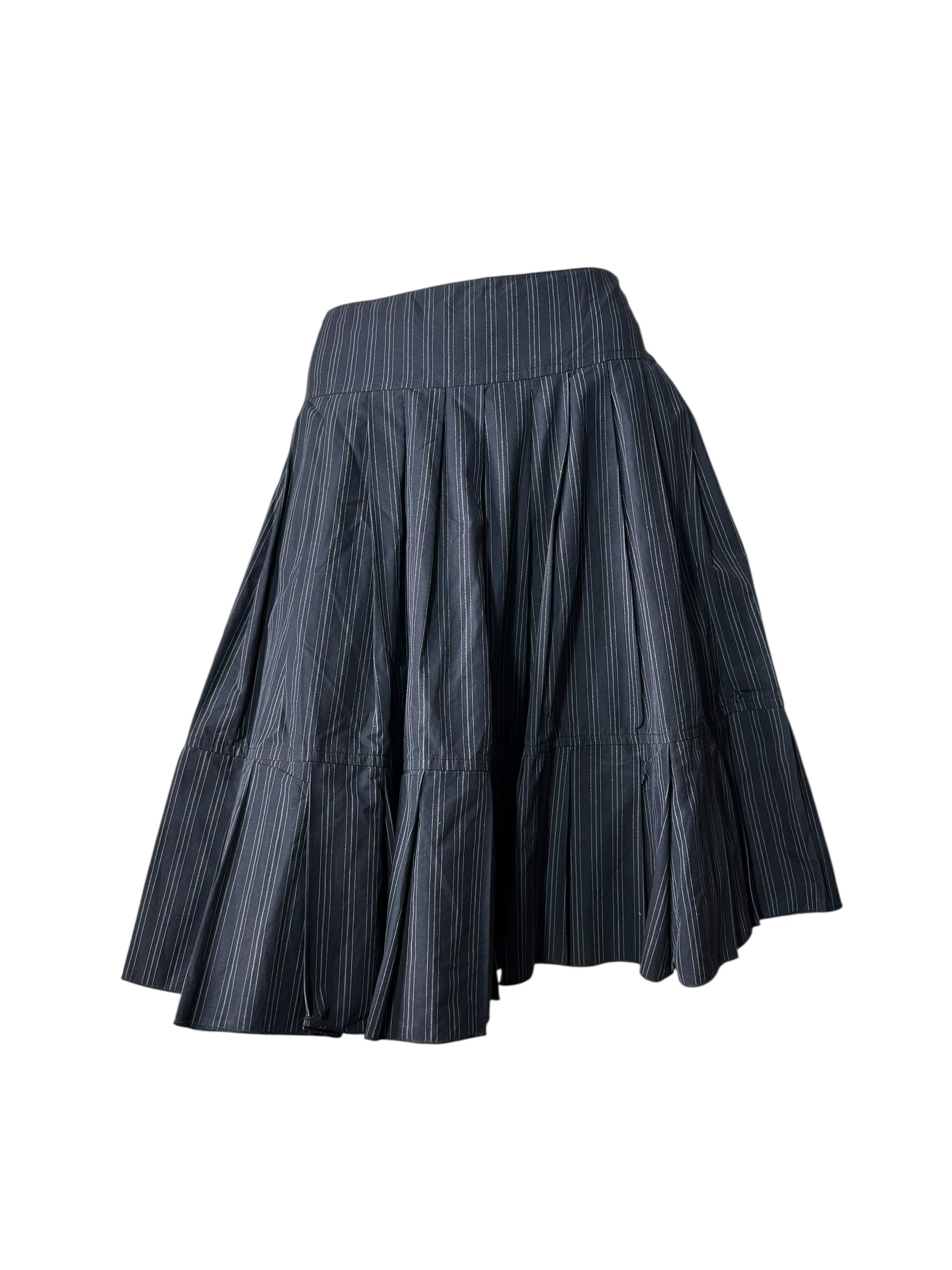 Gonna a ruota firmata Paul Smith Blue, Made in Italy, realizzata in cotone 100% con pattern a righe verticali in bianco su fondo blu notte. Il capo presenta una costruzione strutturata ma leggera, con ampio pannello svasato e tagli orizzontali che conferiscono movimento e volume alla silhouette. La fascia in vita è ampia e sagomata, con zip laterale a scomparsa e gancetto di chiusura. Foderata internamente con sottogonna in voile nero rifinito da bordo in pizzo.