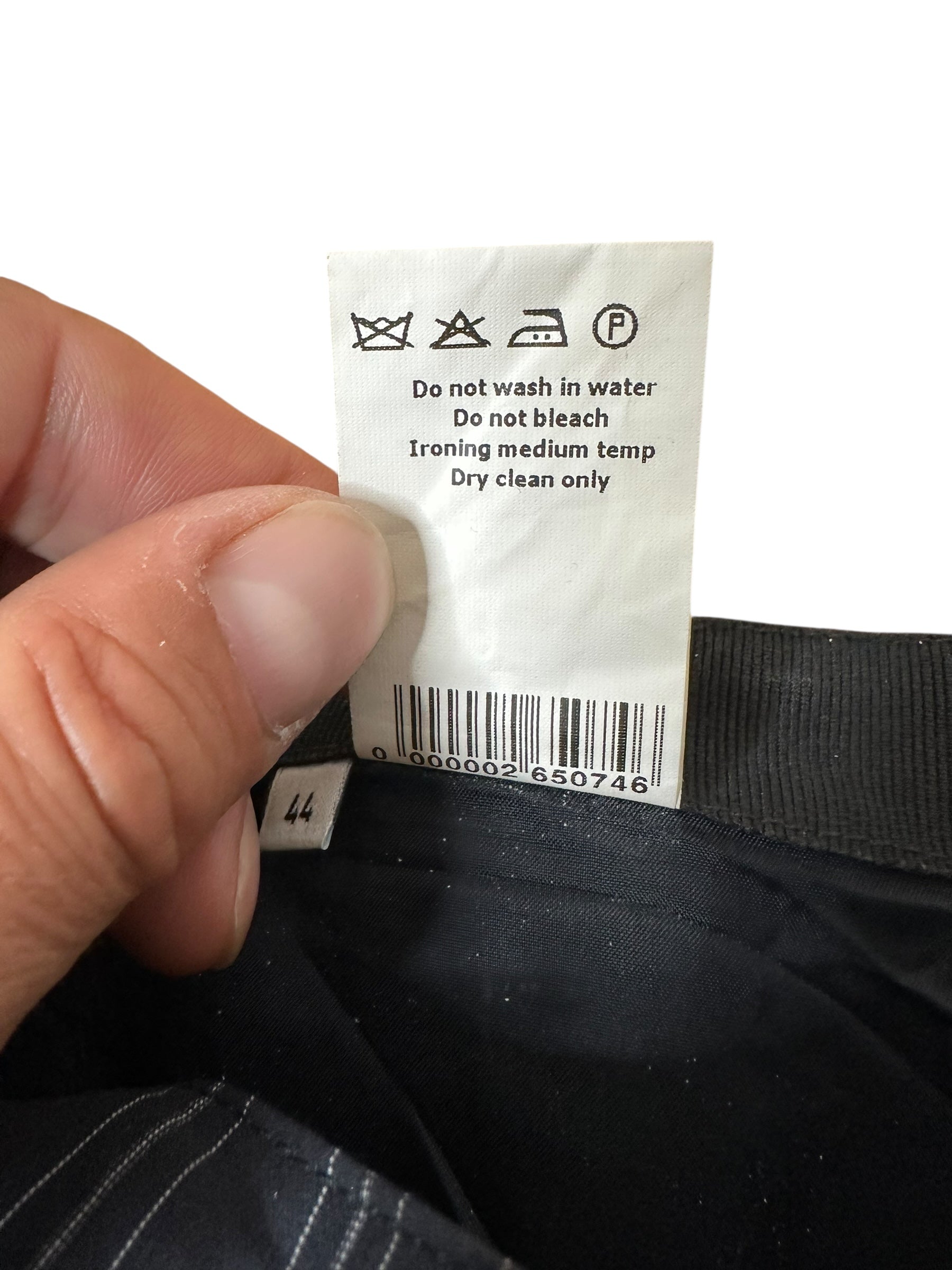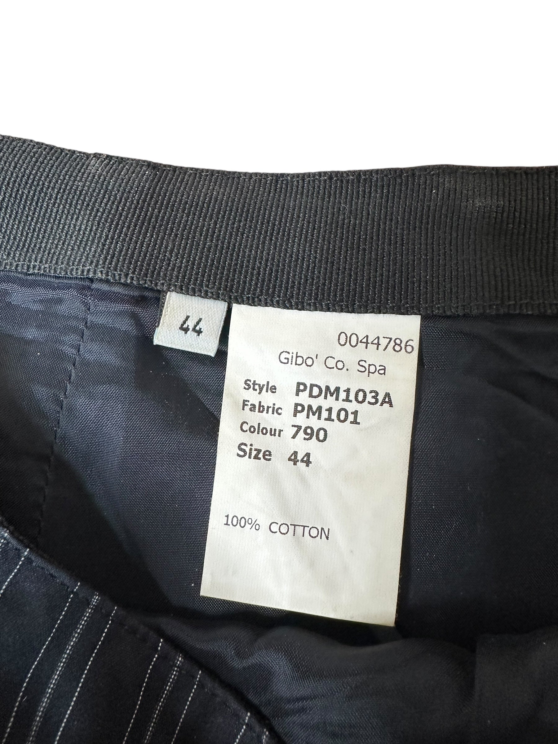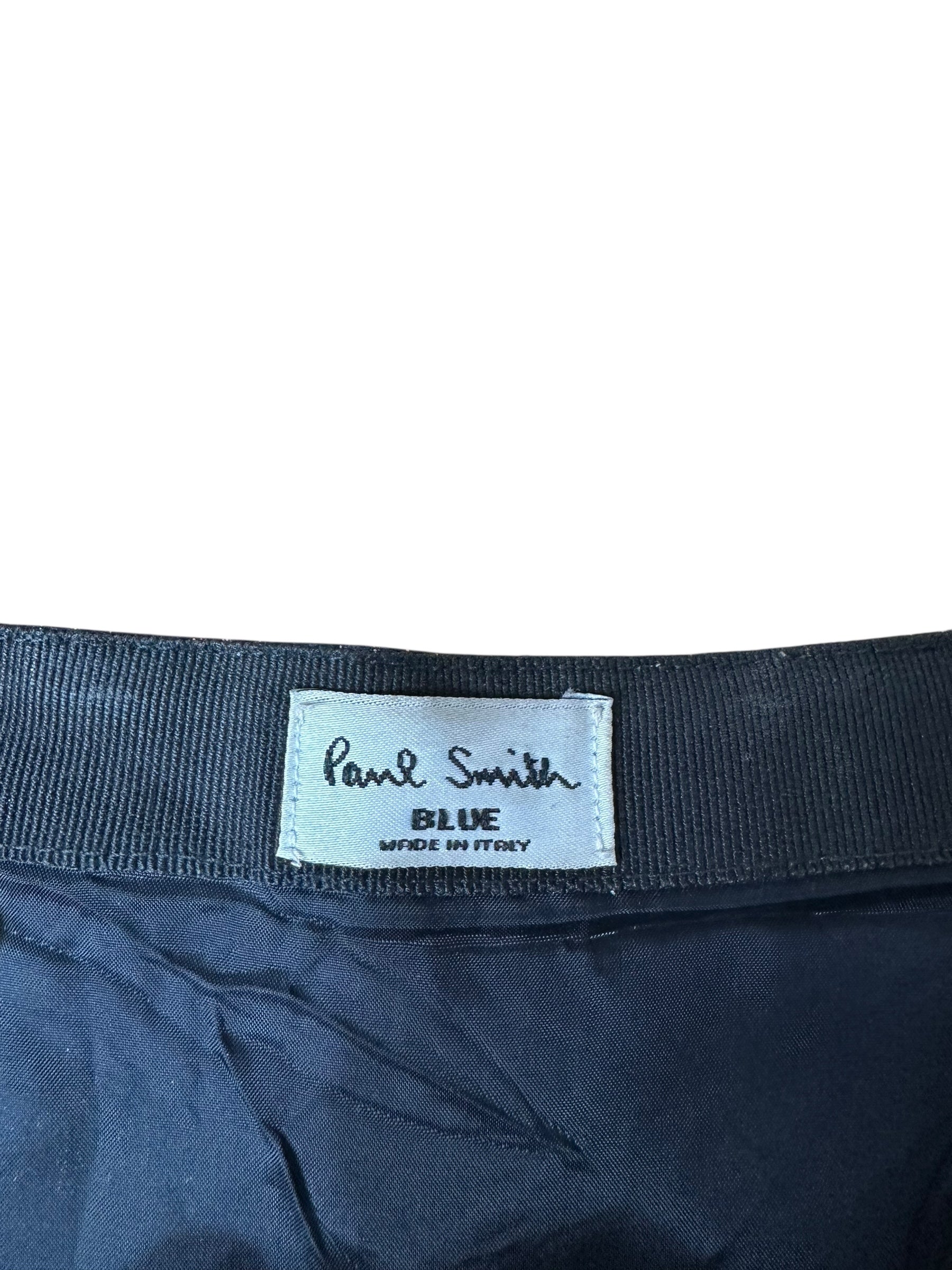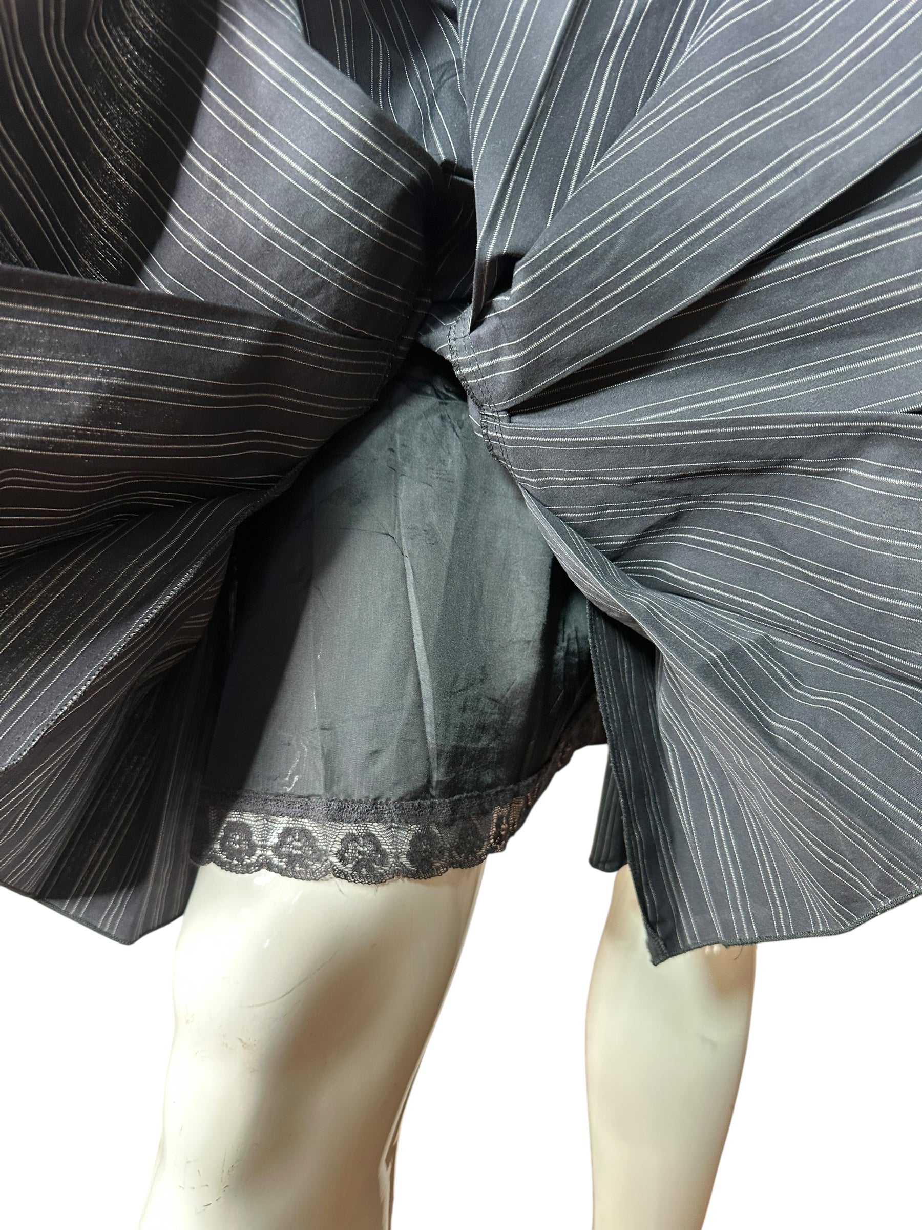Gonna a ruota firmata Paul Smith Blue, Made in Italy, realizzata in cotone 100% con pattern a righe verticali in bianco su fondo blu notte. Il capo presenta una costruzione strutturata ma leggera, con ampio pannello svasato e tagli orizzontali che conferiscono movimento e volume alla silhouette. La fascia in vita è ampia e sagomata, con zip laterale a scomparsa e gancetto di chiusura. Foderata internamente con sottogonna in voile nero rifinito da bordo in pizzo.