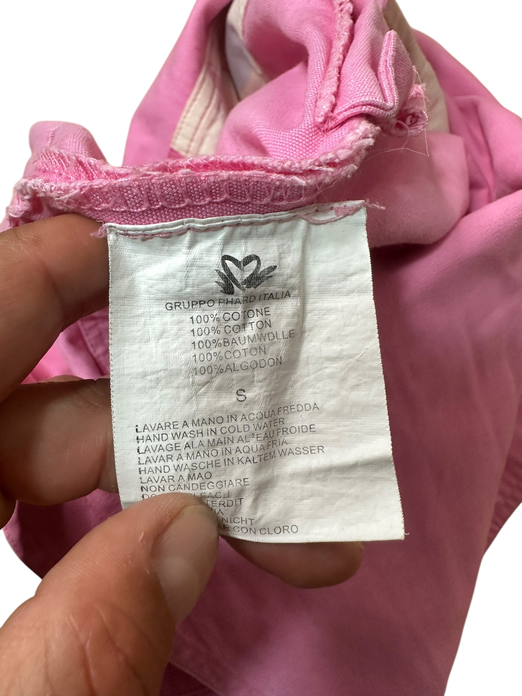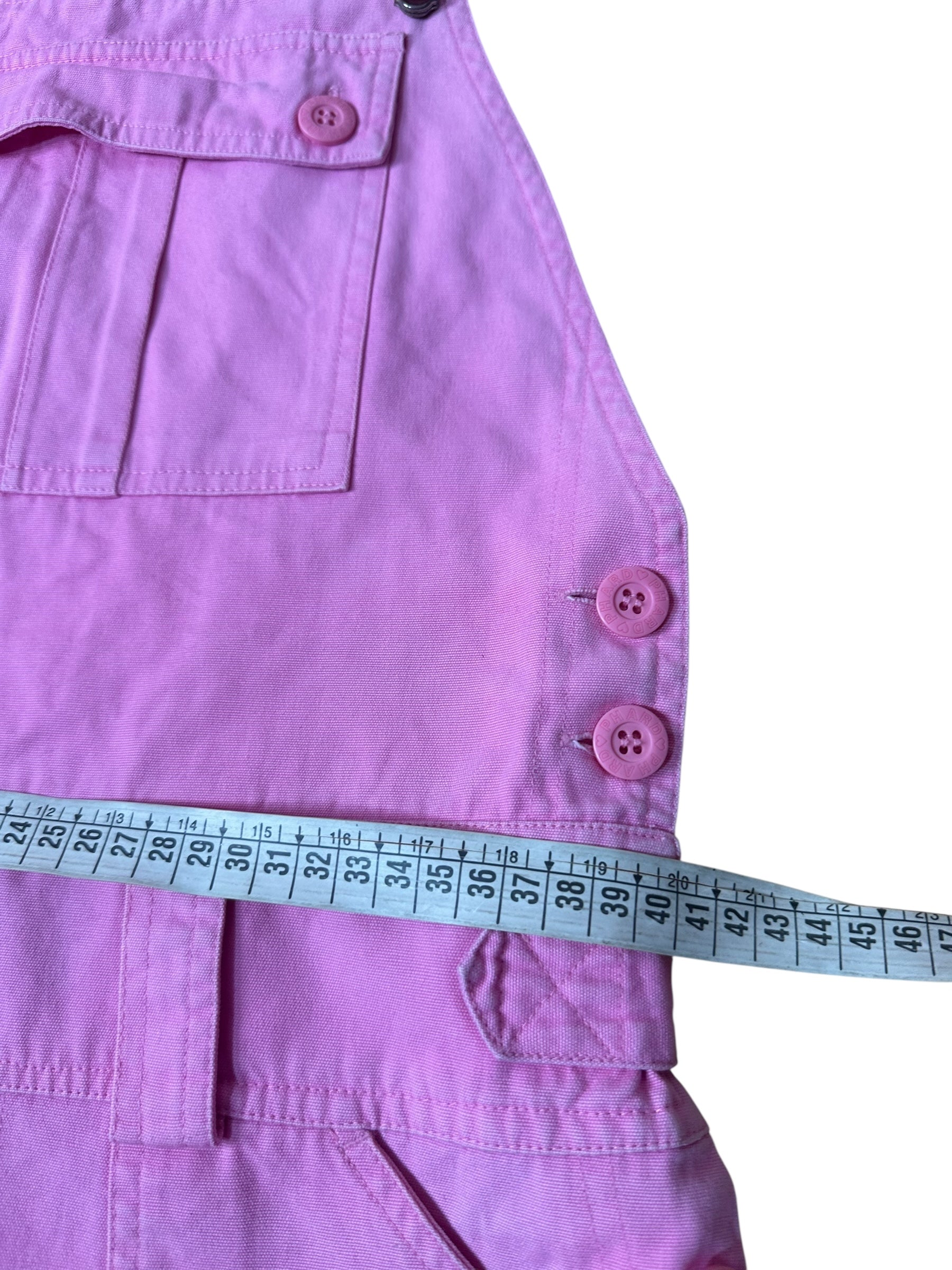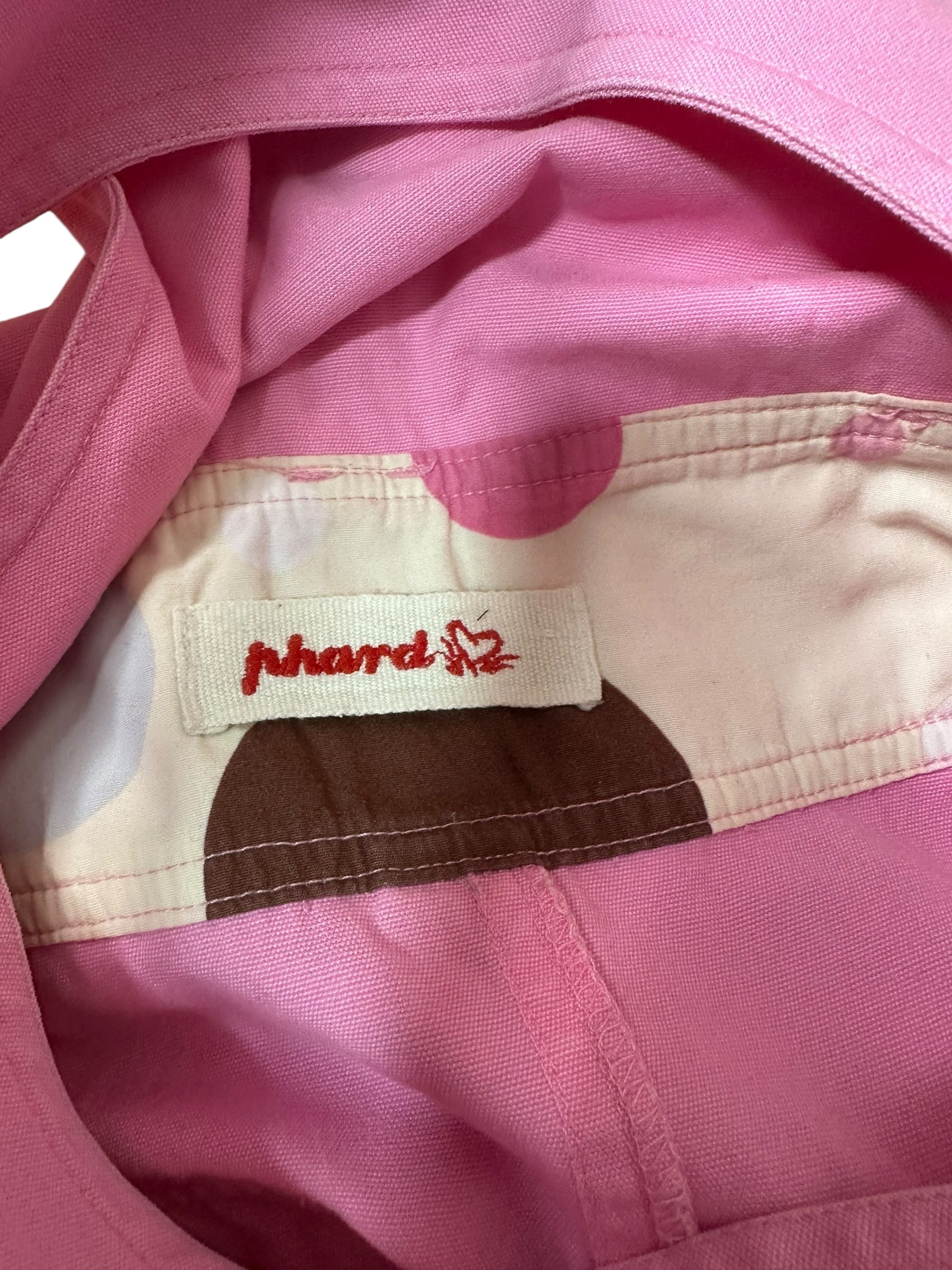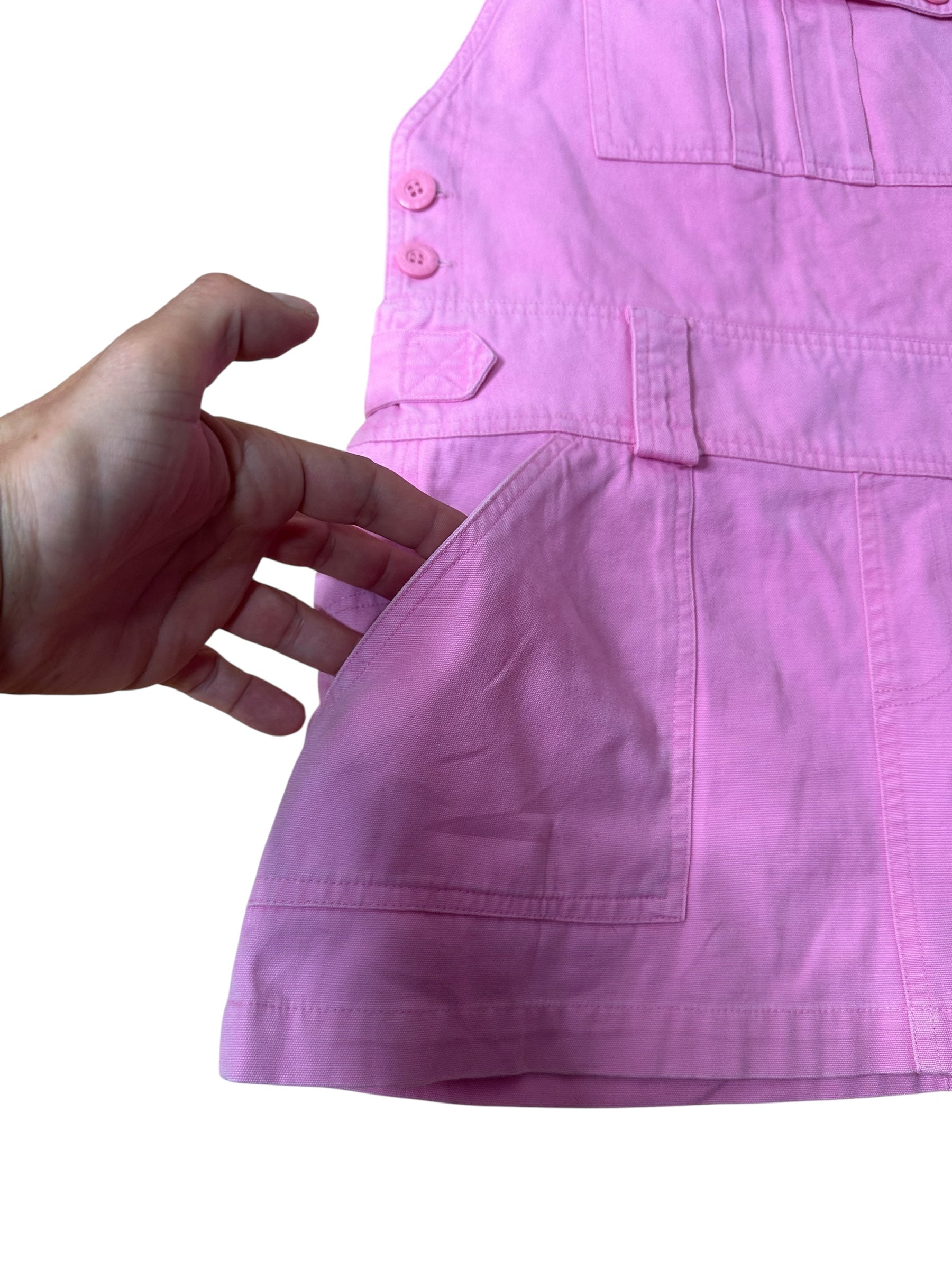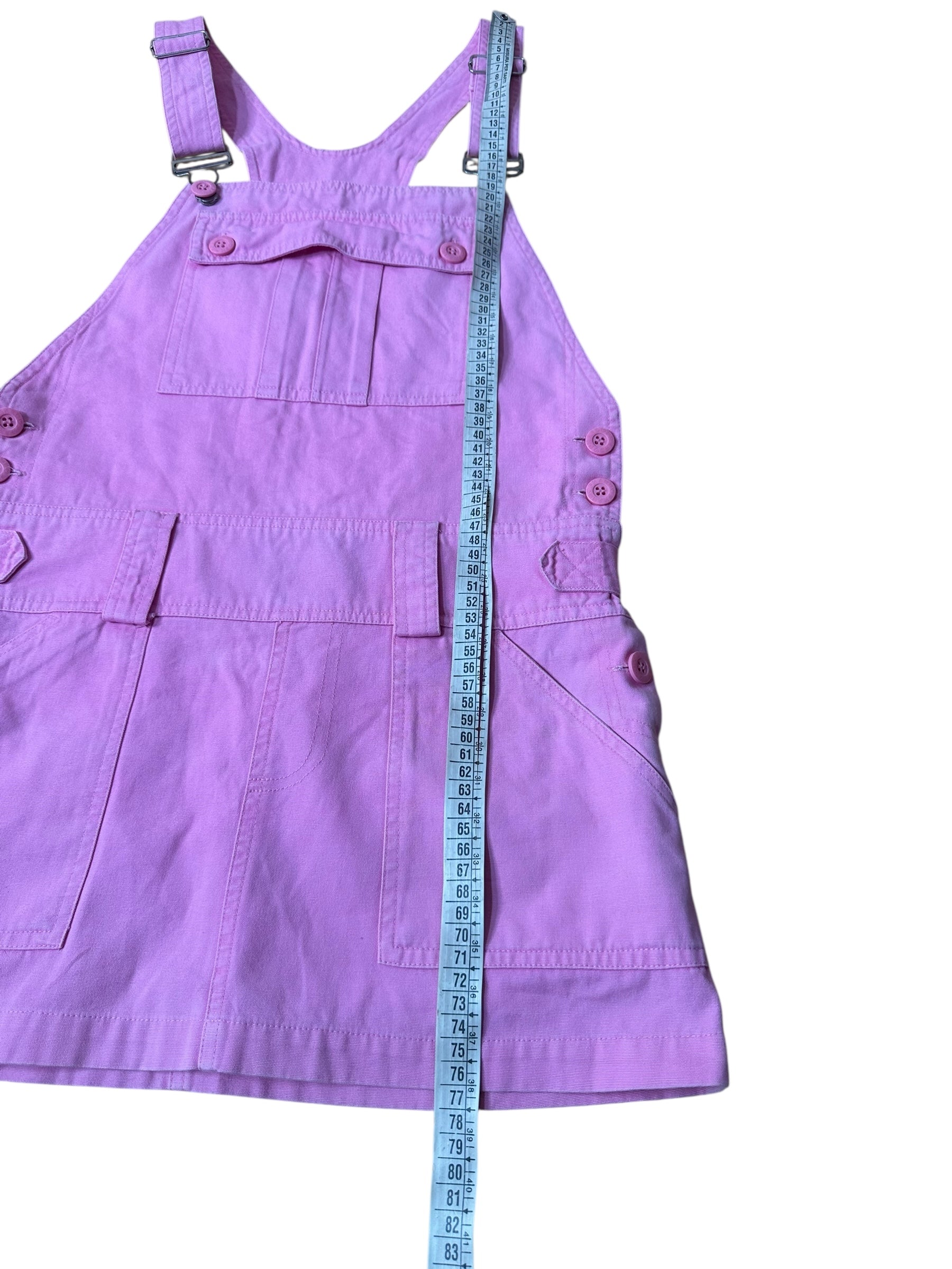 Minigonna salopette vintage firmata Phard, in robusto cotone 100%, tonalità lilla con sfumature tra rosa e lavanda a seconda della luce. Modello con pettorina e bretelle regolabili in metallo, chiusura laterale con bottoni personalizzati, vita strutturata con passanti per cintura e tasche oblique frontali. Sulla parte posteriore presenta due tasche a soffietto con pattina e doppio bottone, una delle quali arricchita da etichetta logata.