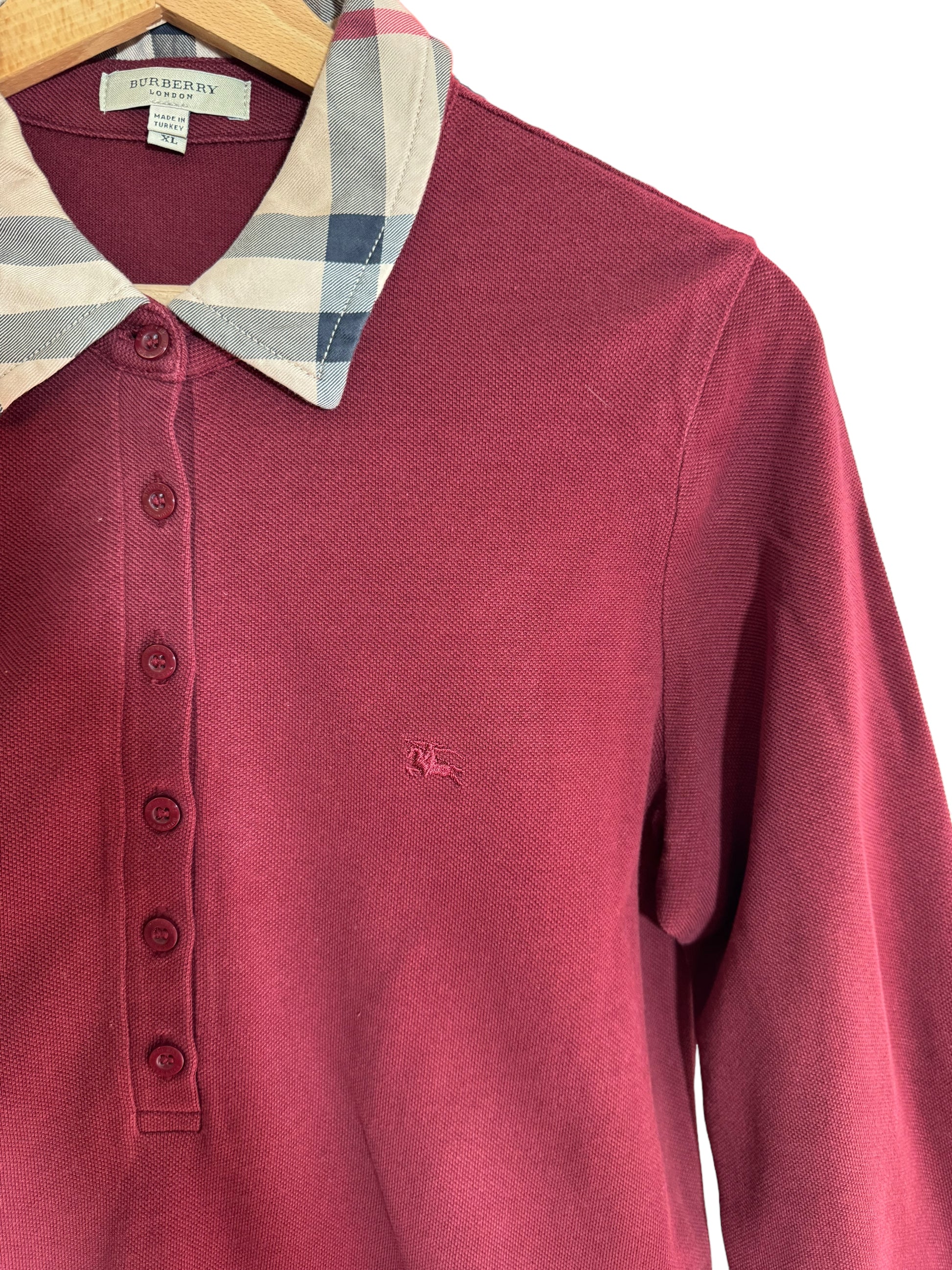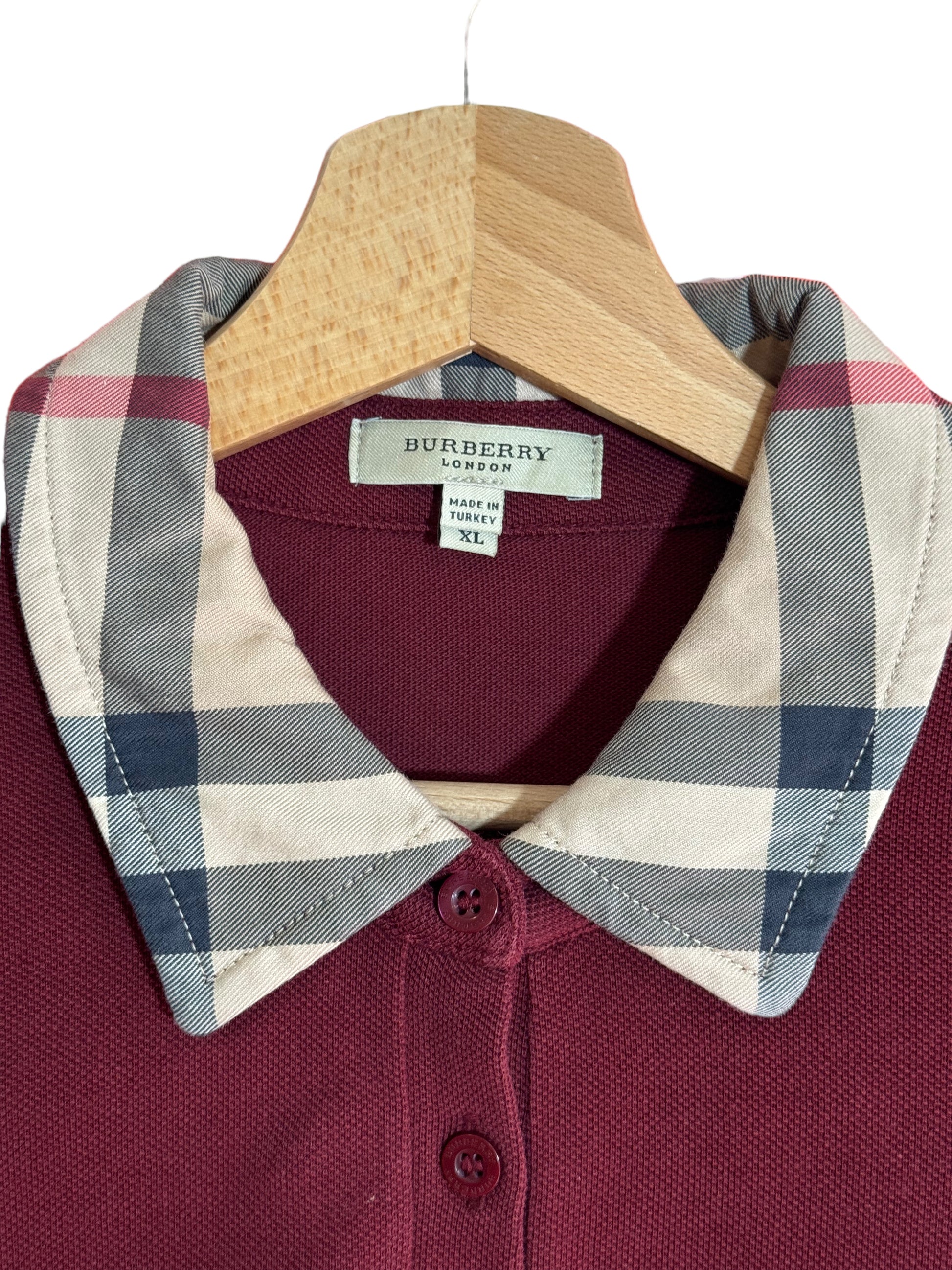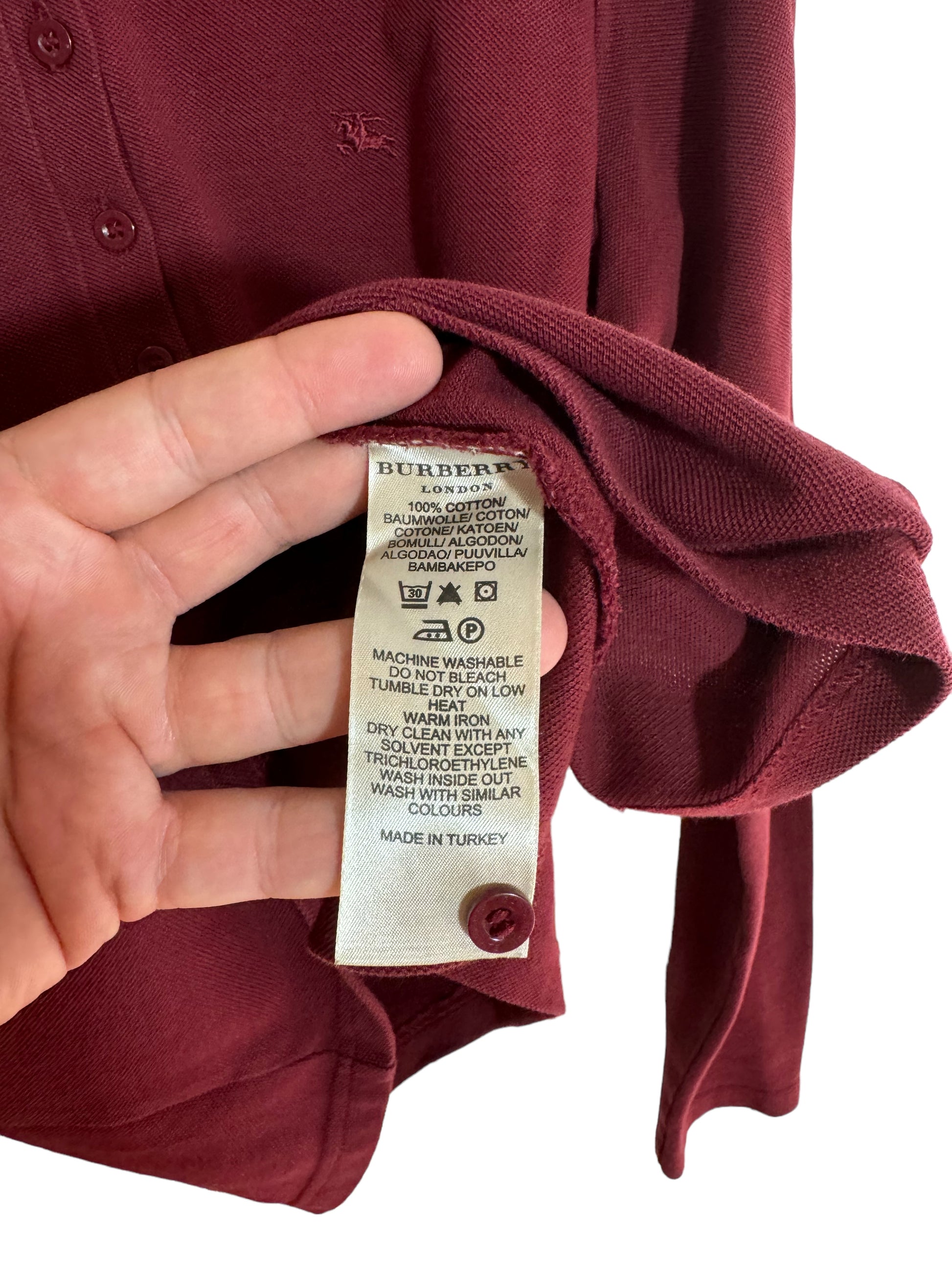 Polo Burberry in cotone a nido d’ape bordeaux, con logo ricamato al petto e chiusura a 6 bottoni. Colletto con stampa a tema Burberry. Taglia XL femminile.