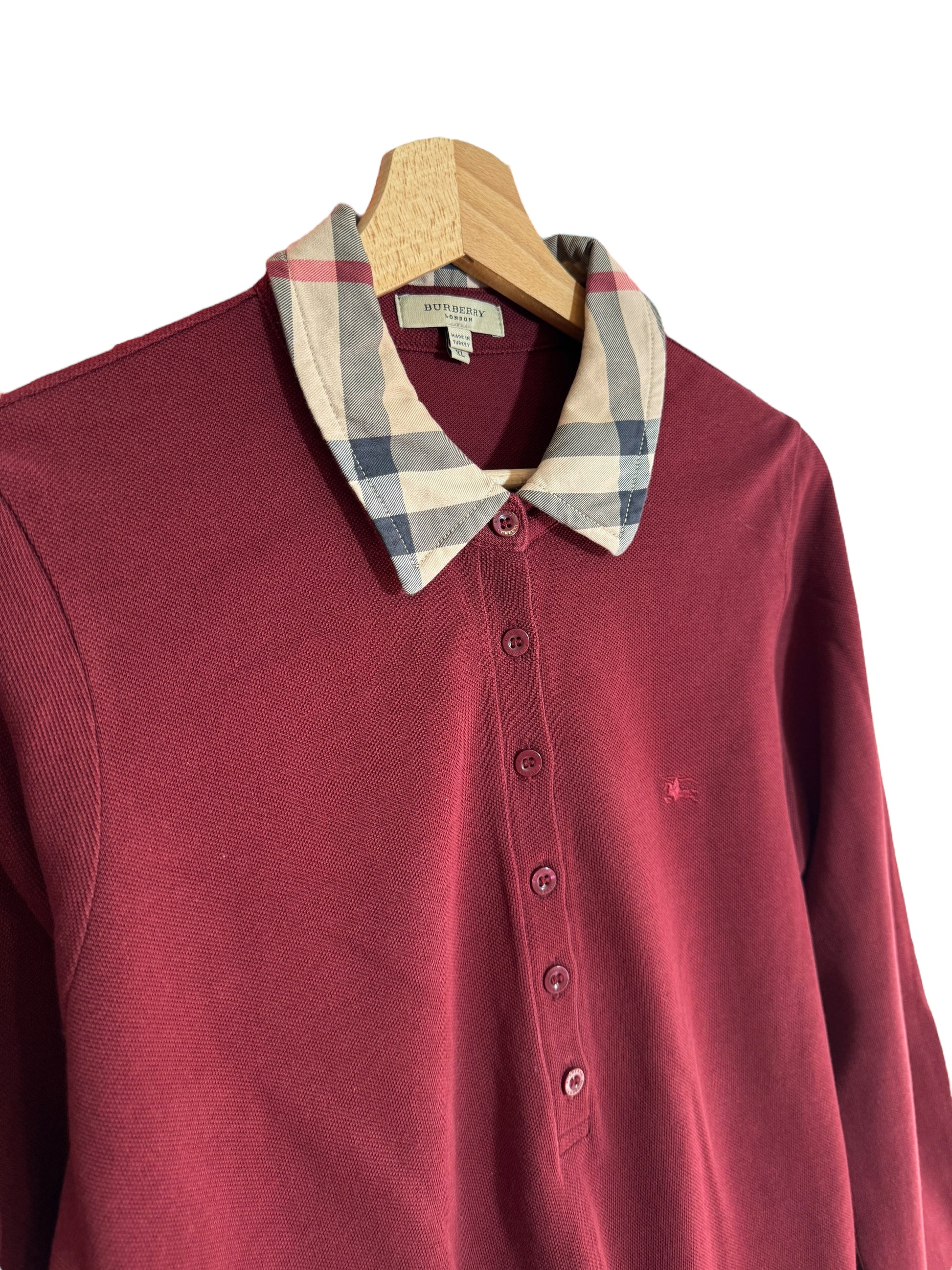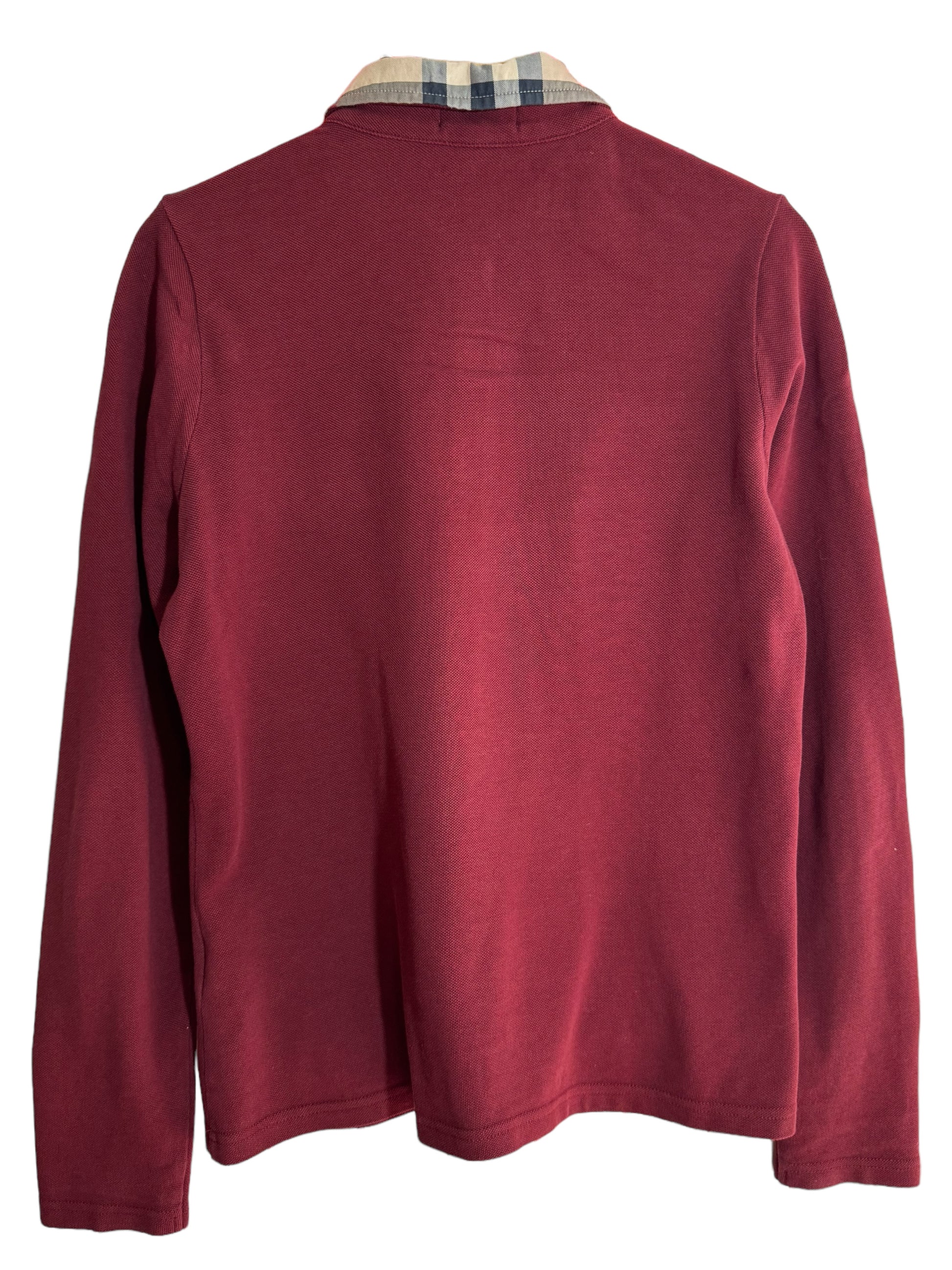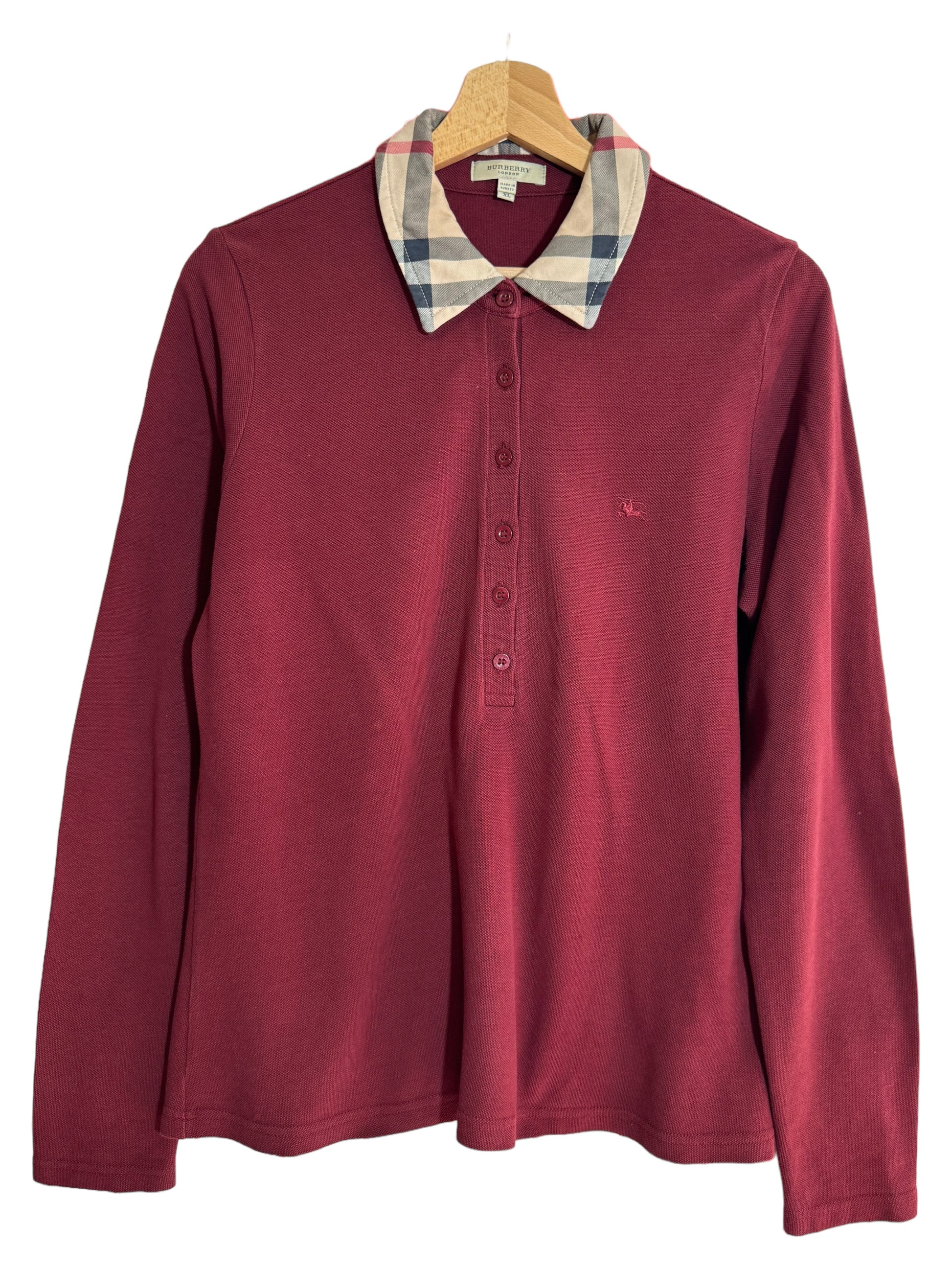 Polo Burberry in cotone a nido d’ape bordeaux, con logo ricamato al petto e chiusura a 6 bottoni. Colletto con stampa a tema Burberry. Taglia XL femminile.