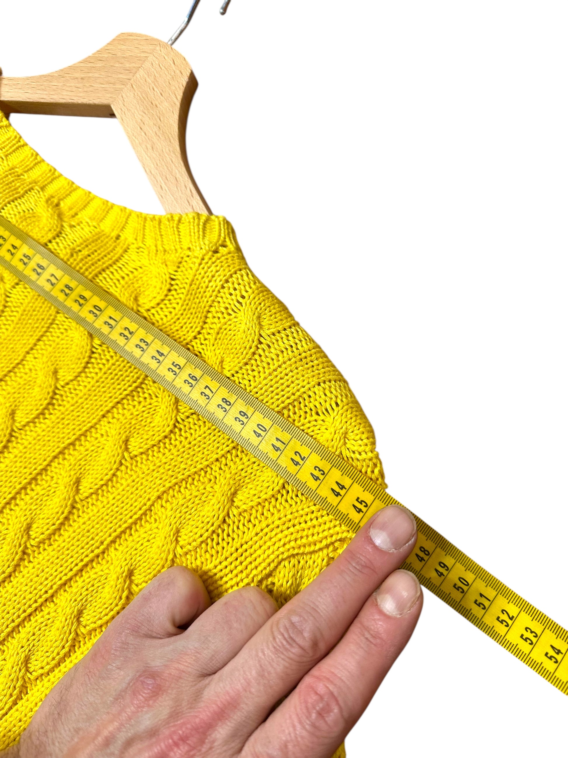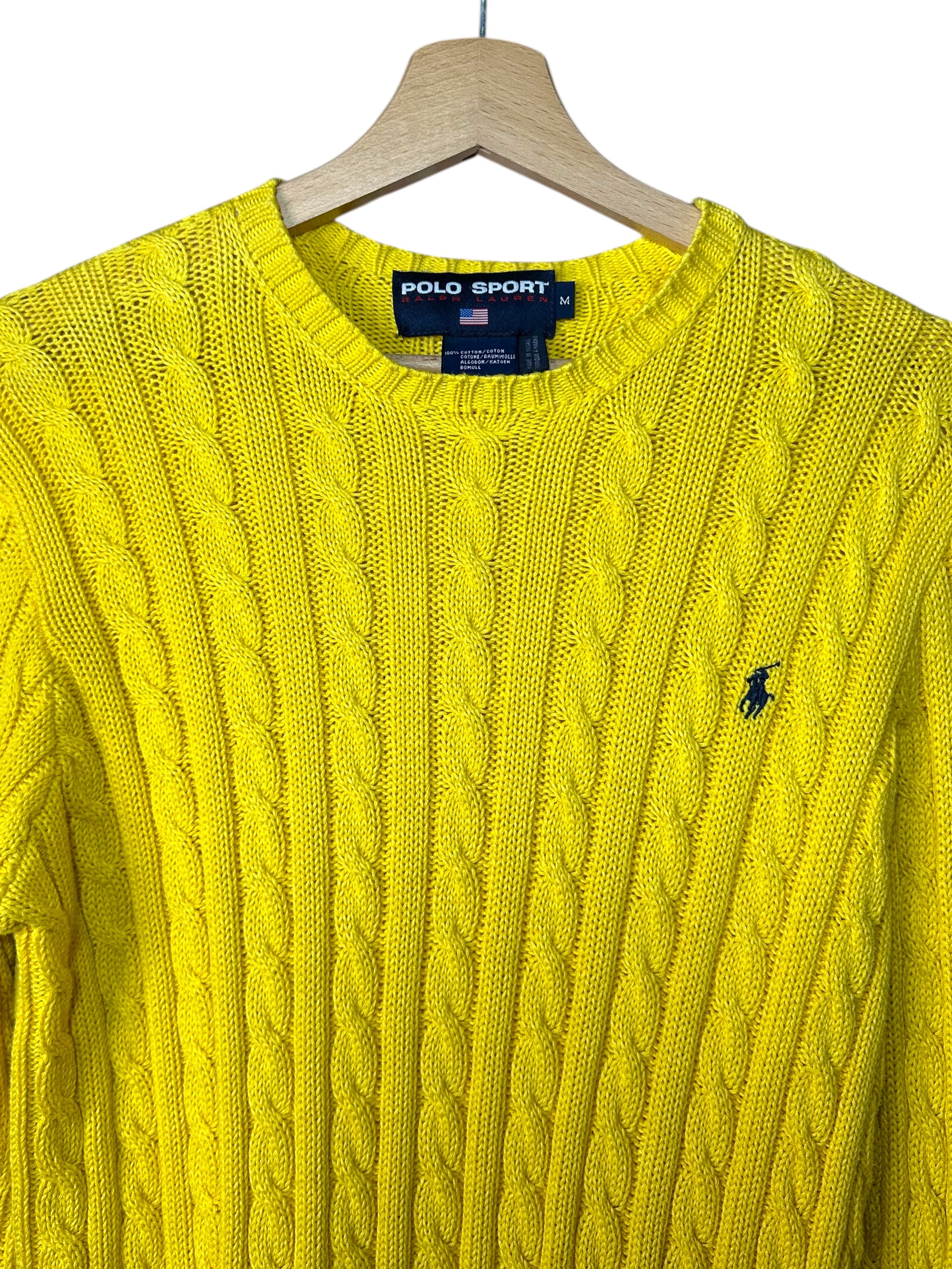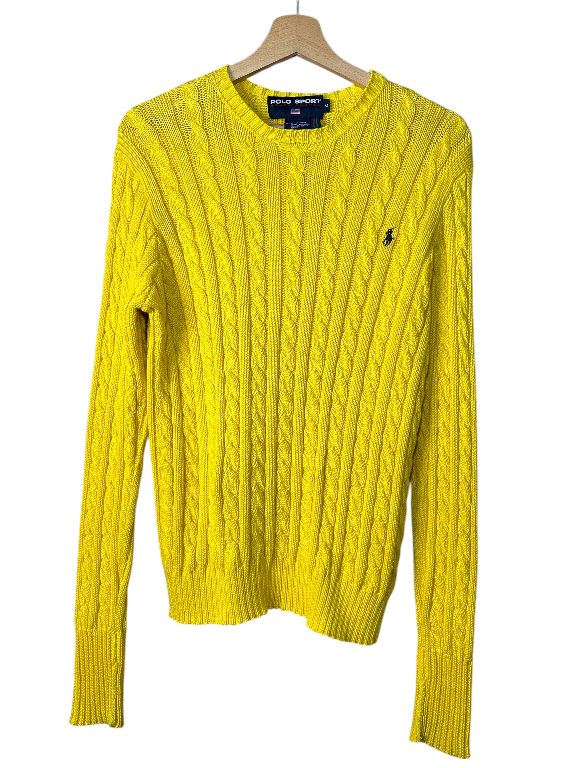 Maglione girocollo firmato Polo Sport Ralph Lauren, realizzato in filato a trecce con lavorazione verticale. Il modello presenta una vestibilità aderente e una struttura ben definita, con collo, fondo e polsini a costine. Sul petto è presente il classico logo ricamato Polo in contrasto. Colore giallo acceso, luminoso e uniforme, ideale sia come capo statement che per look casual curati.