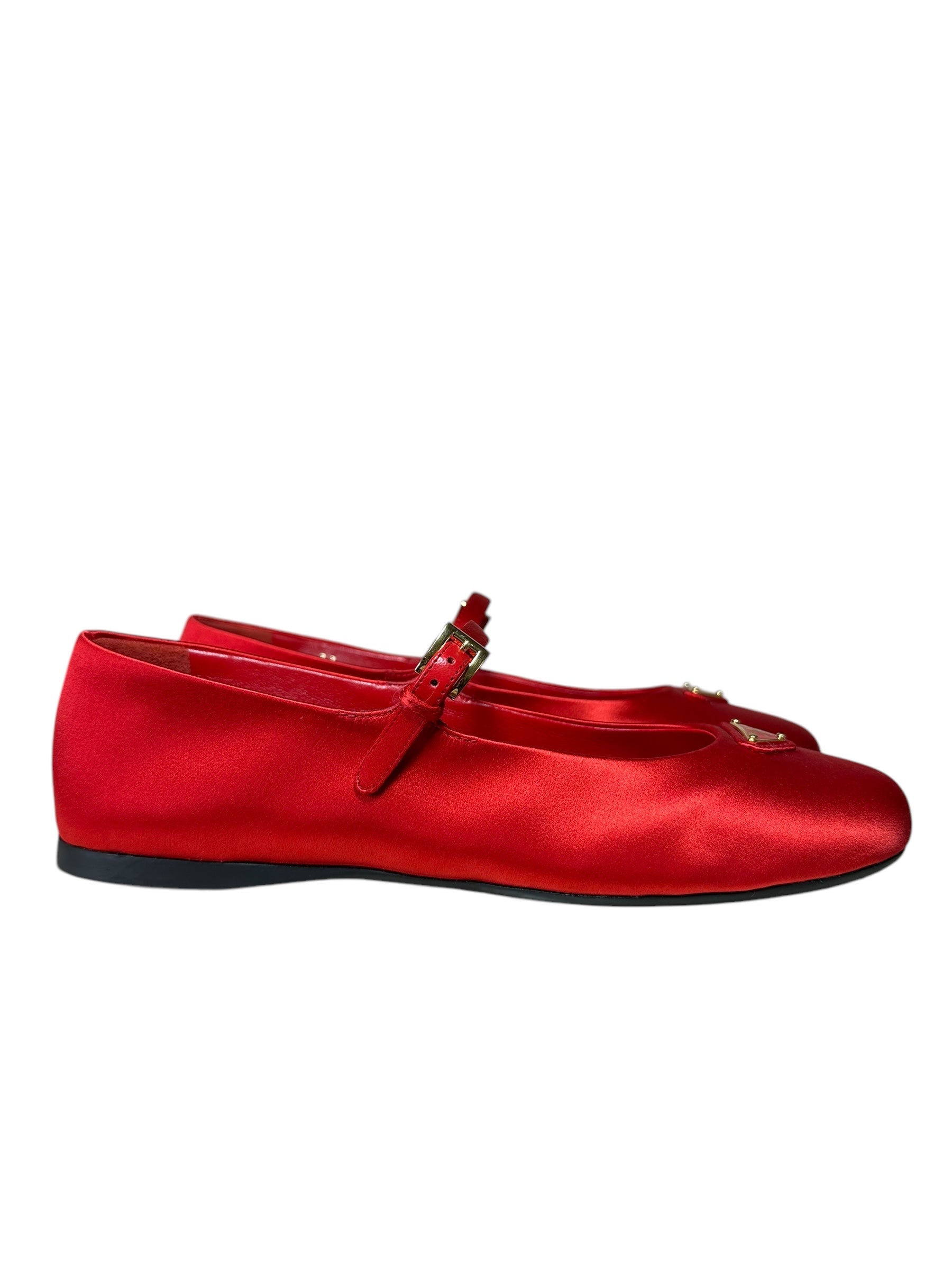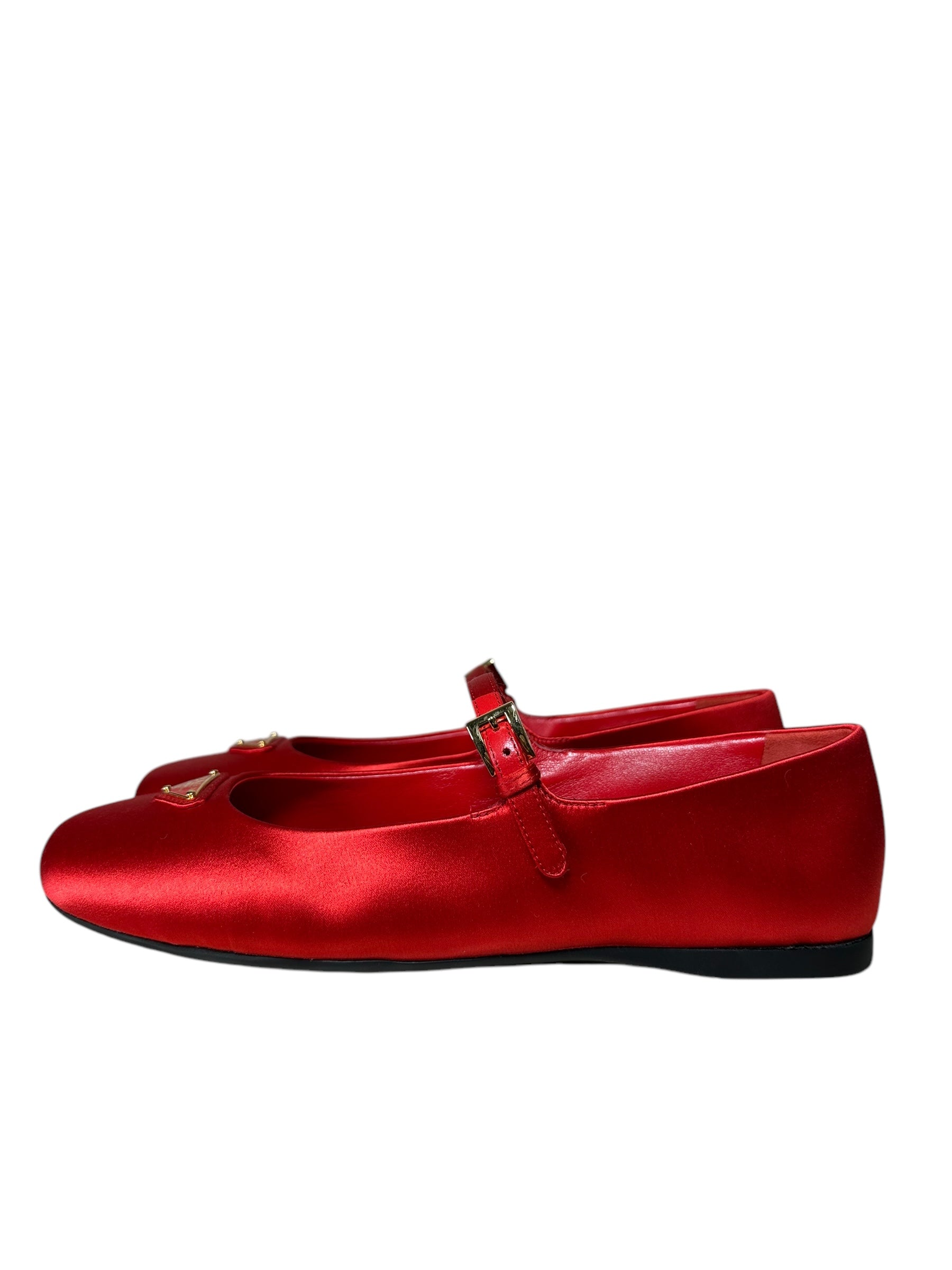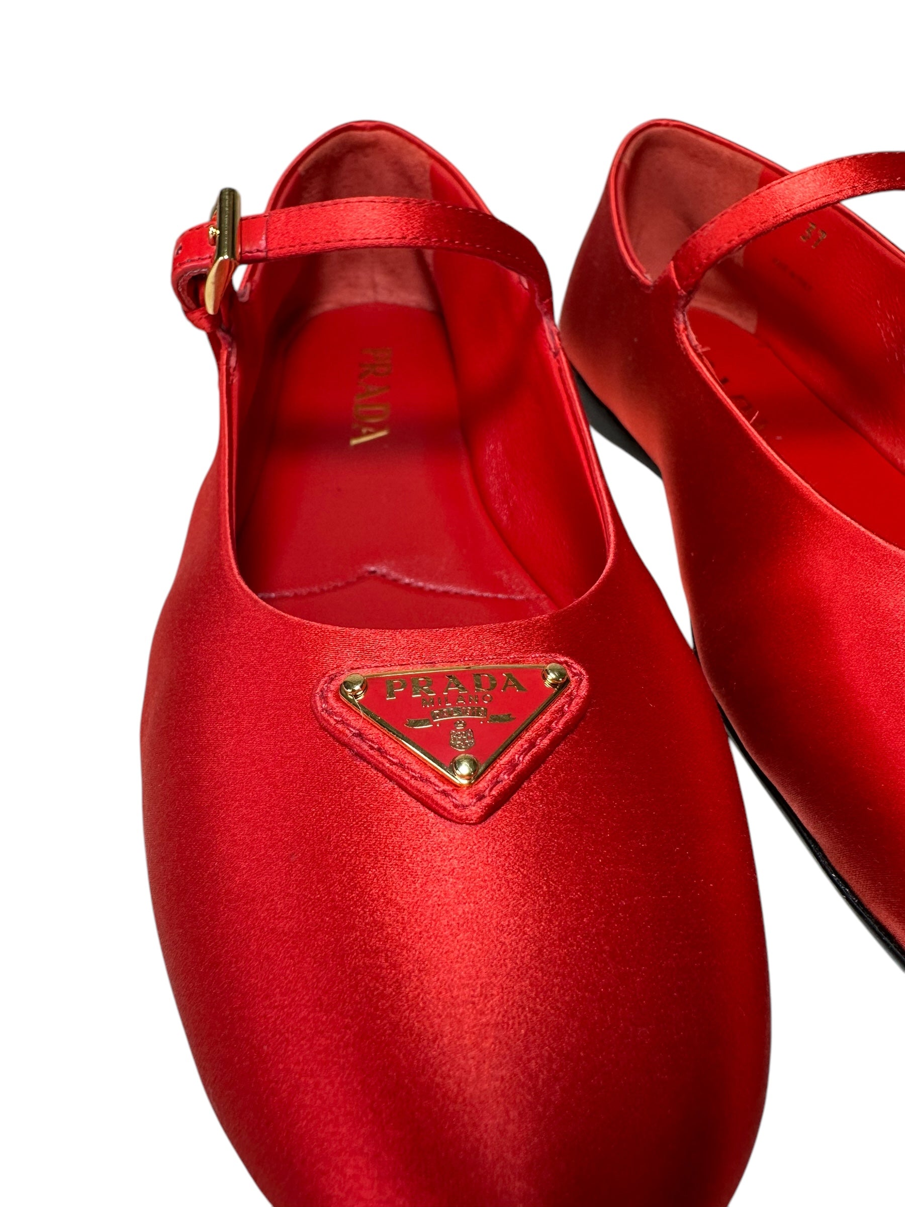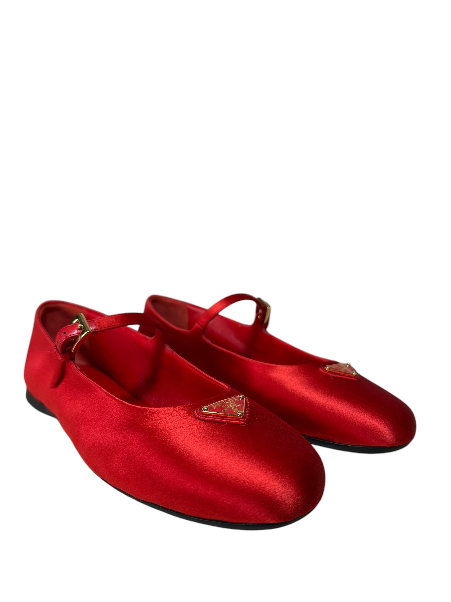 Eleganti e raffinate, queste ballerine Prada reinterpretano il classico modello Mary Jane con un tocco contemporaneo. Realizzate in raso lucido rosso brillante, si distinguono per la loro texture liscia e setosa, che dona luminosità ed eleganza ad ogni passo.