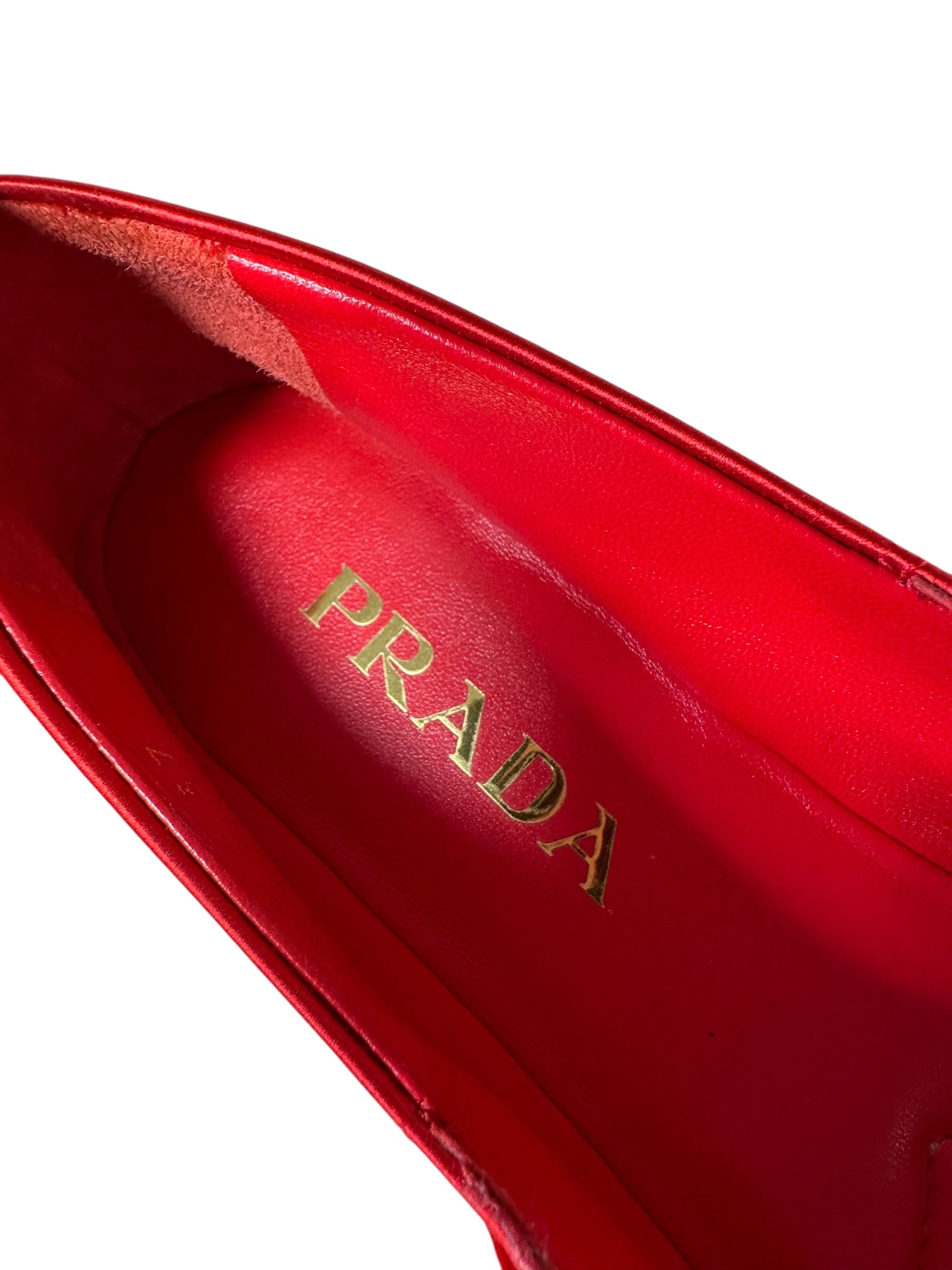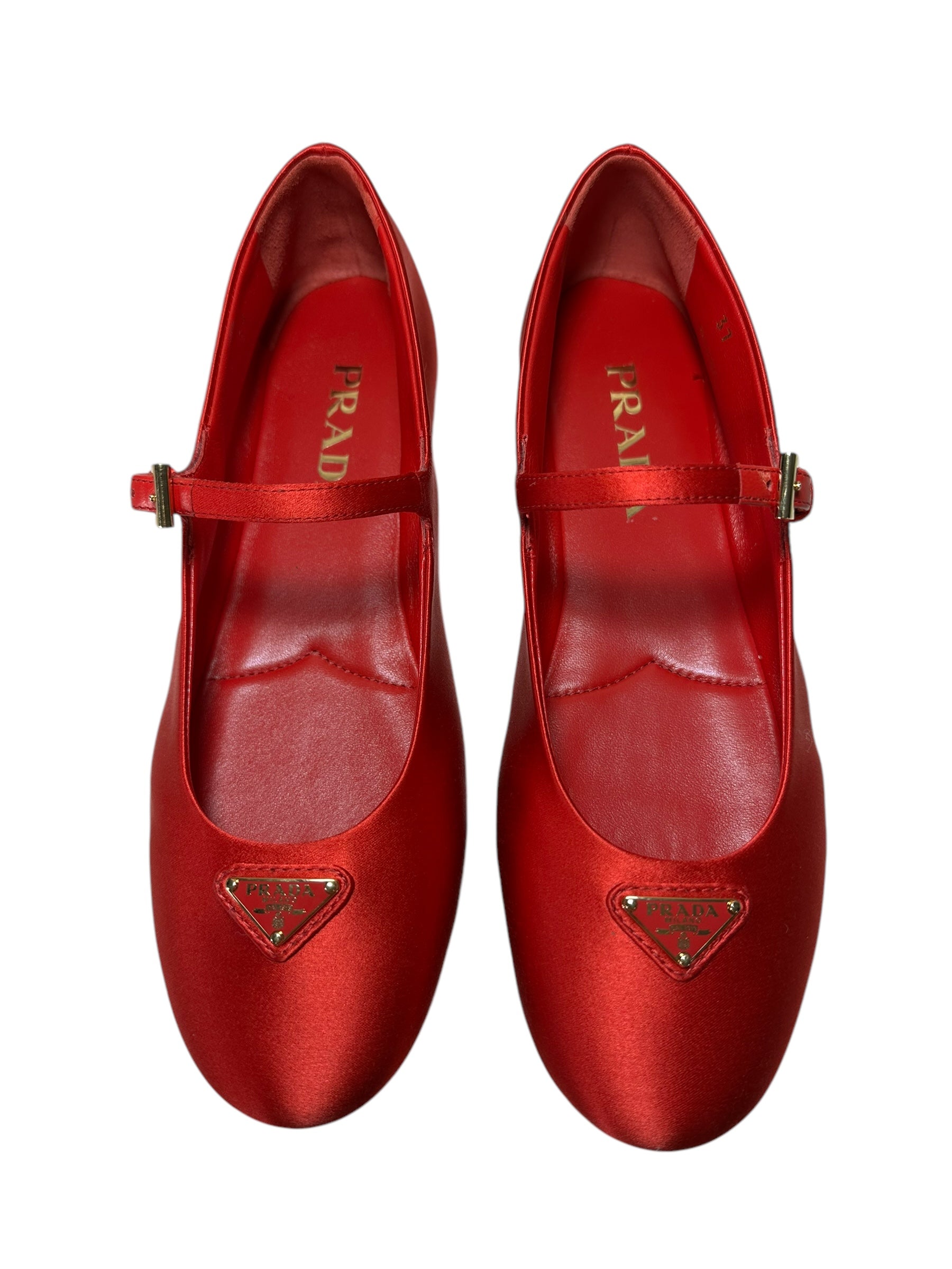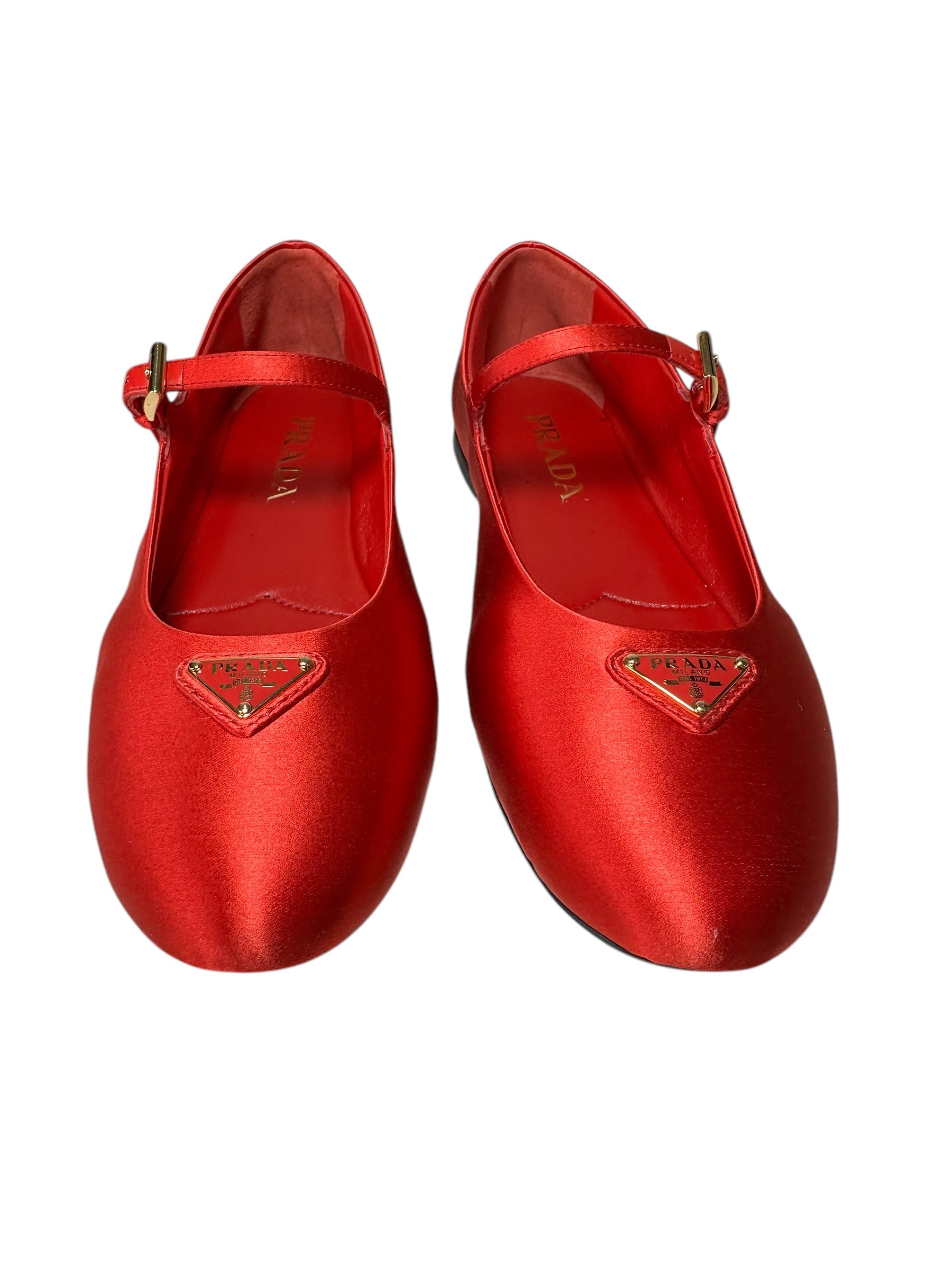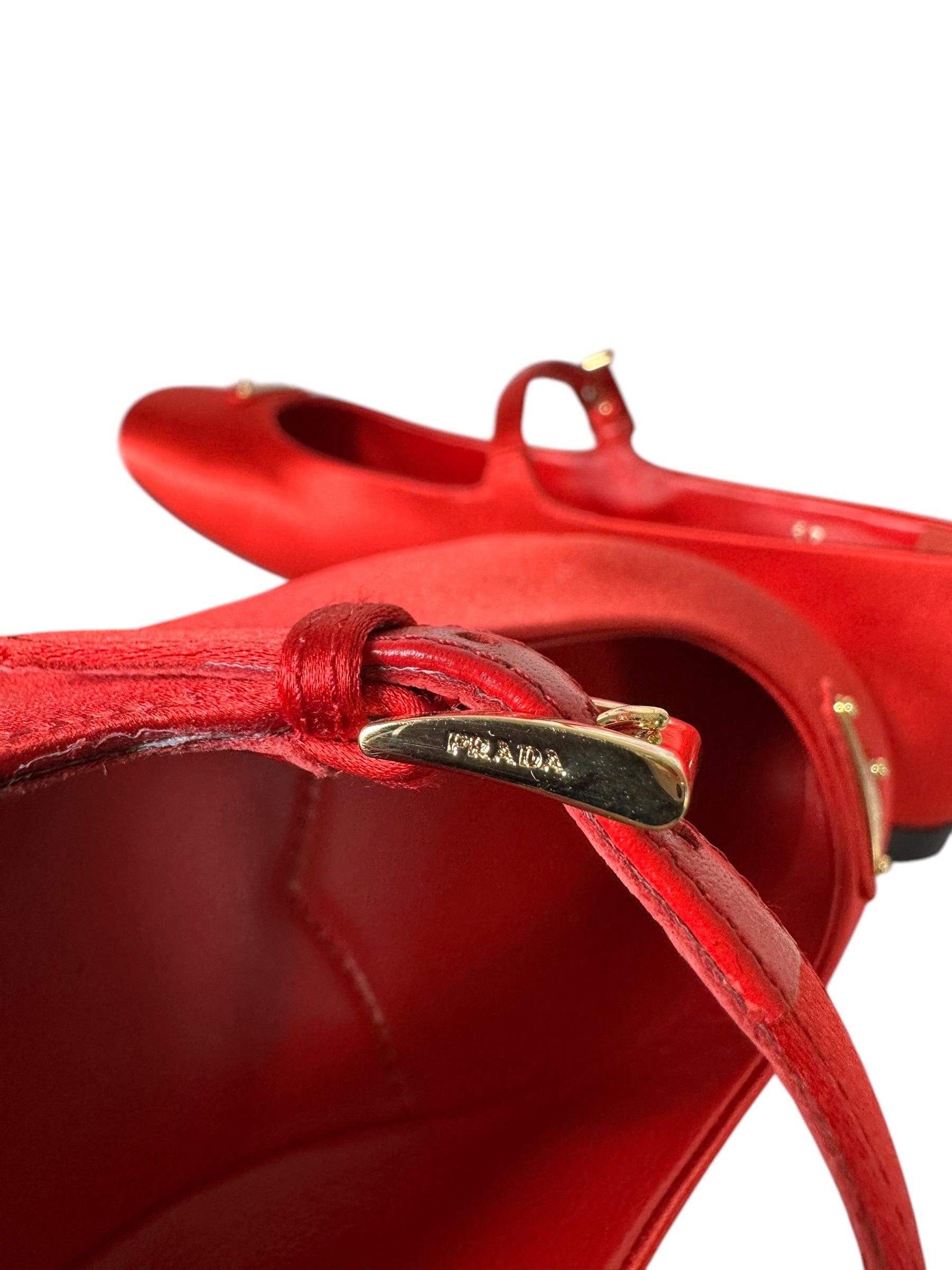 Eleganti e raffinate, queste ballerine Prada reinterpretano il classico modello Mary Jane con un tocco contemporaneo. Realizzate in raso lucido rosso brillante, si distinguono per la loro texture liscia e setosa, che dona luminosità ed eleganza ad ogni passo.