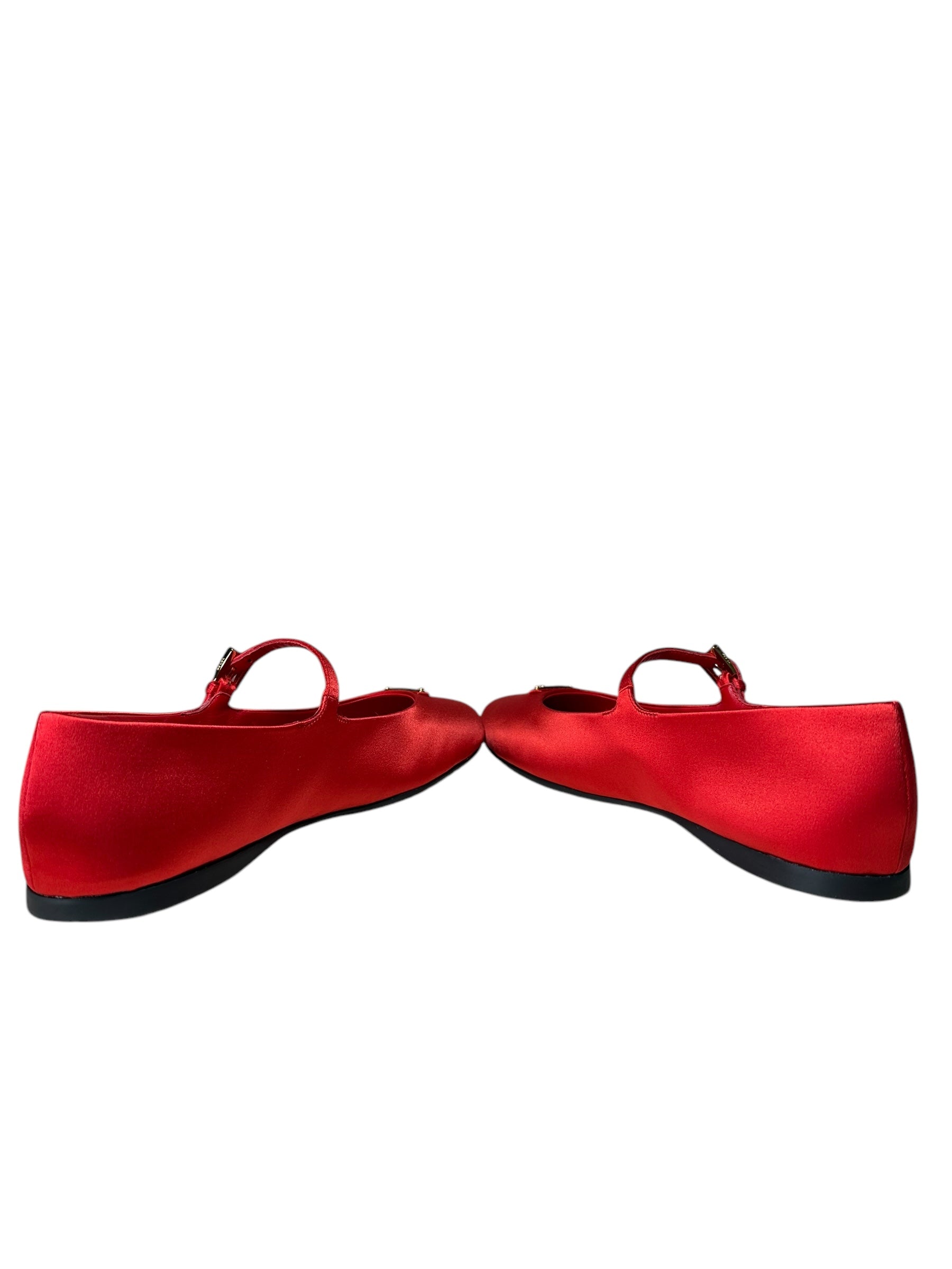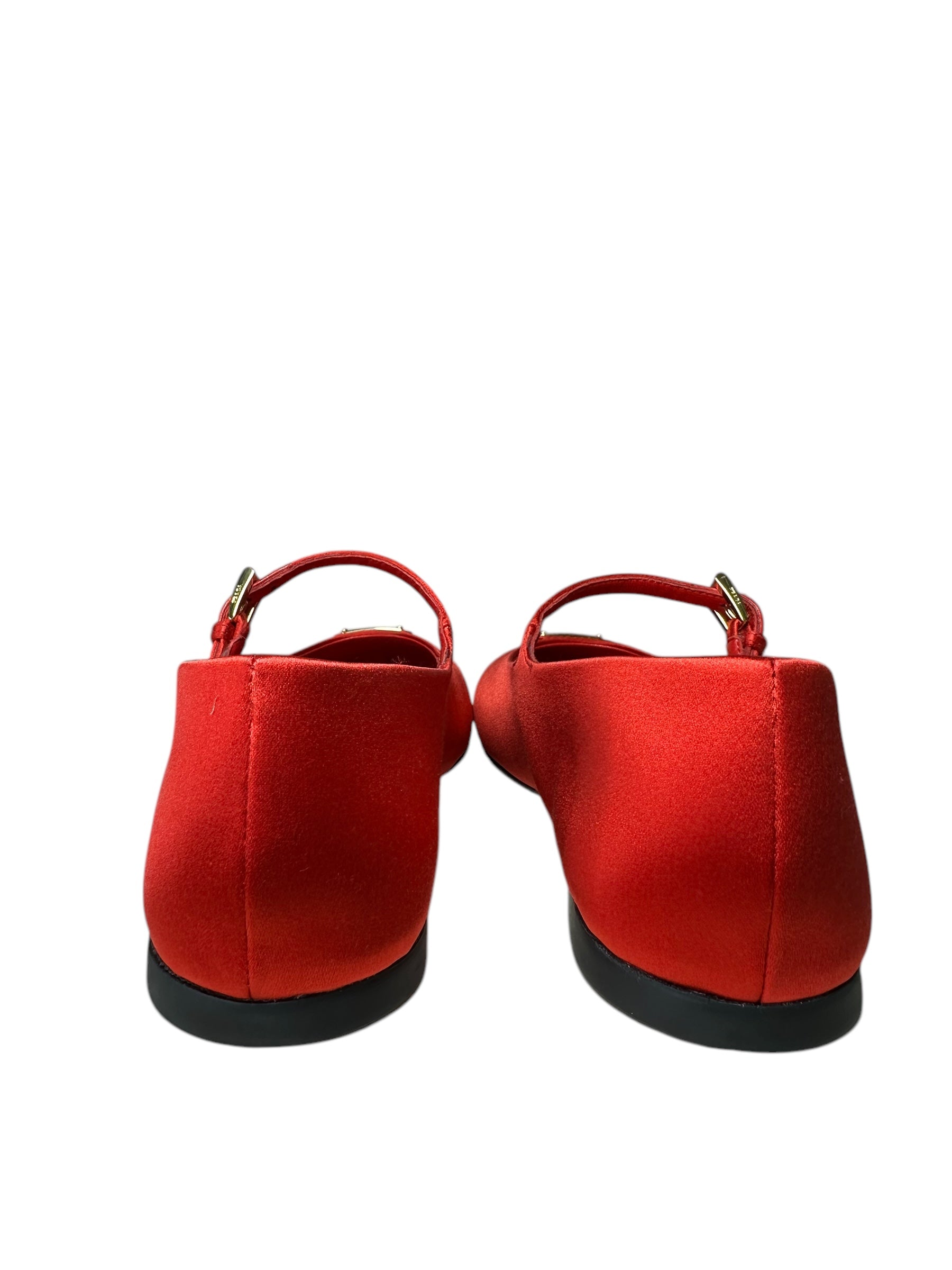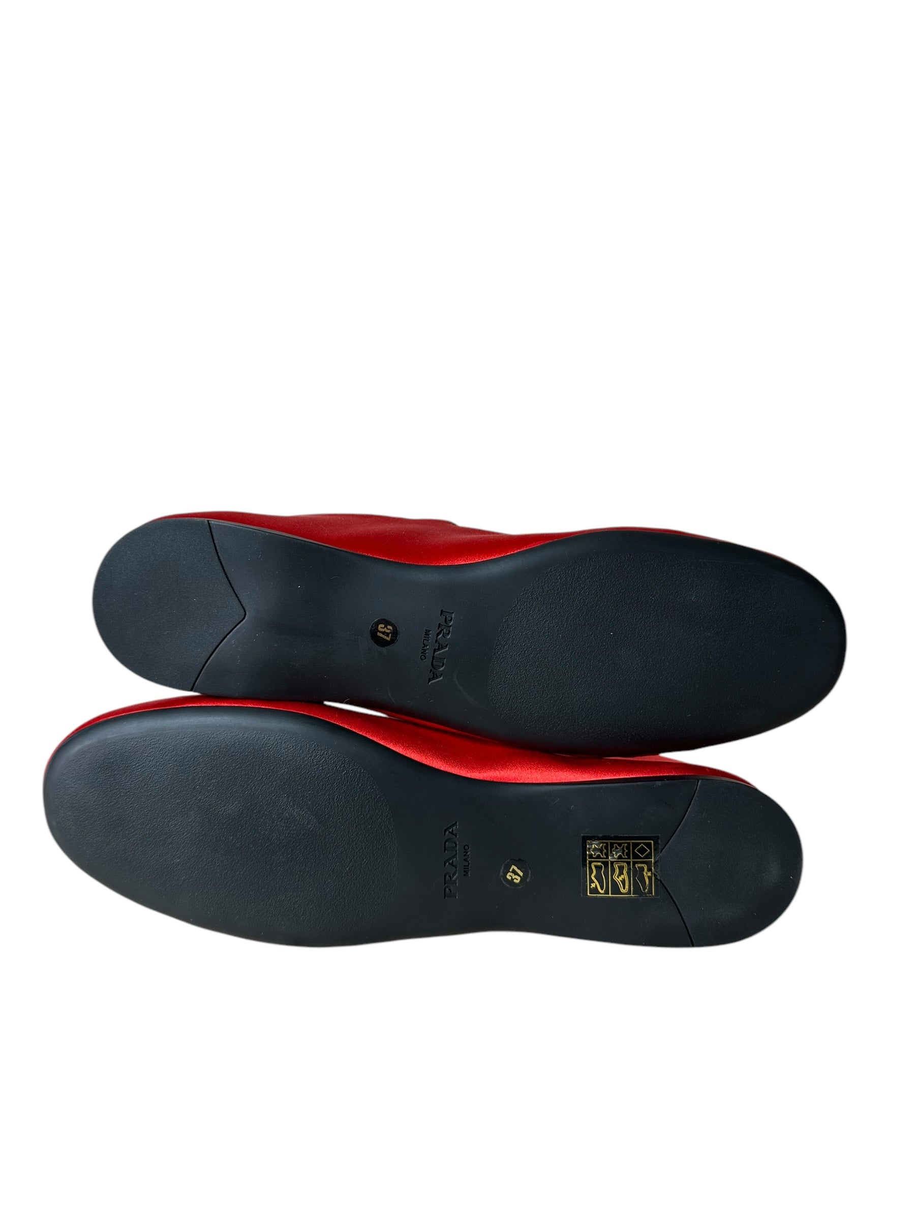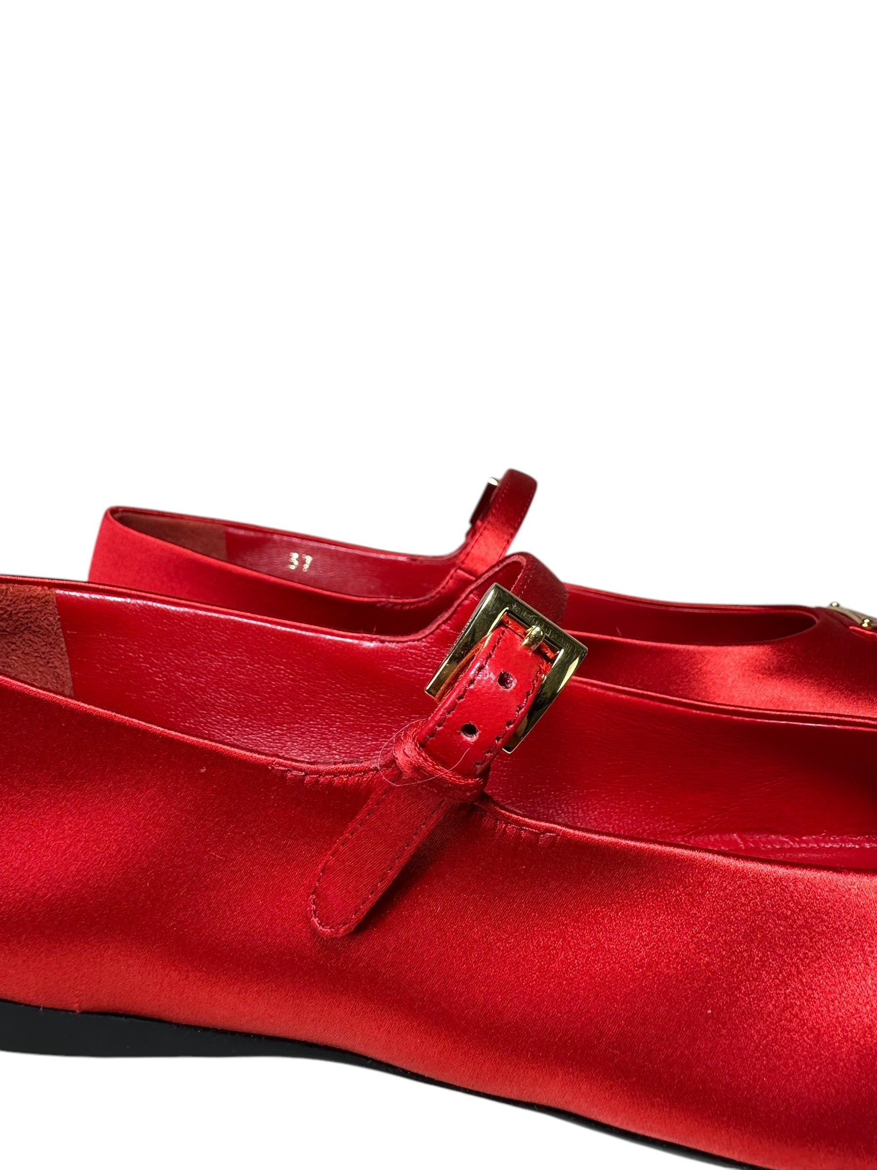 Eleganti e raffinate, queste ballerine Prada reinterpretano il classico modello Mary Jane con un tocco contemporaneo. Realizzate in raso lucido rosso brillante, si distinguono per la loro texture liscia e setosa, che dona luminosità ed eleganza ad ogni passo.