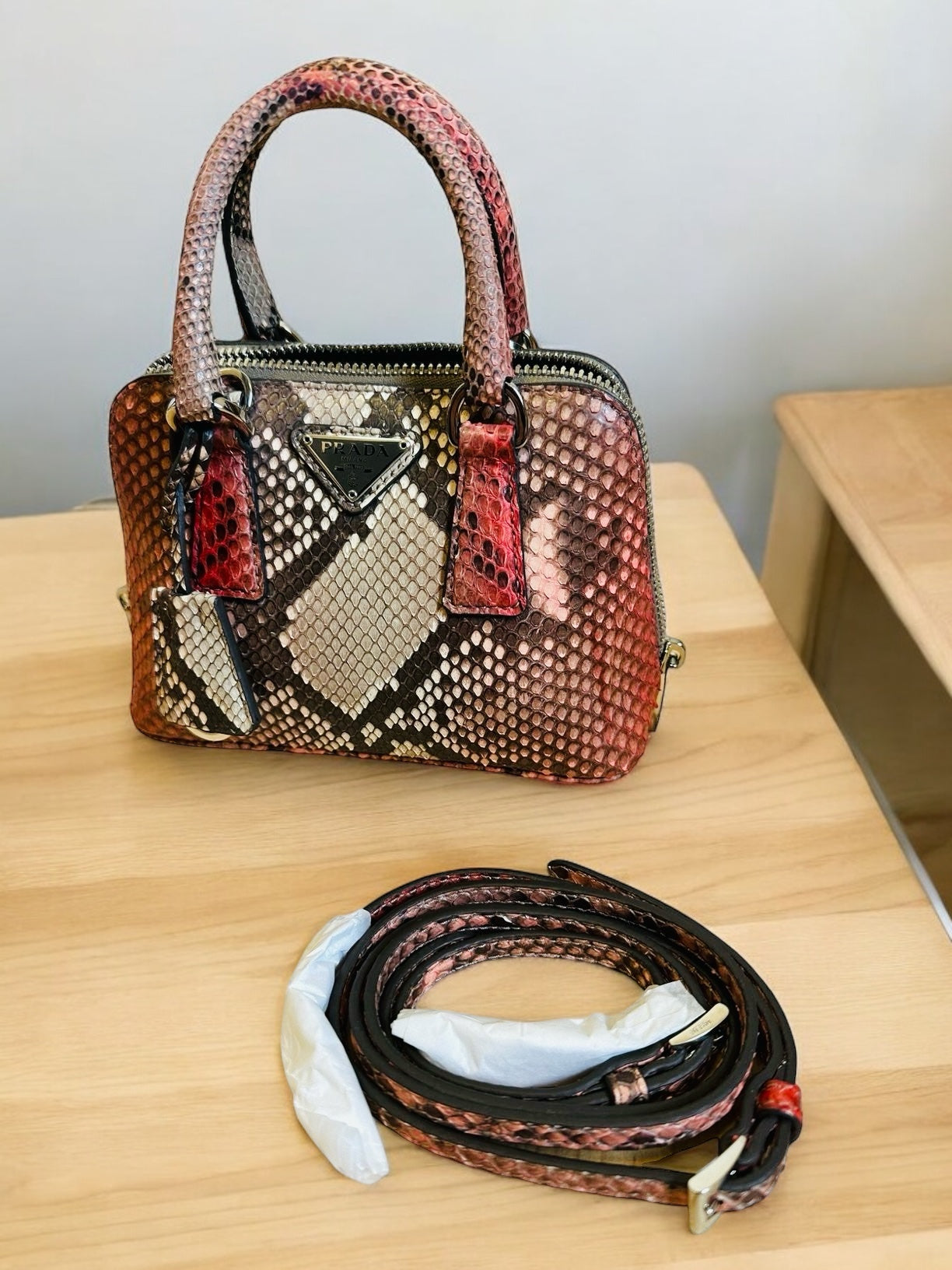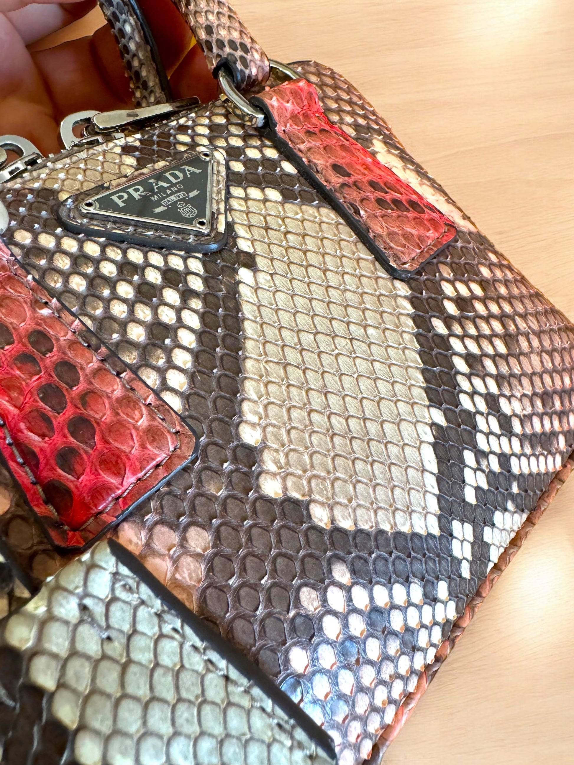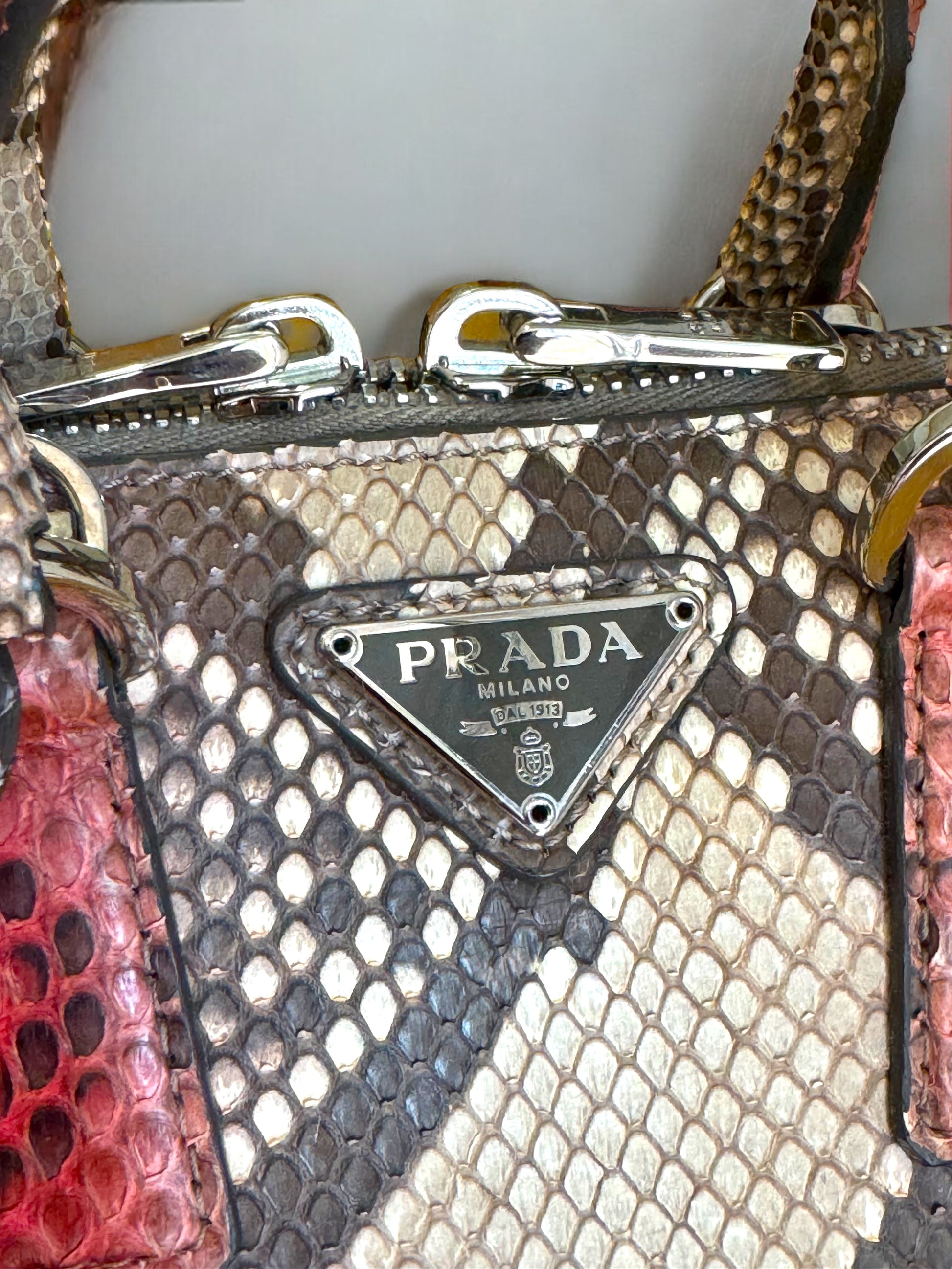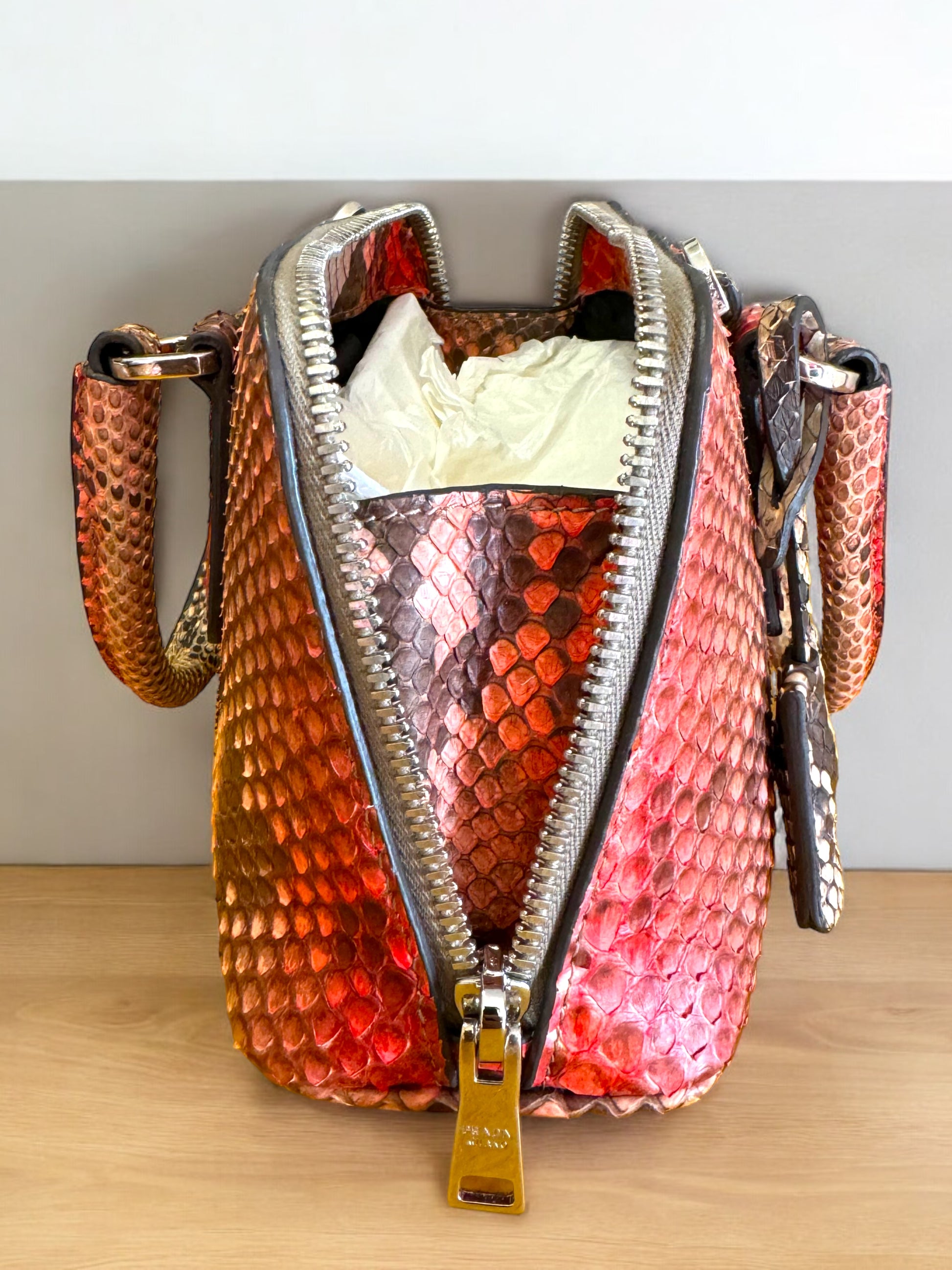 Prada borsa La Promenade in rettile rosso con sfumature rosa e bianche, manici rigidi e hardware in metallo argentato. Chiusura a doppia zip e logo a triangolo sul davanti, dispone di tracolla in rettile rimovibile.