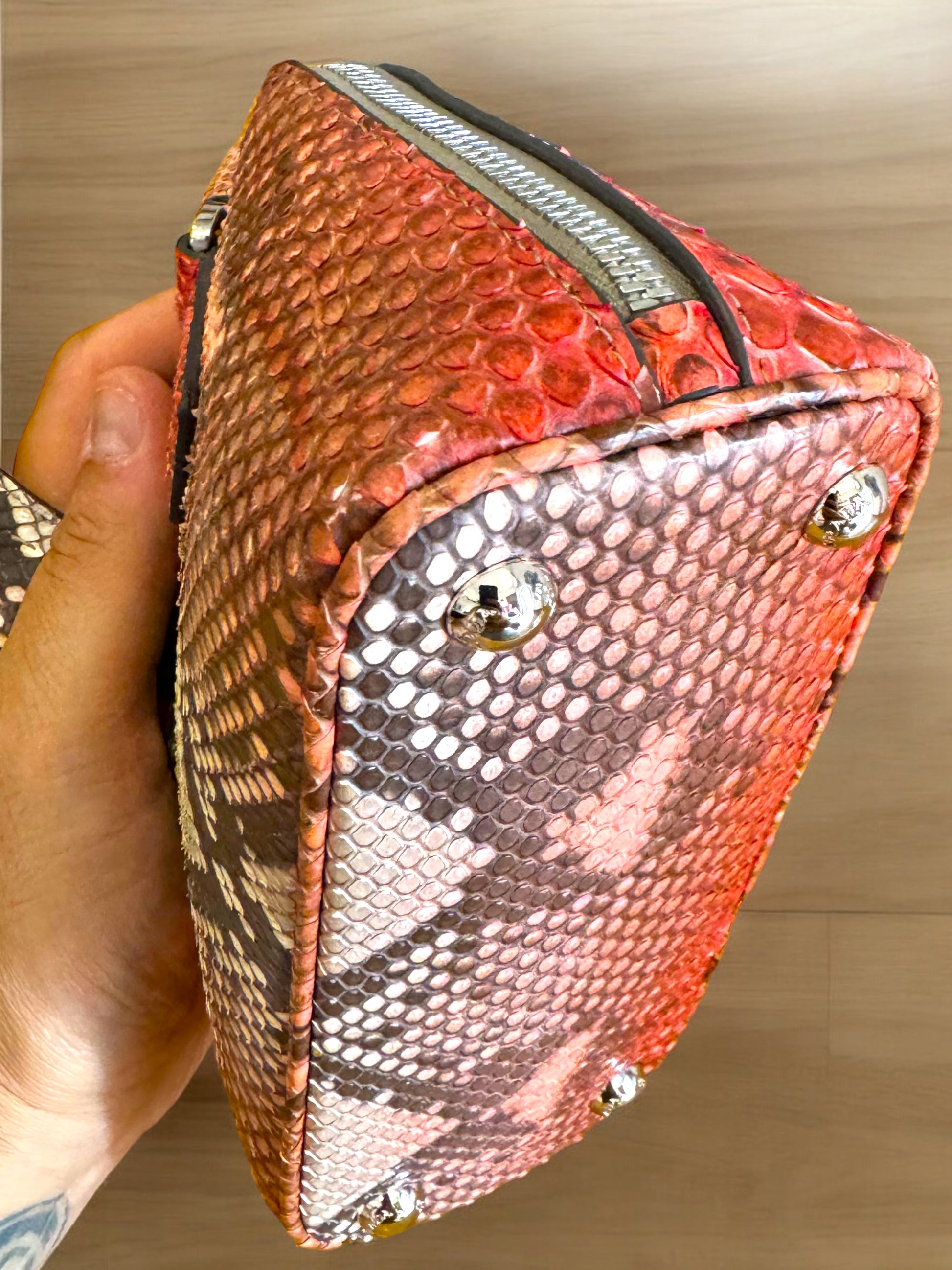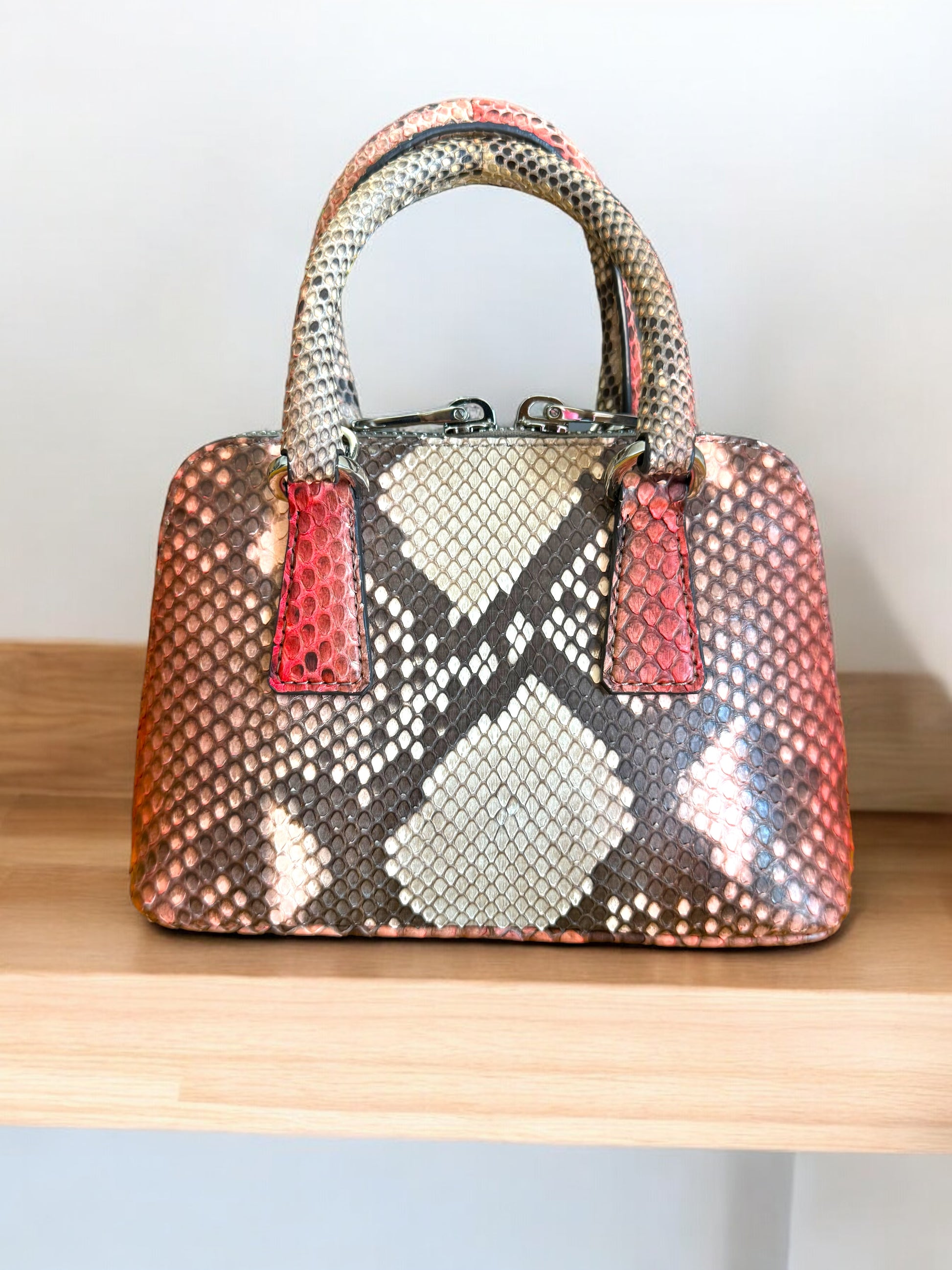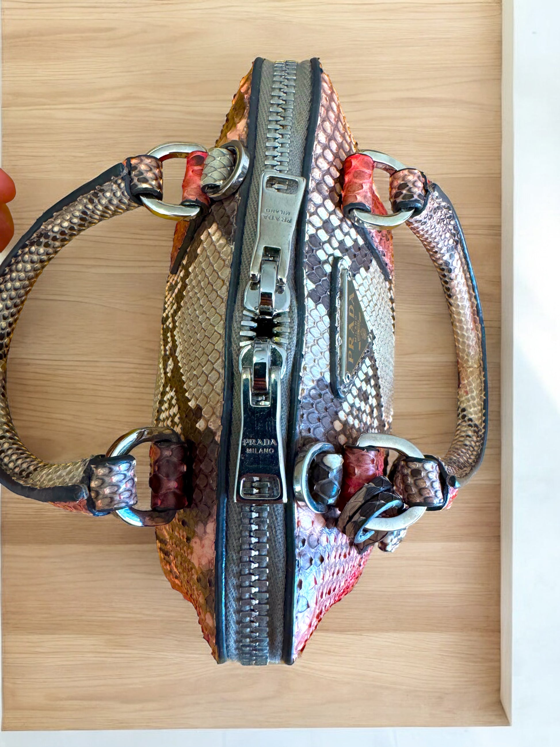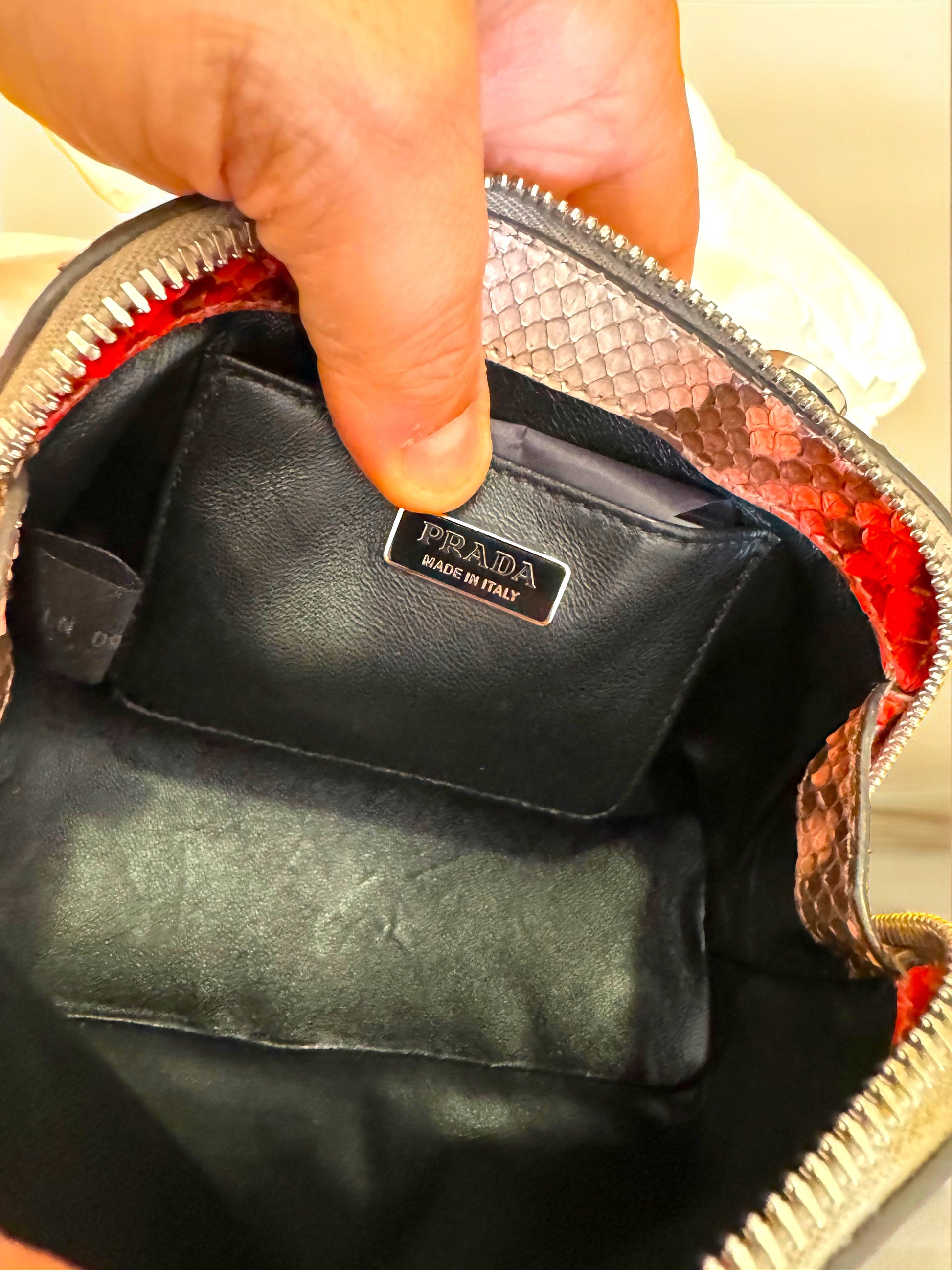 Prada borsa La Promenade in rettile rosso con sfumature rosa e bianche, manici rigidi e hardware in metallo argentato. Chiusura a doppia zip e logo a triangolo sul davanti, dispone di tracolla in rettile rimovibile.