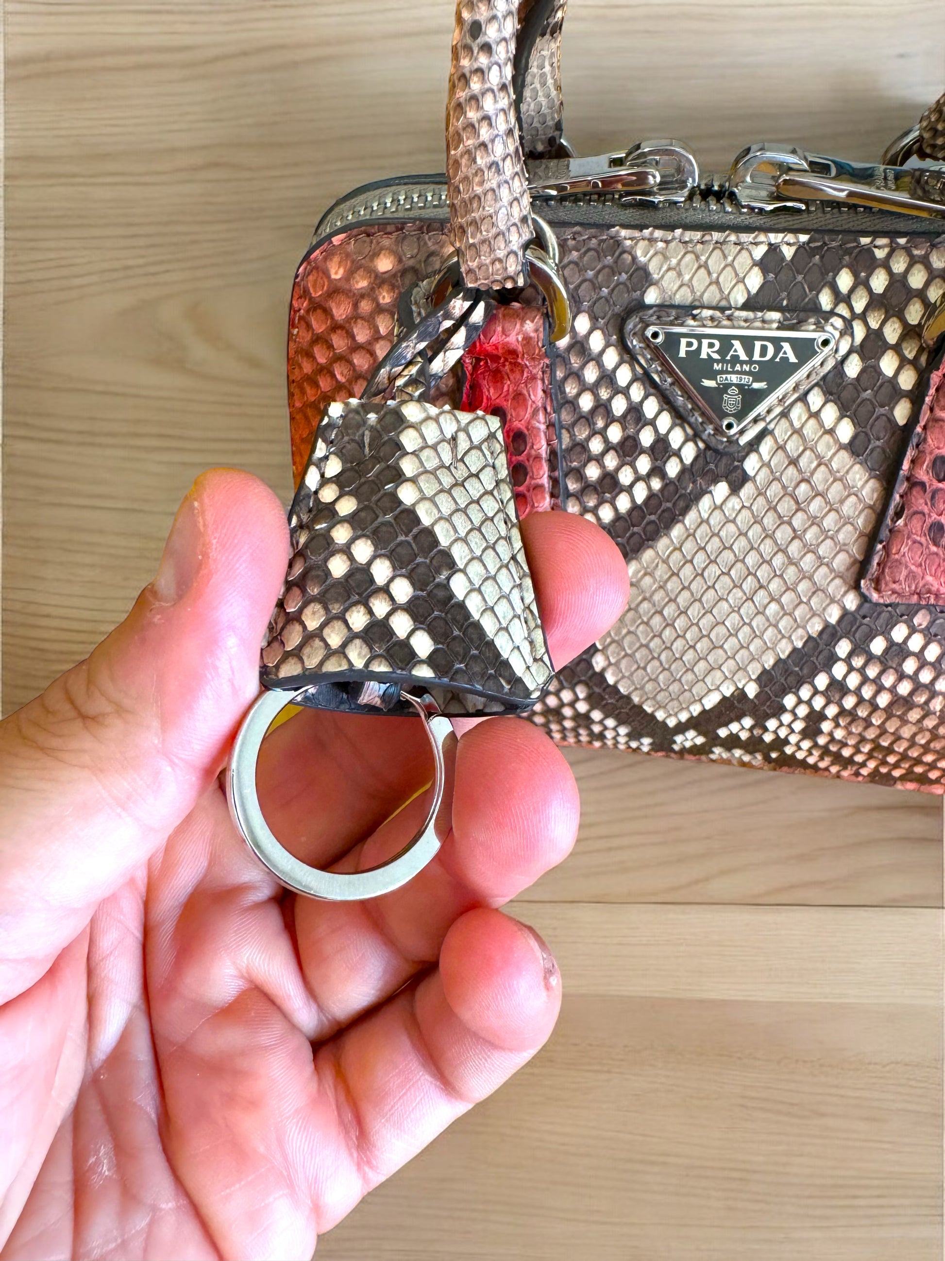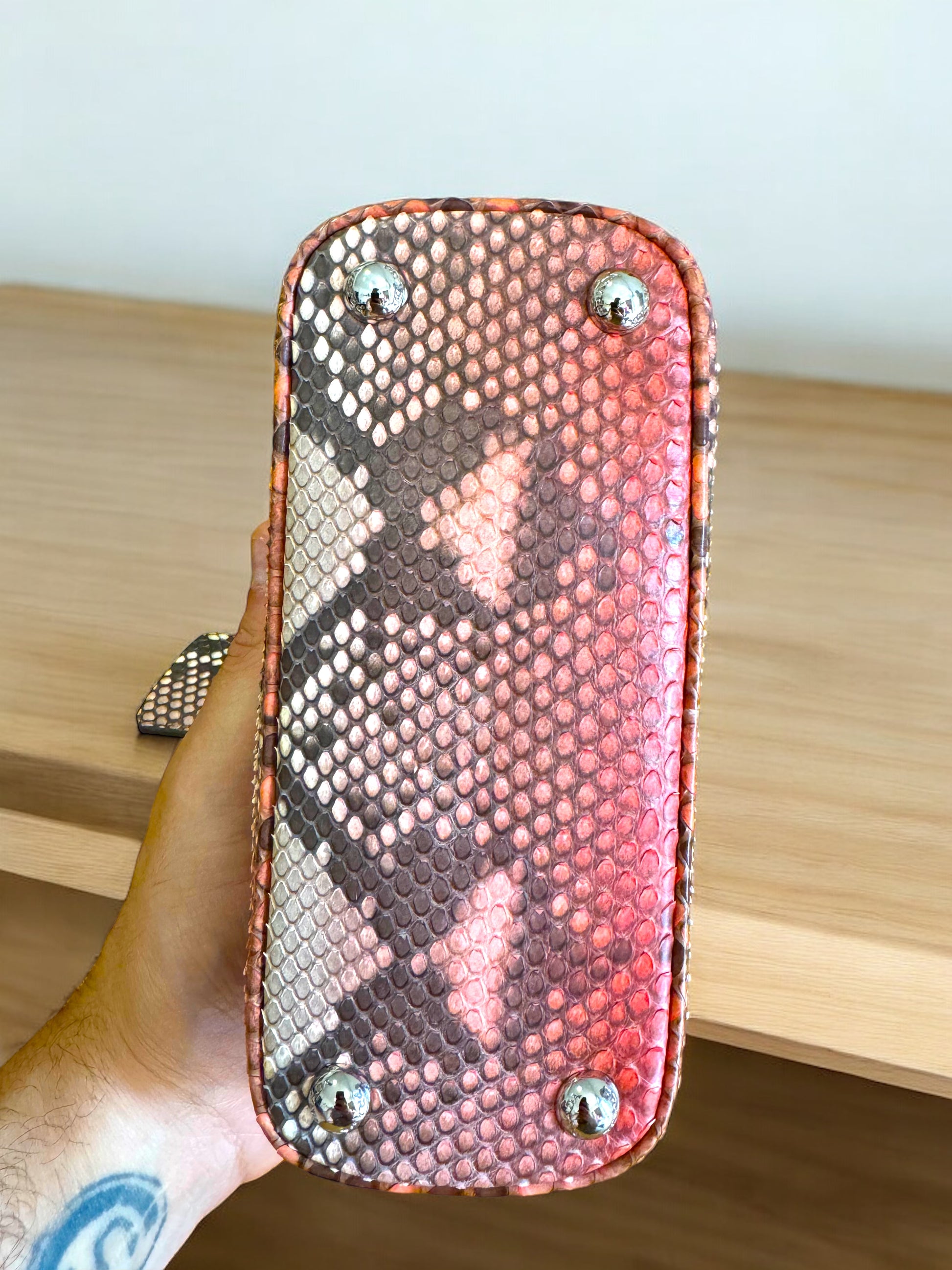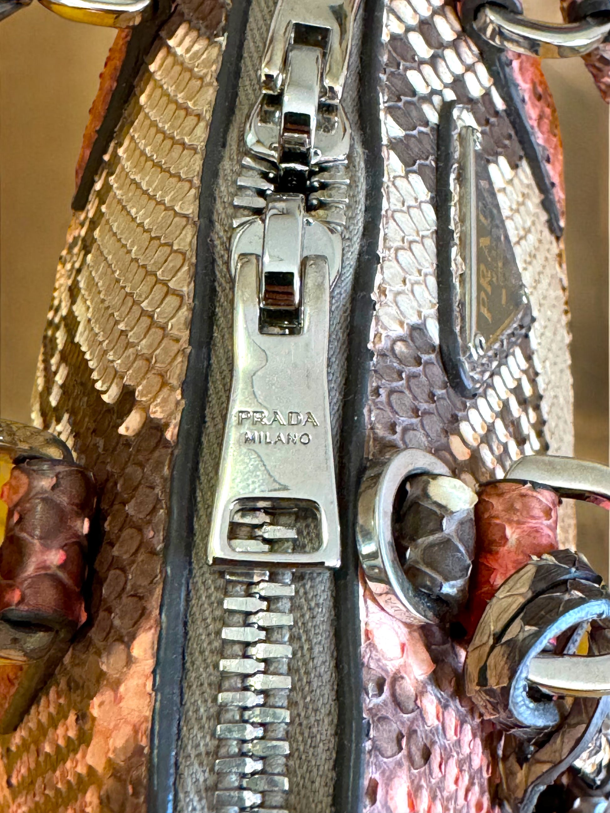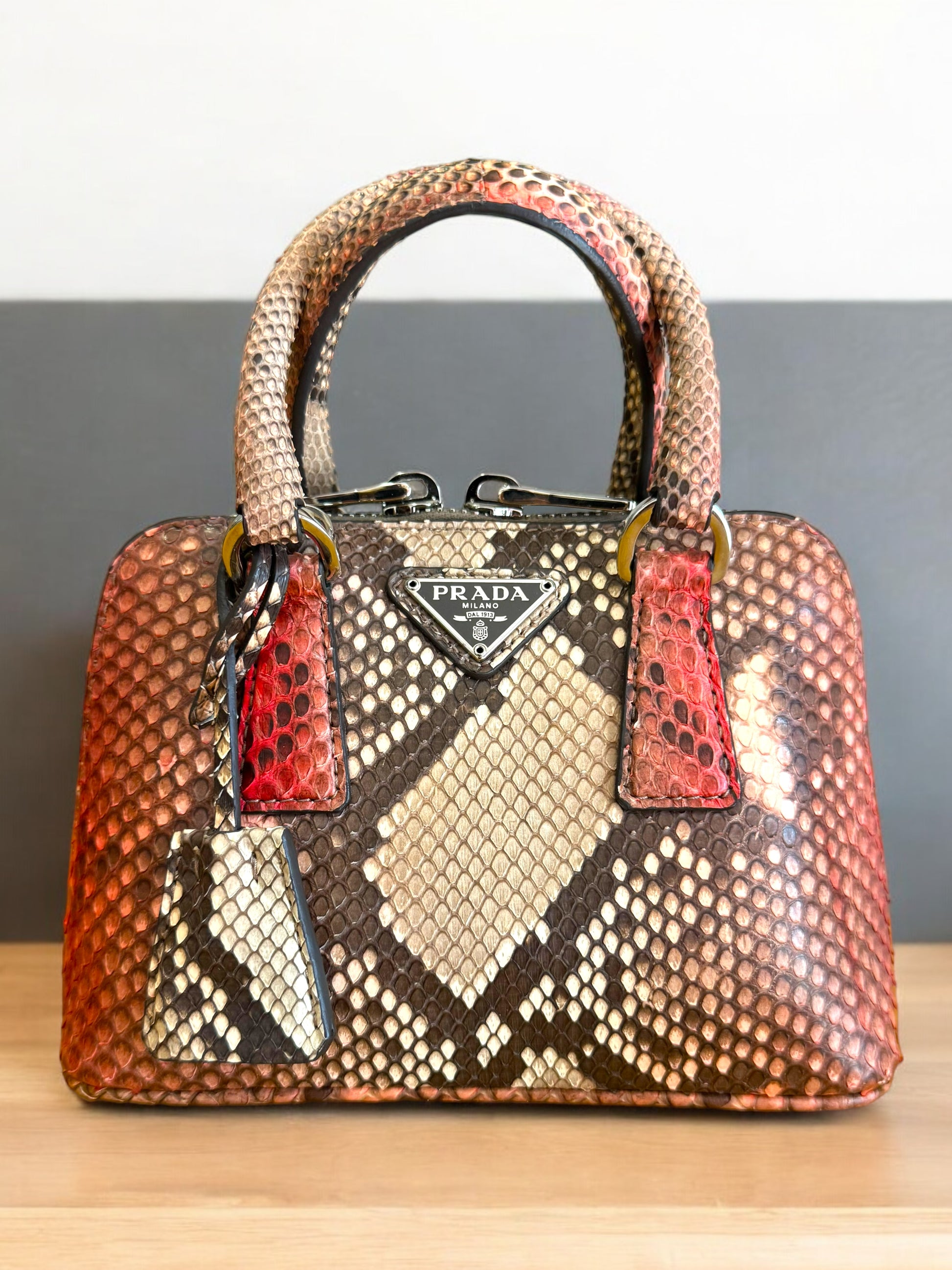 Prada borsa La Promenade in rettile rosso con sfumature rosa e bianche, manici rigidi e hardware in metallo argentato. Chiusura a doppia zip e logo a triangolo sul davanti, dispone di tracolla in rettile rimovibile.