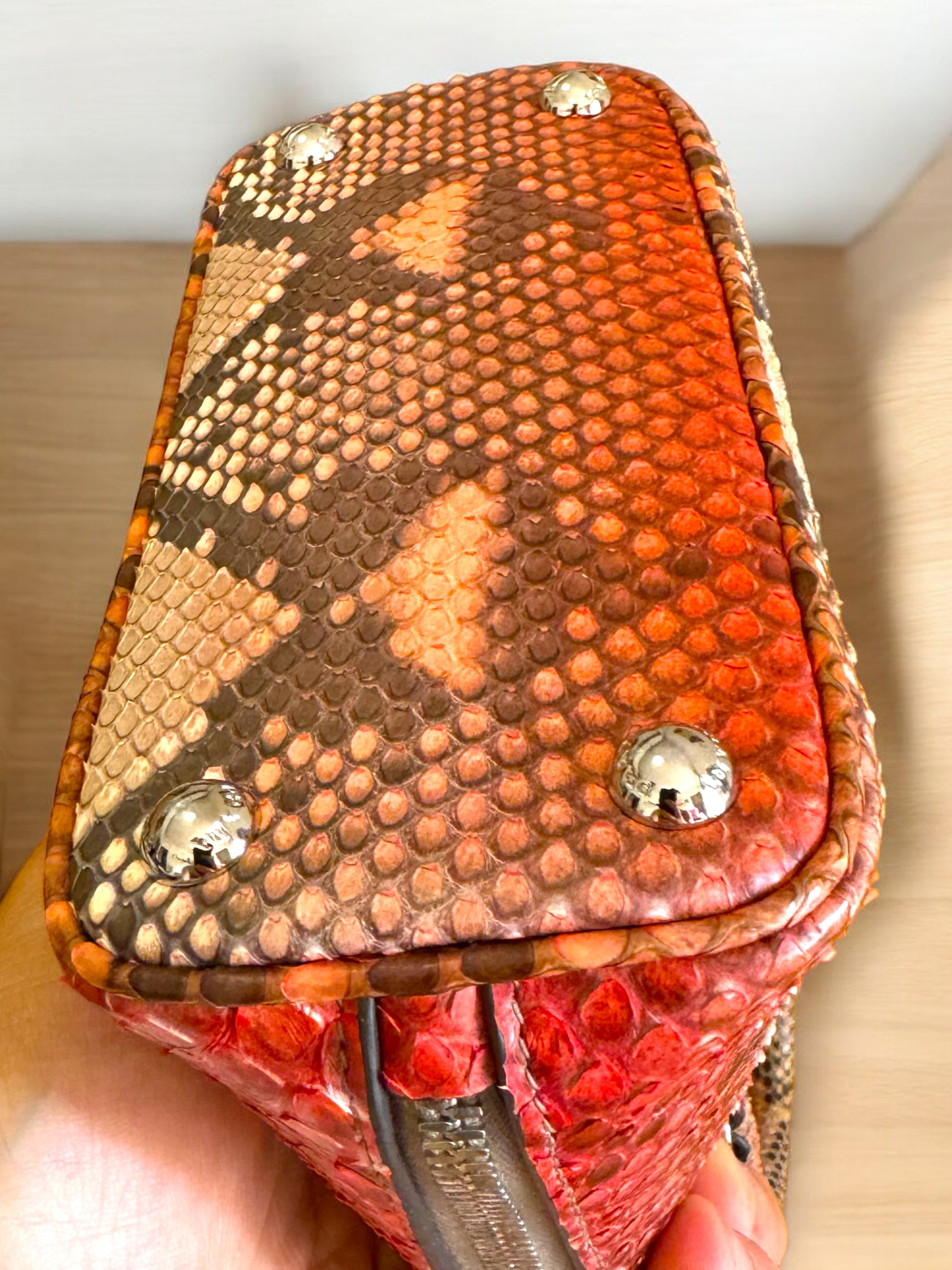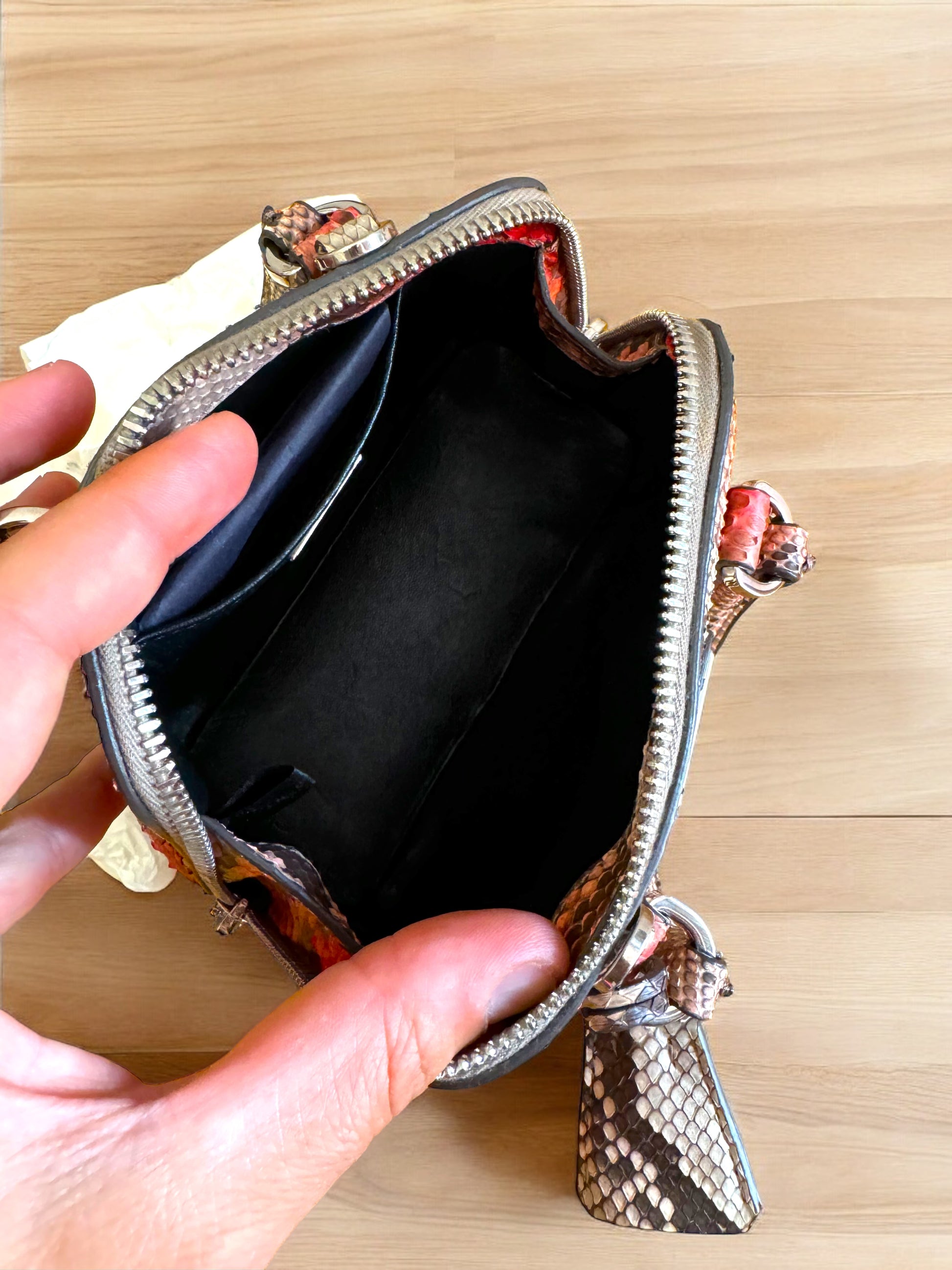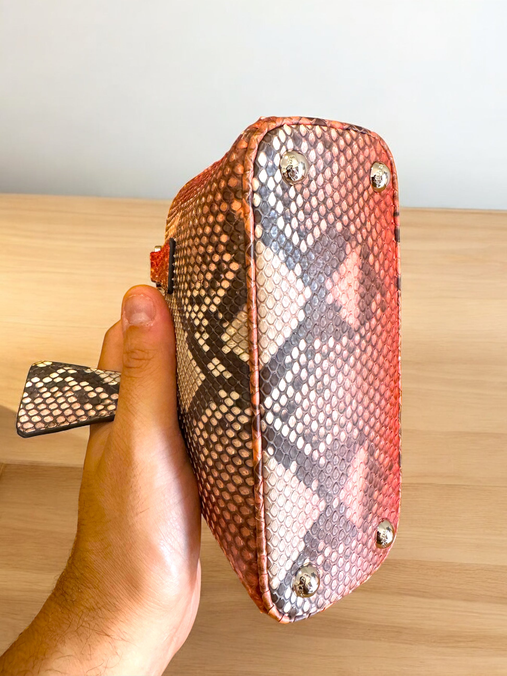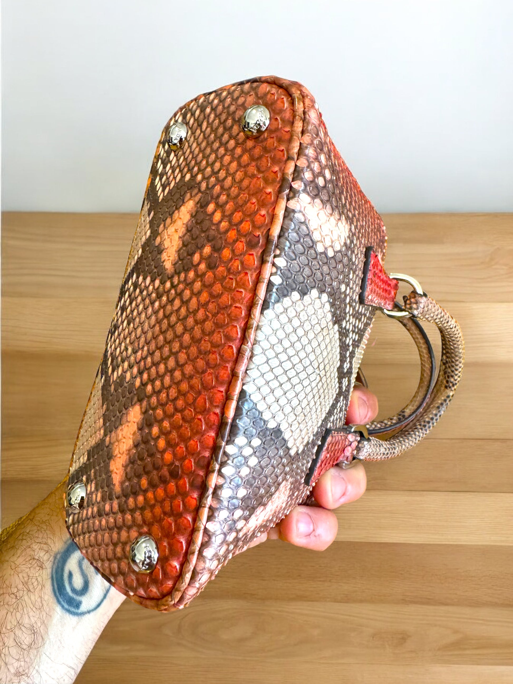 Prada borsa La Promenade in rettile rosso con sfumature rosa e bianche, manici rigidi e hardware in metallo argentato. Chiusura a doppia zip e logo a triangolo sul davanti, dispone di tracolla in rettile rimovibile.