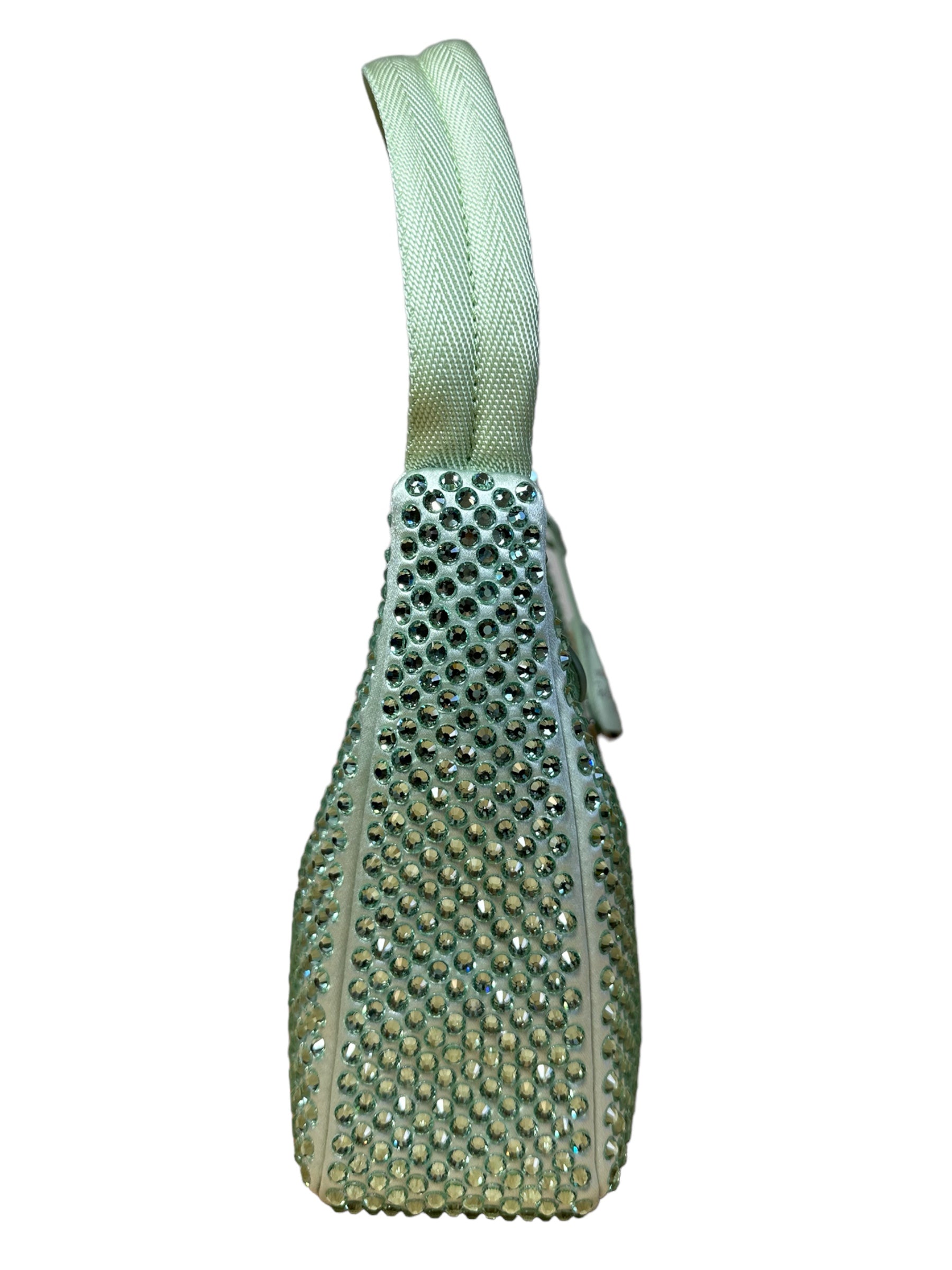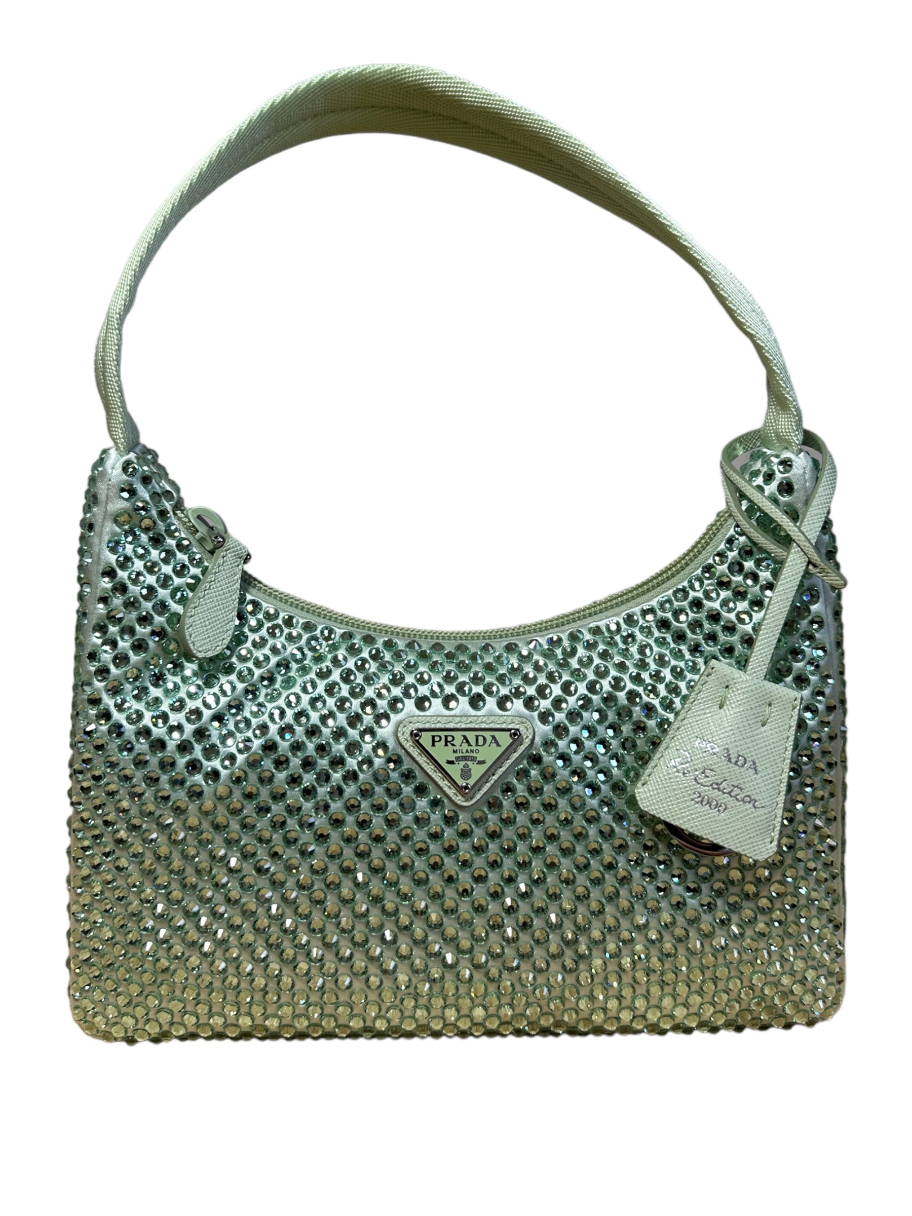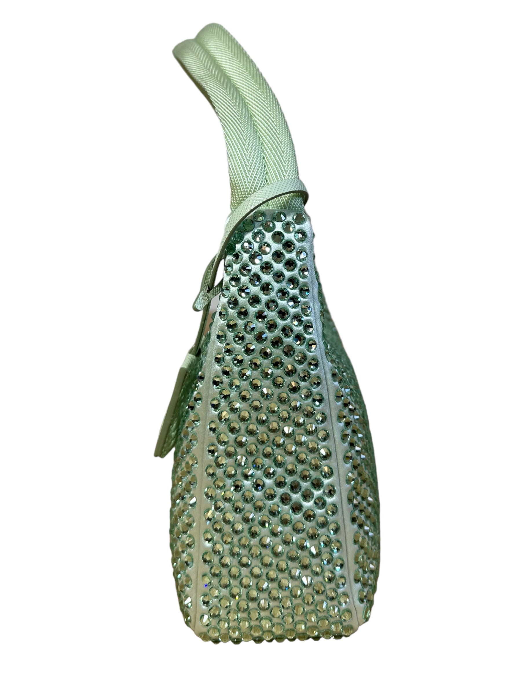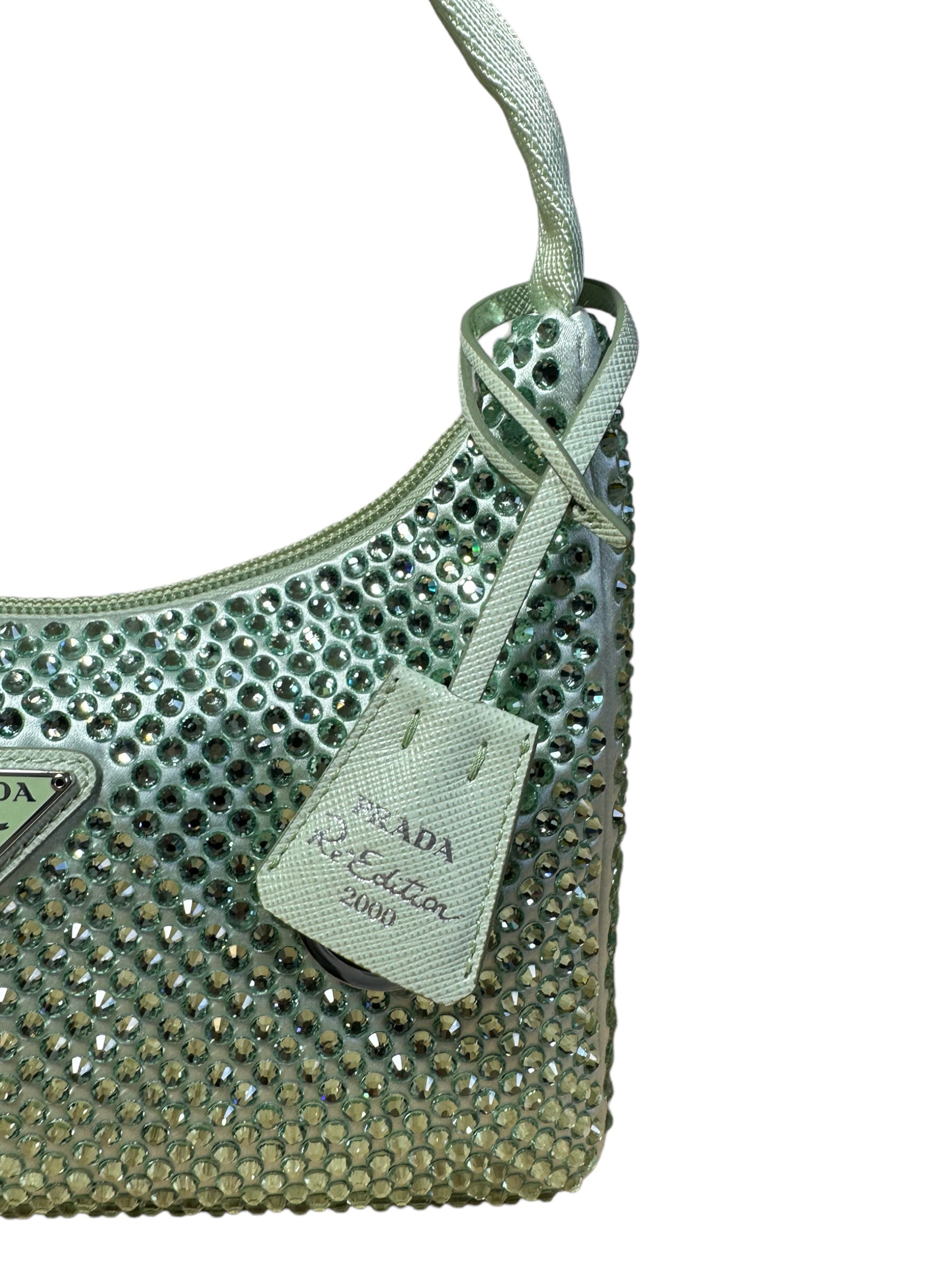 Prada borsa re edition crystal in nylon verde menta con applicazioni di strass, manico borbido in nylon e inserto porta chiavi in pelle. Viene spedita con dust bag.