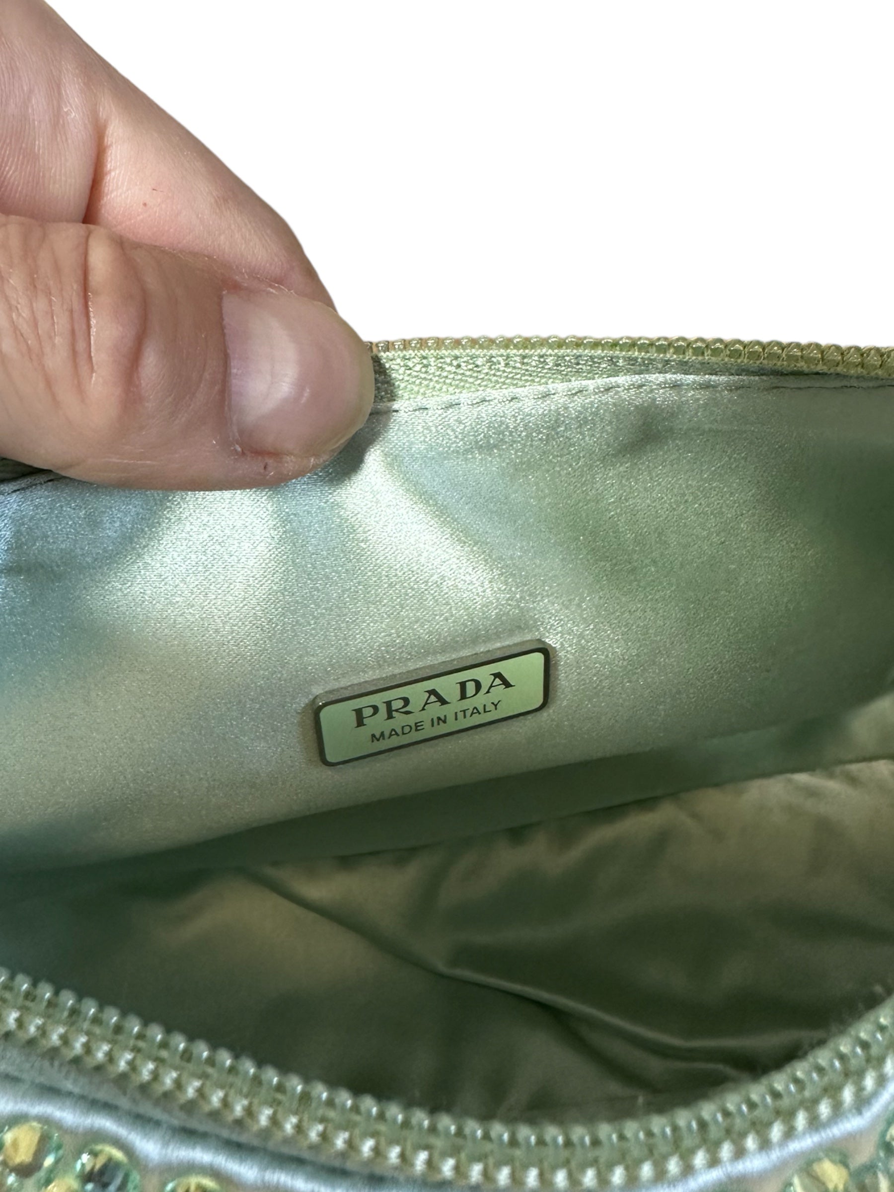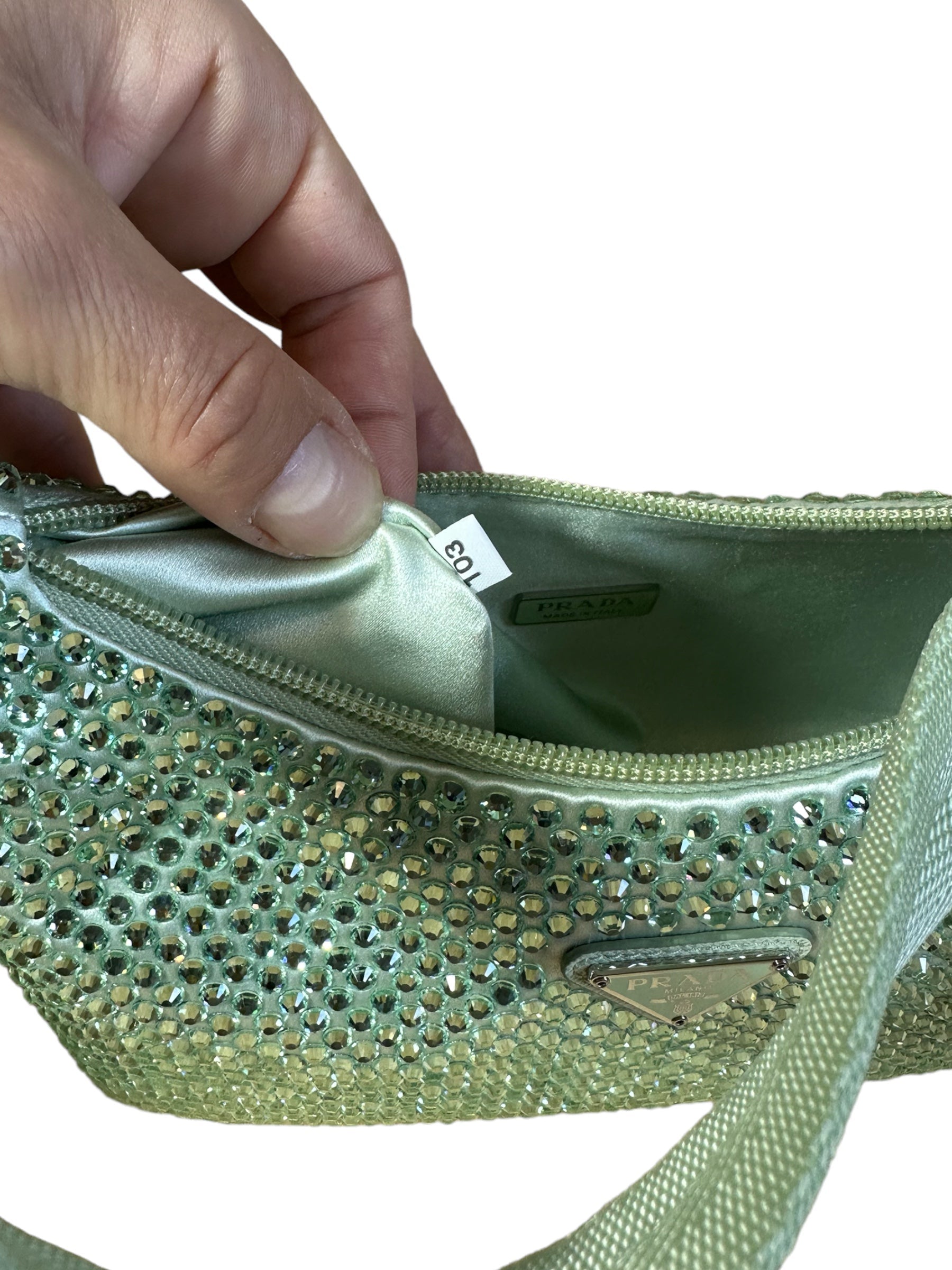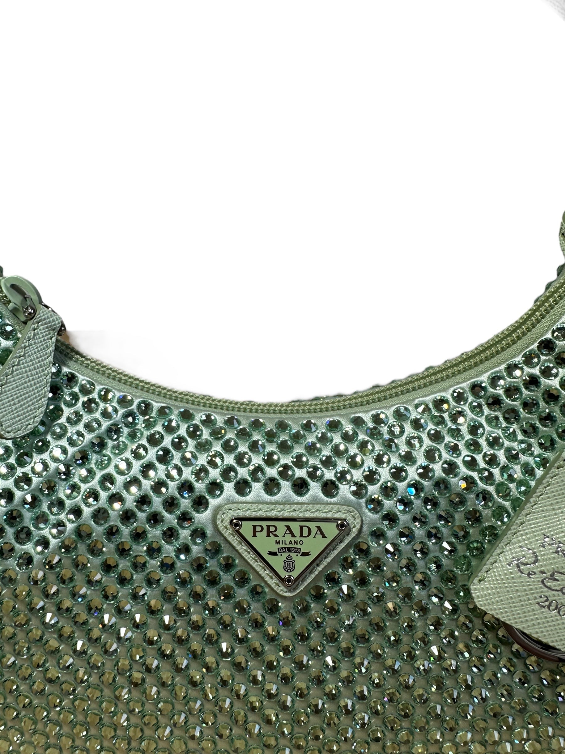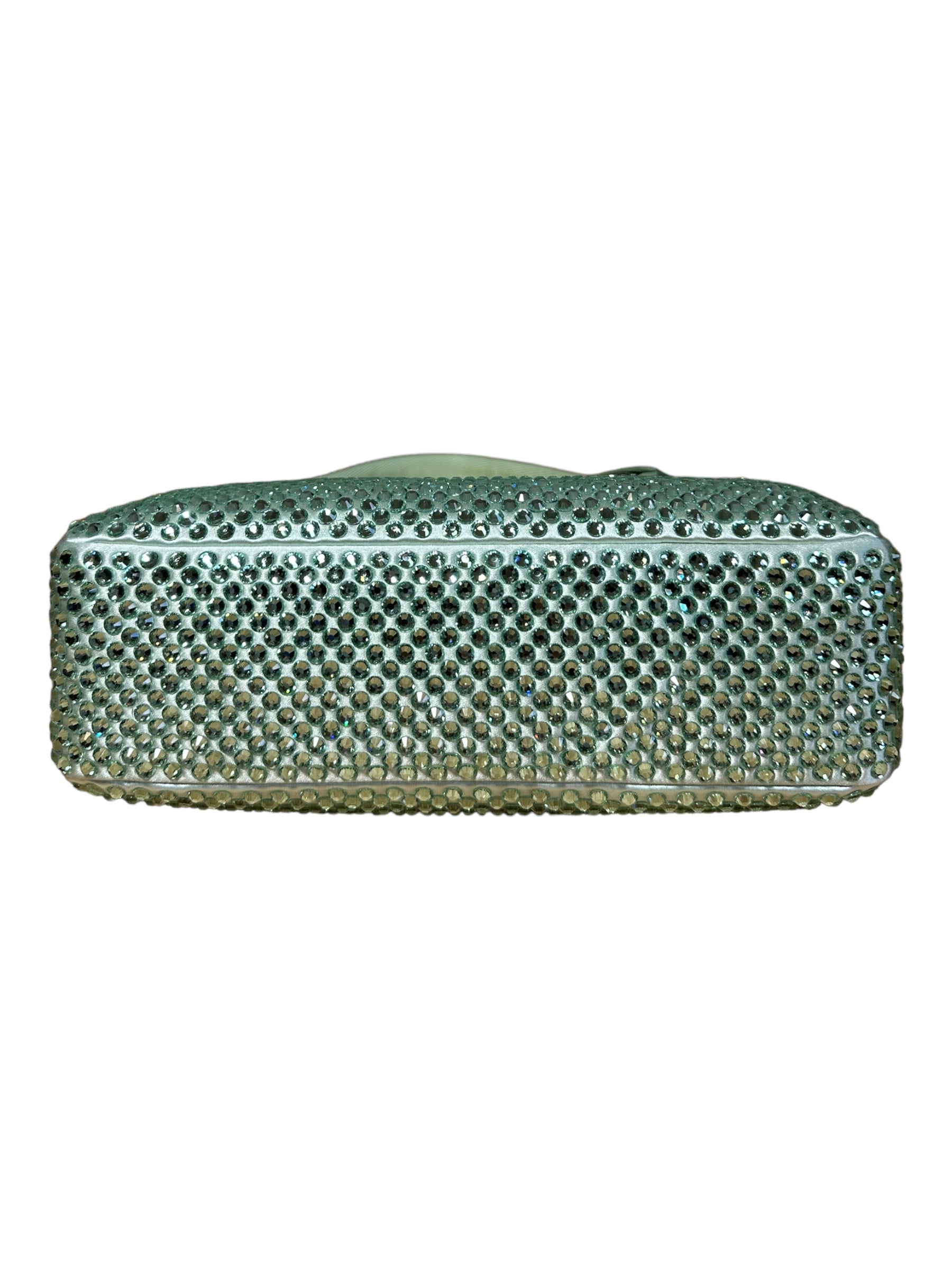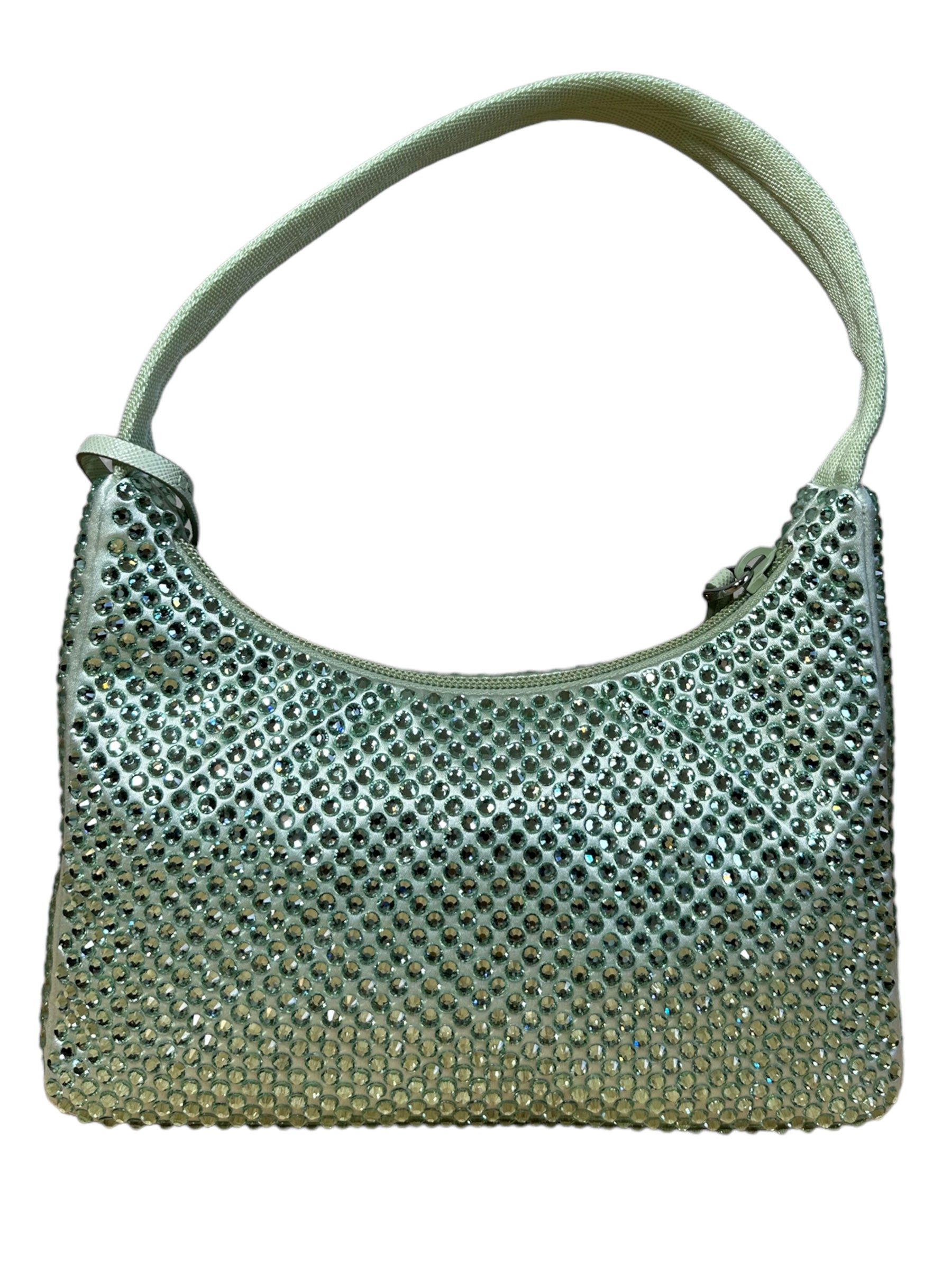 Prada borsa re edition crystal in nylon verde menta con applicazioni di strass, manico borbido in nylon e inserto porta chiavi in pelle. Viene spedita con dust bag.