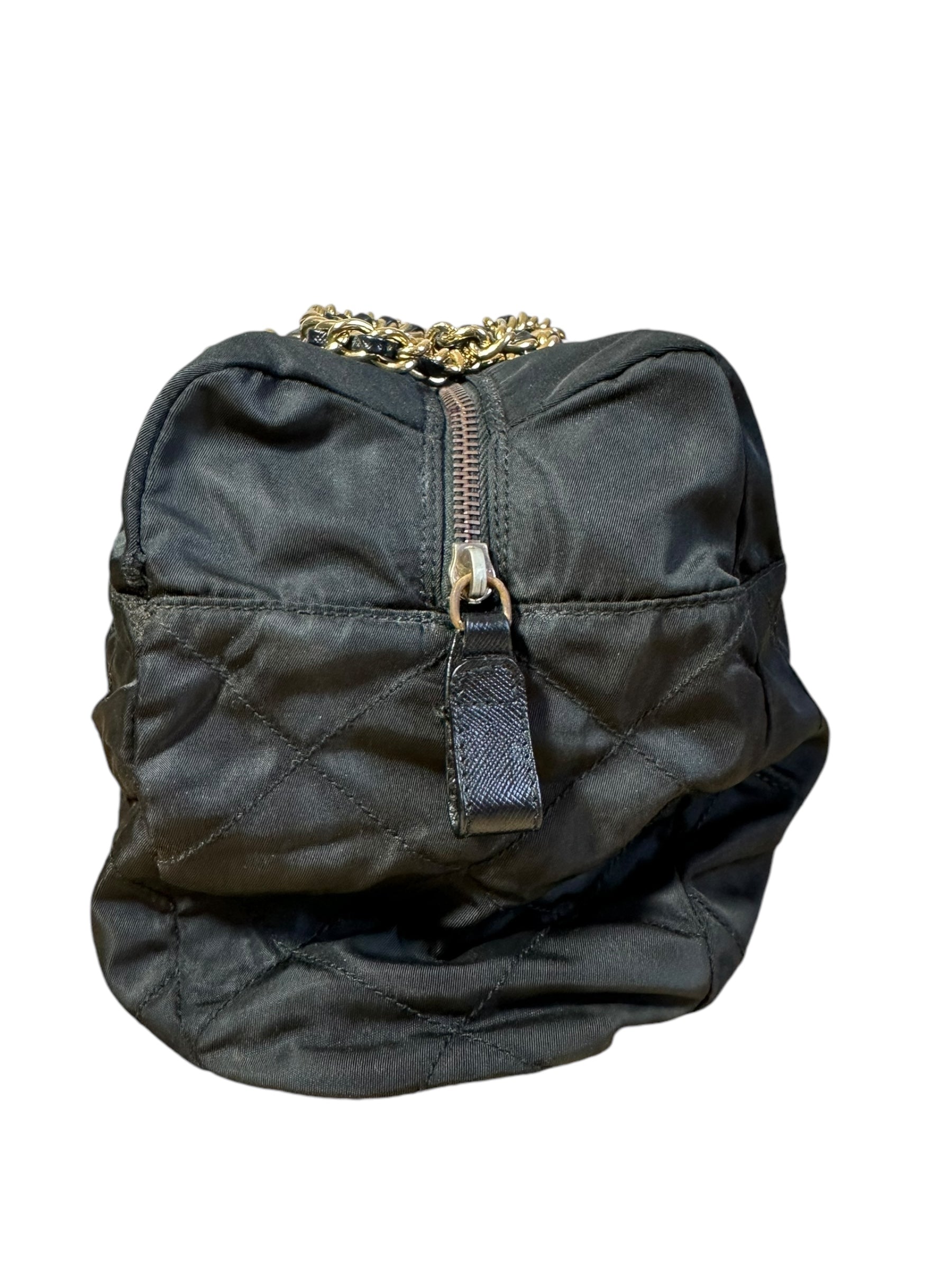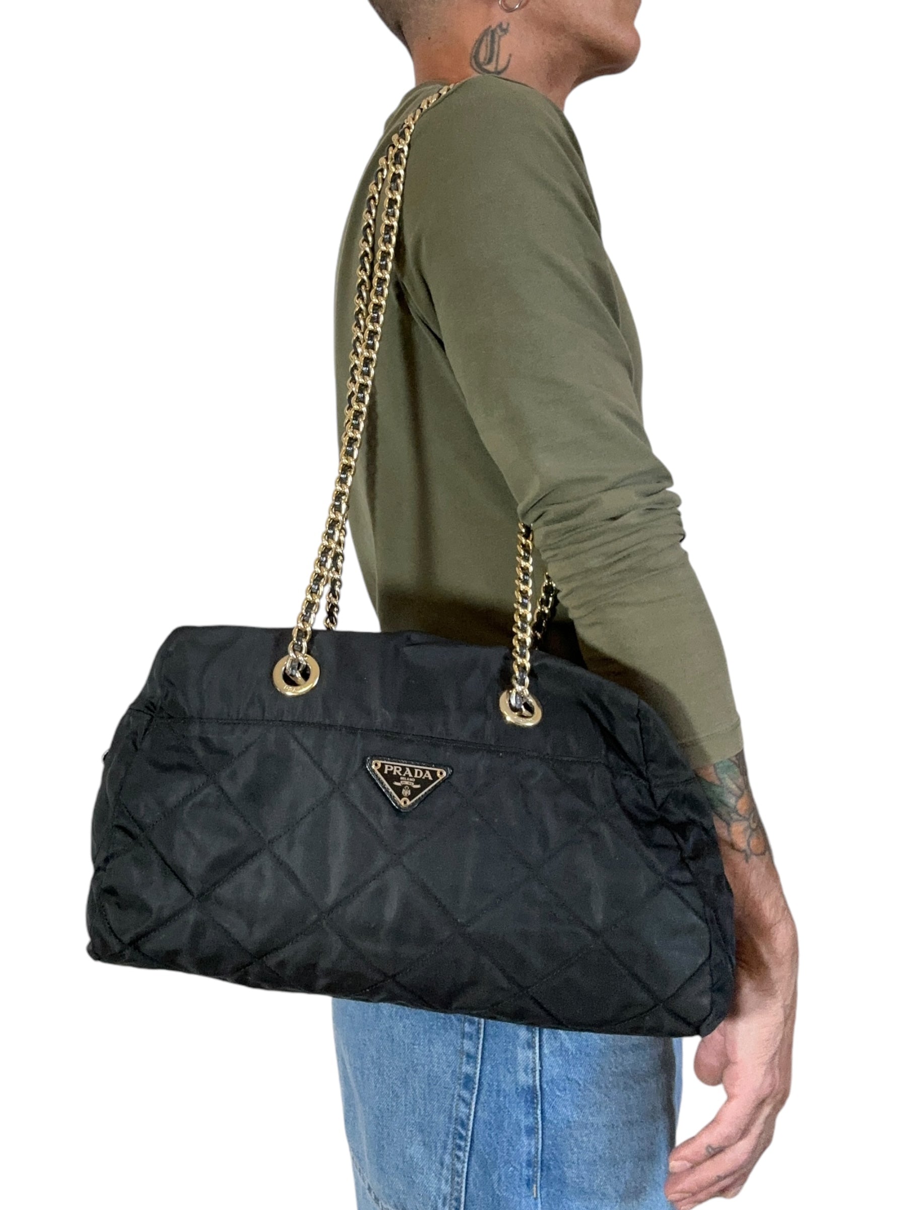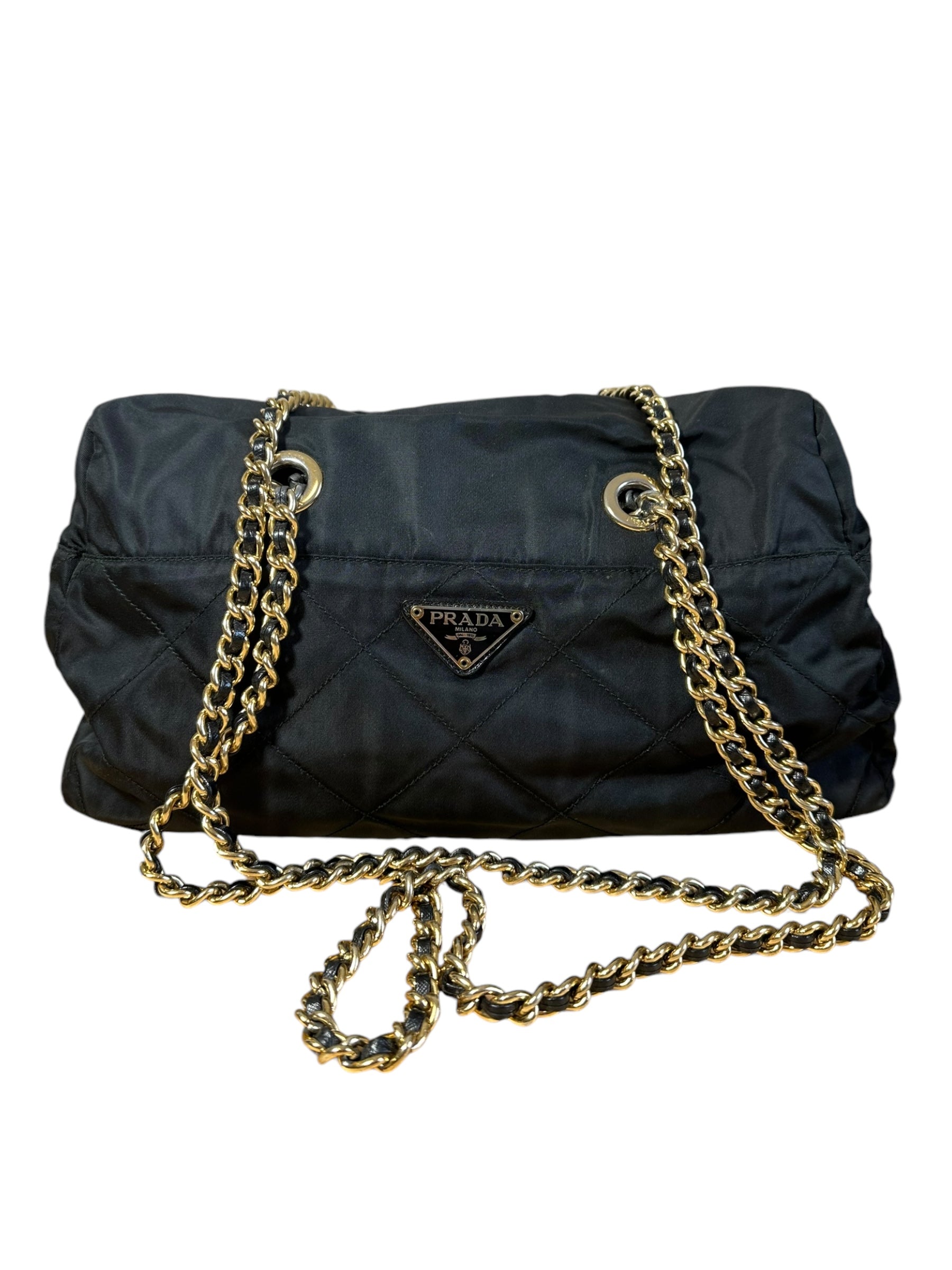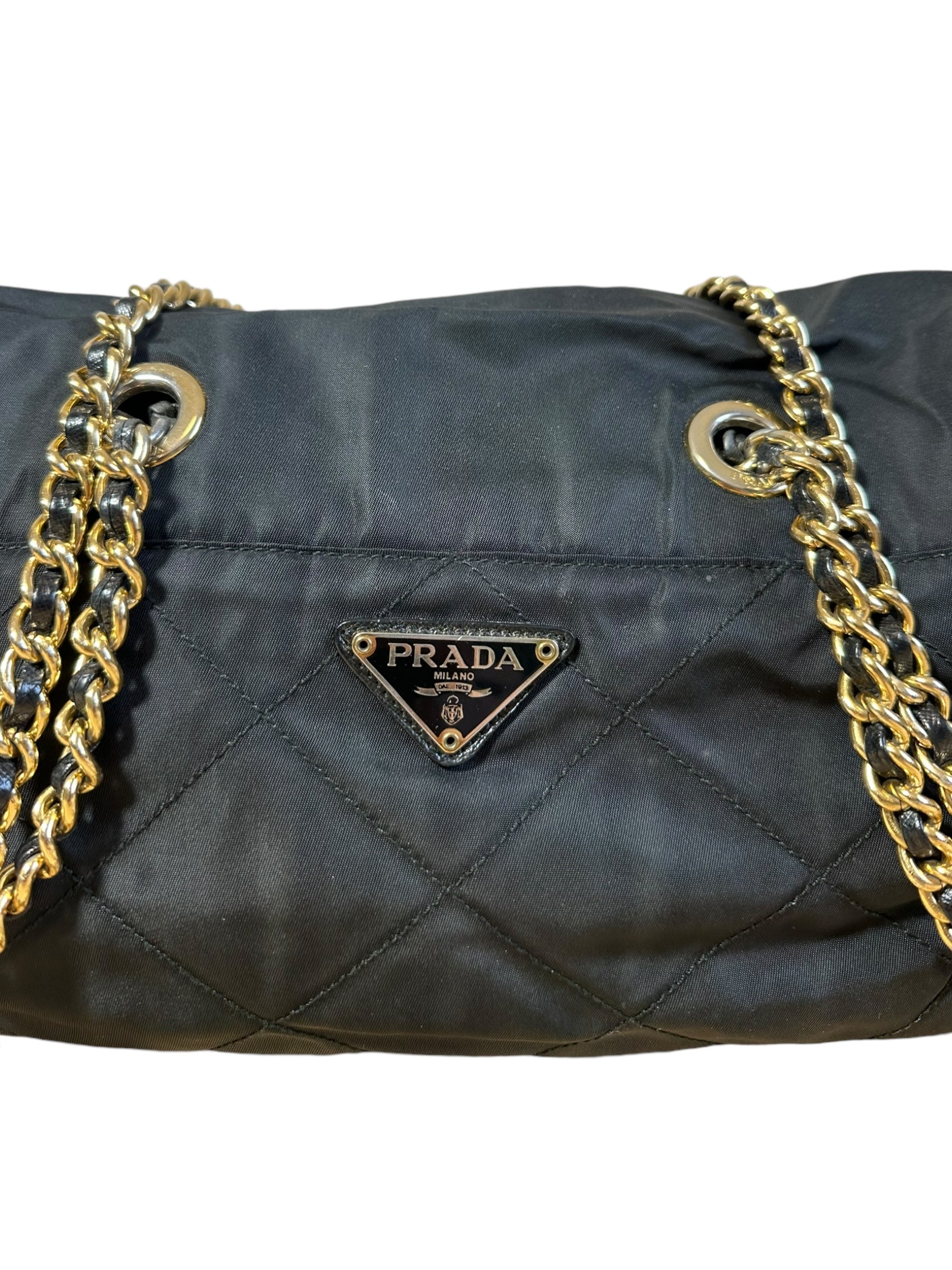 Prada borsa vintage in nylon nero trapuntato con tracolla a catenelle dorate con inserto in pelle. Chiusura a zip e logo in metallo sul davanti. Presenta lievi scoloriture sulla metallurgia. Risale ad un modello dei primi anni 90’. Viene spedita con dust bag.