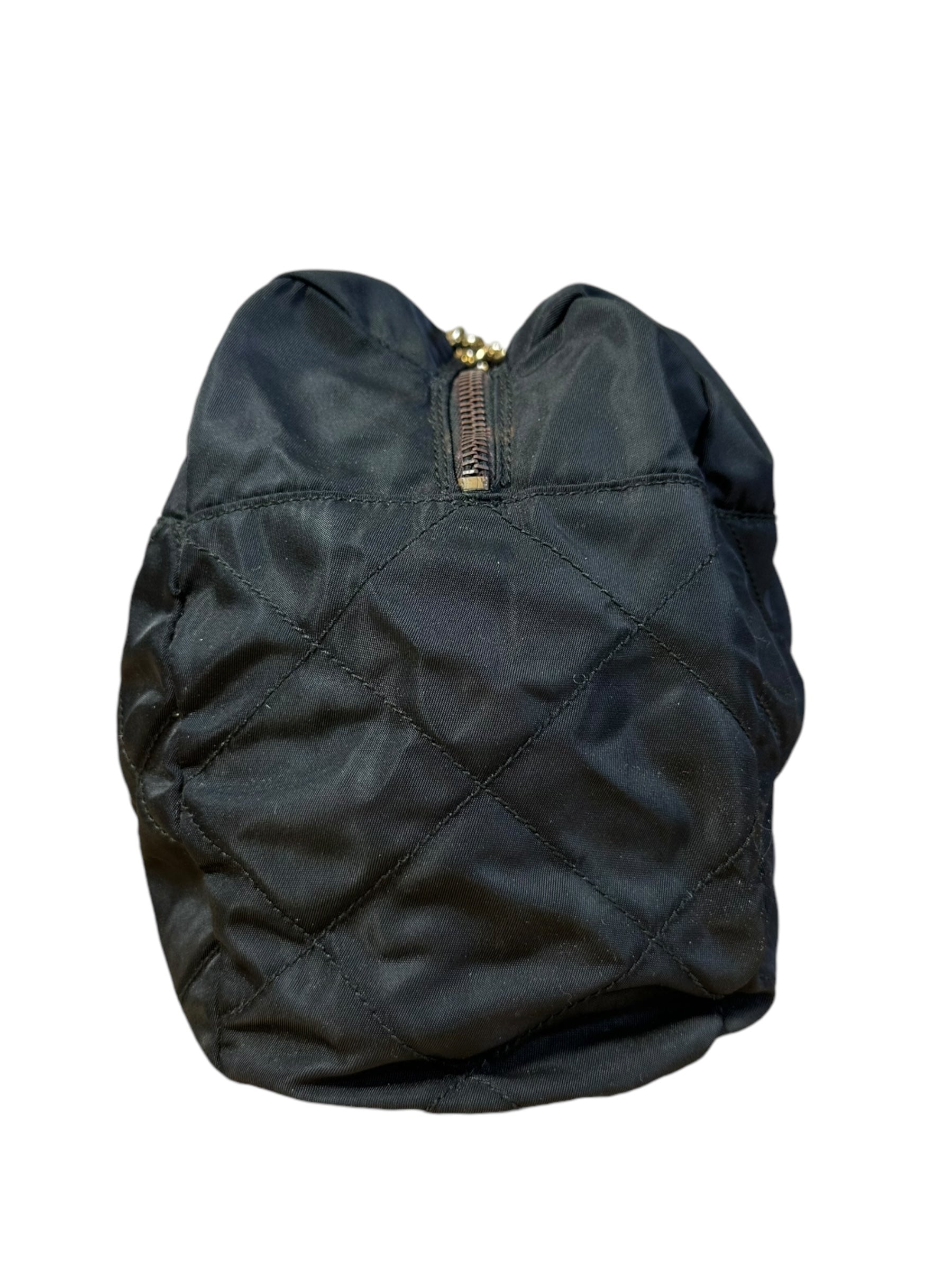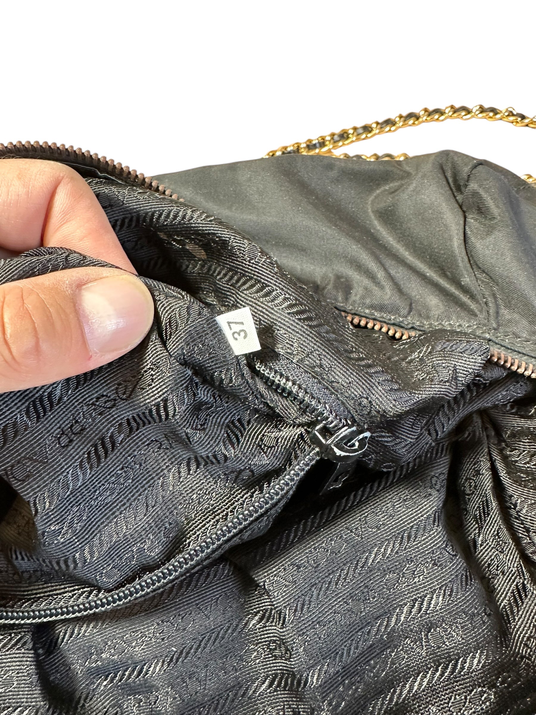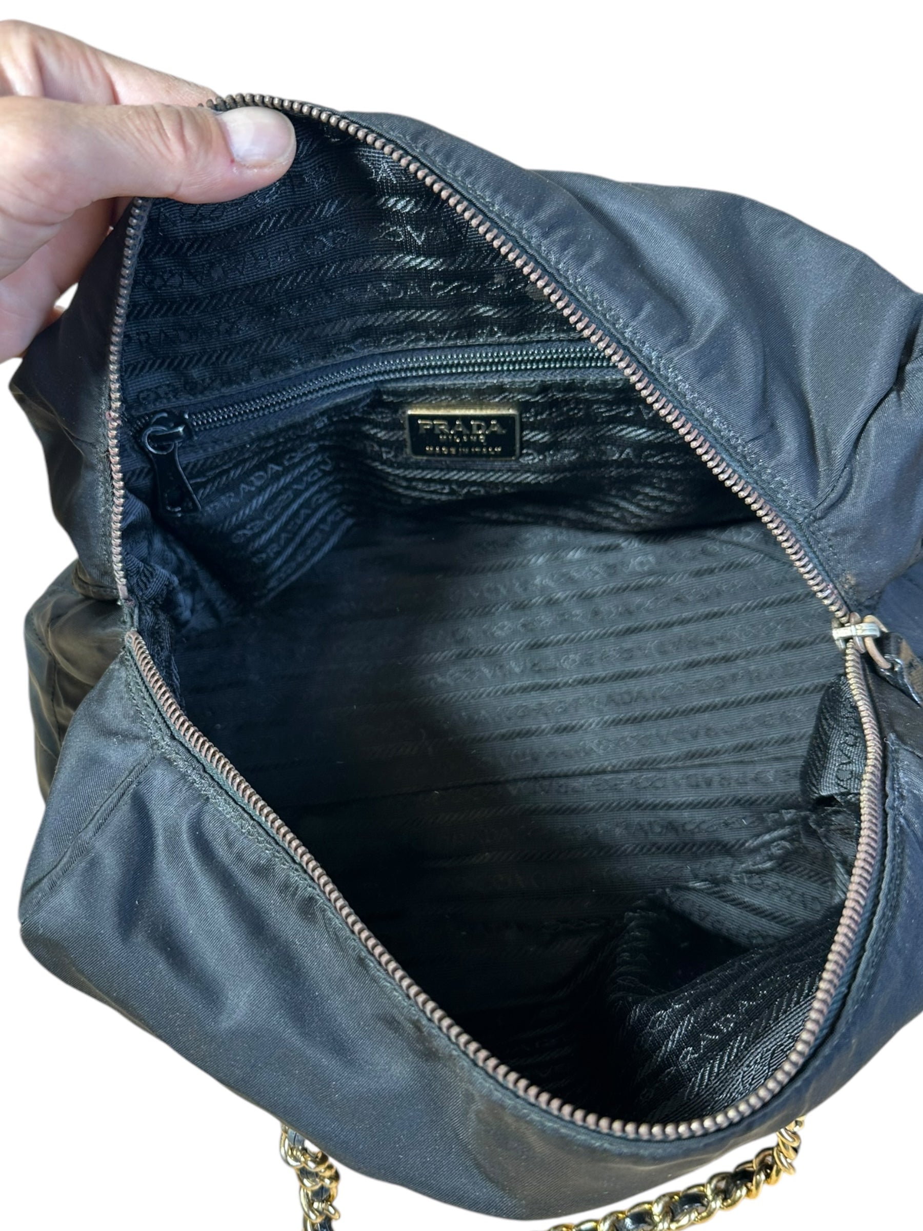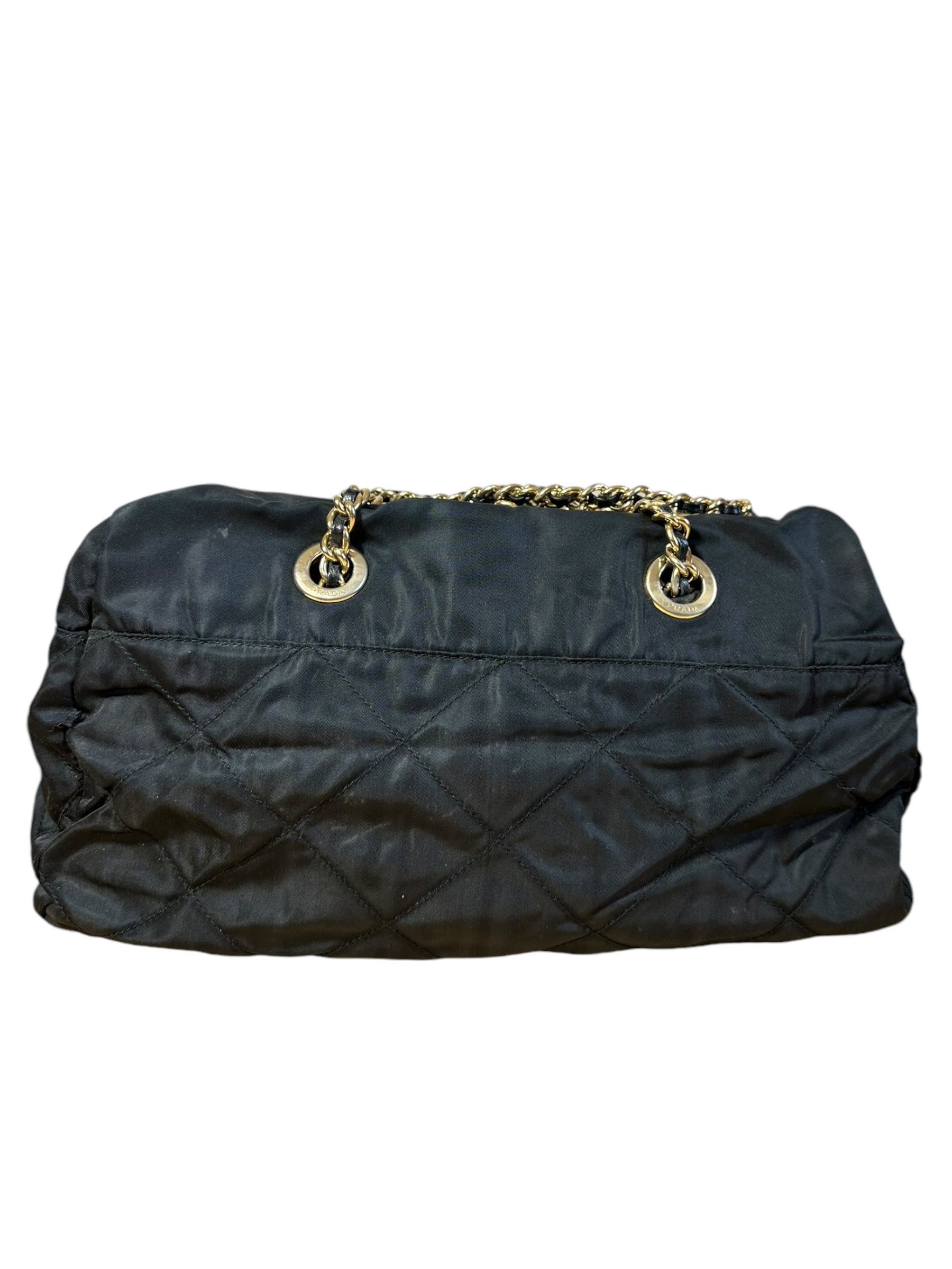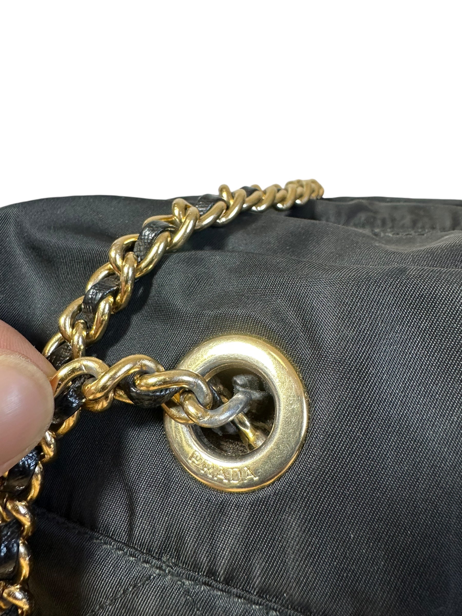 Prada borsa vintage in nylon nero trapuntato con tracolla a catenelle dorate con inserto in pelle. Chiusura a zip e logo in metallo sul davanti. Presenta lievi scoloriture sulla metallurgia. Risale ad un modello dei primi anni 90’. Viene spedita con dust bag.