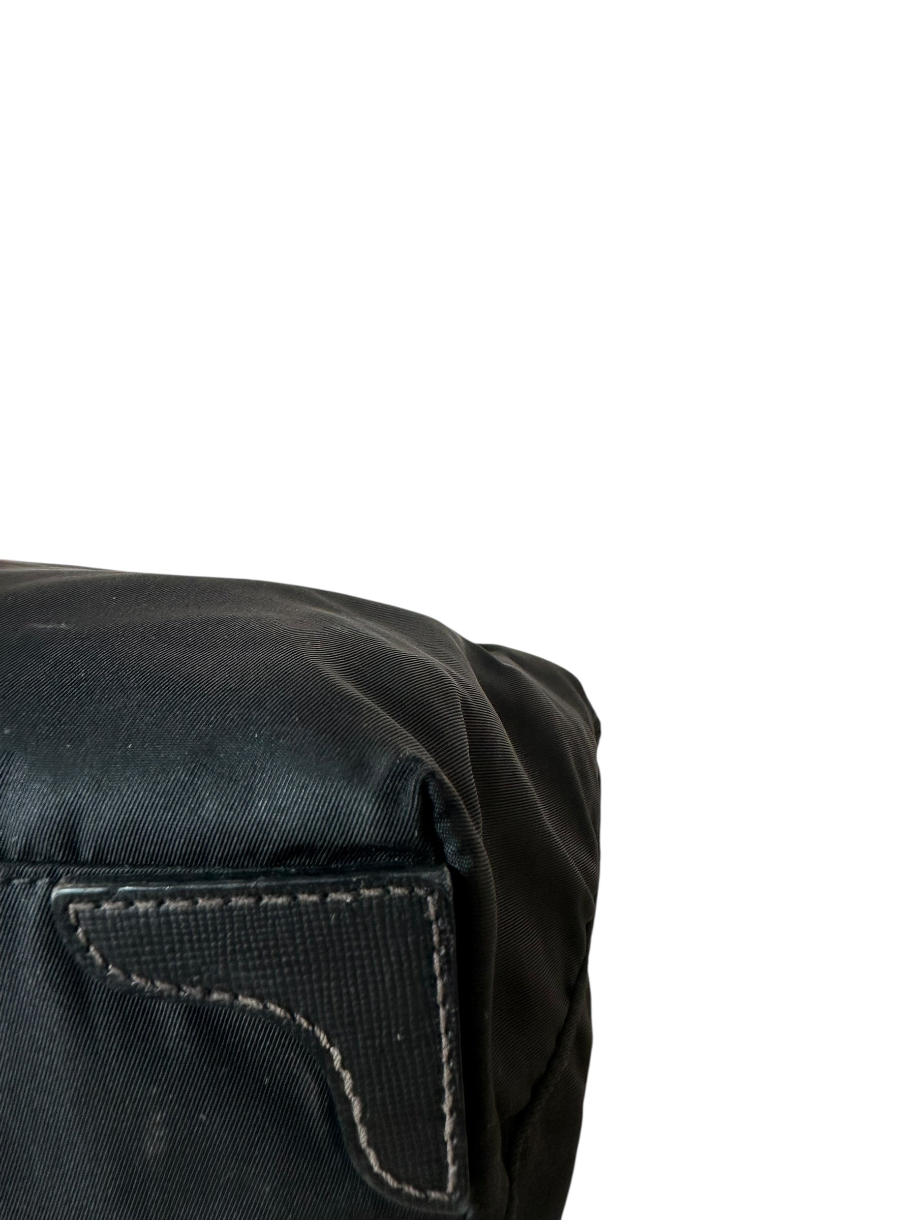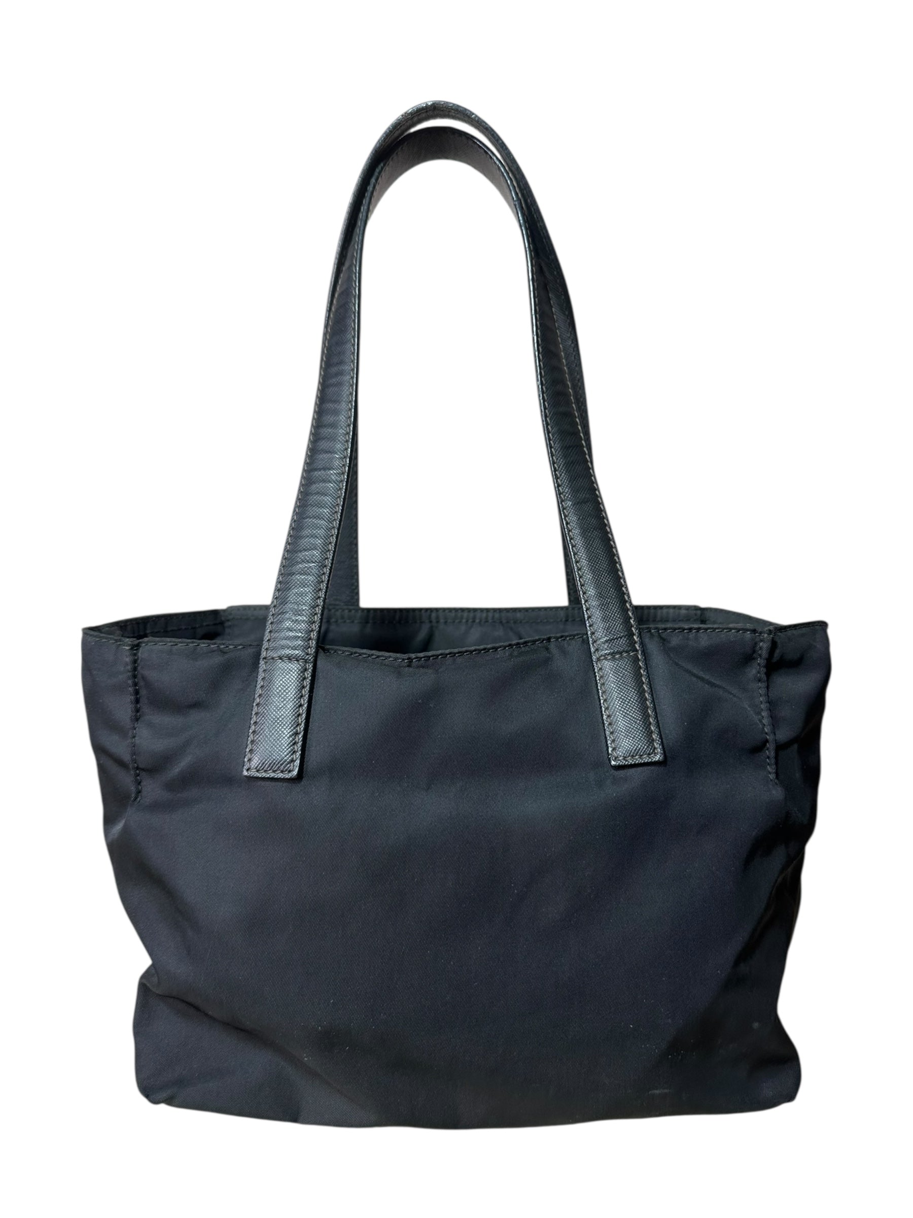 Borsa tote Prada vintage realizzata in nylon nero con manici e dettagli in pelle Saffiano. Il design essenziale è arricchito dal logo triangolare in metallo smaltato sulla parte frontale e da un anello laterale in metallo argentato. Chiusura con zip superiore e interno foderato in tessuto logato con tasca con zip e placca metallica “Prada – Made in Italy”.