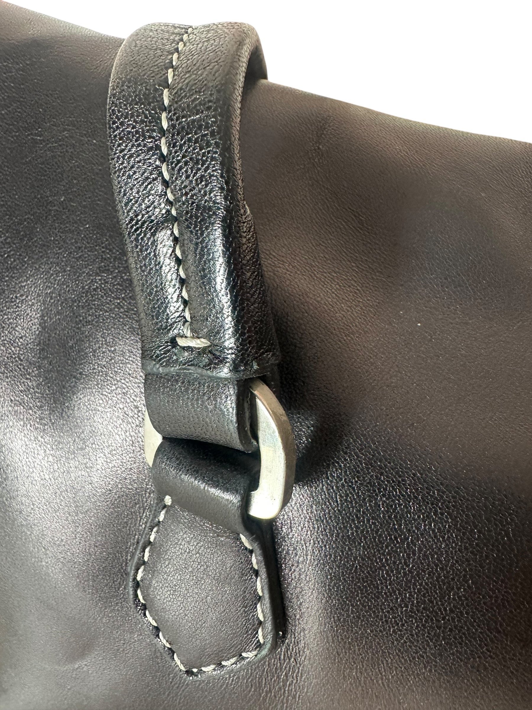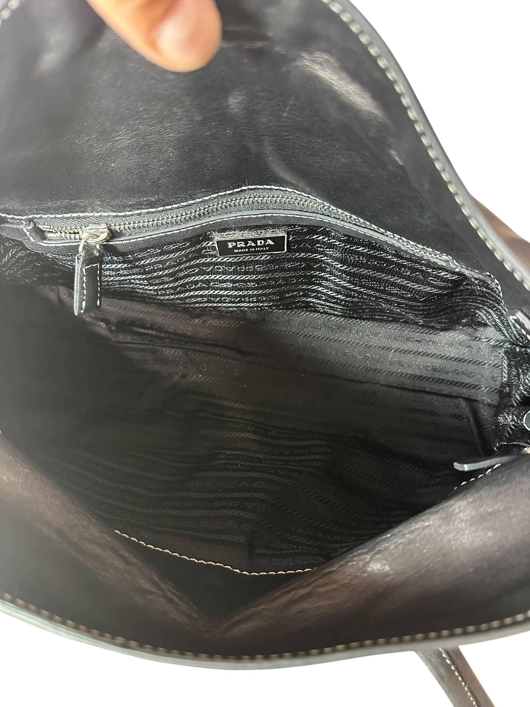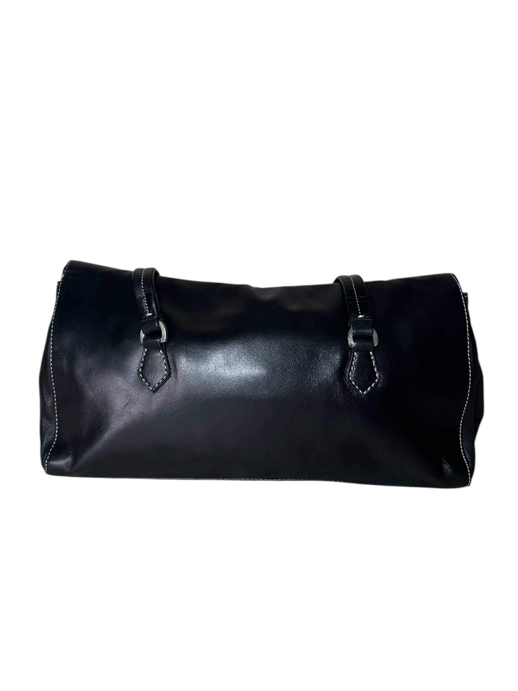 Elegante borsa vintage Prada in morbida pelle nera, caratterizzata da linee pulite e dettagli iconici della maison. Il design allungato con doppio manico a spalla è completato da cuciture a contrasto e chiusura frontale con placca logata e meccanismo a scatto in metallo argentato. Sul lato figura il classico logo triangolare in metallo “Prada Milano”.