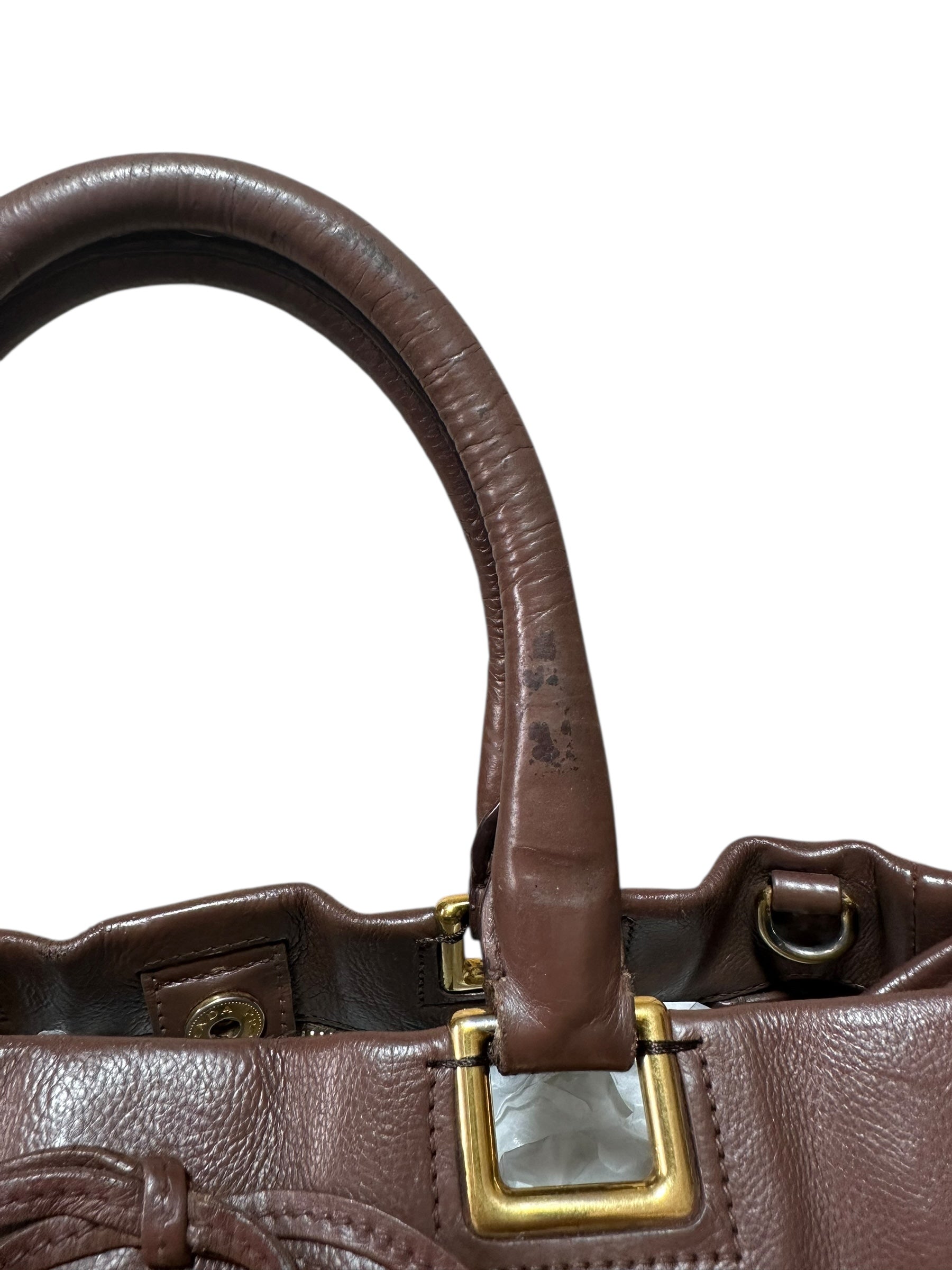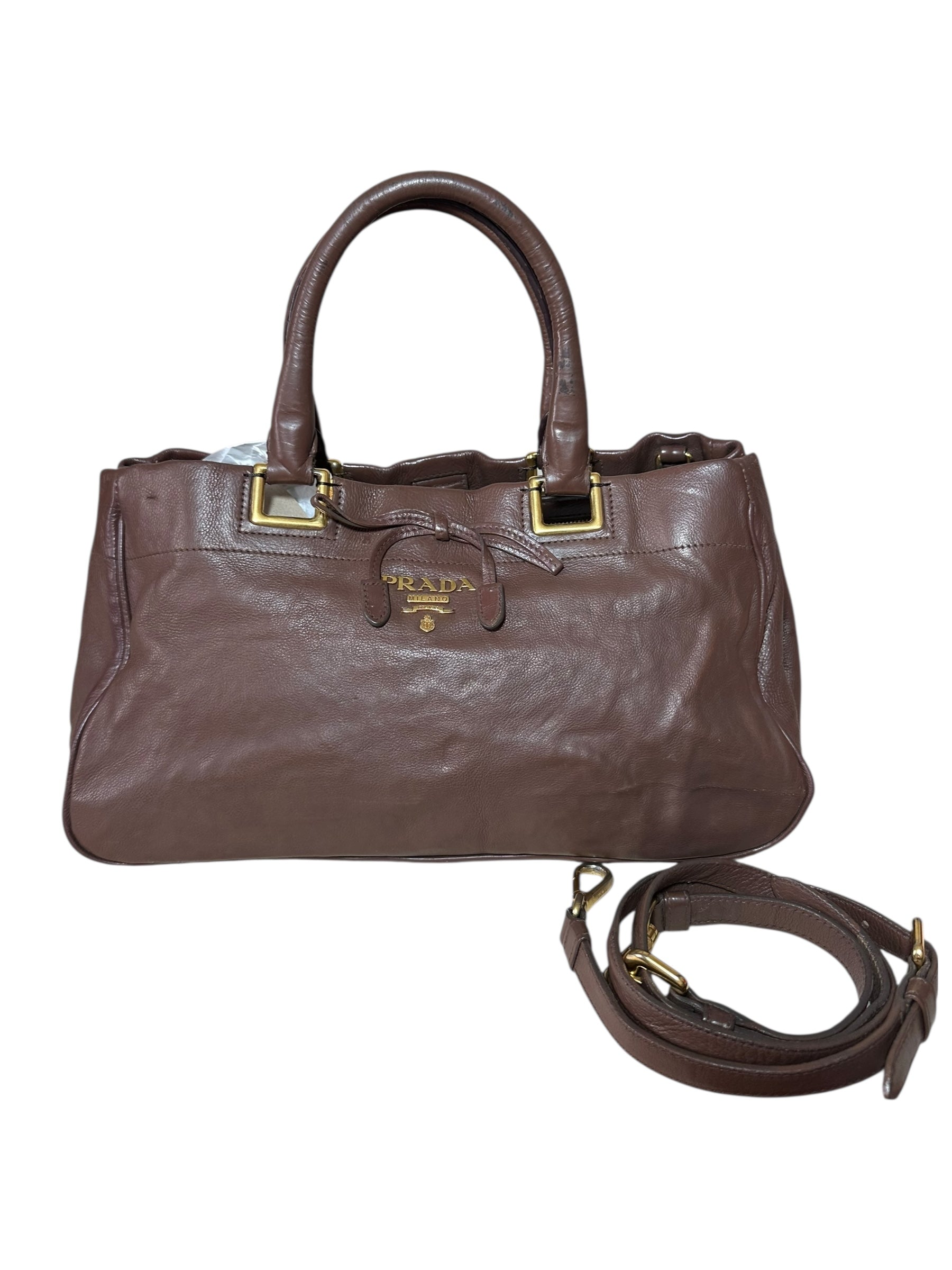 Borsa Prada vintage realizzata in morbida pelle martellata color marrone con dettagli in metallo dorato. Il modello è dotato di doppi manici rigidi e tracolla regolabile e removibile, che ne permette un utilizzo sia a mano che a spalla. Chiusura superiore con bottone magnetico e interno foderato in tessuto logato con tasche con zip e comparti multifunzione.