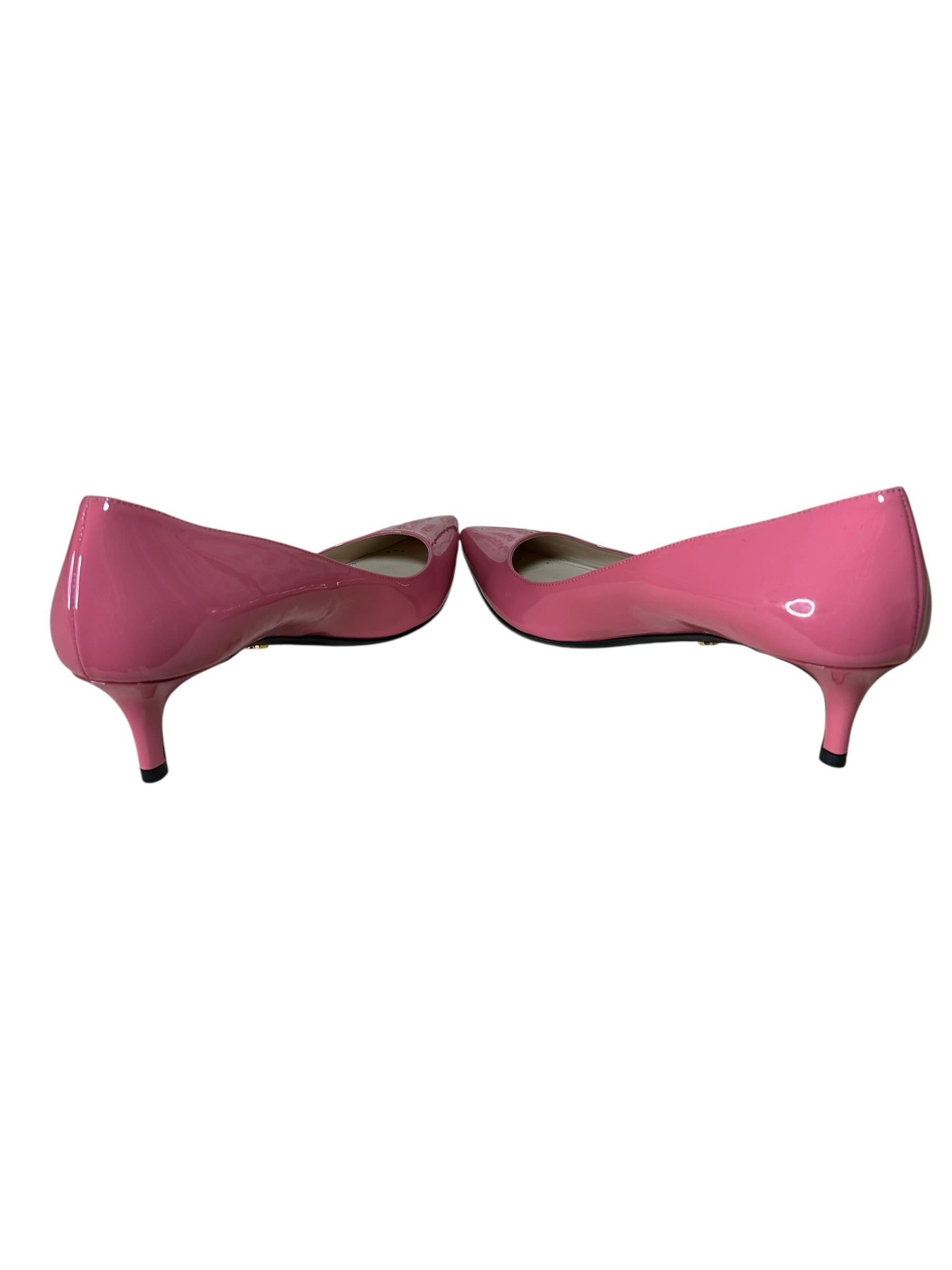 Raffinate décolleté Prada in pelle verniciata rosa, un modello dallo stile classico e intramontabile. Caratterizzate da punta affusolata e tacco sottile di media altezza, donano eleganza e slancio mantenendo un’elevata comodità. L’interno è rifinito in pelle chiara con soletta logata, mentre la suola in cuoio nero è impreziosita dal logo dorato Prada in rilievo.