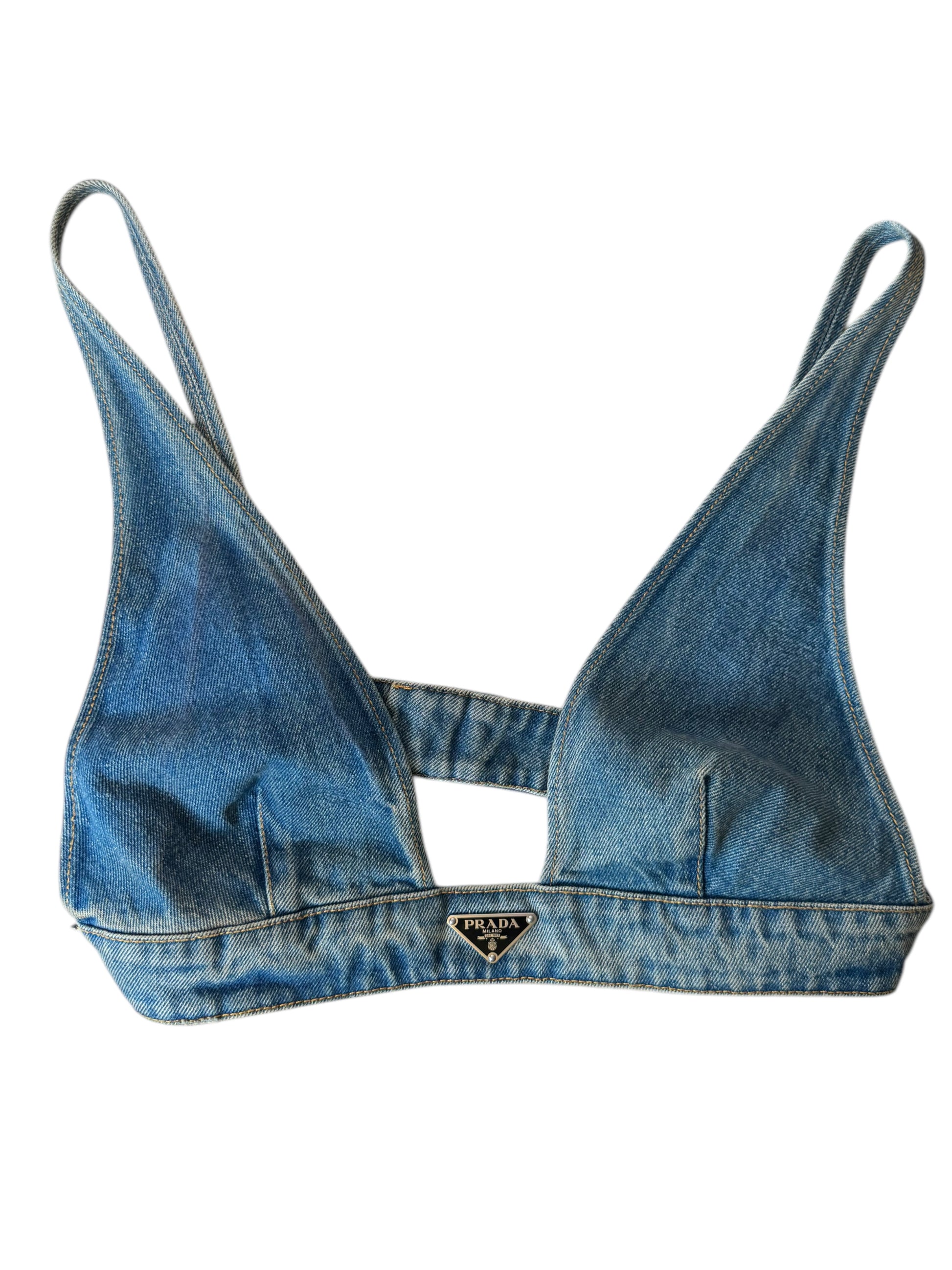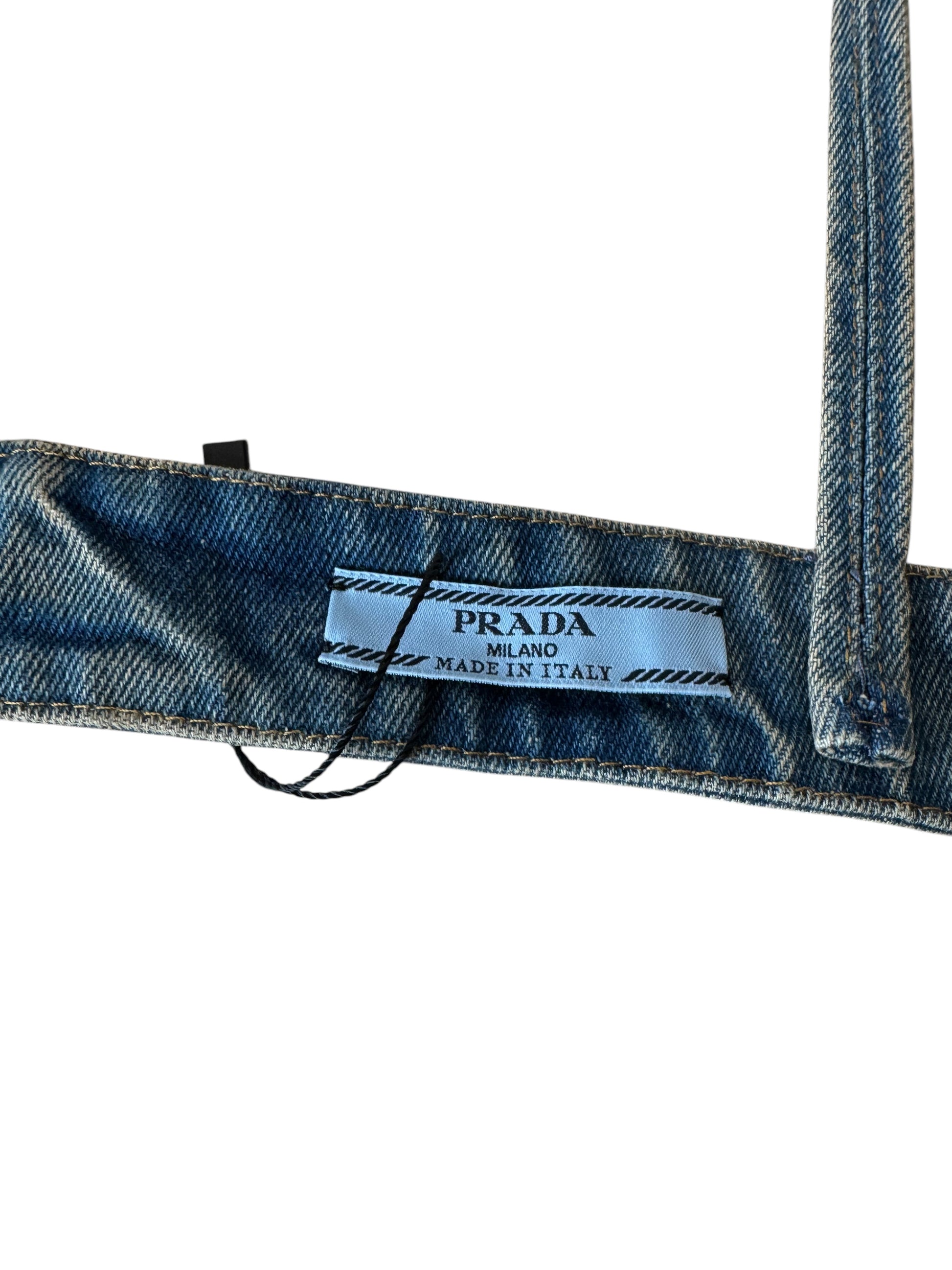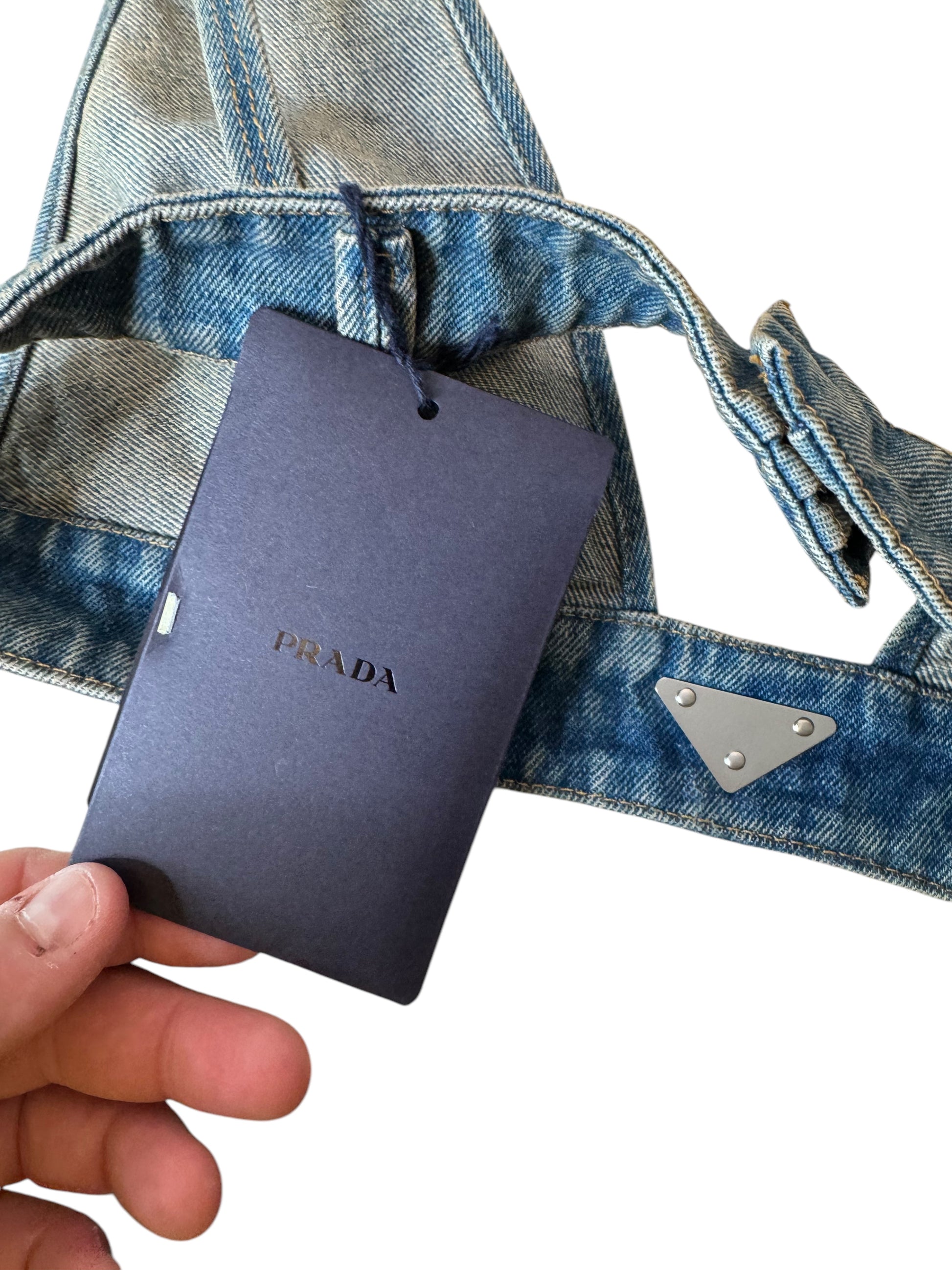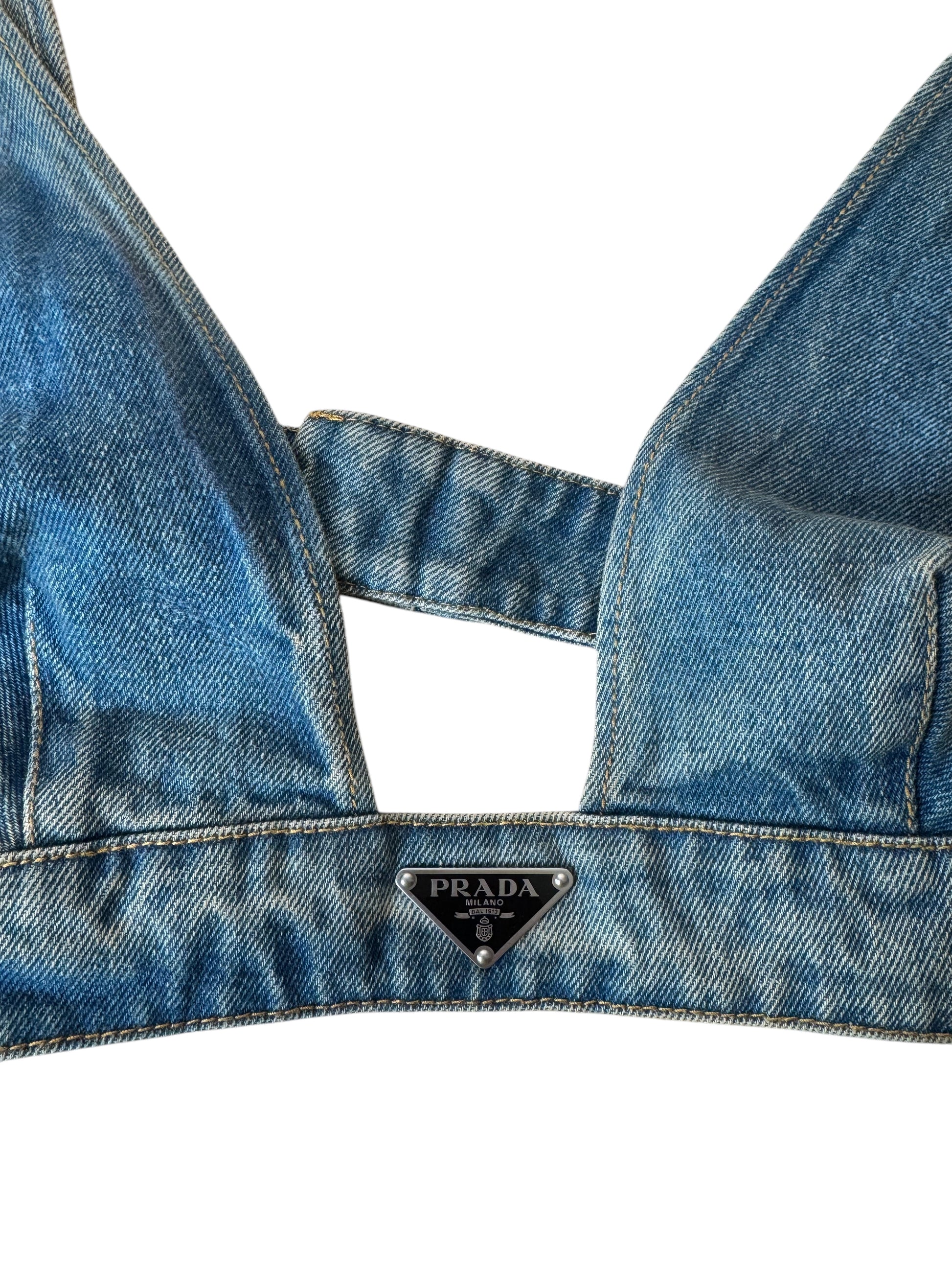 Top bralette originale Prada in denim lavaggio blu medio, taglia IT 44. Realizzato in Italia in 100% cotone. Logo triangolare iconico Prada sul davanti e placca logo argento sul retro. Chiusura regolabile con tre livelli di ganci. Nuovo con etichette e cartellini originali ancora attaccati. Lunghezza totale da aperto (come da foto) circa 84 cm.