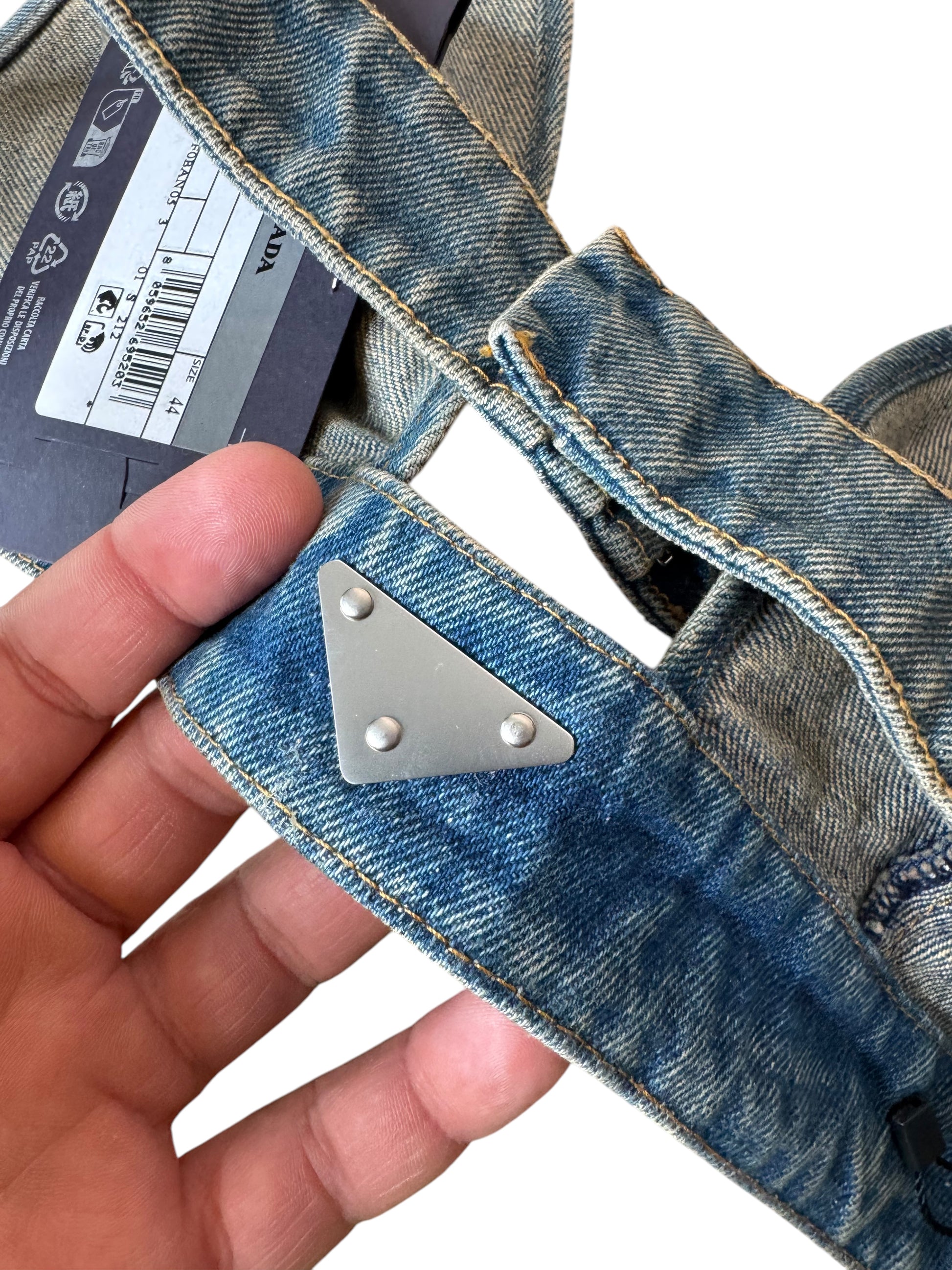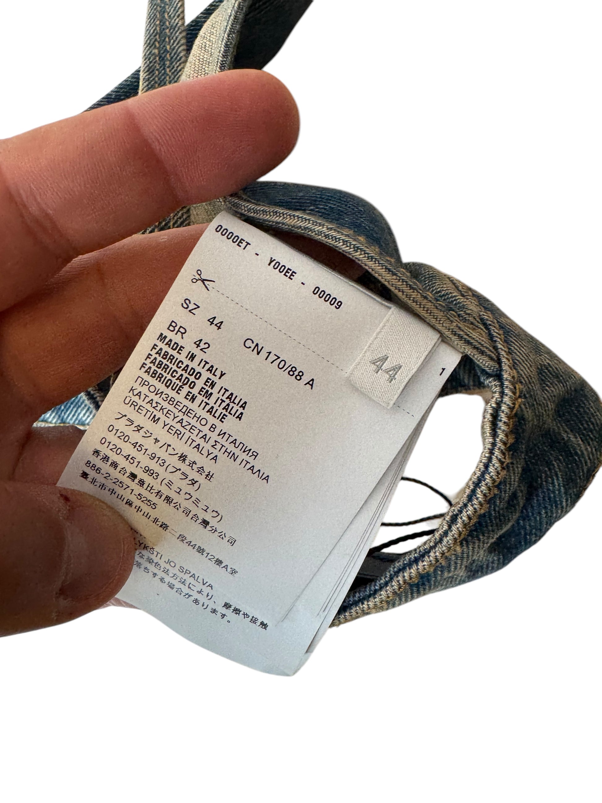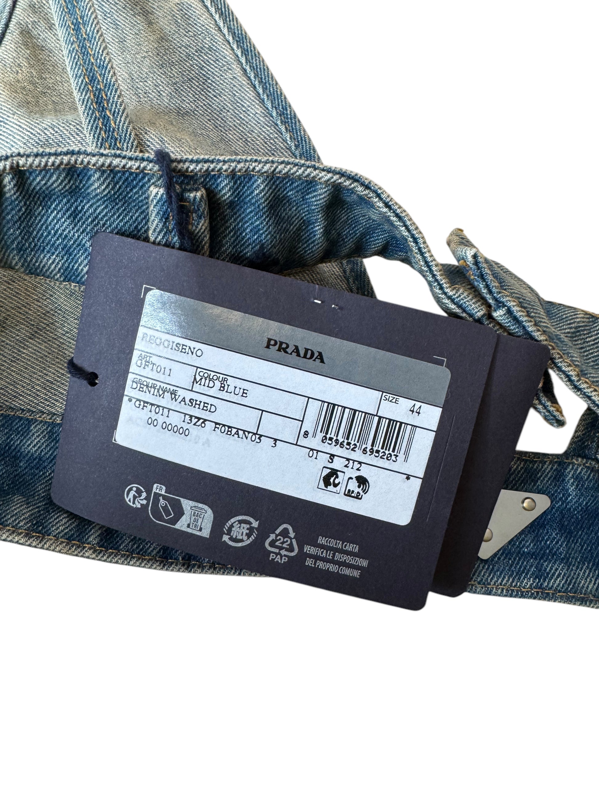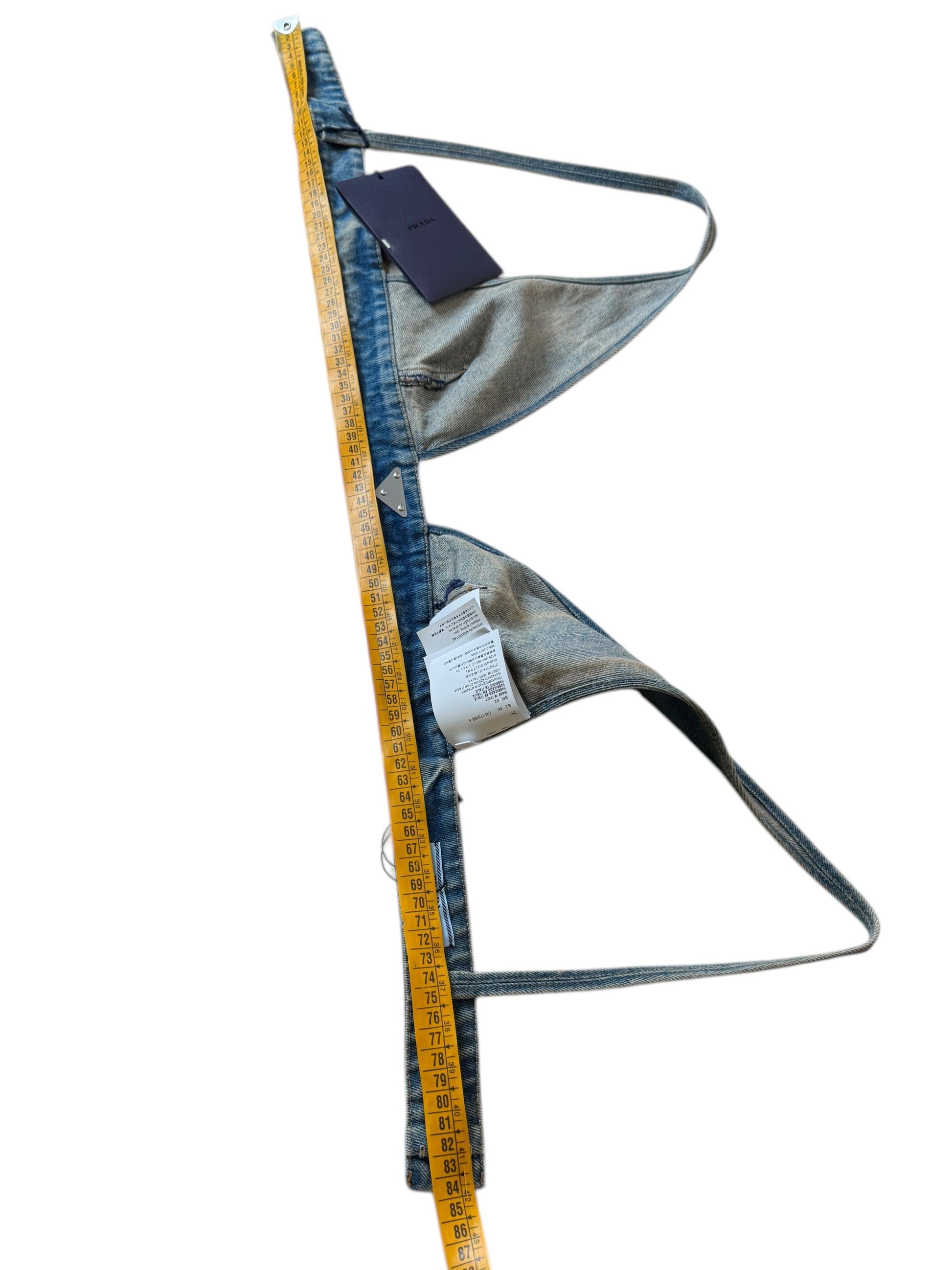 Top bralette originale Prada in denim lavaggio blu medio, taglia IT 44. Realizzato in Italia in 100% cotone. Logo triangolare iconico Prada sul davanti e placca logo argento sul retro. Chiusura regolabile con tre livelli di ganci. Nuovo con etichette e cartellini originali ancora attaccati. Lunghezza totale da aperto (come da foto) circa 84 cm.