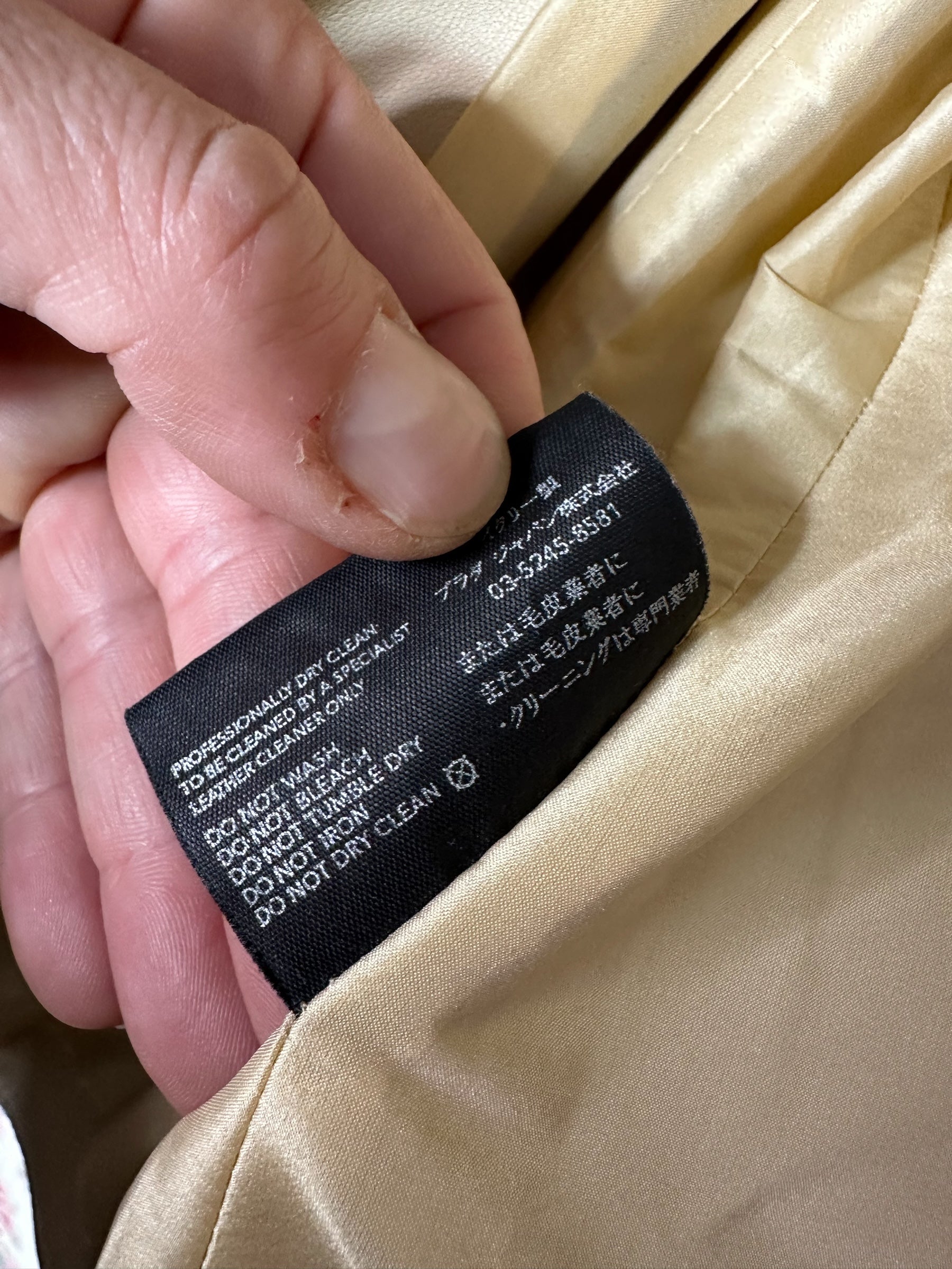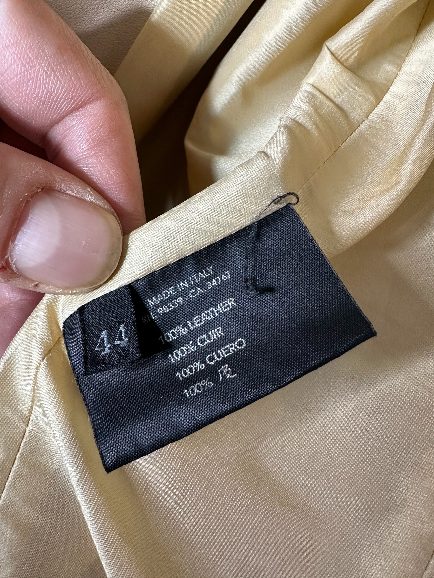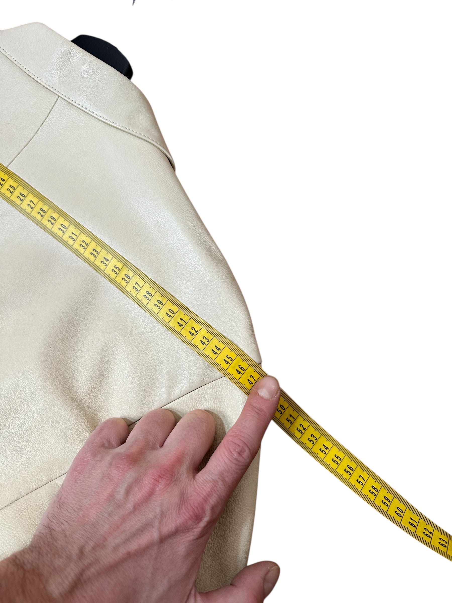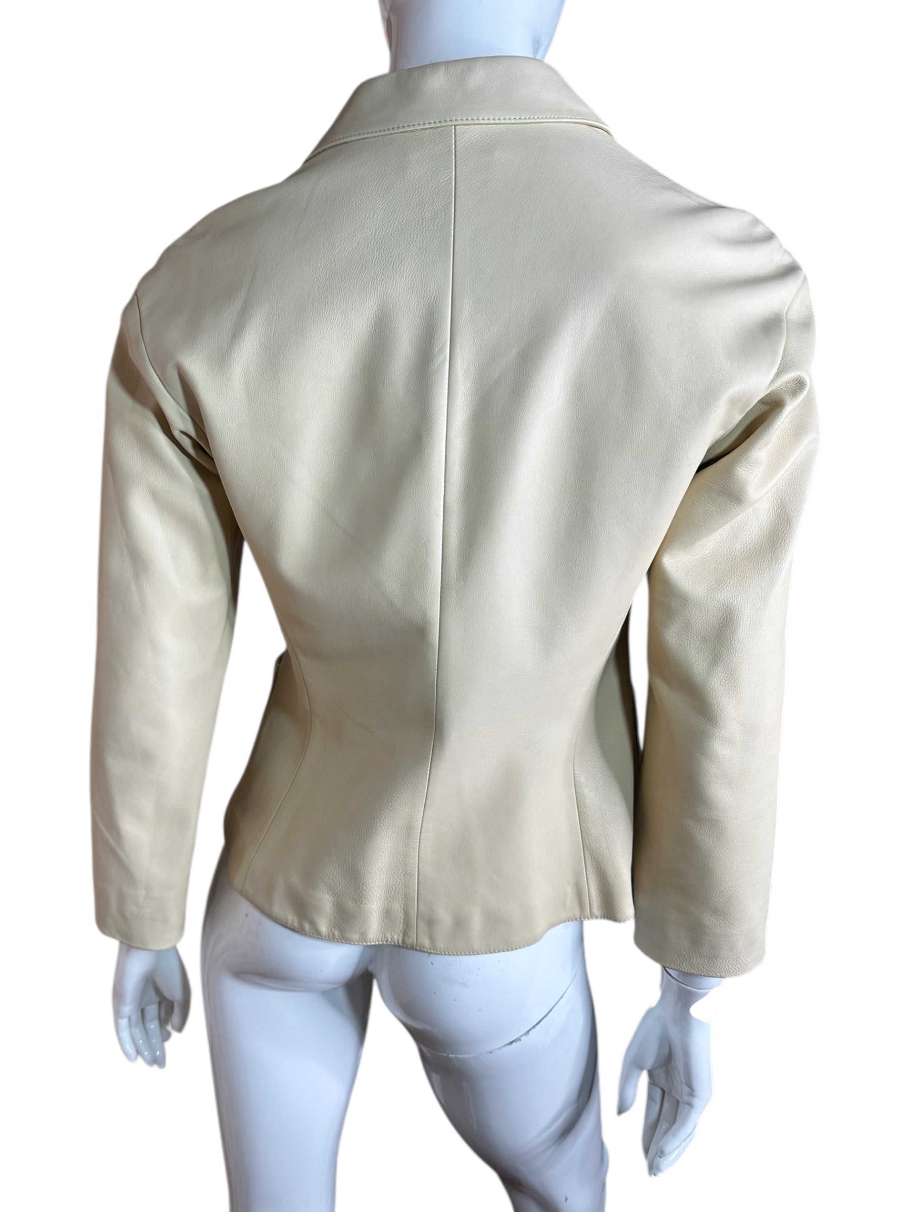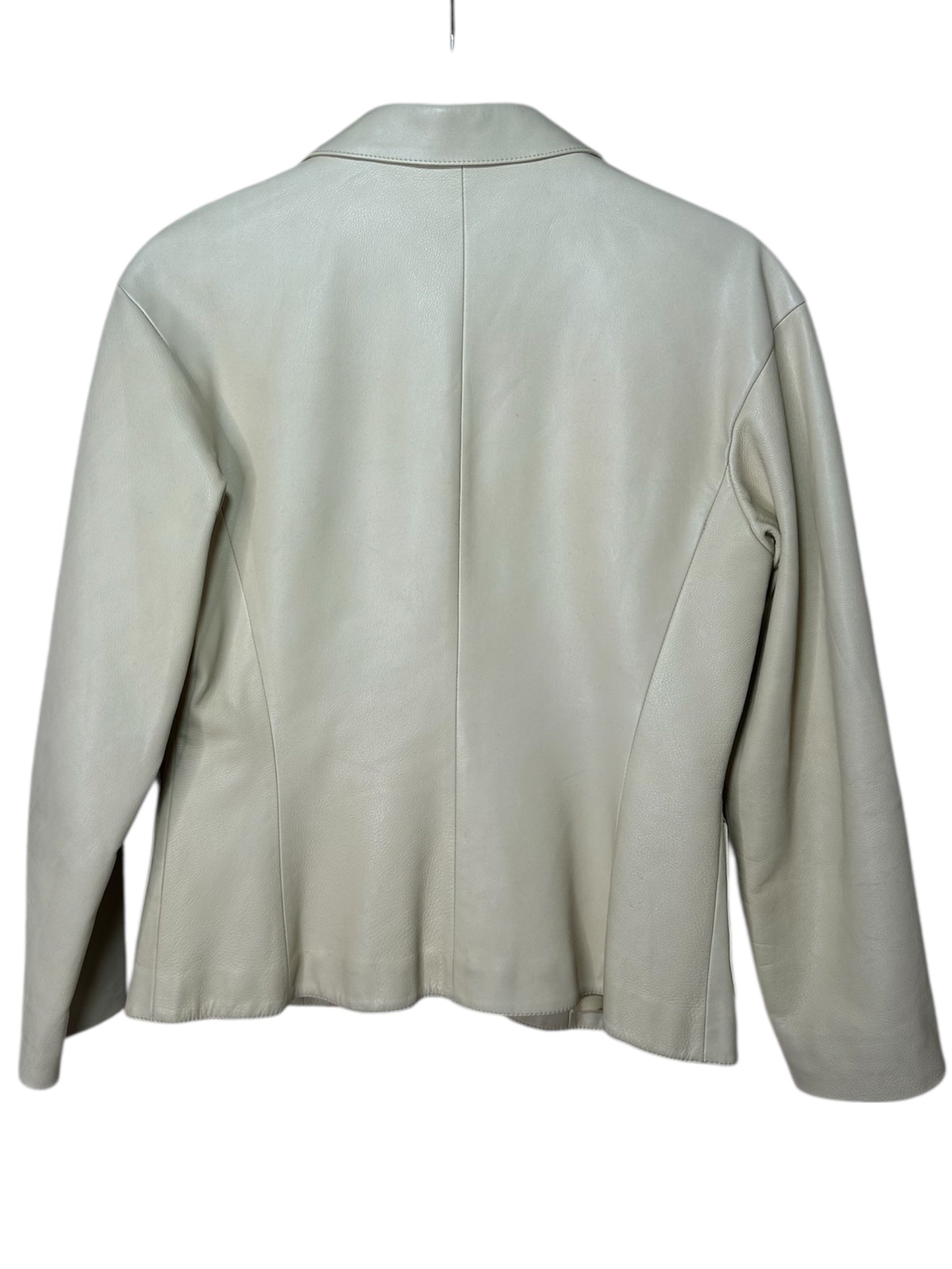 La pelle è in colore crema. Interno foderato in tessuto chiaro. Il capo si presenta in ottime condizioni generali.