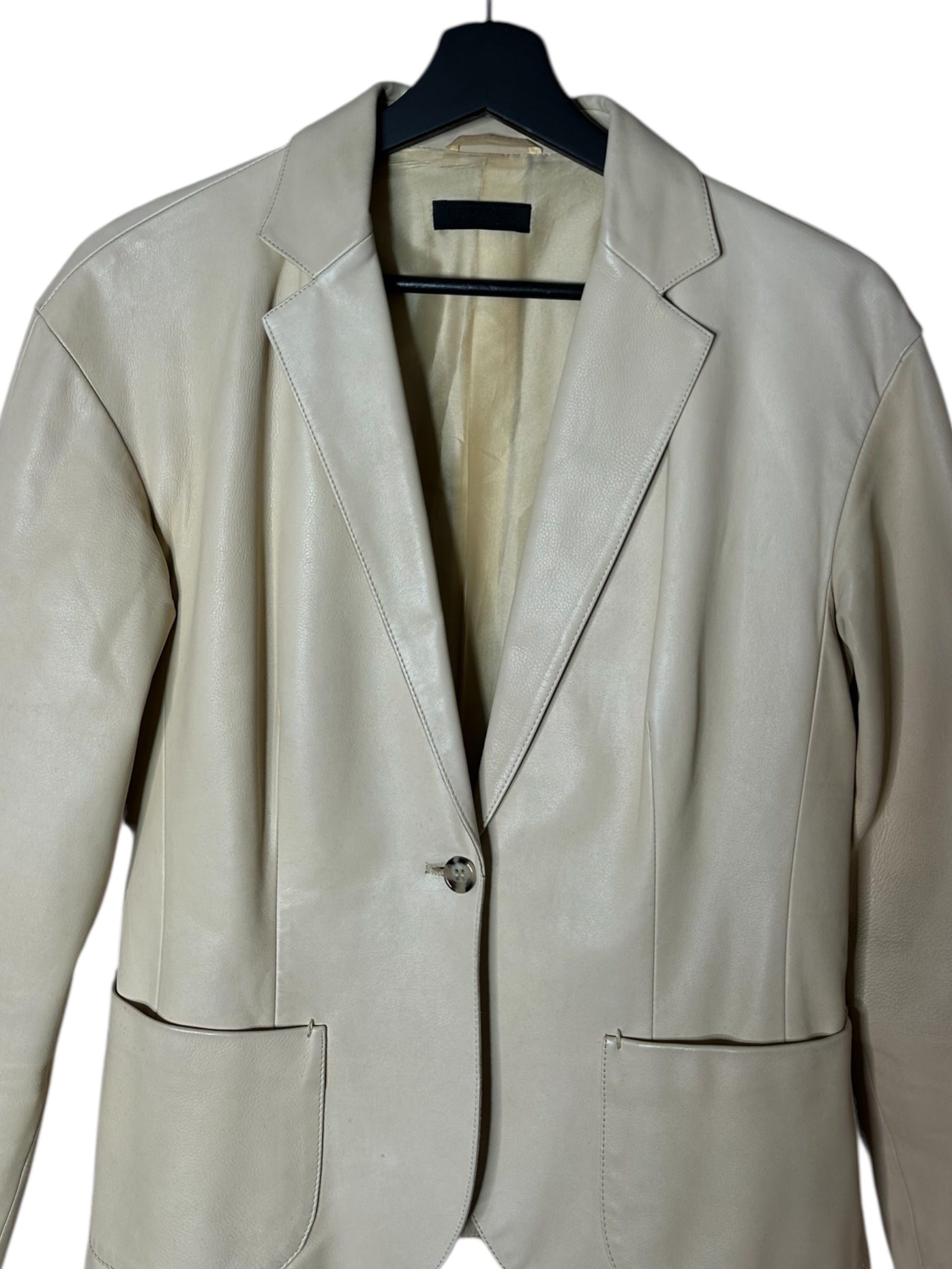 Giacca Prada realizzata in pelle 100% di alta qualità, dal design essenziale ed elegante. Modello con collo a revers, chiusura frontale con bottone e tasche applicate, con linea leggermente sagomata.